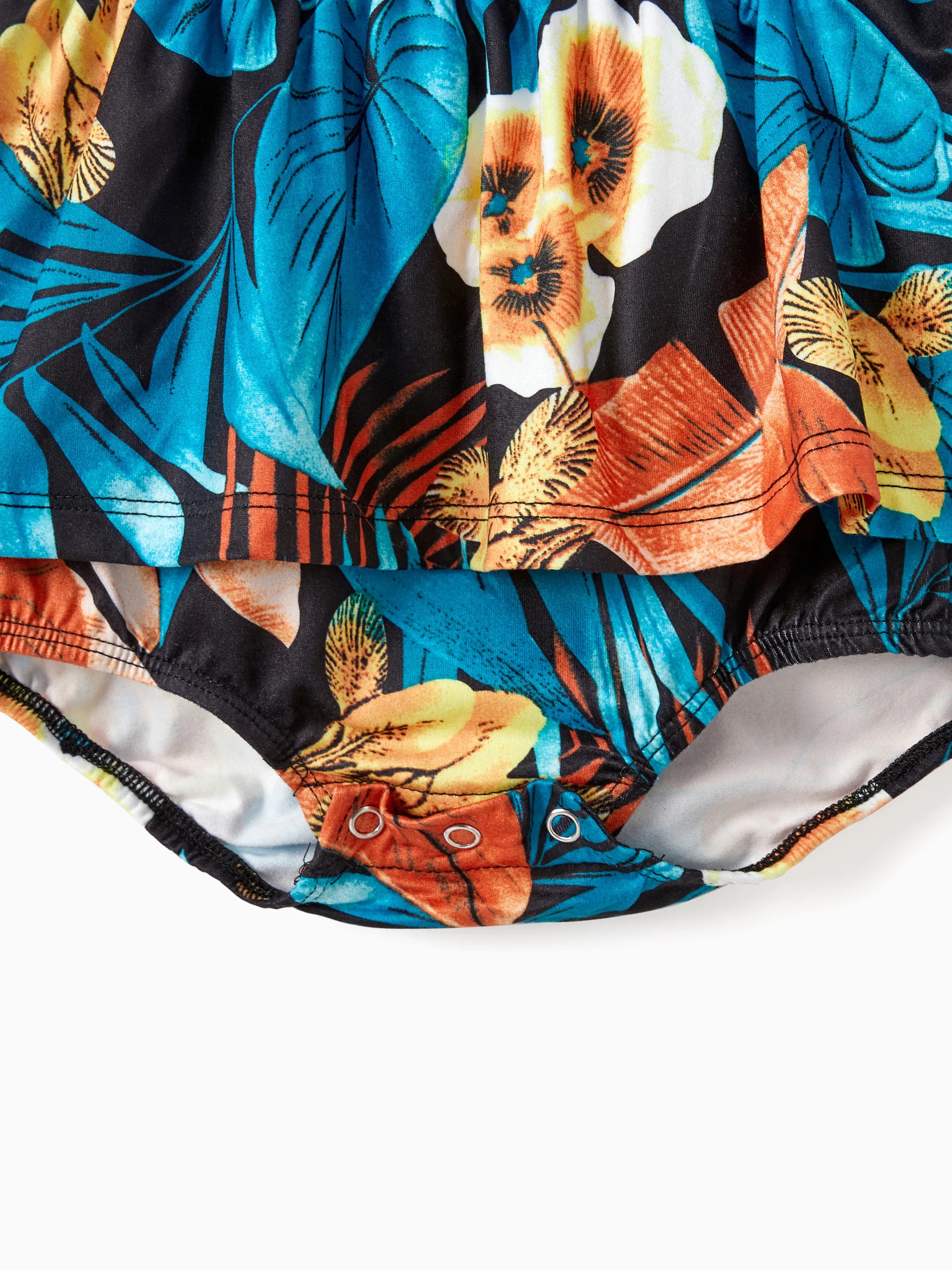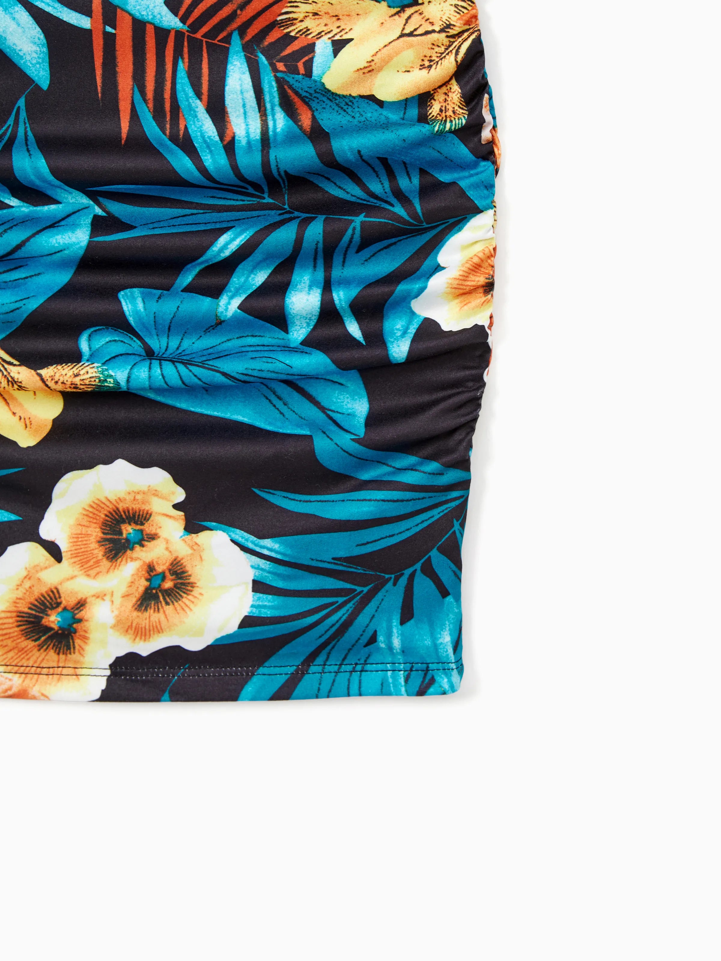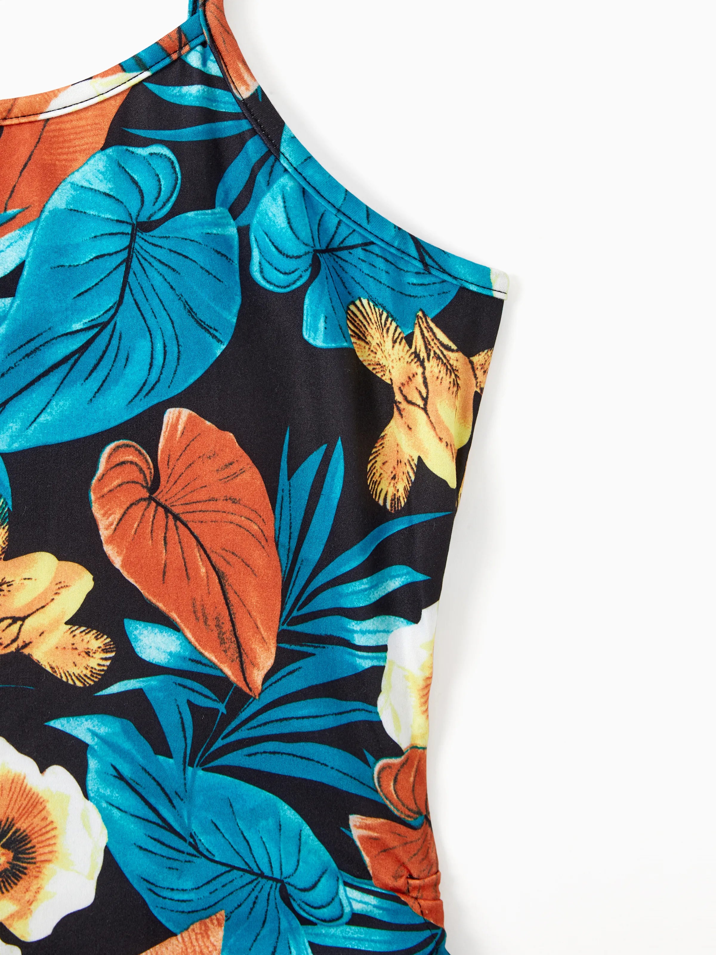La tenue de vacances familiale à motif de plantes tropicales noires est parfaite pour les occasions décontractées et formelles.