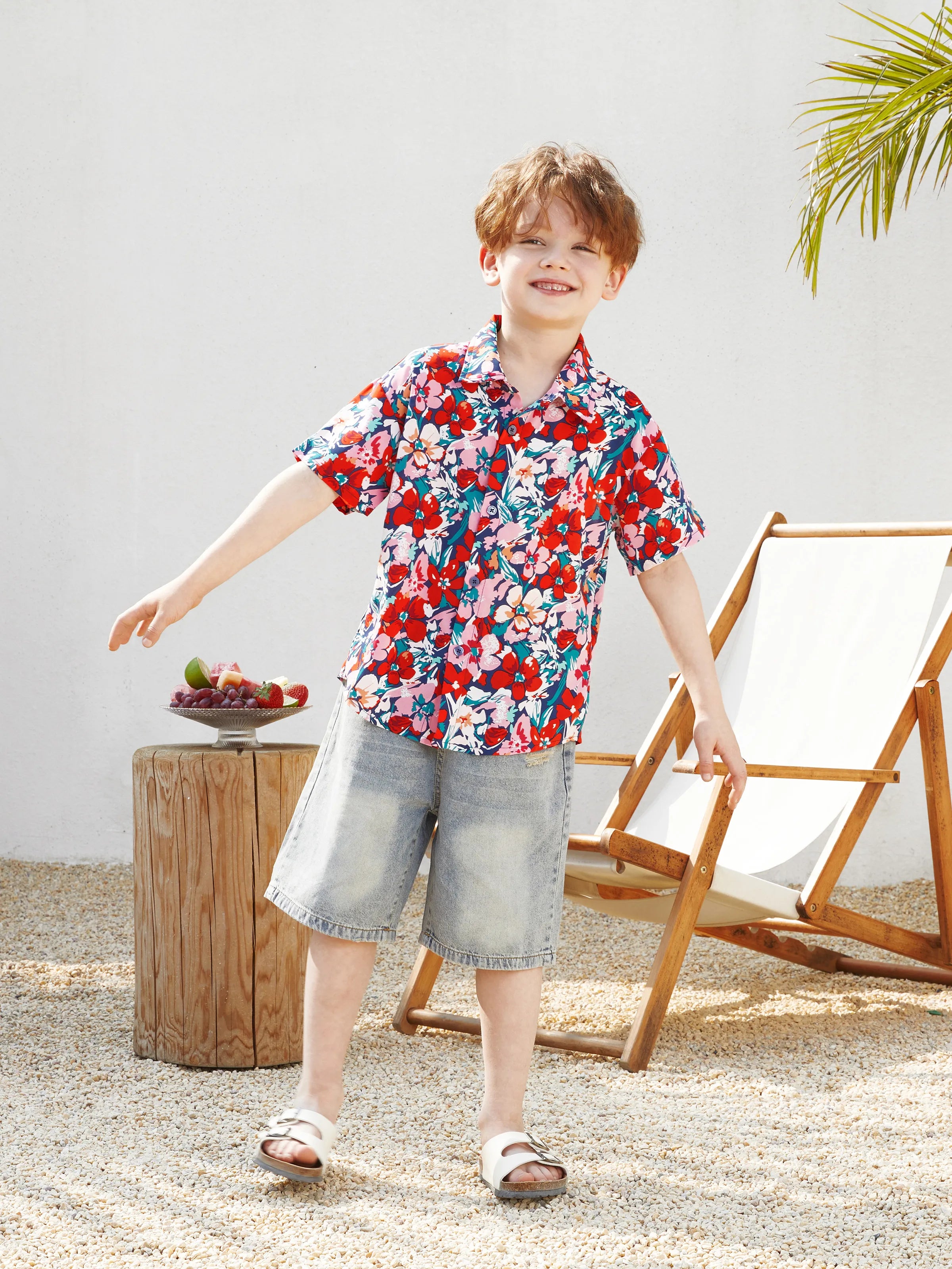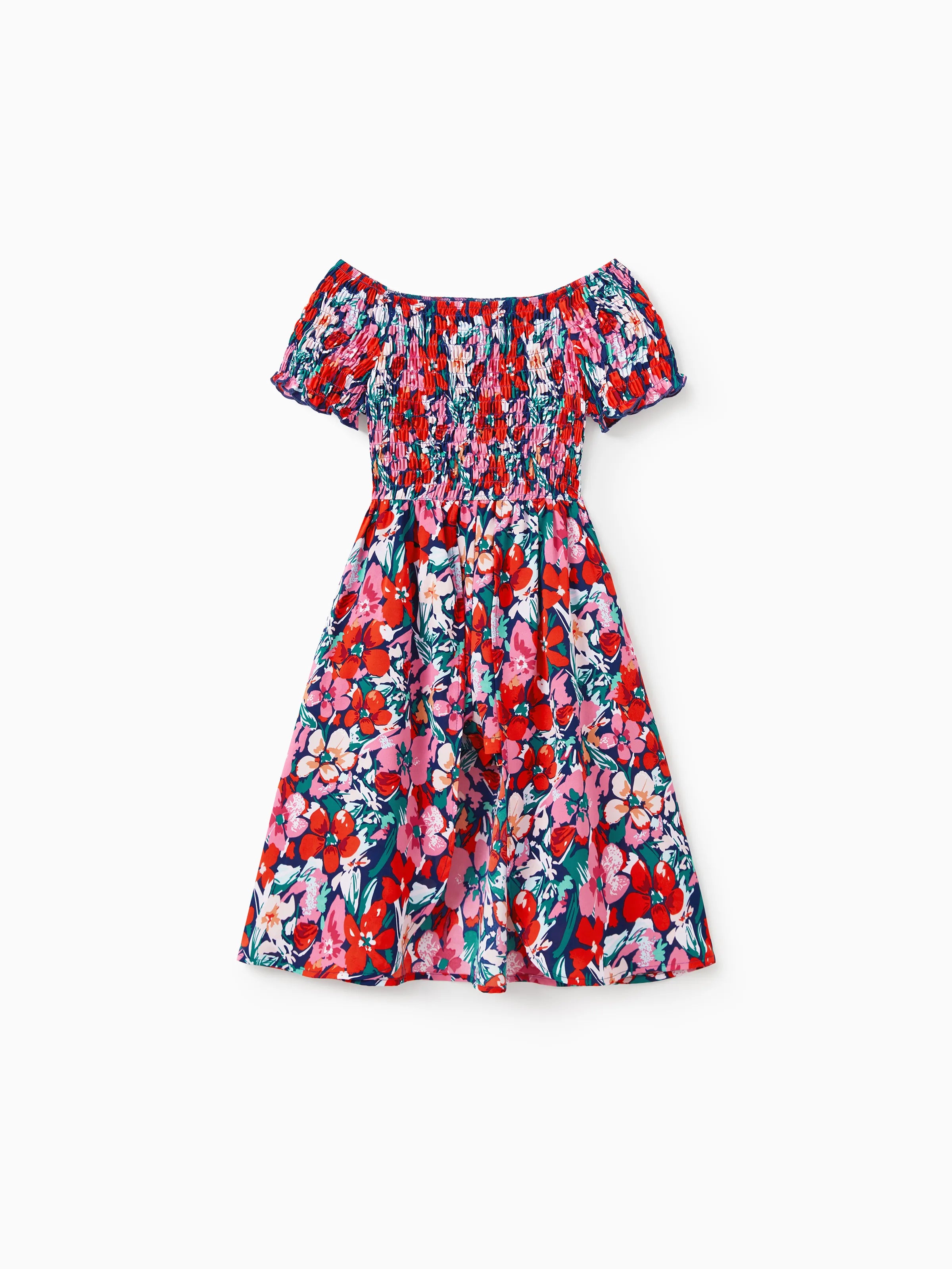 Ensemble familial assorti avec chemise à manches courtes à imprimé floral ou robe smockée à épaules dénudées, bleu foncé