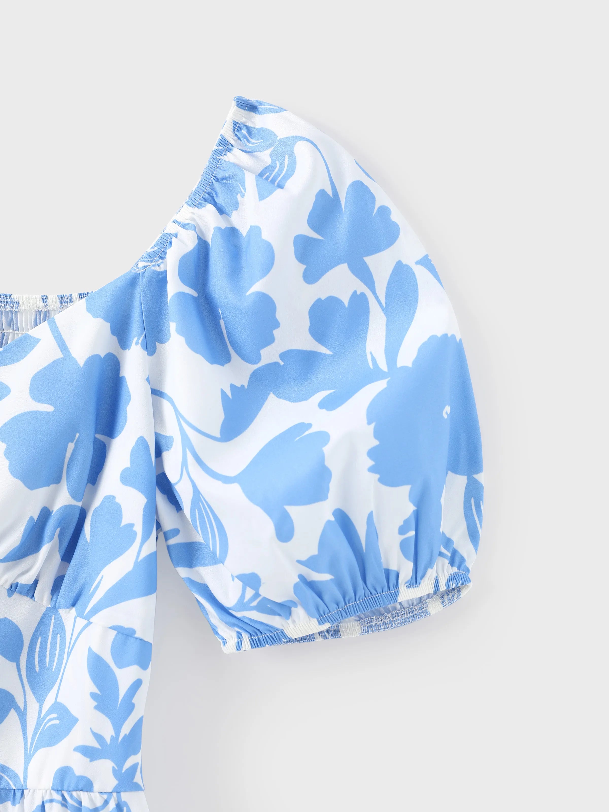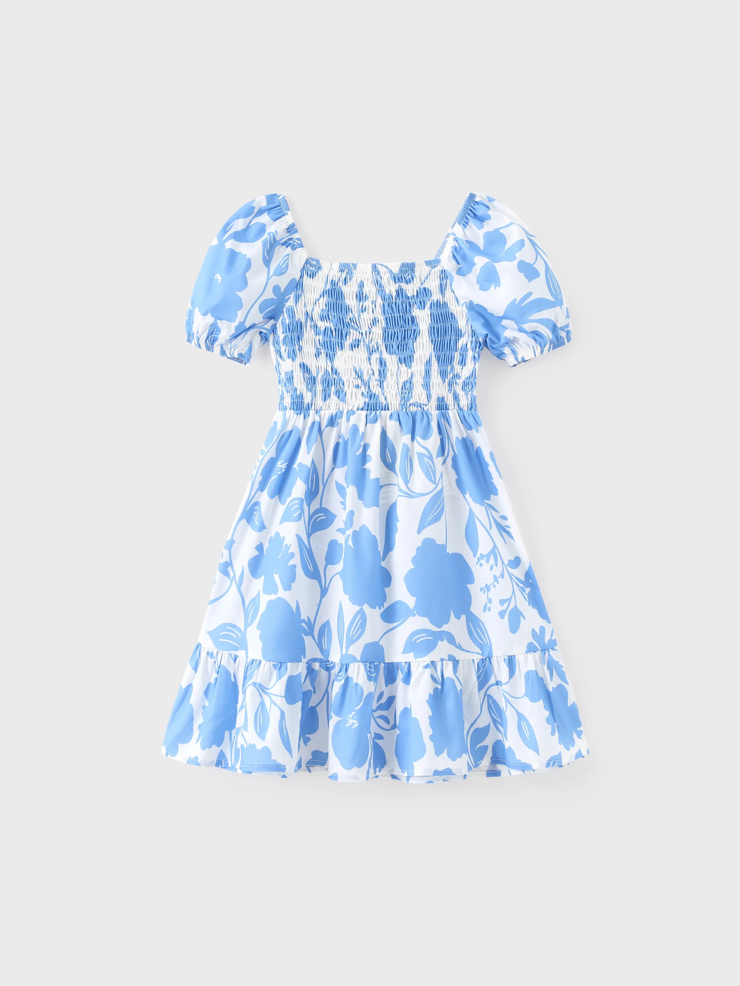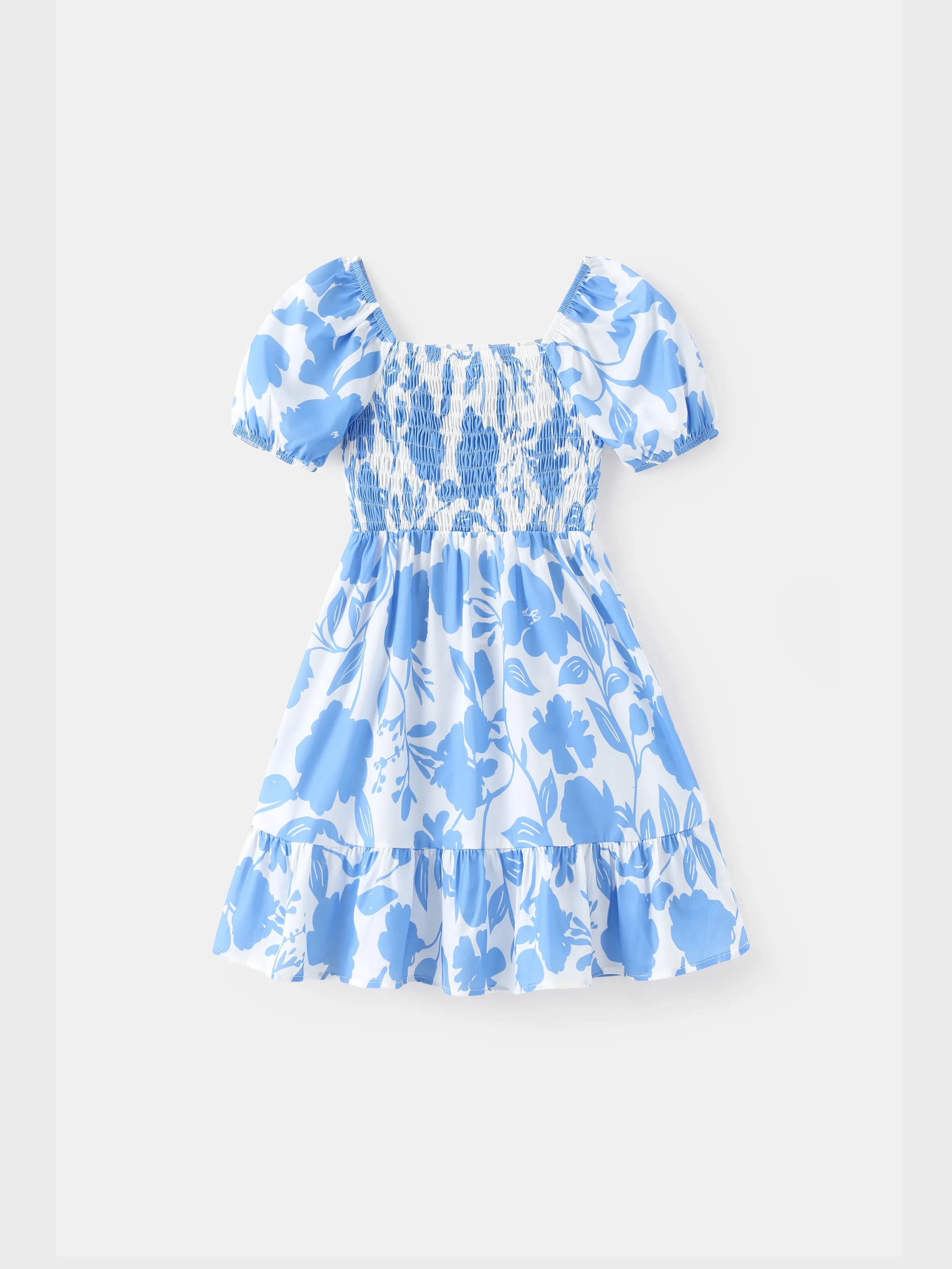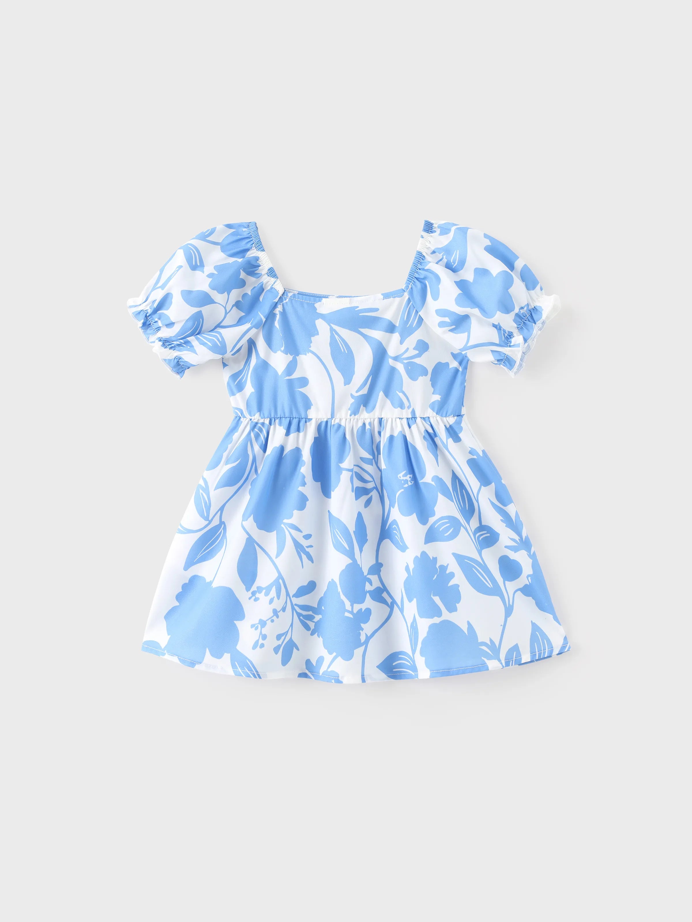 Tenues familiales assorties : robe à imprimé floral bleu et blanc ou t-shirt colorblock, ensemble vacances d'été bleu