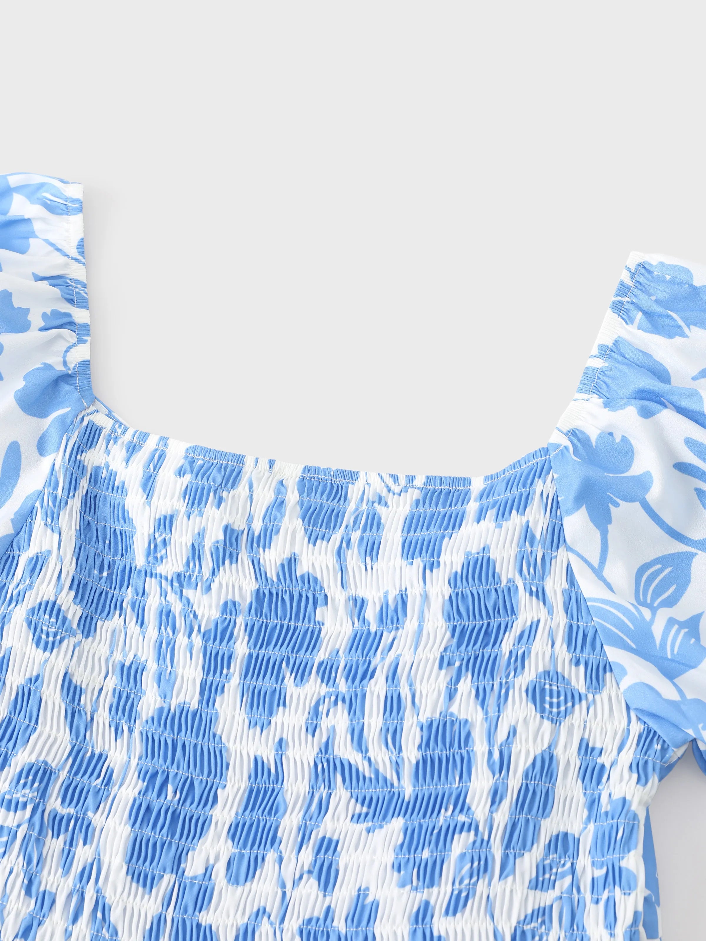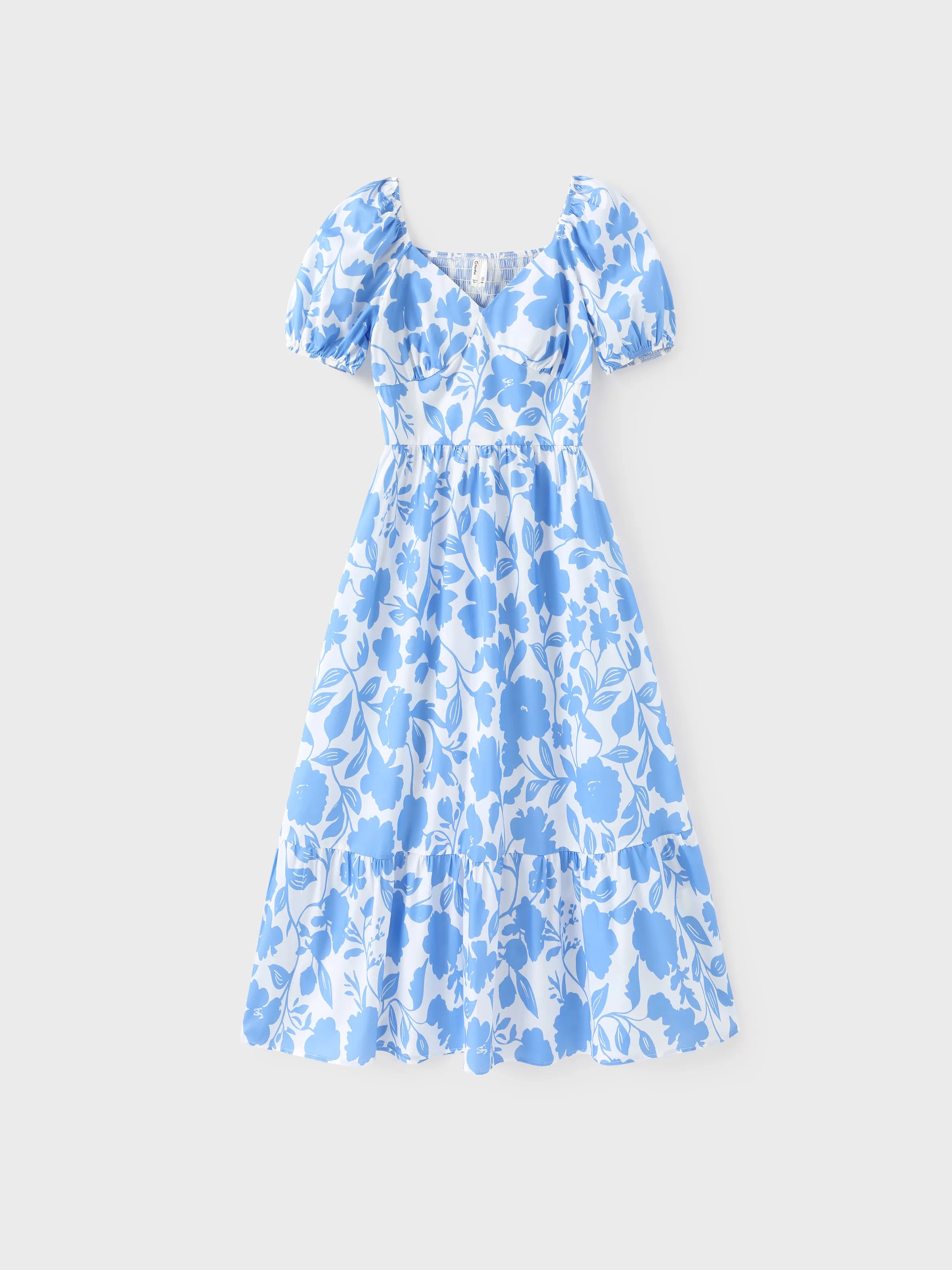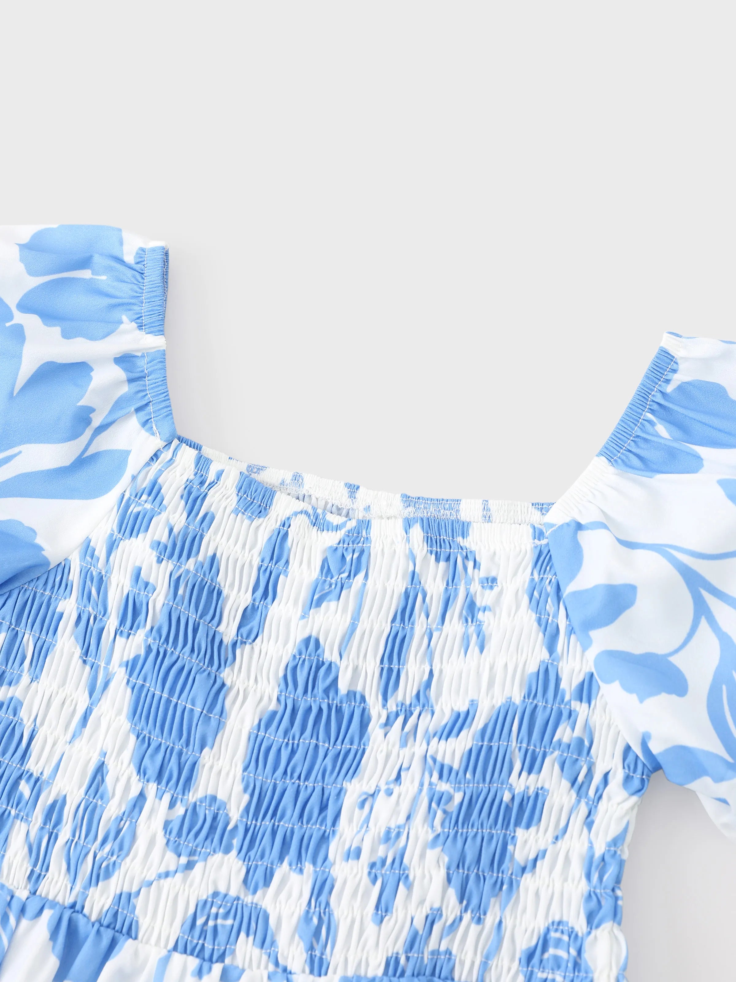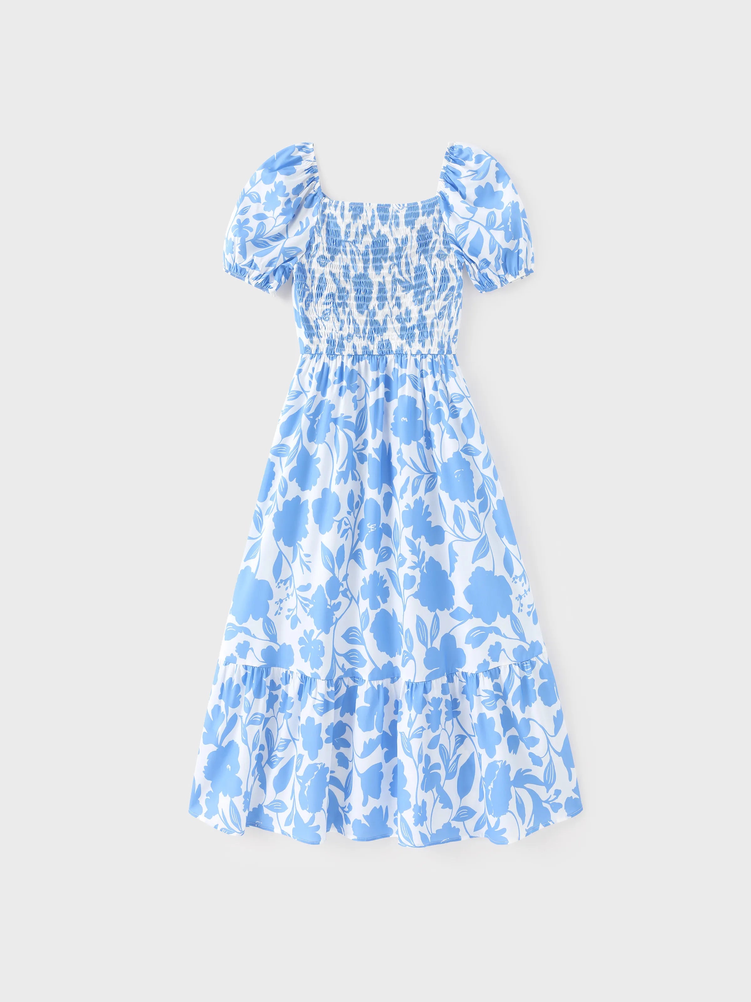 Tenues familiales assorties : robe à imprimé floral bleu et blanc ou t-shirt colorblock, ensemble vacances d'été bleu