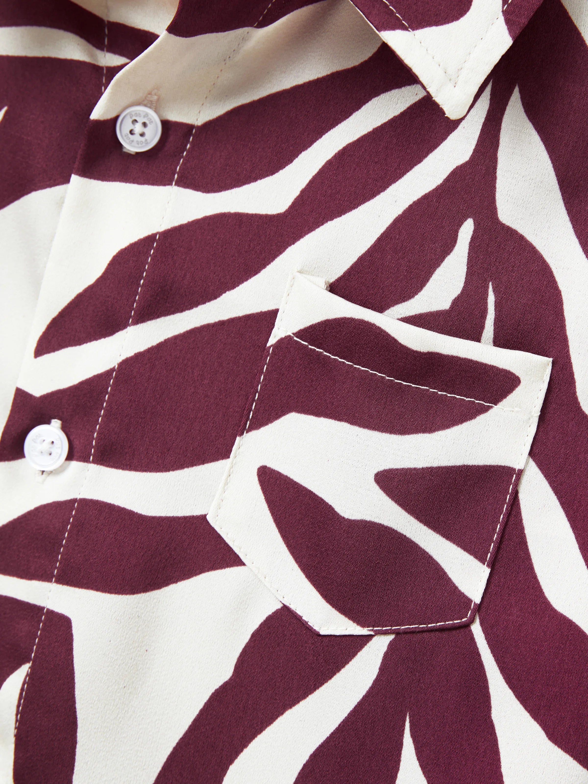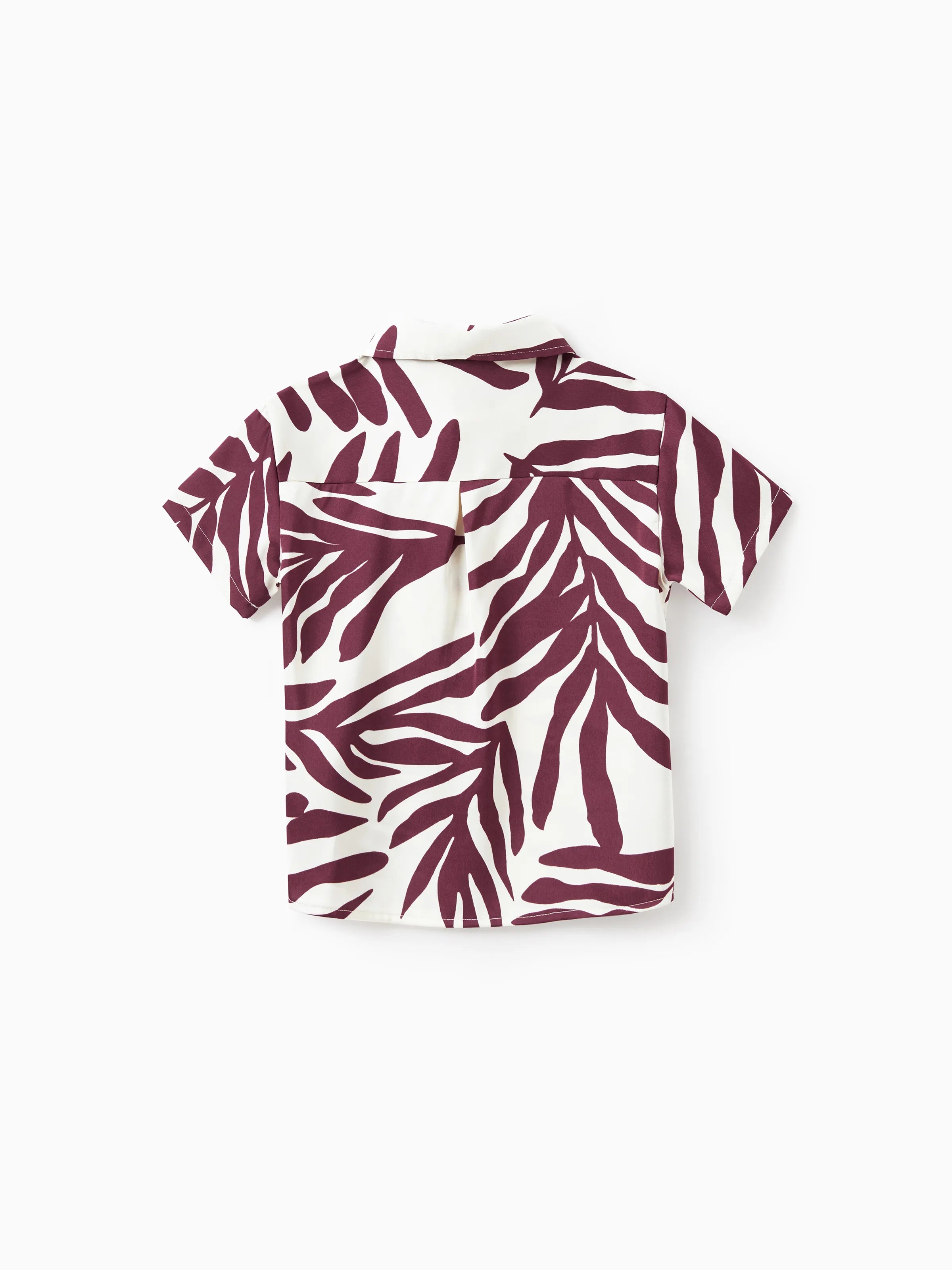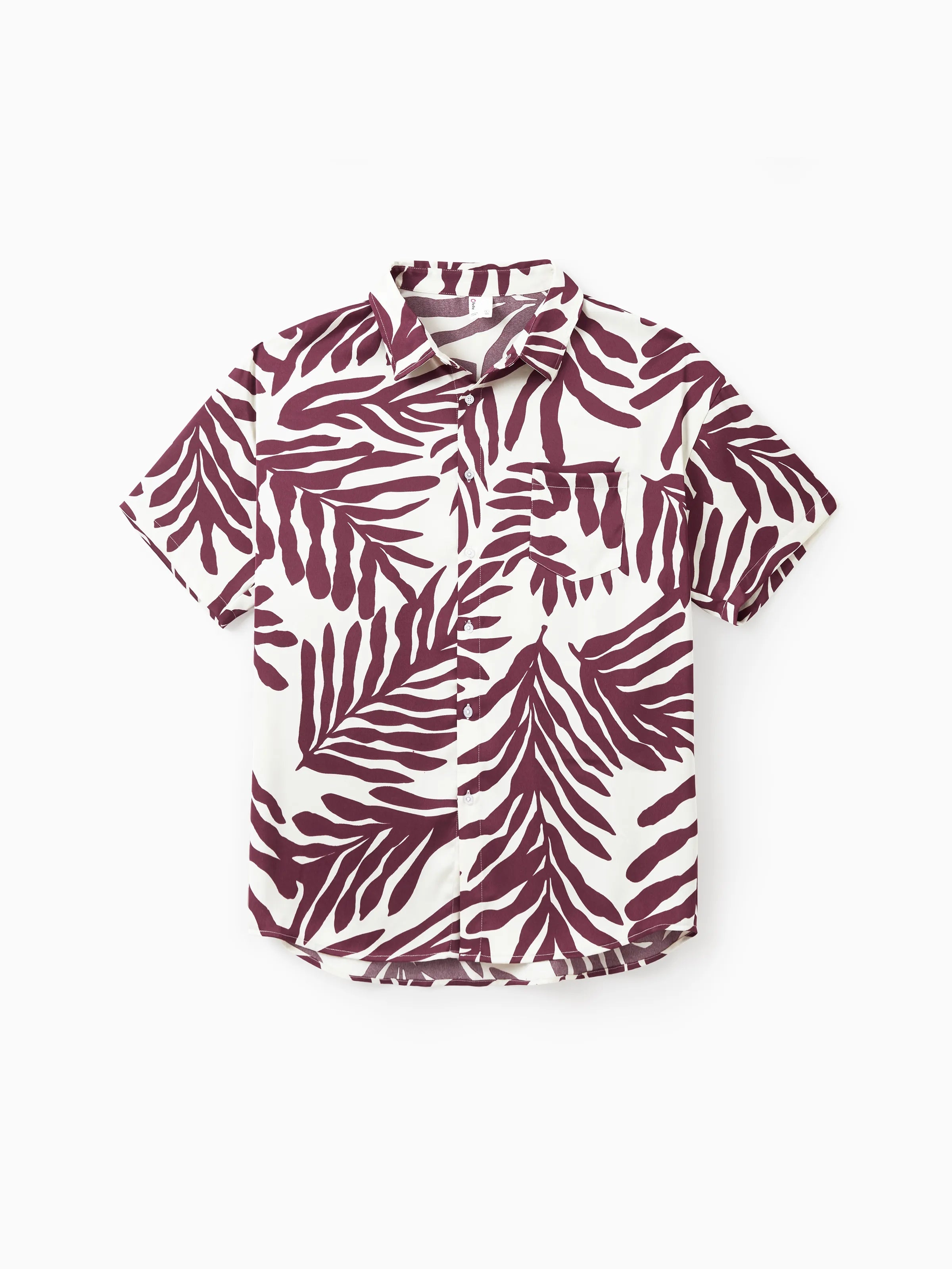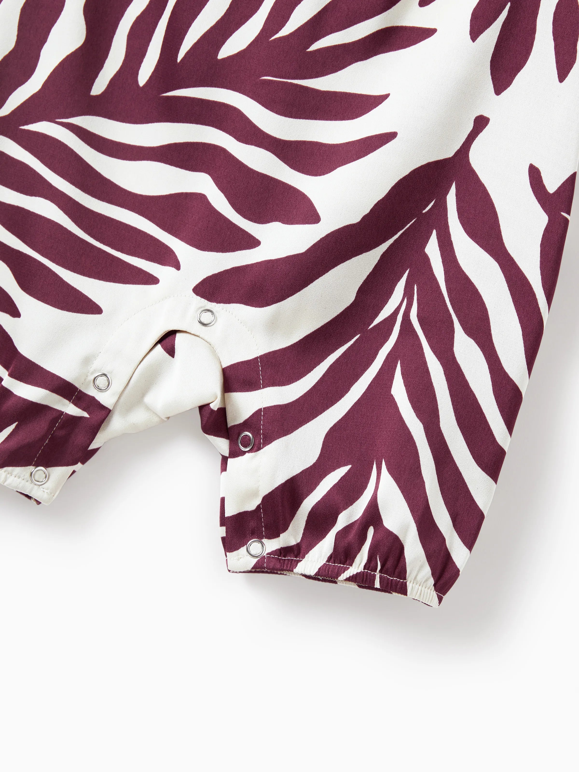 Ensemble familial bordeaux avec imprimé tropical dégageant une ambiance de vacances.