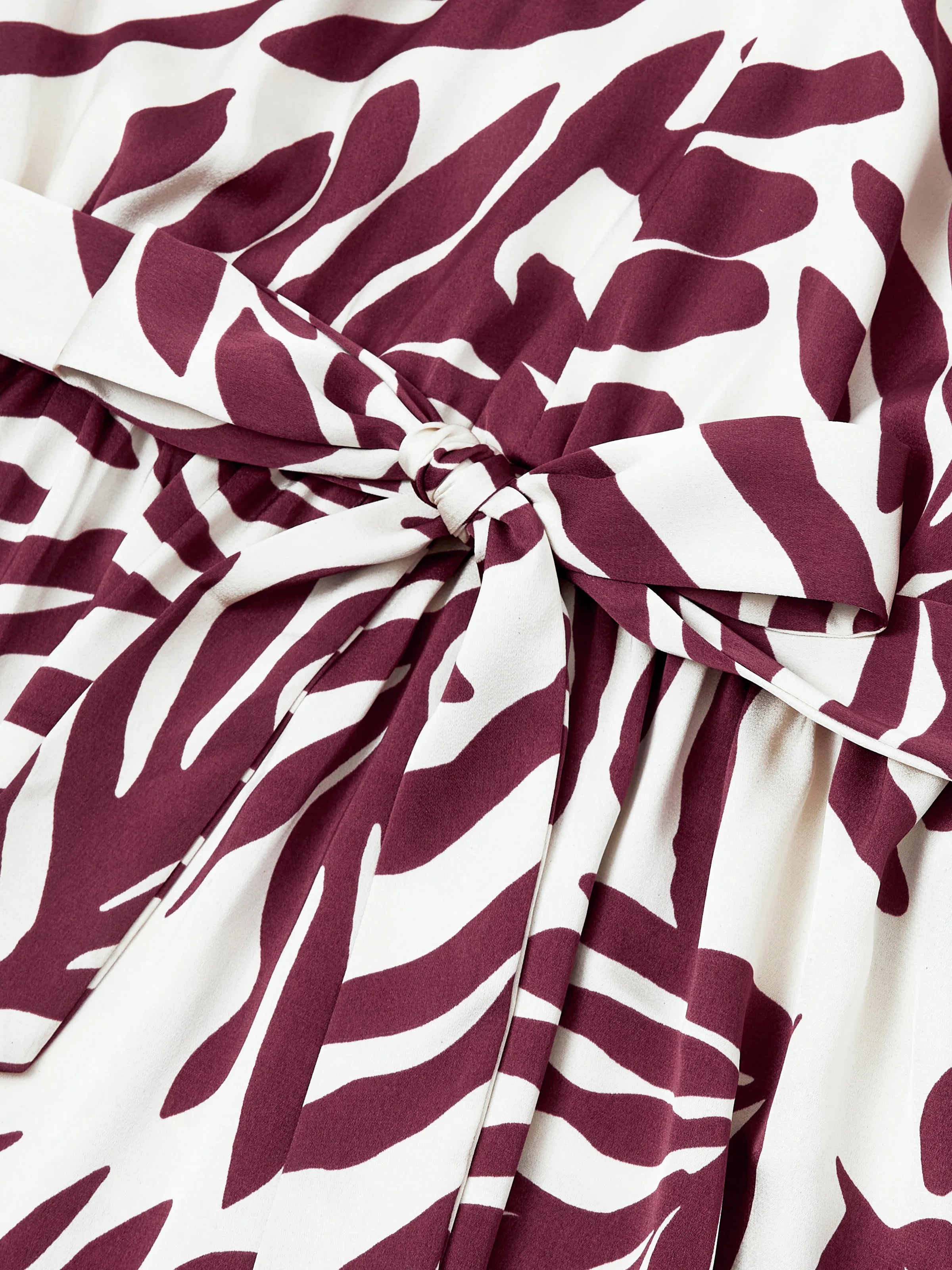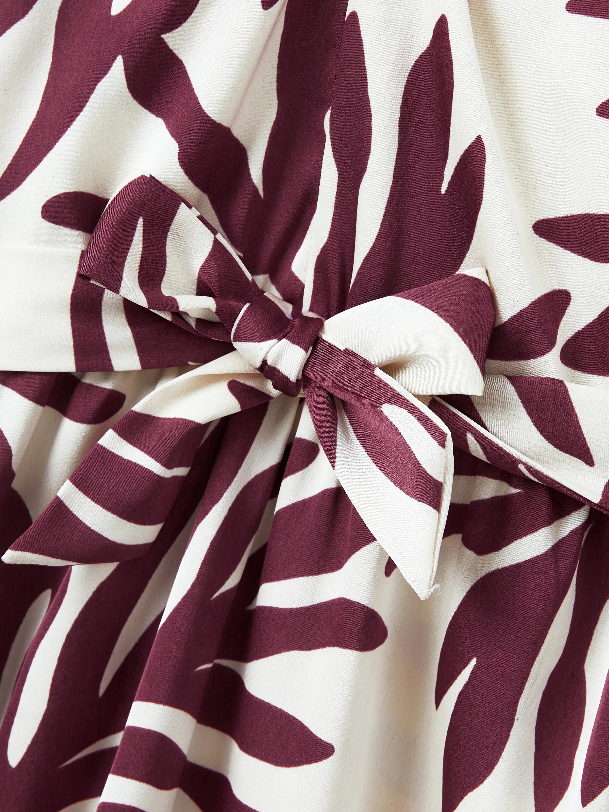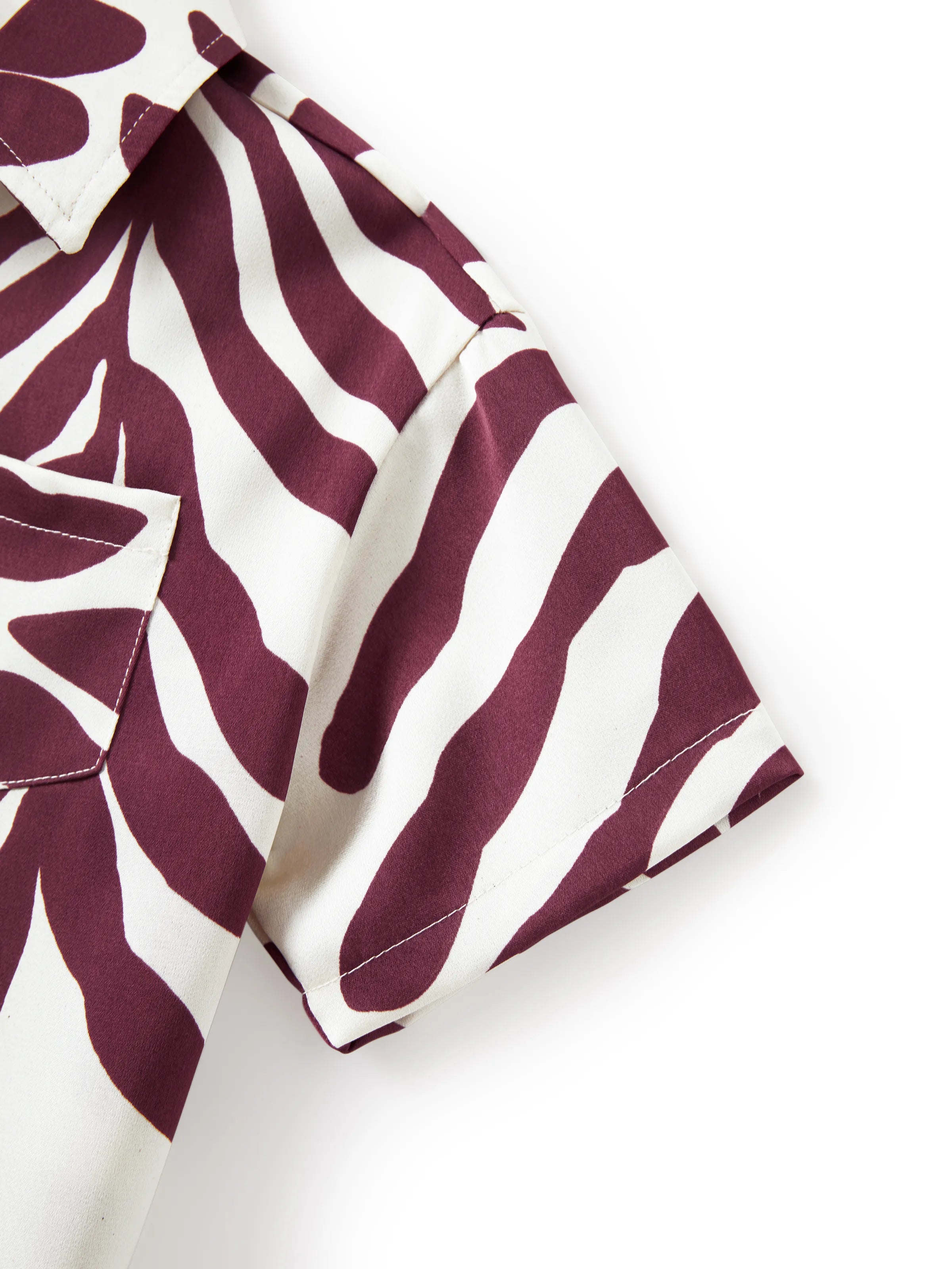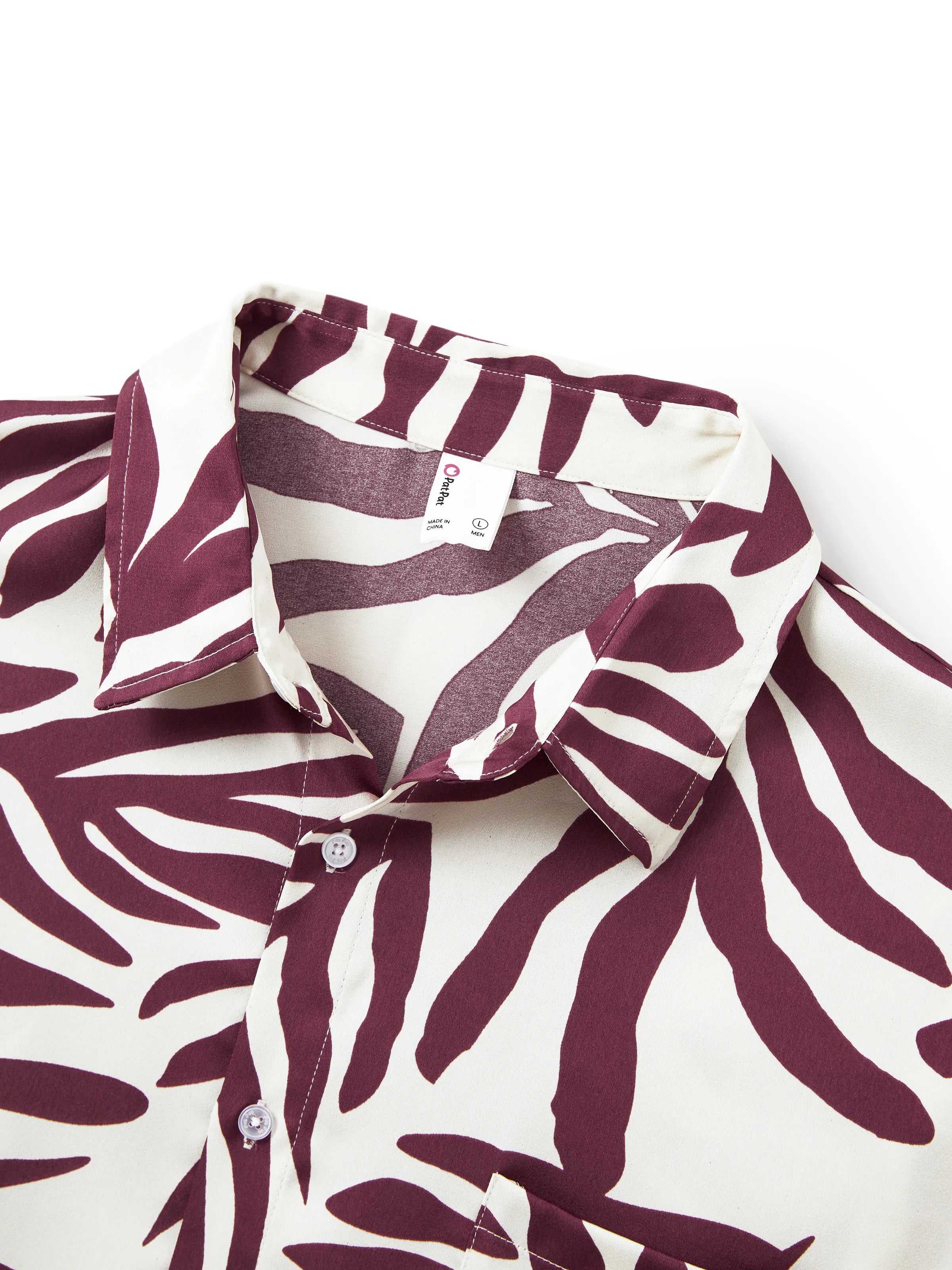 Ensemble familial bordeaux avec imprimé tropical dégageant une ambiance de vacances.
