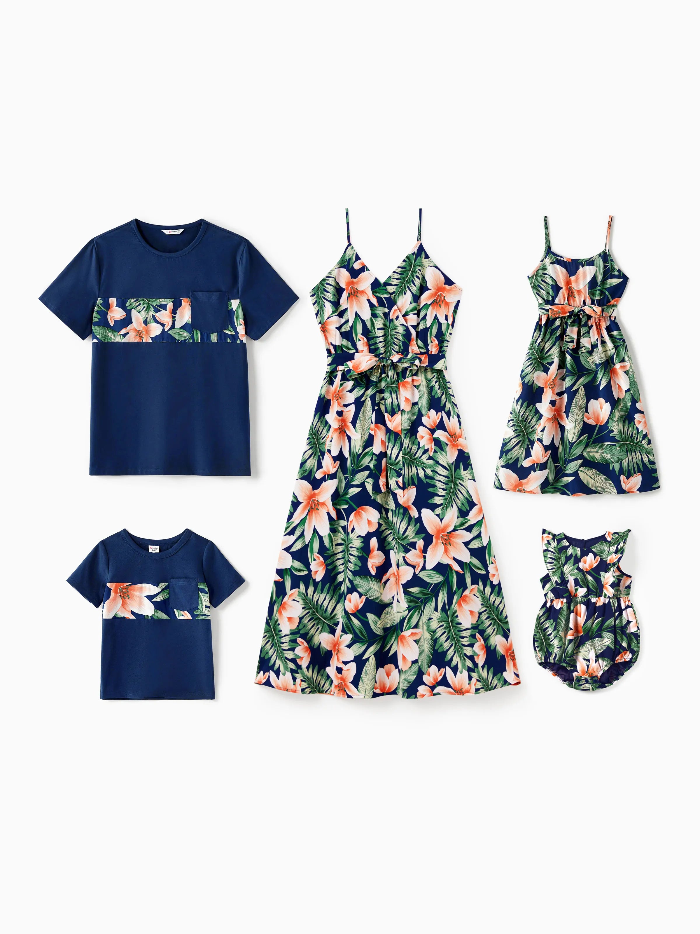 • Les hommes et les garçons portent un t-shirt à manches courtes tandis que les femmes et les filles portent une robe midi à bretelles spaghetti et col en V.