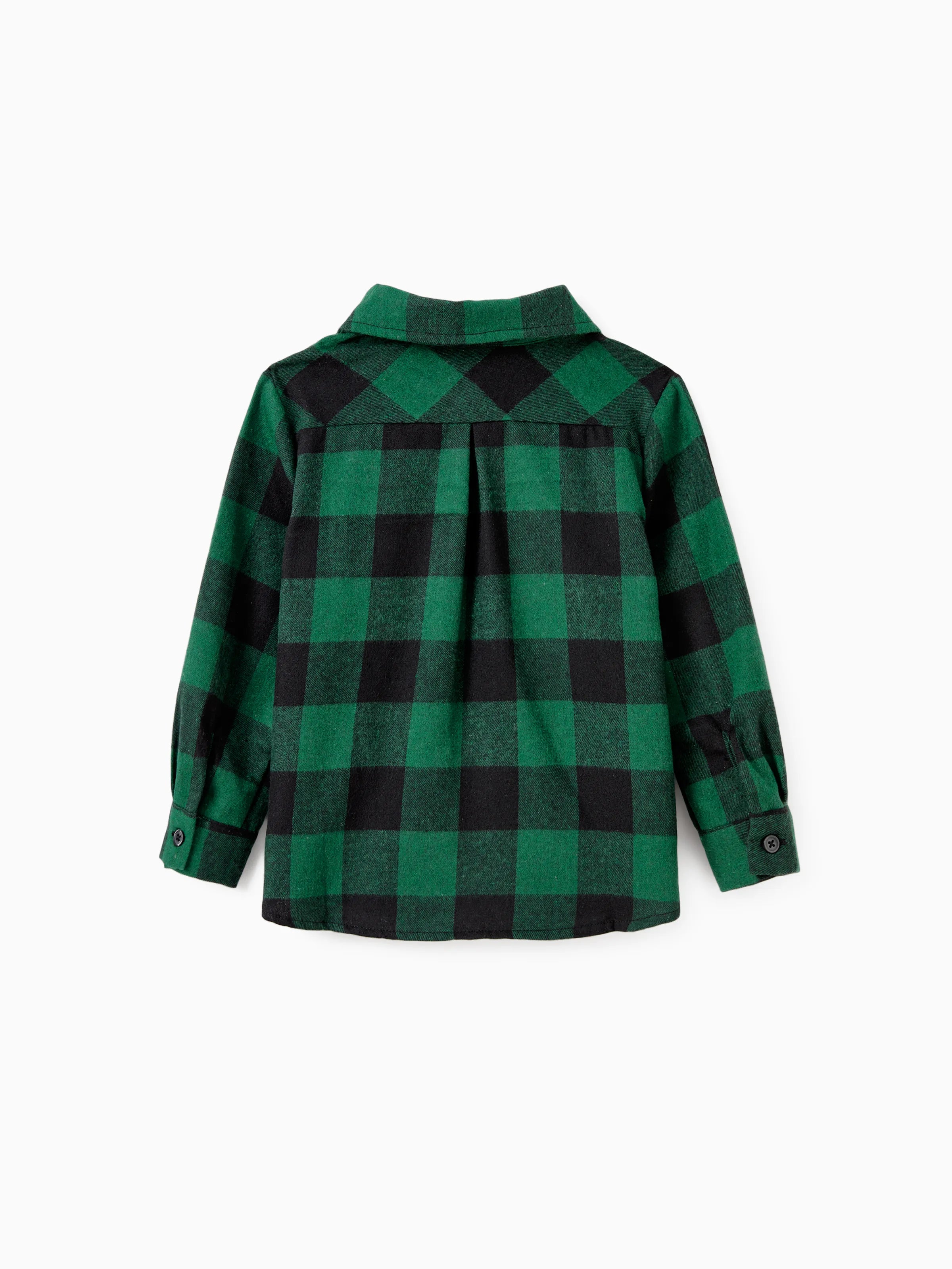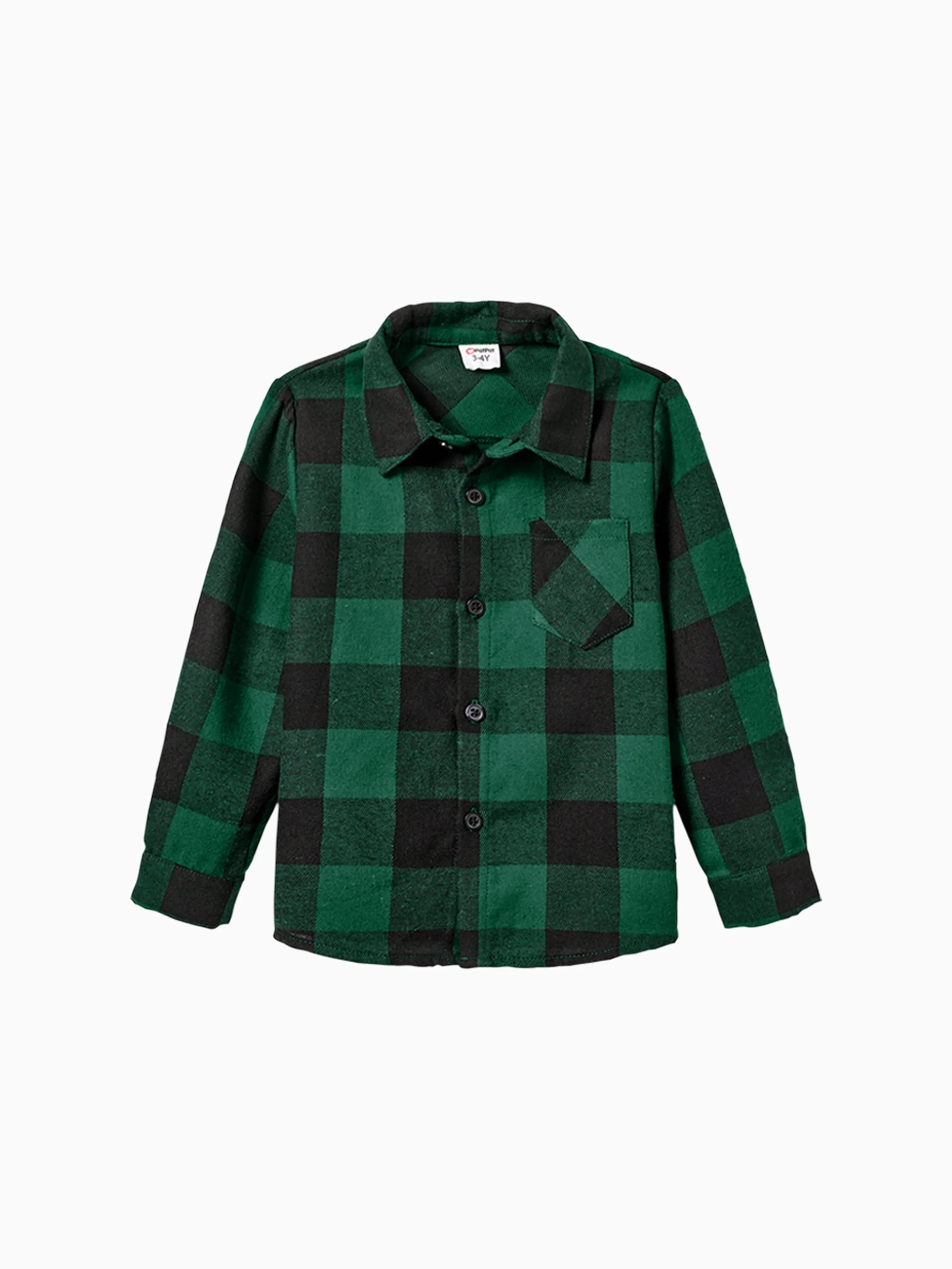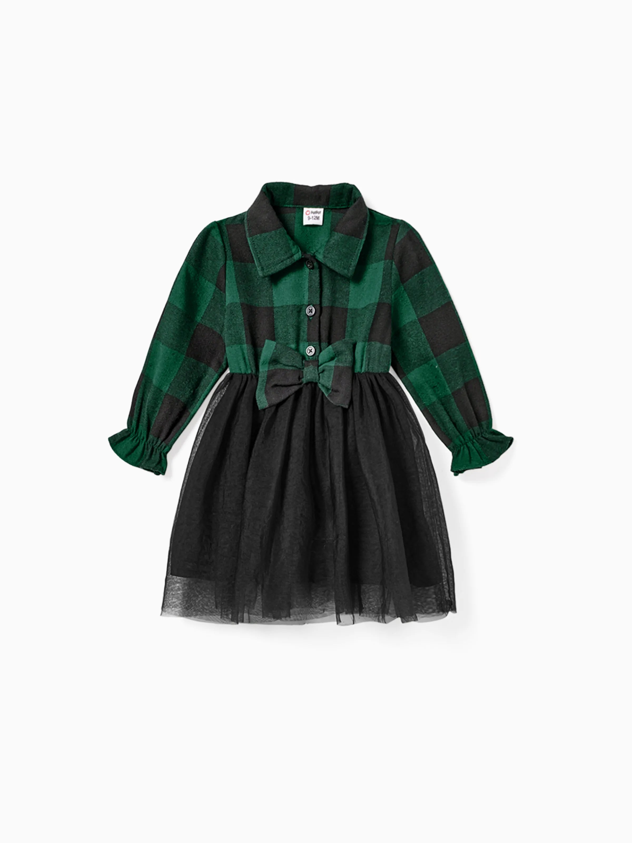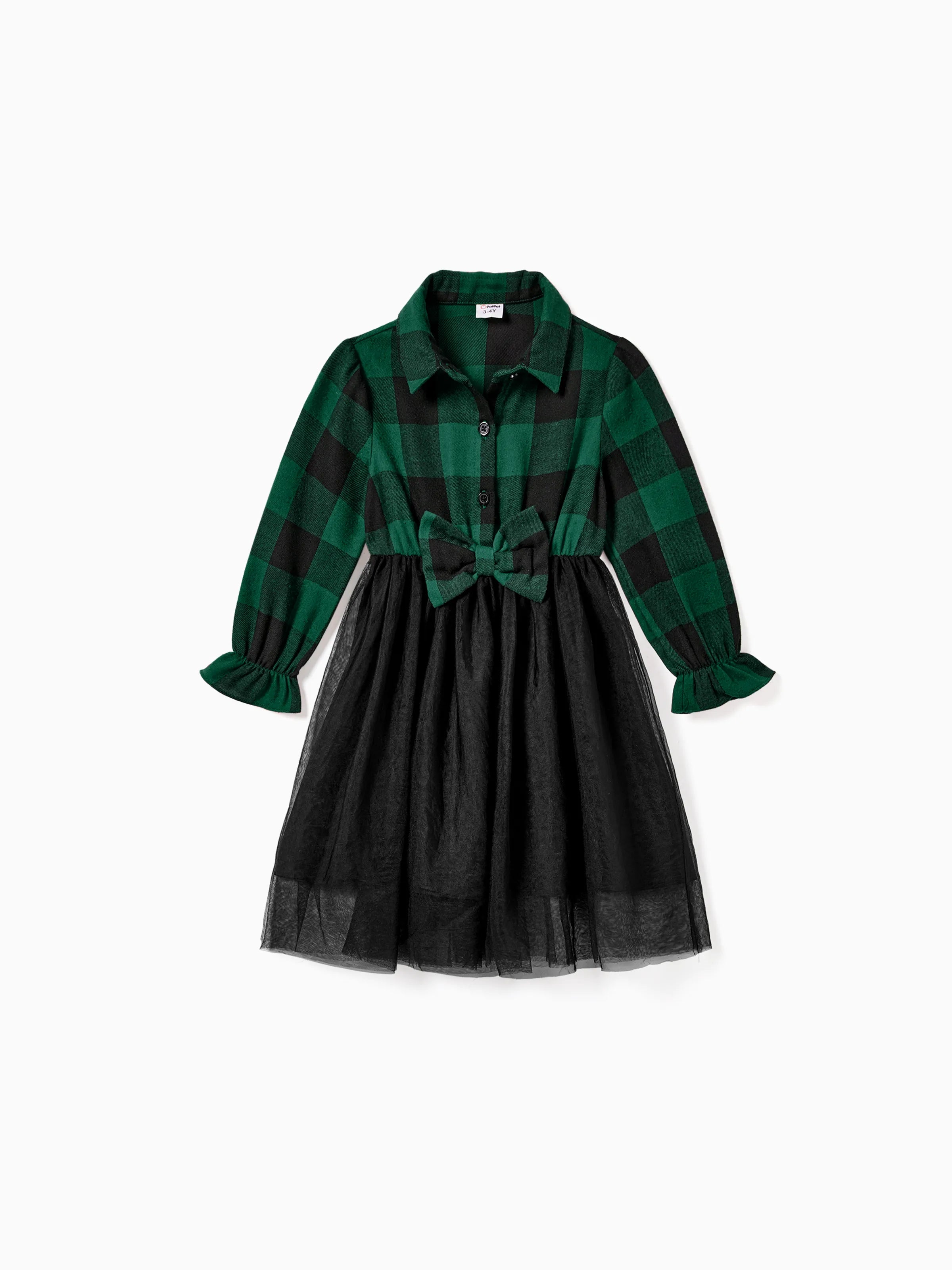 Tenues classiques assorties pour toute la famille, comprenant une chemise à carreaux verte et une robe en tulle.