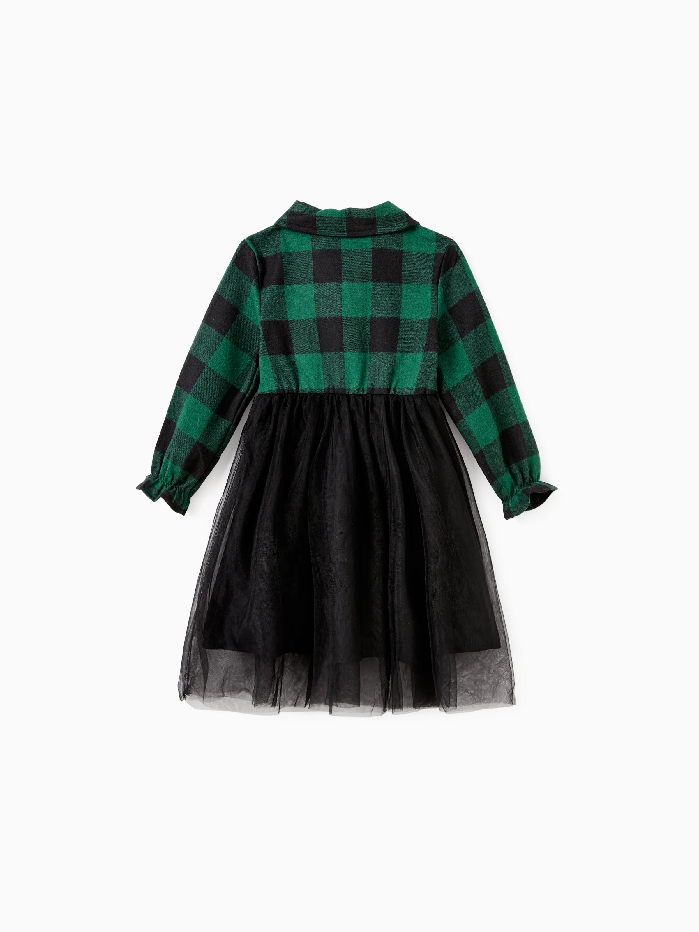 Ensembles familiaux assortis : chemise à manches longues à carreaux verts ou robe en tulle vert foncé
