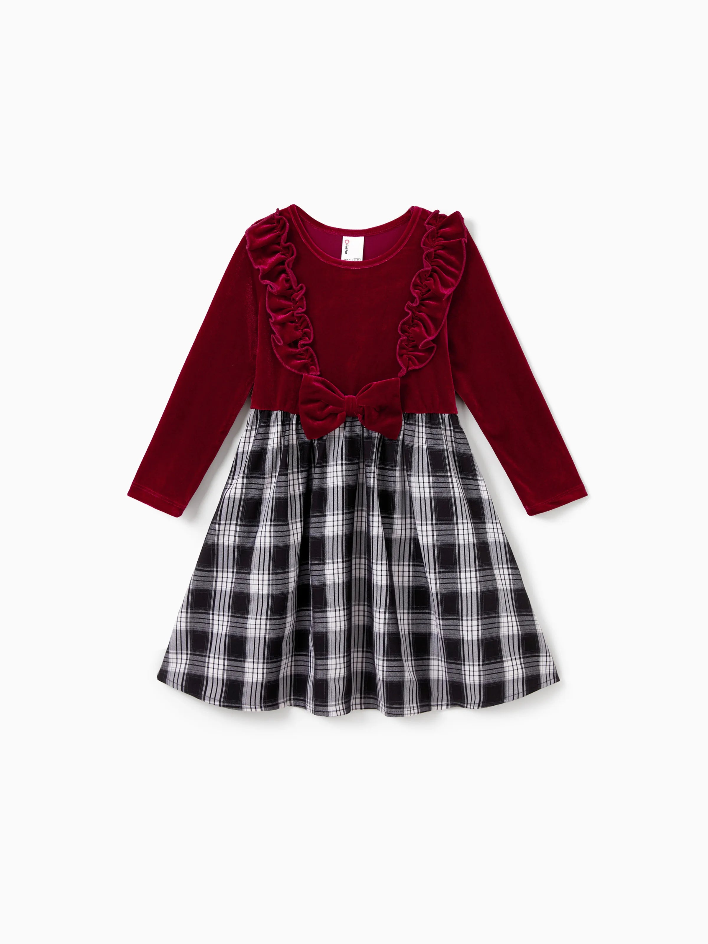 • Robe bébé et fille : Décor nœud papillon, robe à carreaux, col rond, manches longues