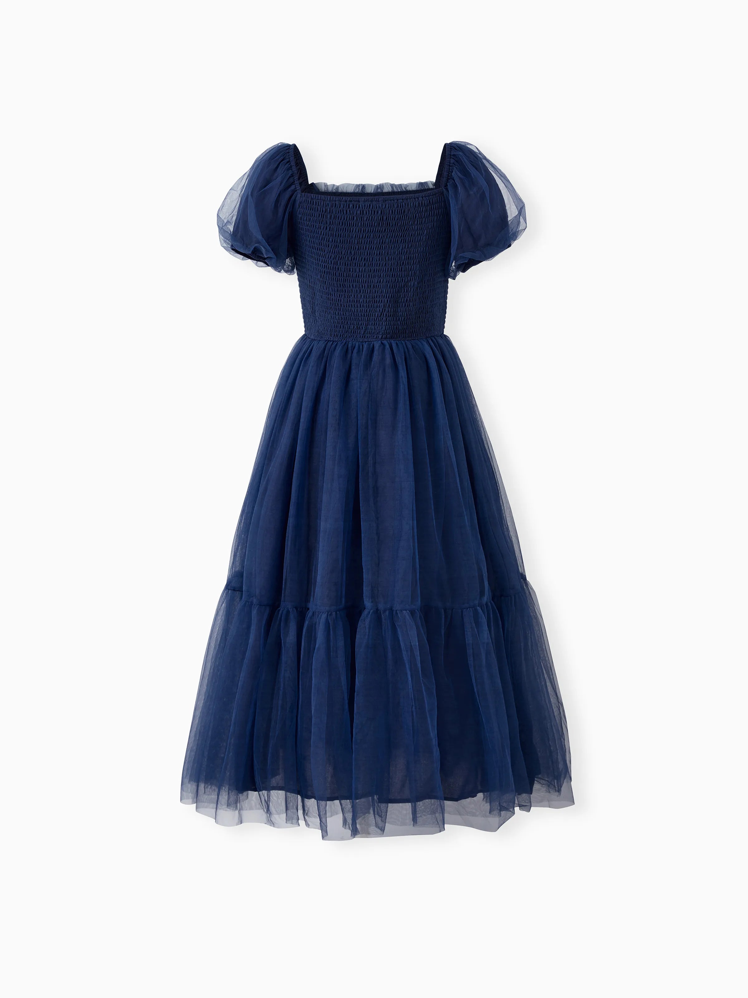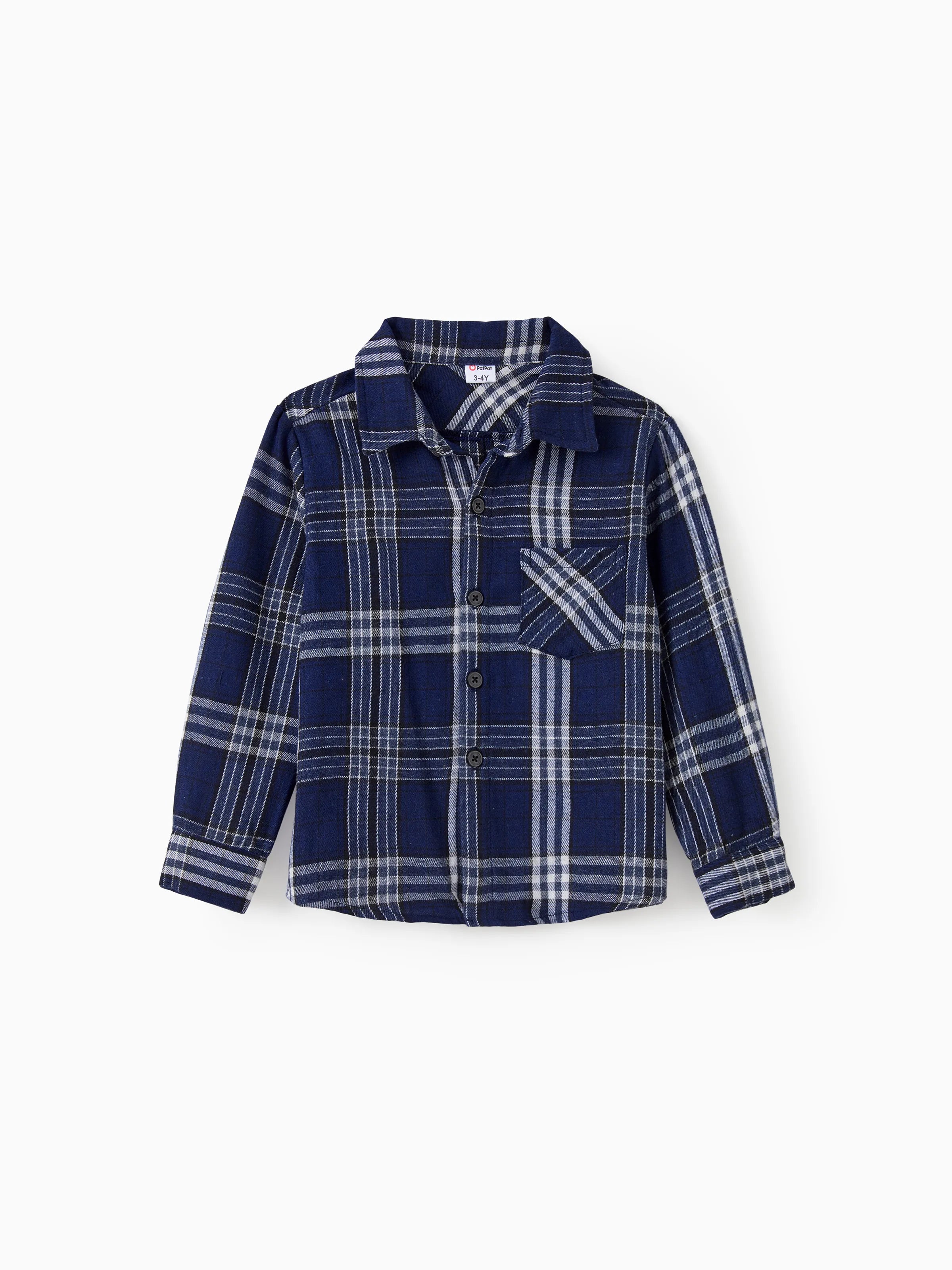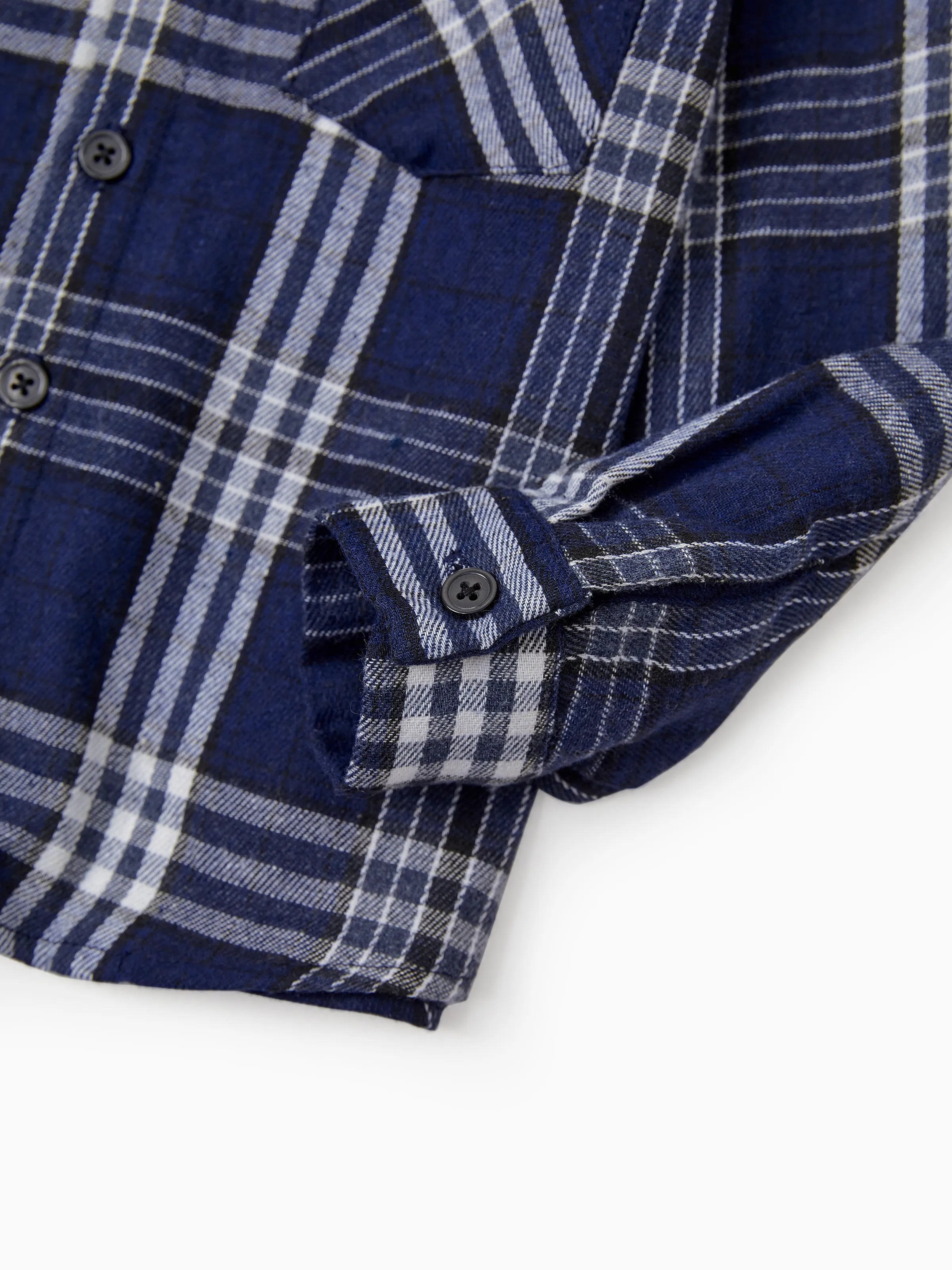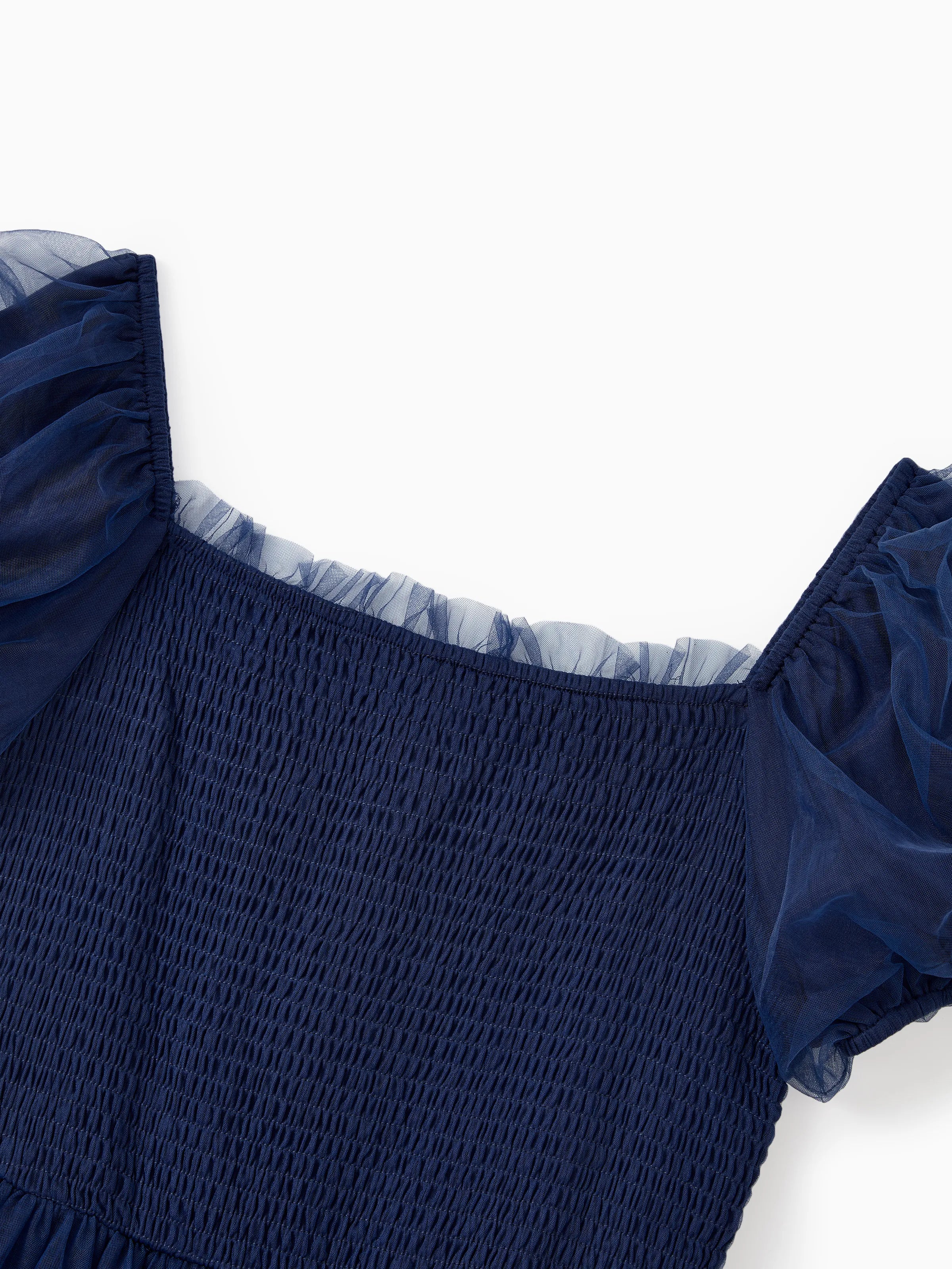 Une tenue familiale classique assortie pour l'automne, composée d'une chemise à carreaux bleu foncé et d'une robe en tulle à corsage froncé.