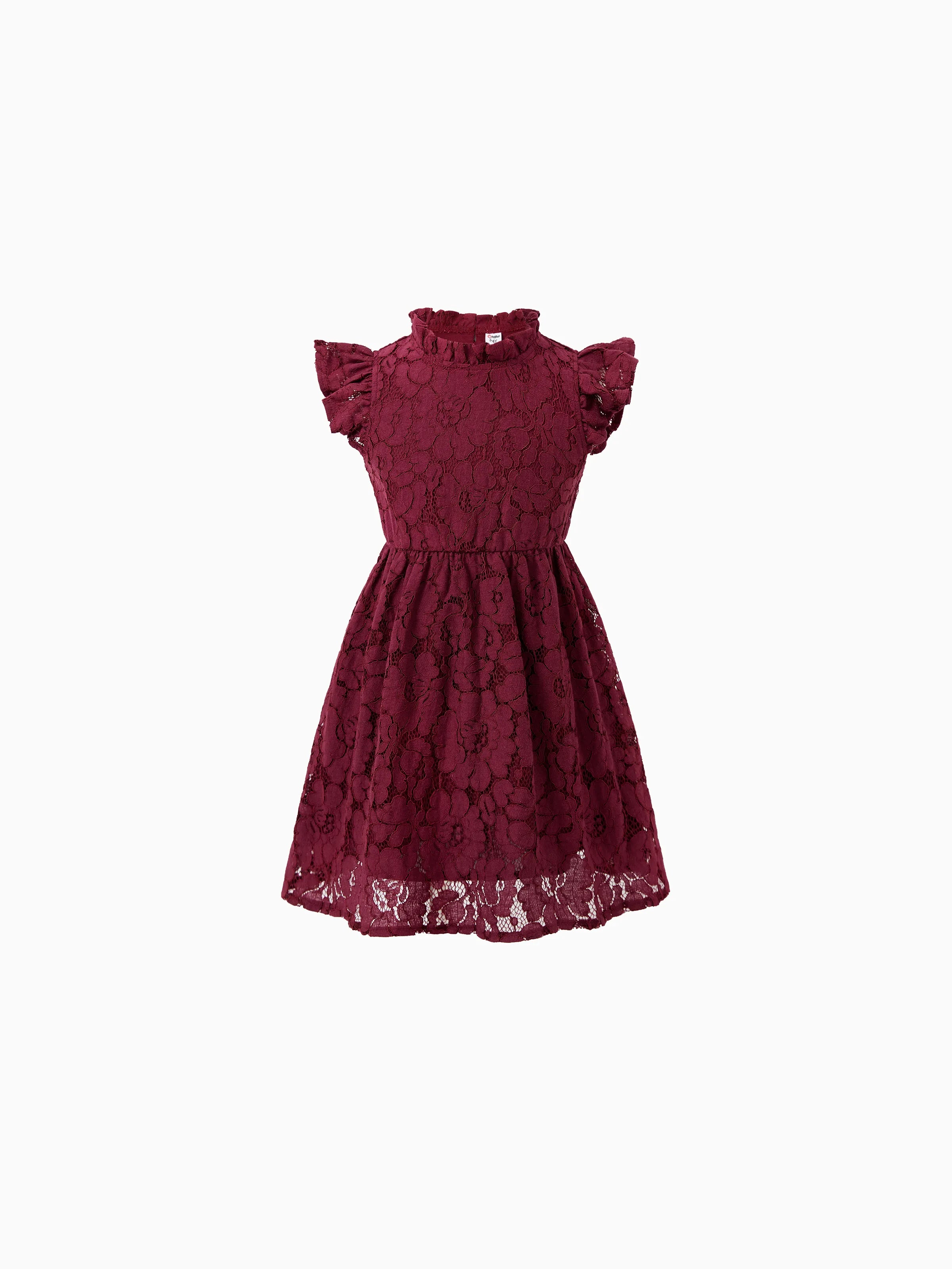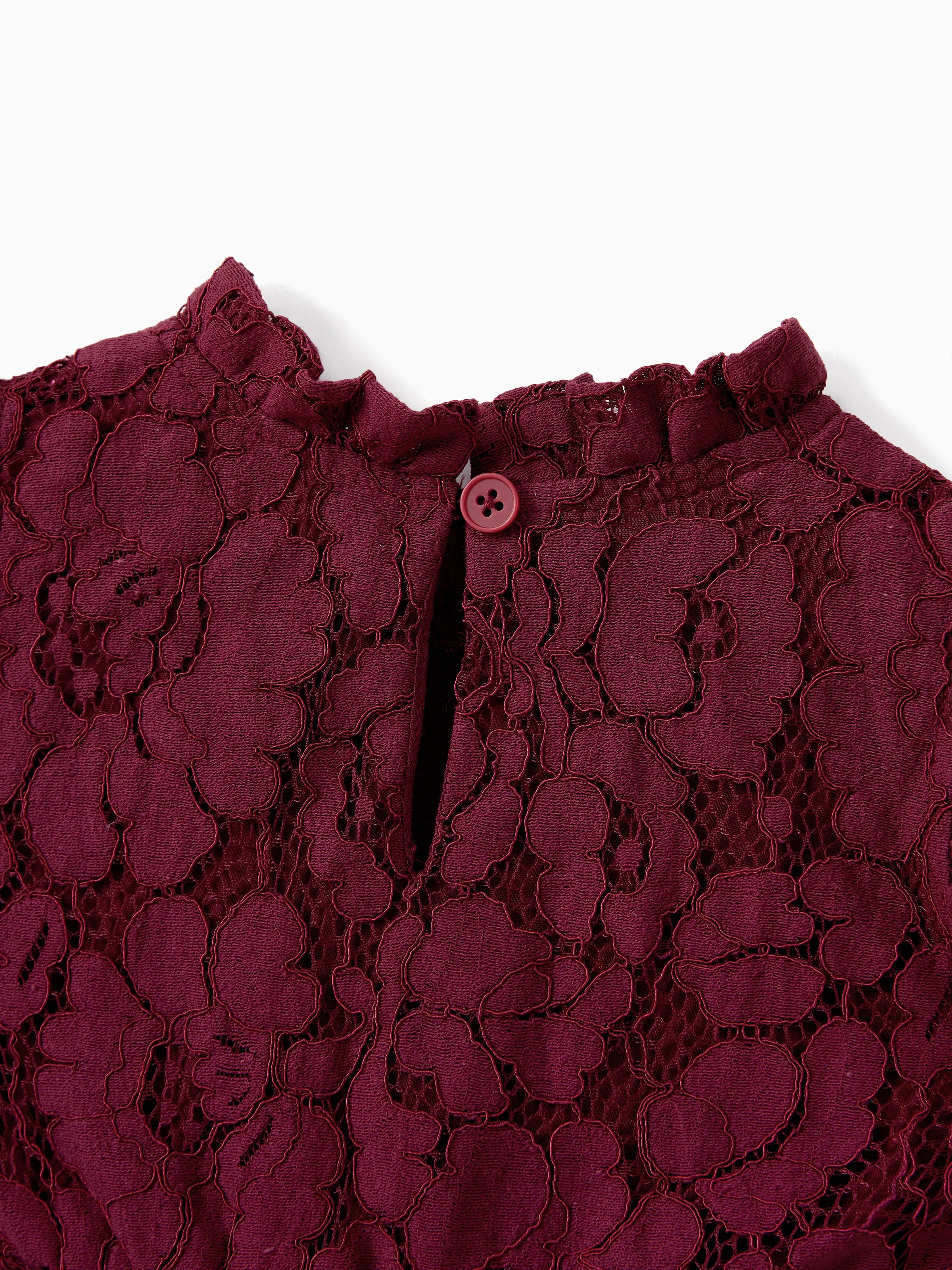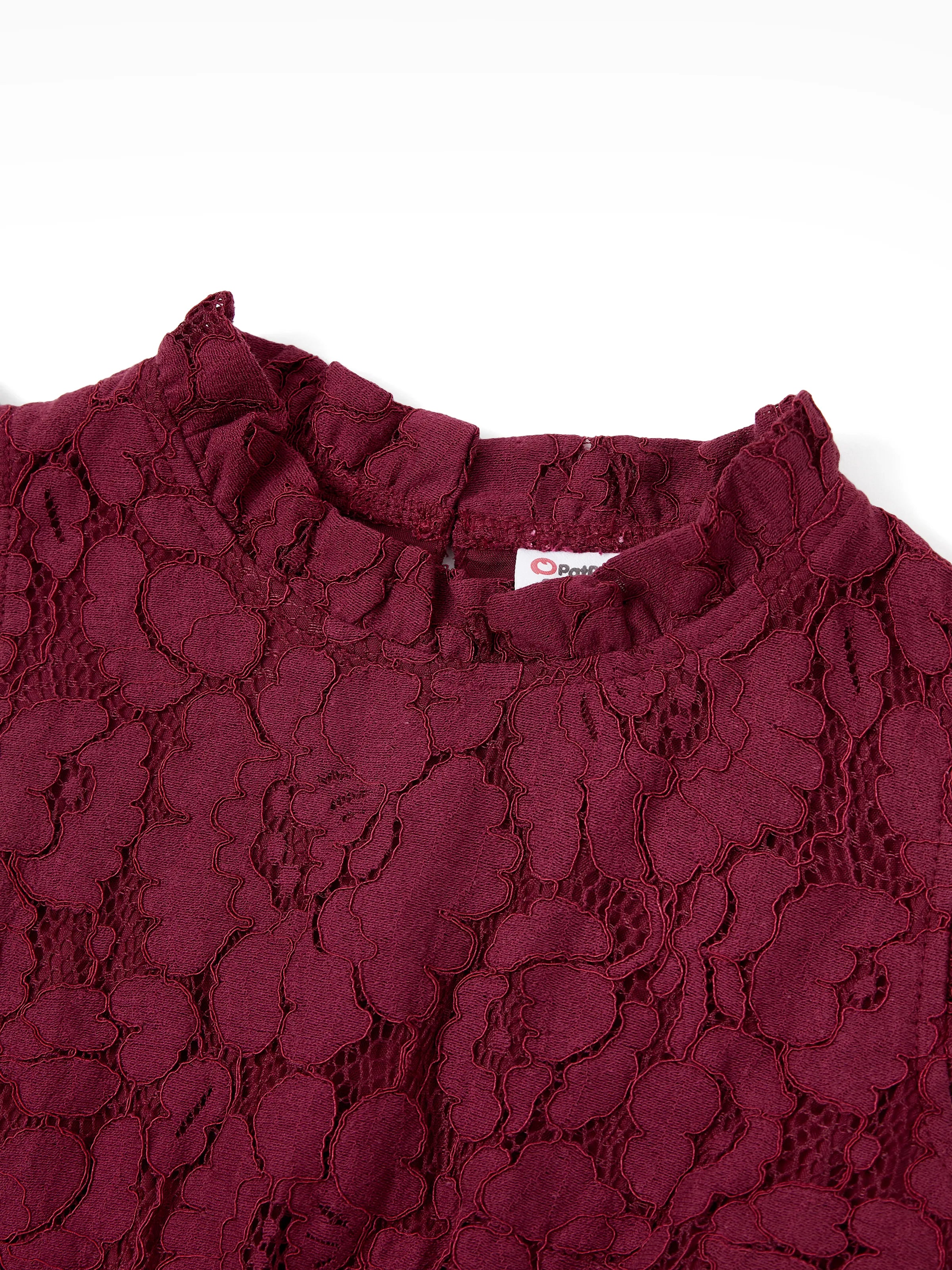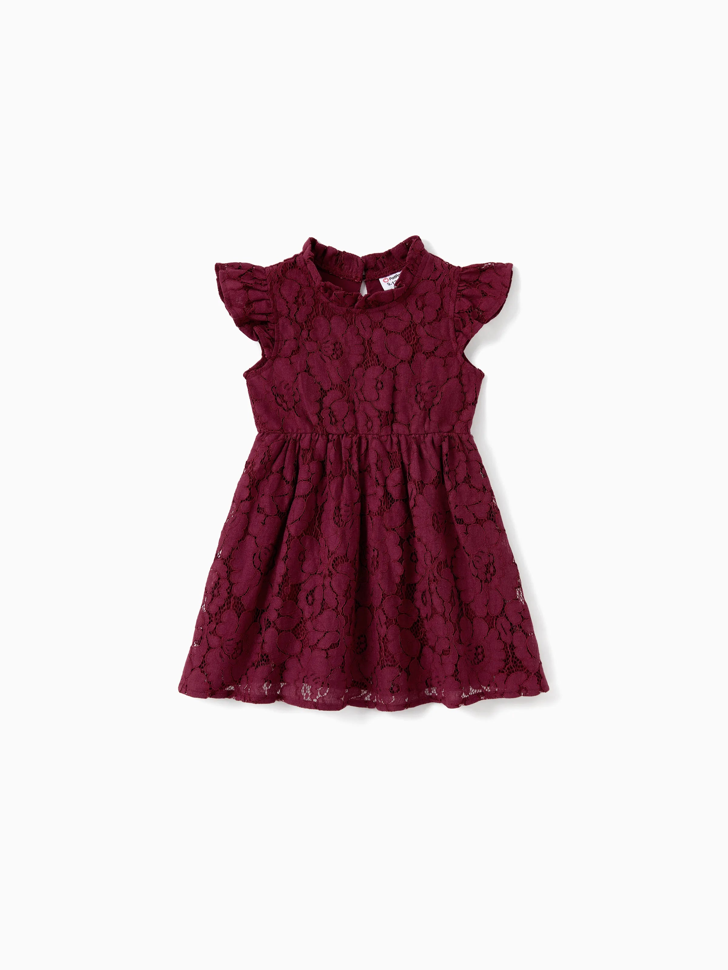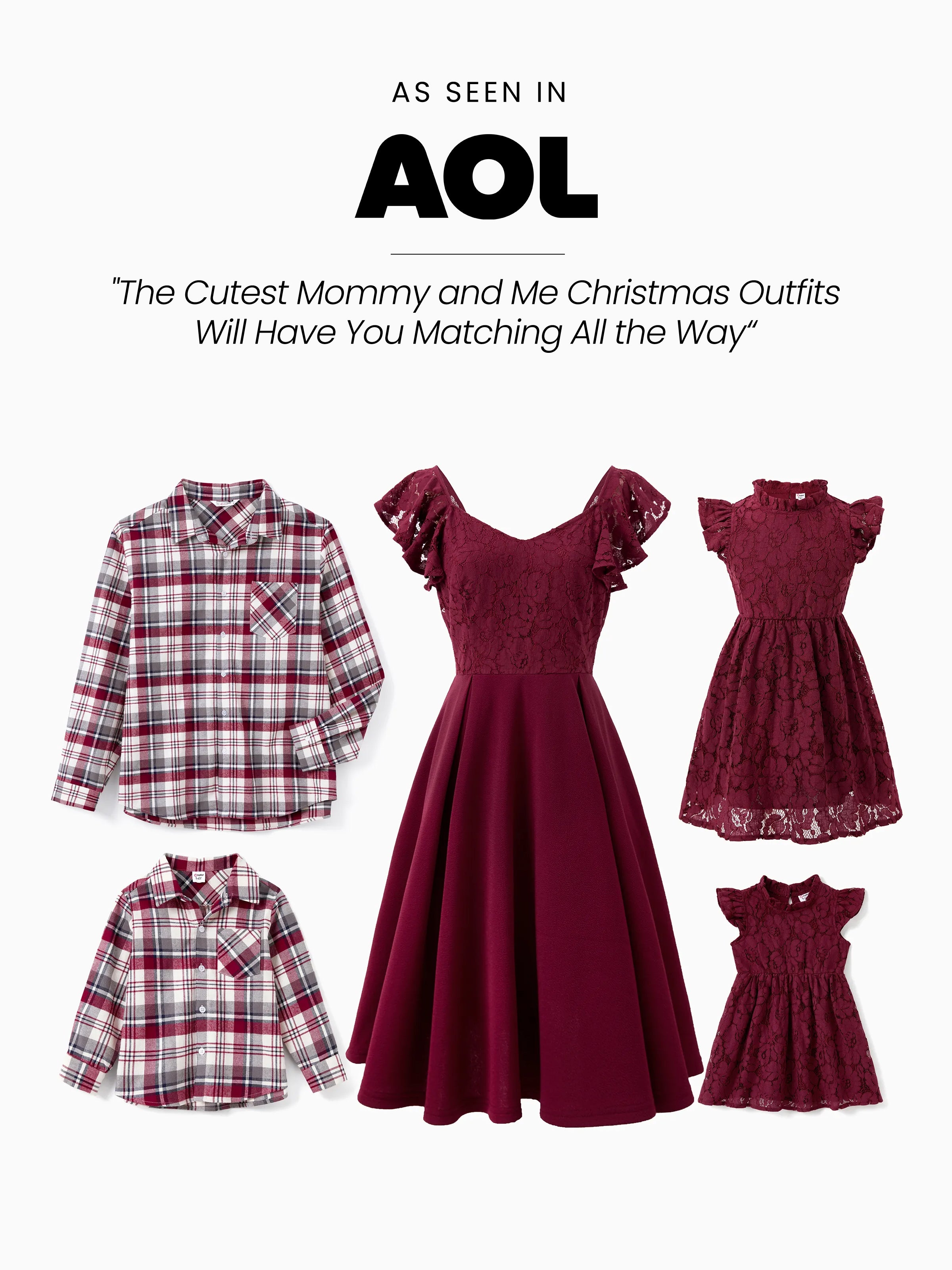 Ensembles familiaux assortis : chemise à carreaux ou robe trapèze à manches volantées en dentelle bordeaux