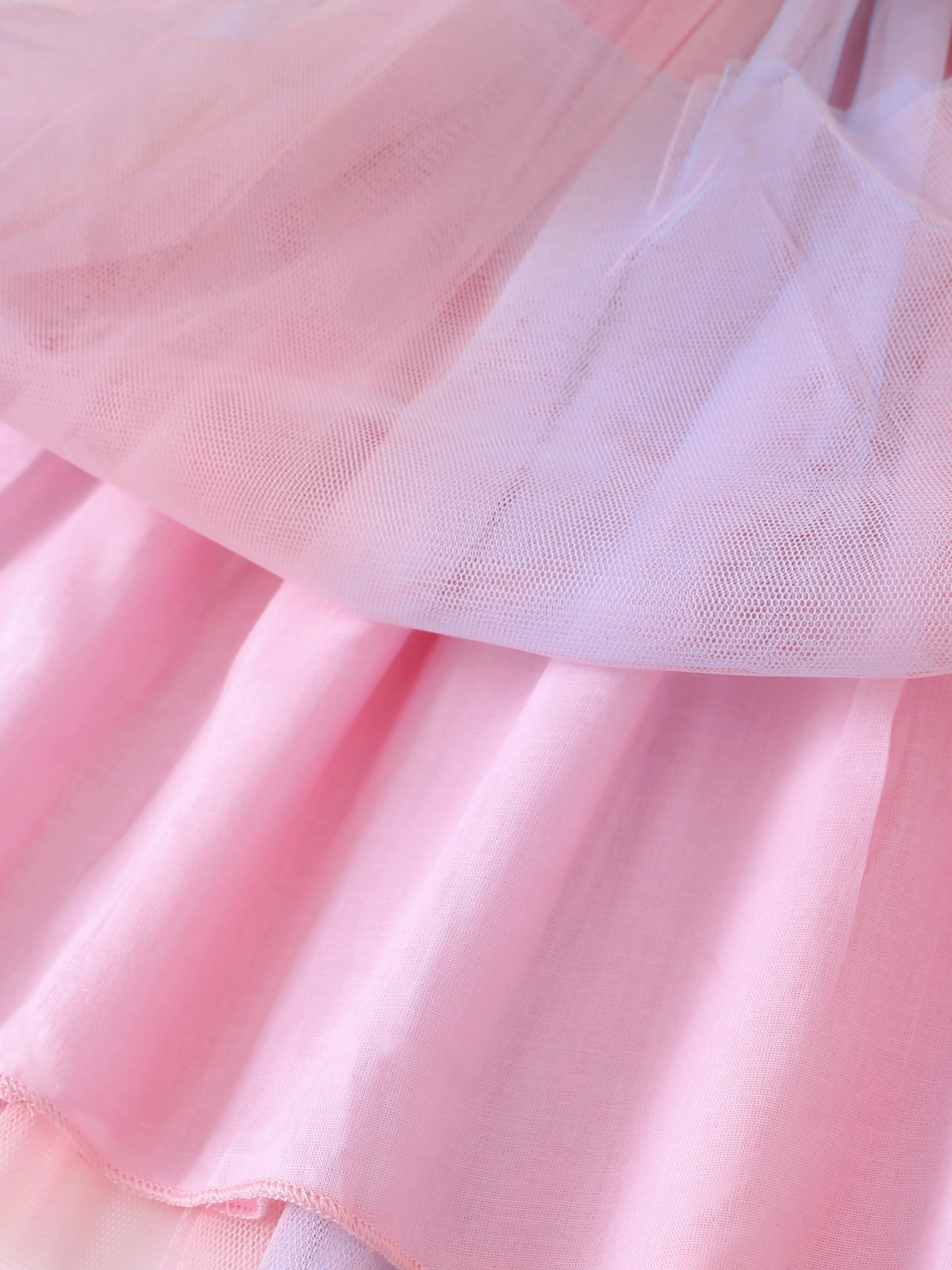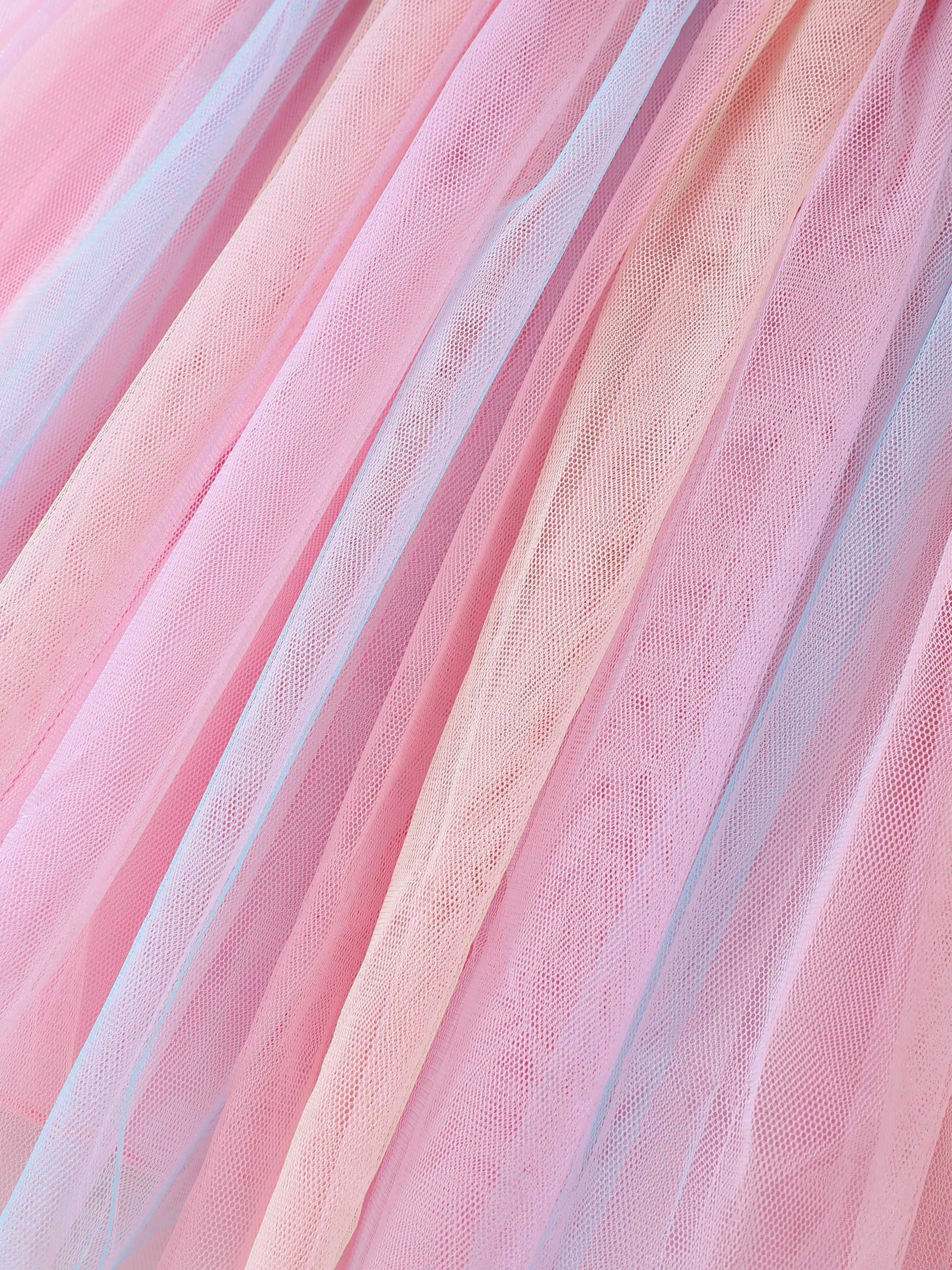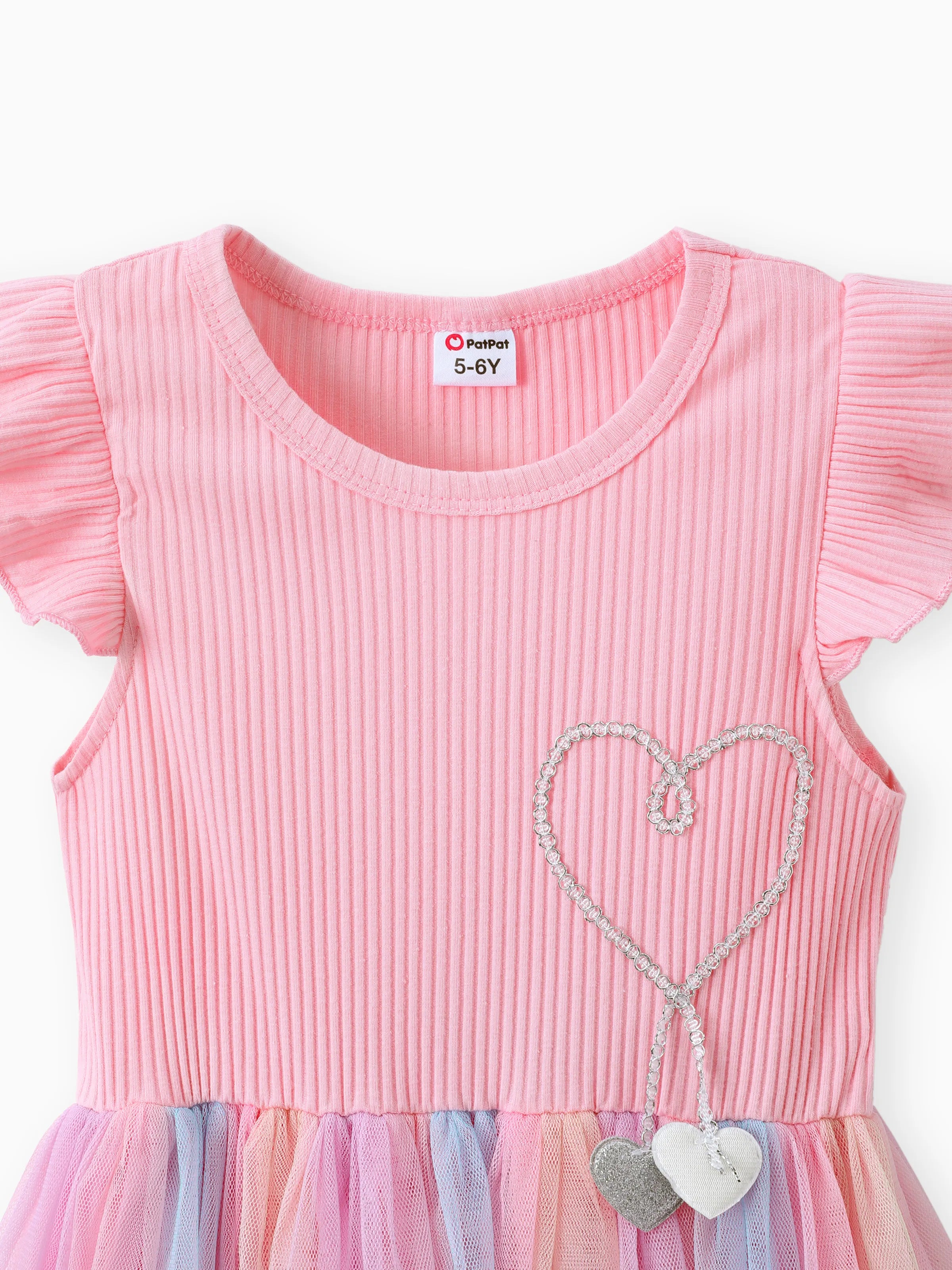 Jolie robe de soirée princesse avec maille arc-en-ciel, manches volantées et ornements en forme de cœur.