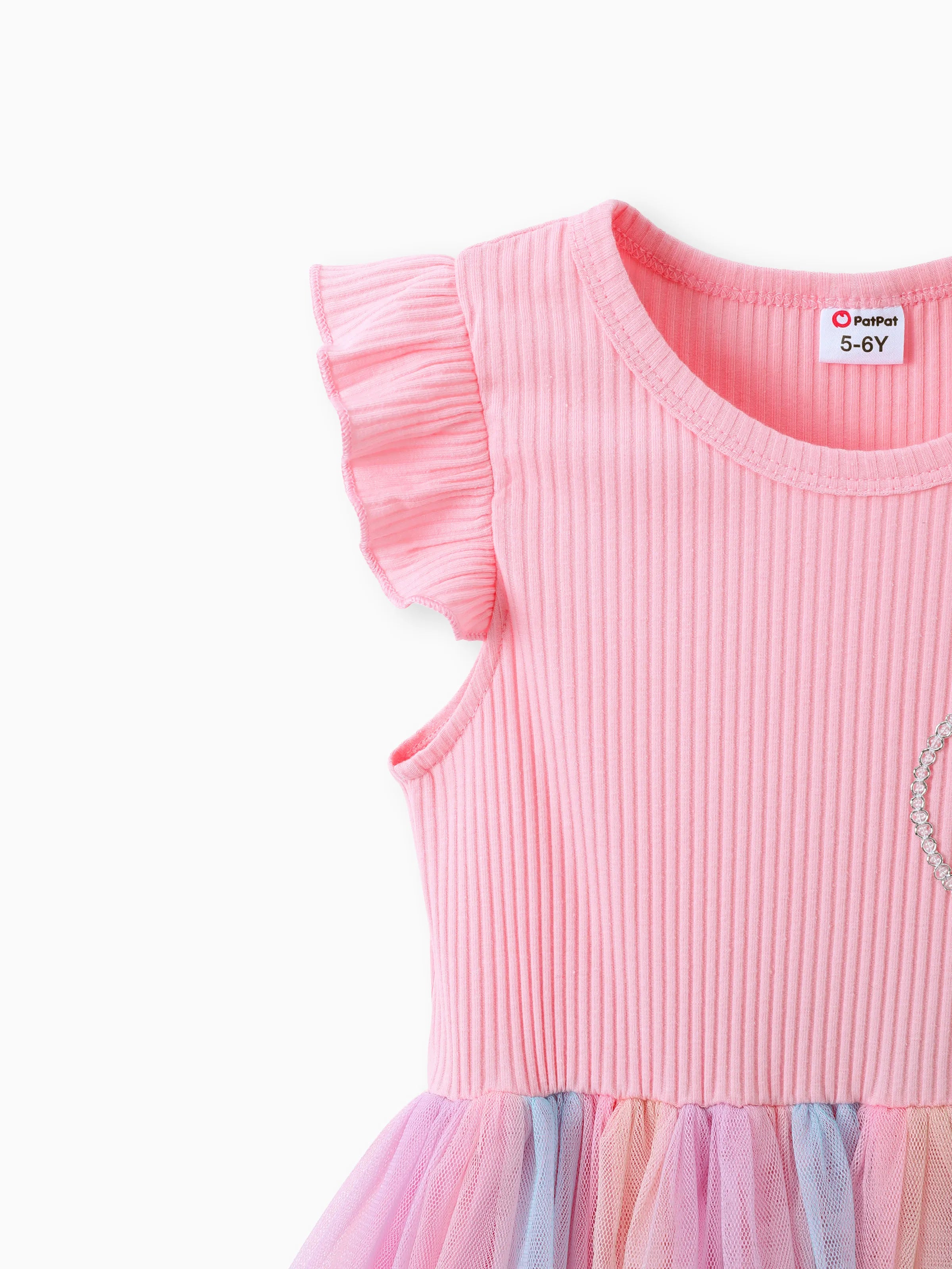 Robe de princesse à manches flottantes et motif cœur arc-en-ciel en maille rose pour fille