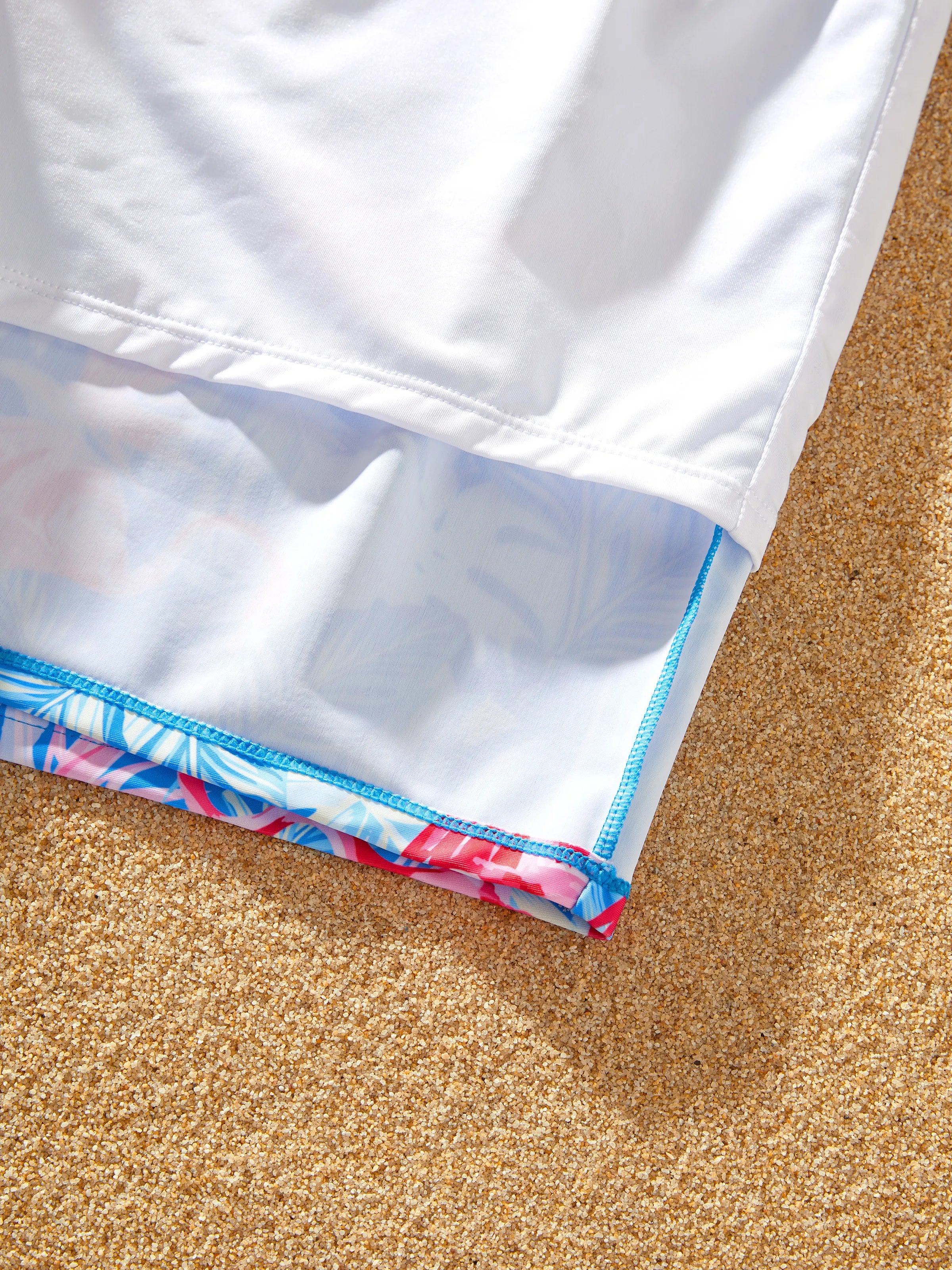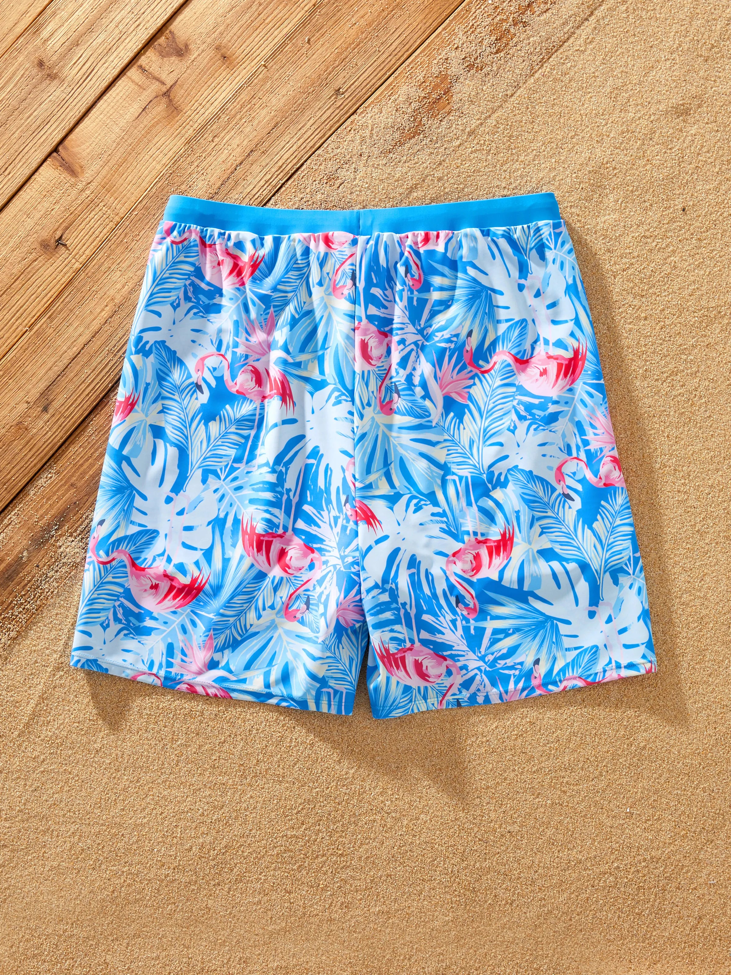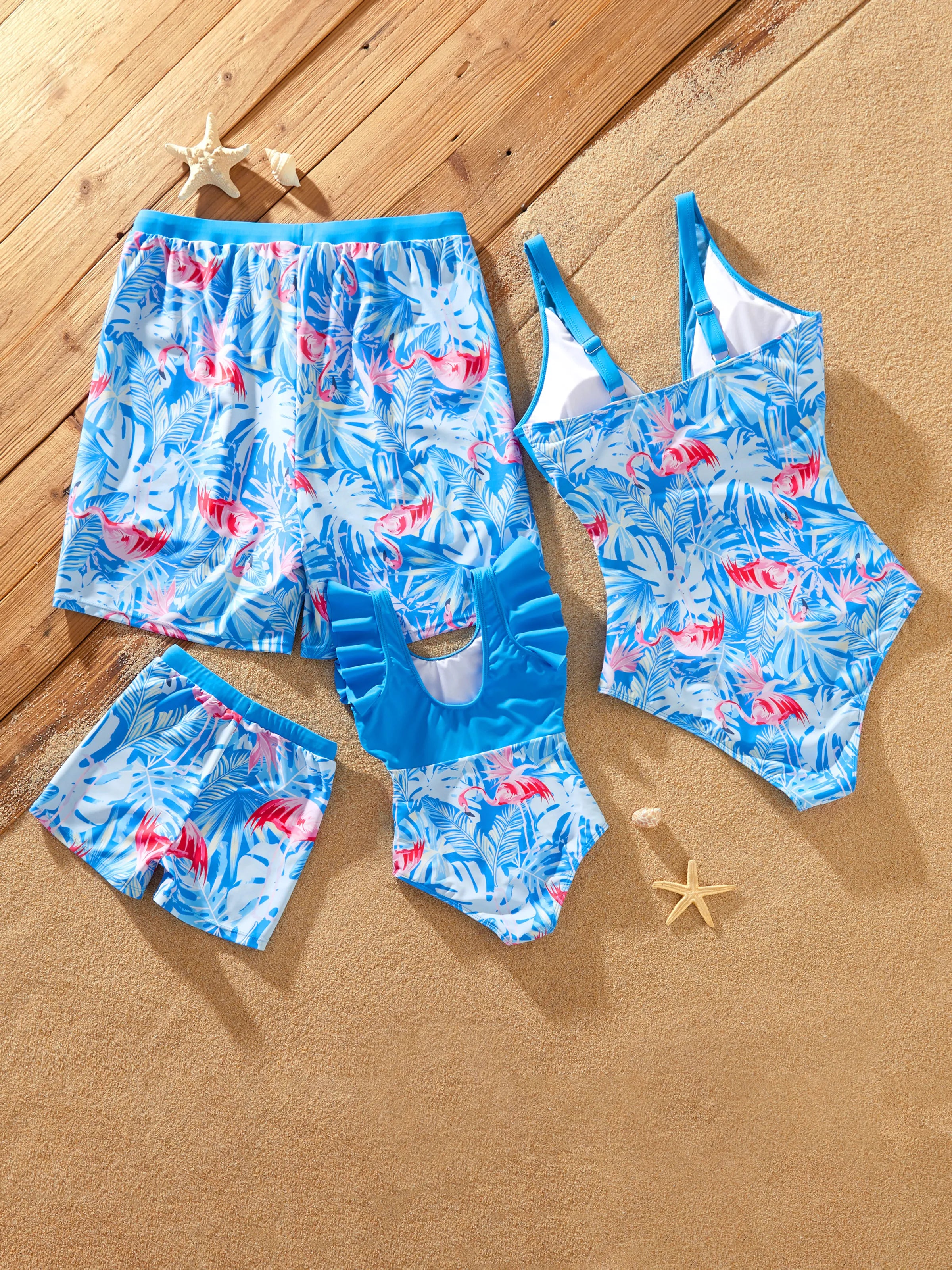 Ensemble de maillot de bain familial parfait avec des motifs vibrants de flamants roses et de feuilles tropicales, élégamment conçu avec des détails en maille transparente pour plus de sensualité et de style.