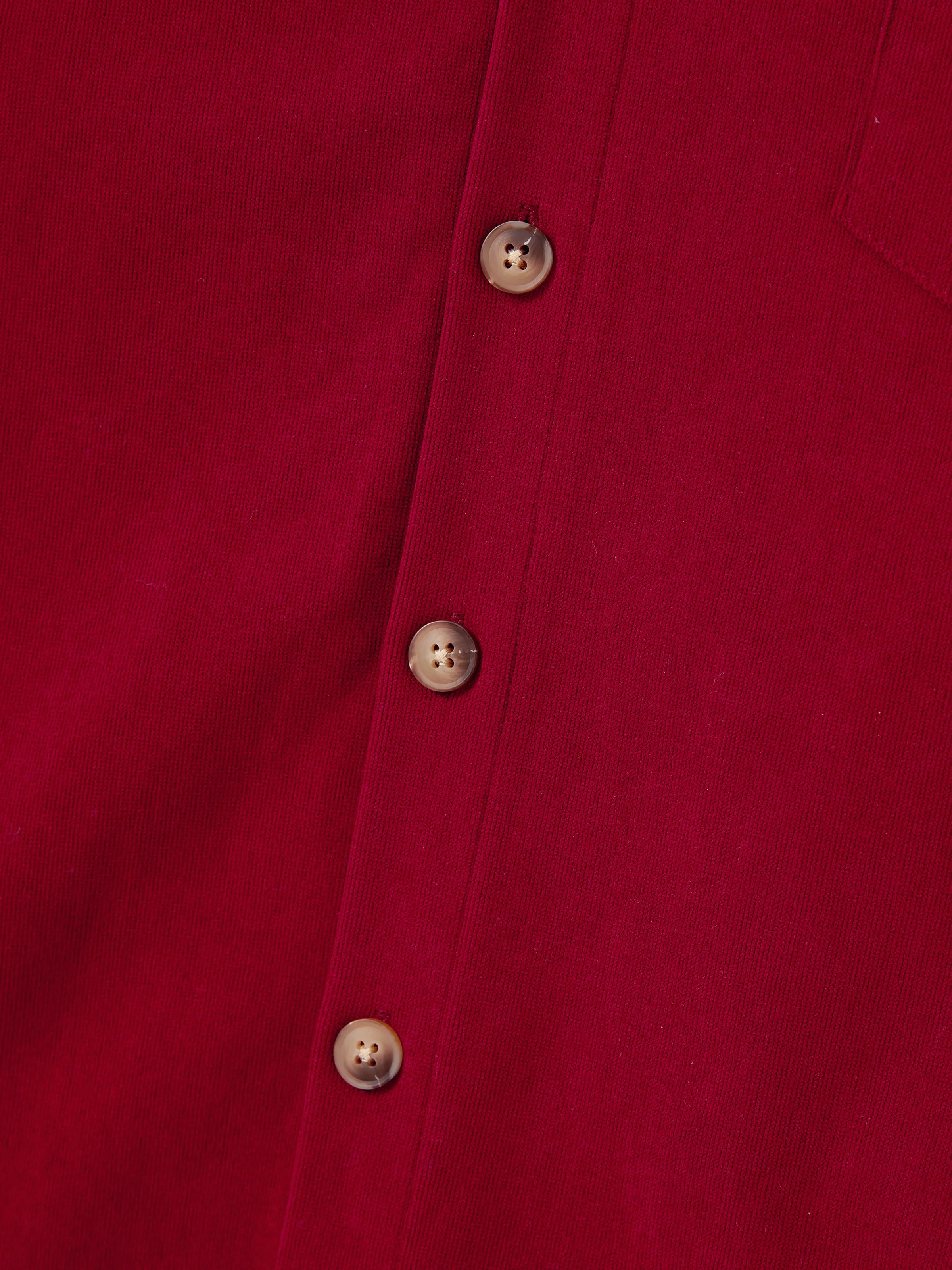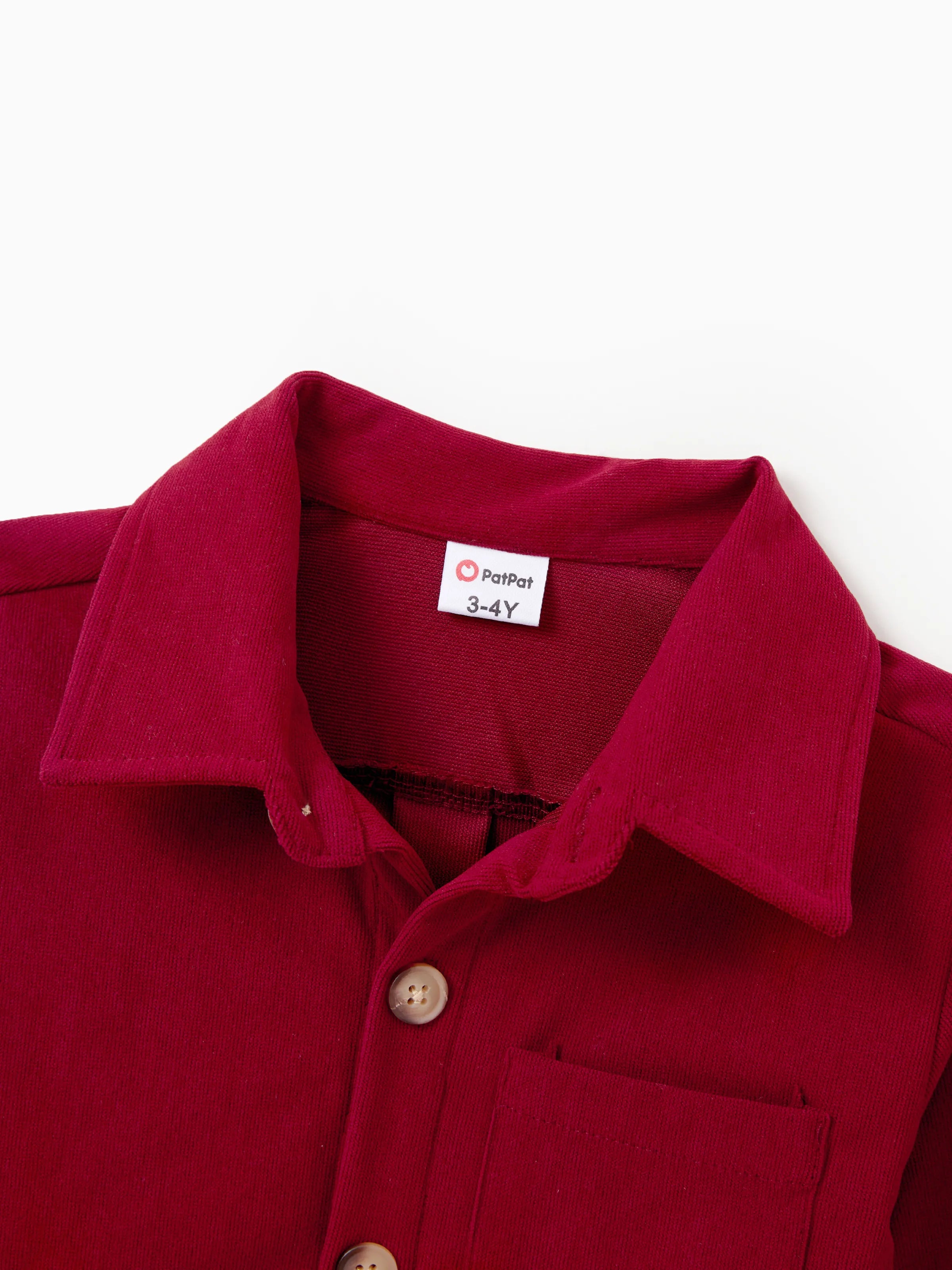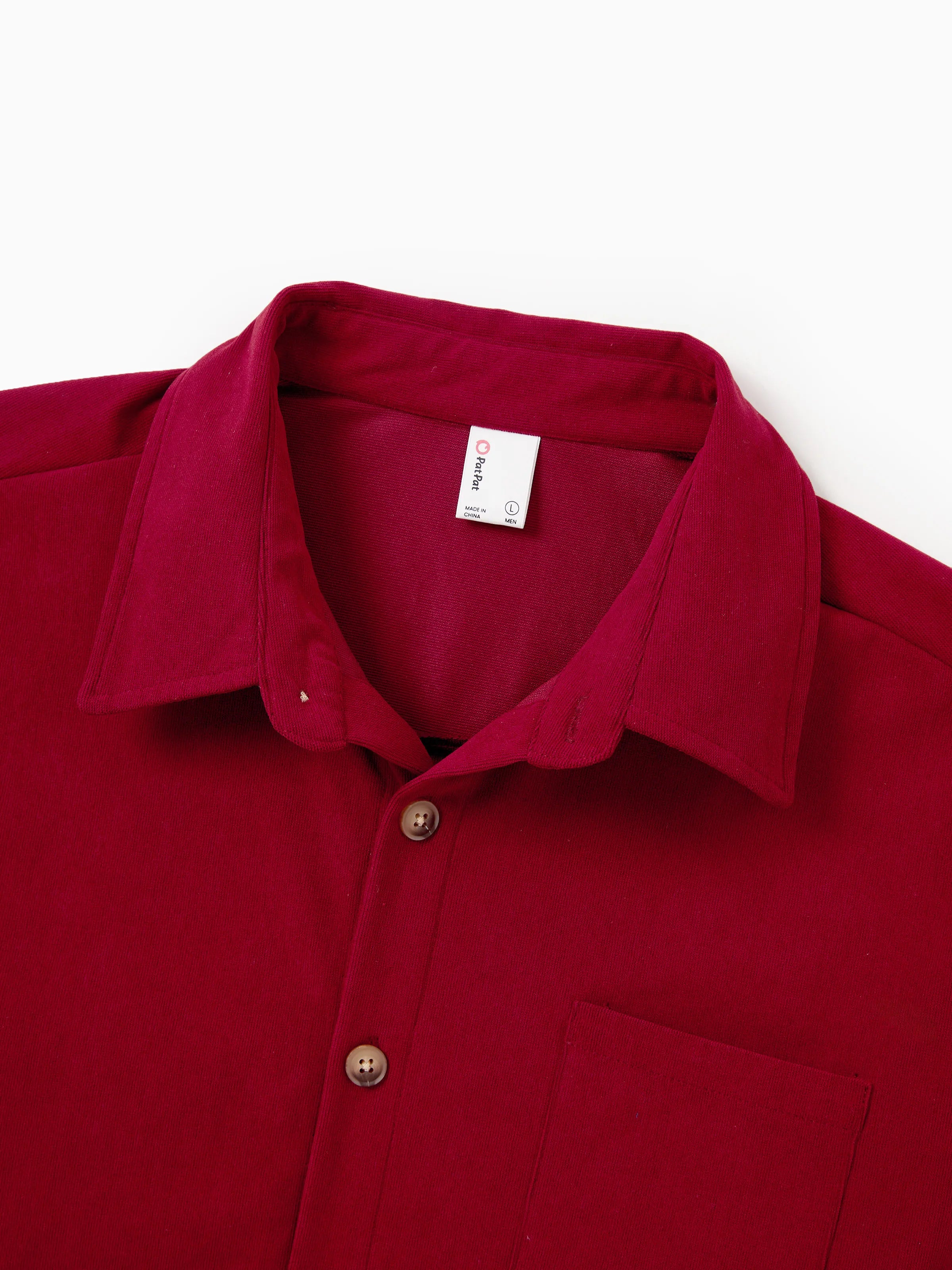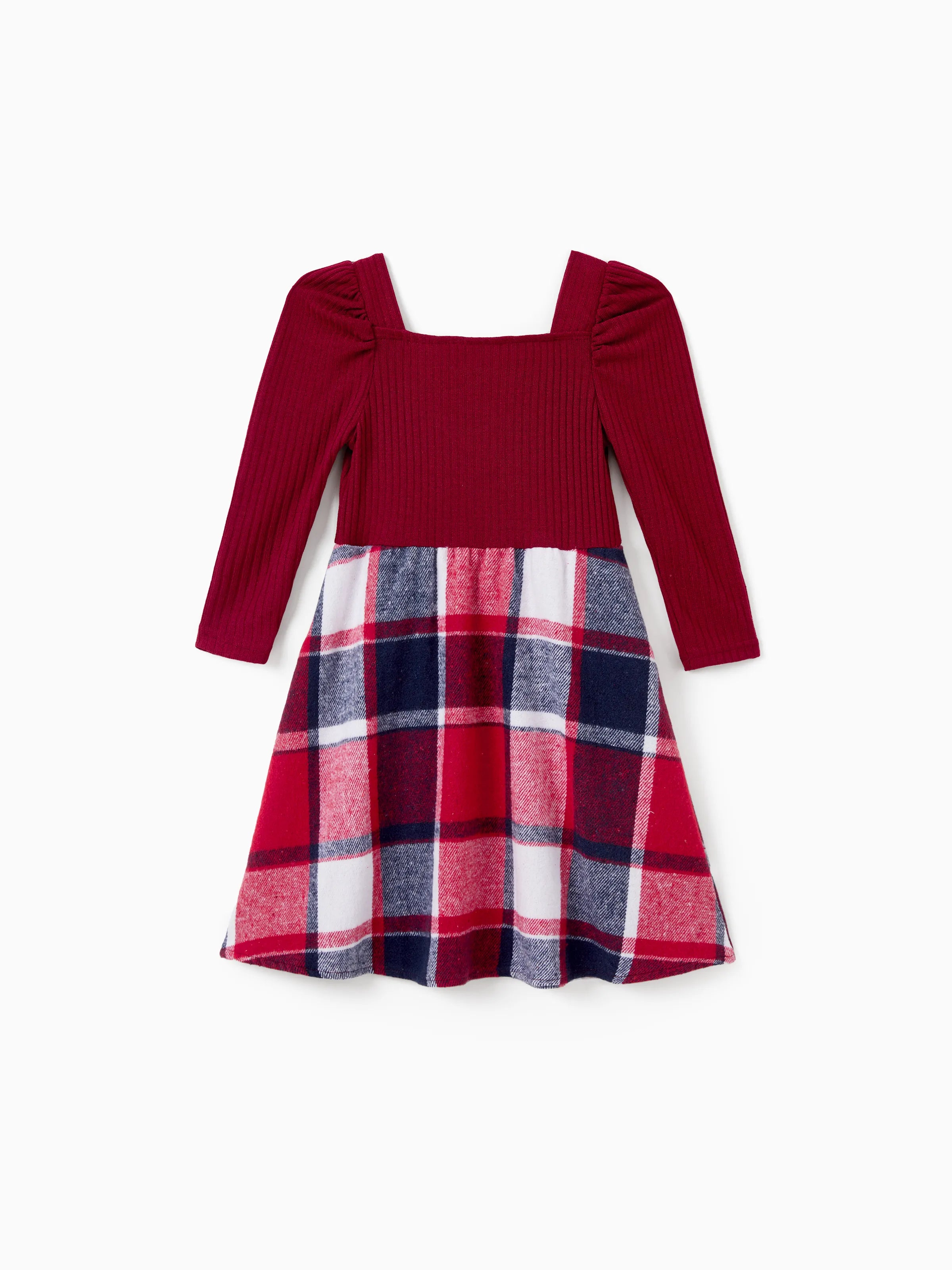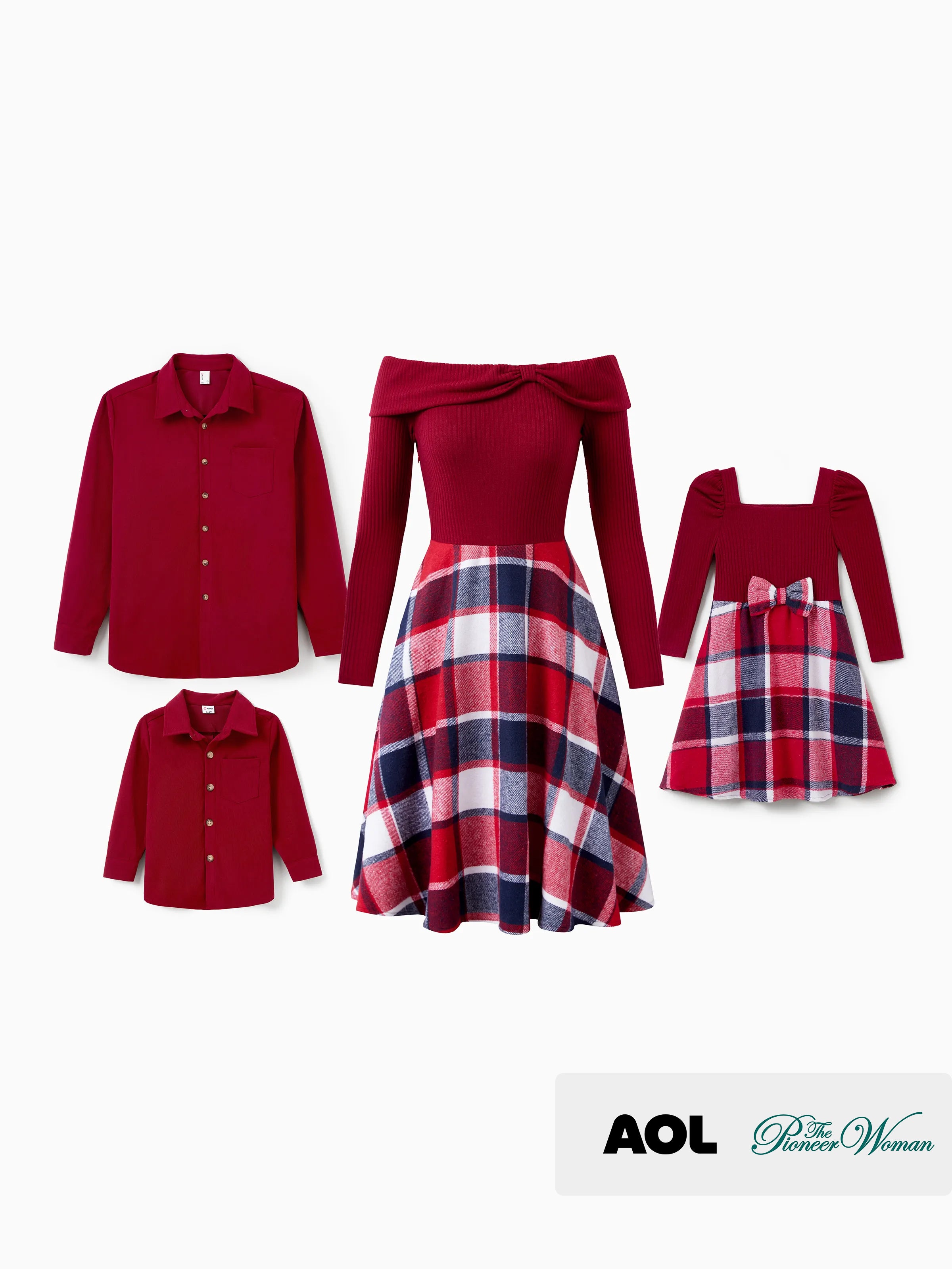 Maman et sa fille portent des robes à haut côtelé et jupe à carreaux ; papa et son fils portent des chemises rouges. Idéal pour les photos de famille.