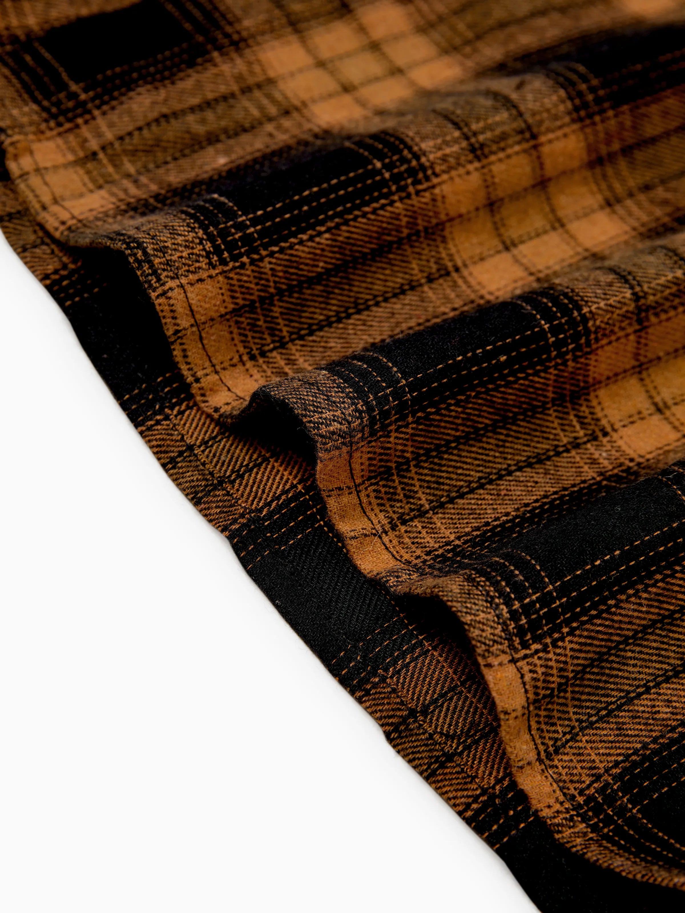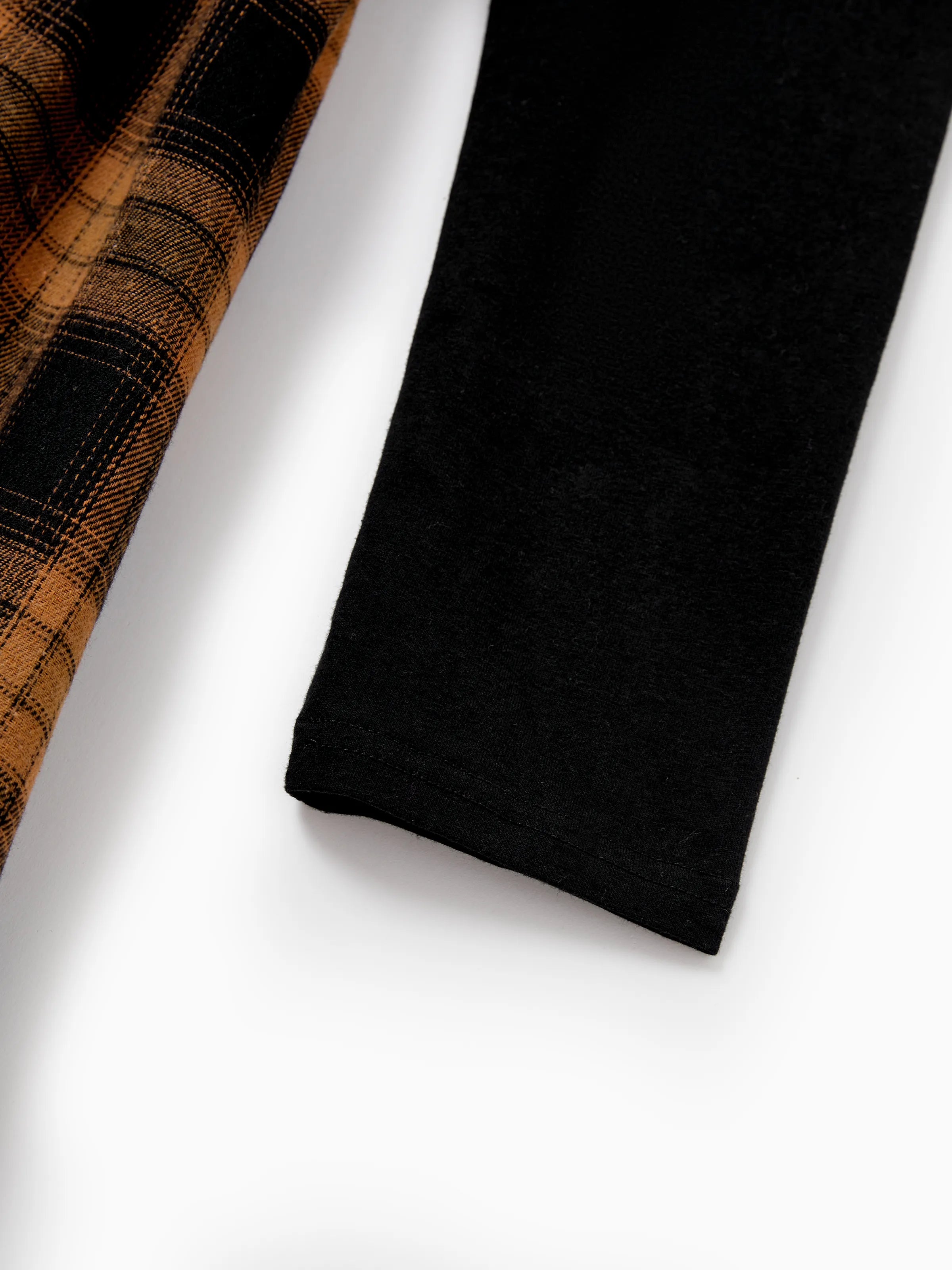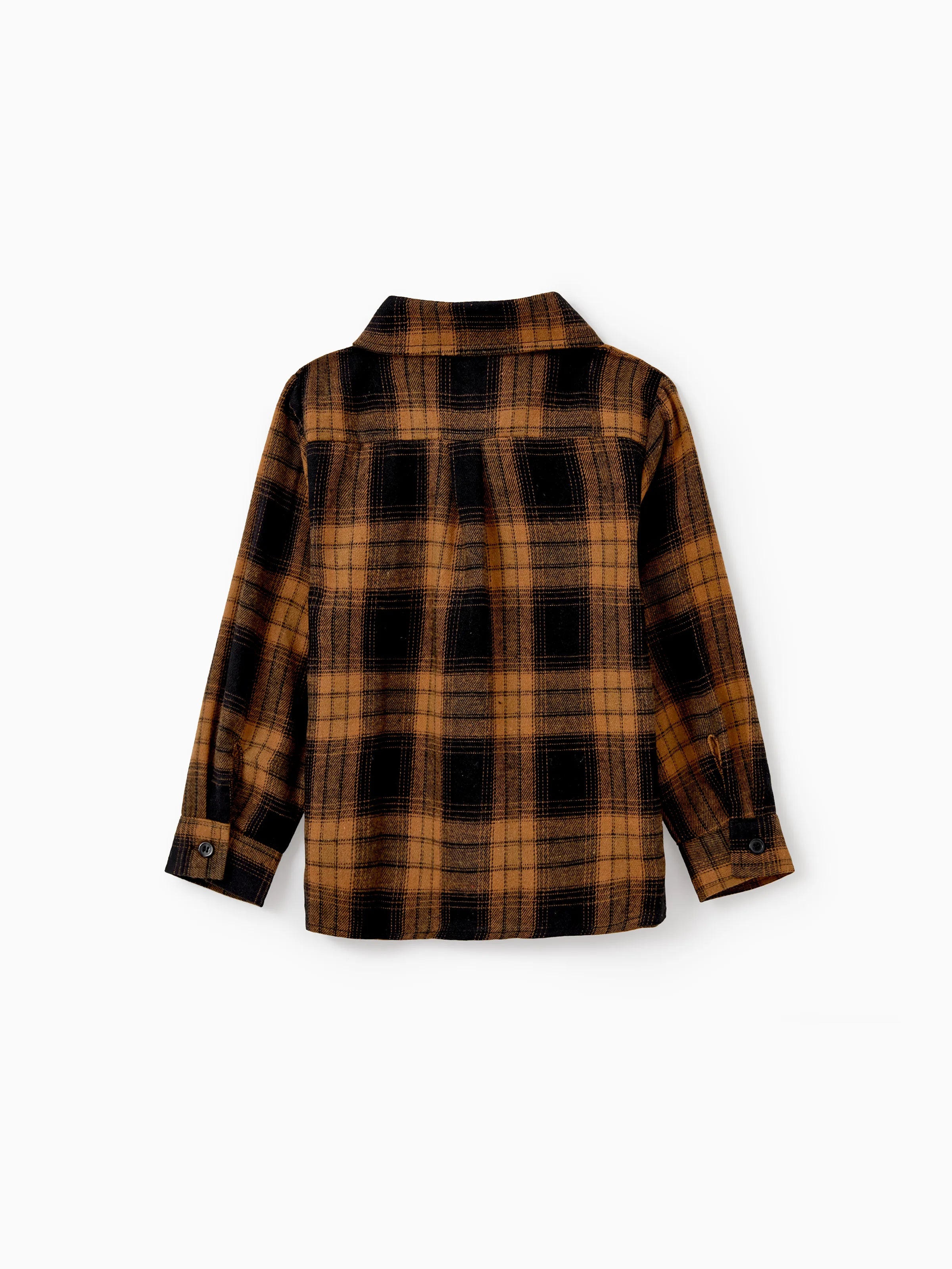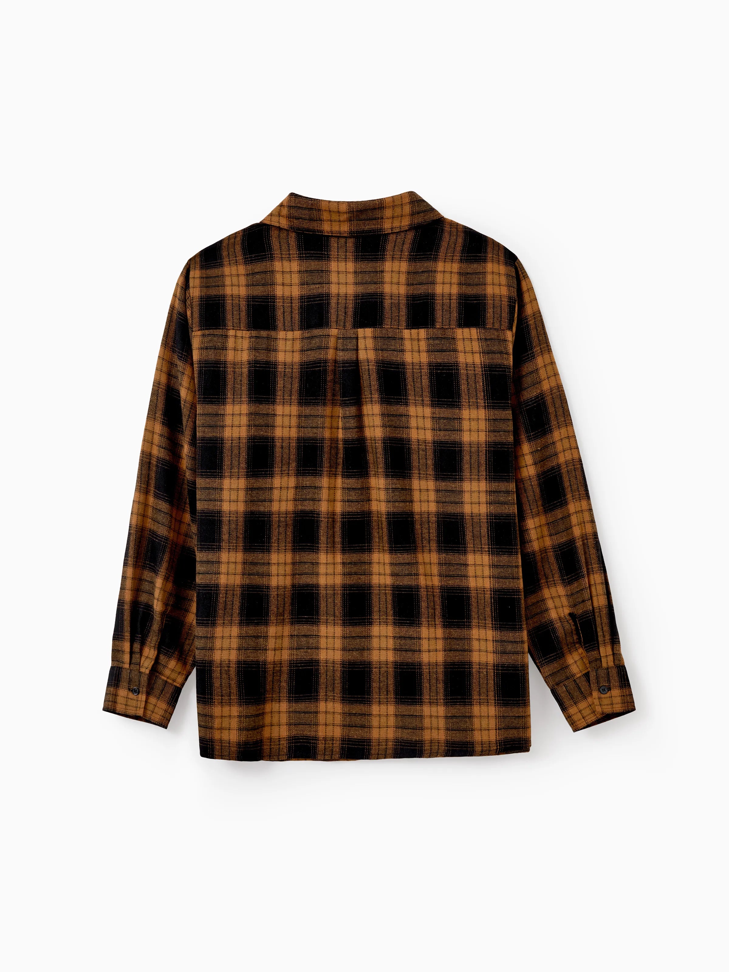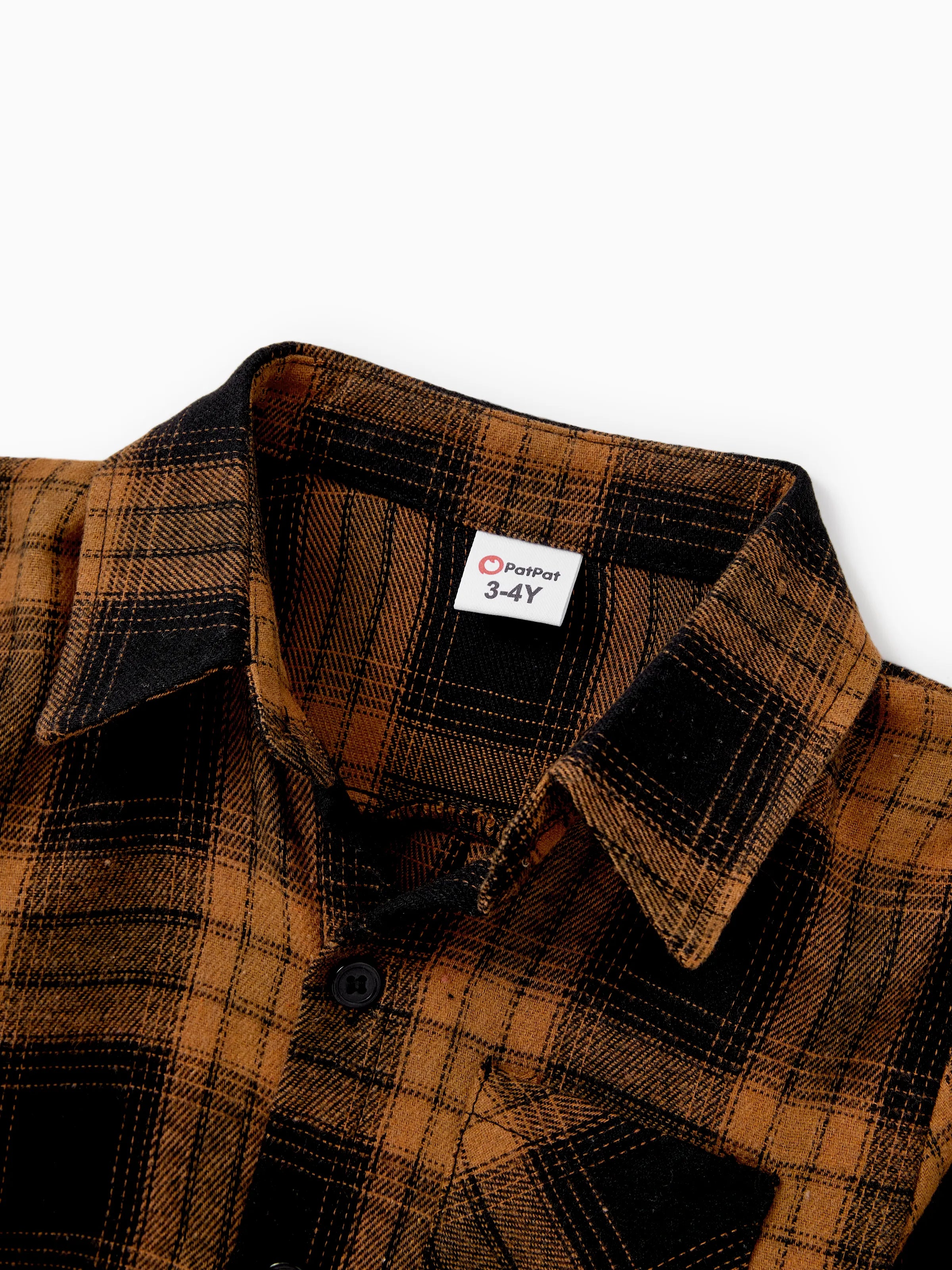 Ensemble de tenues familiales assorties : chemises à carreaux papa/fils ou robes à manches longues maman/fille marron