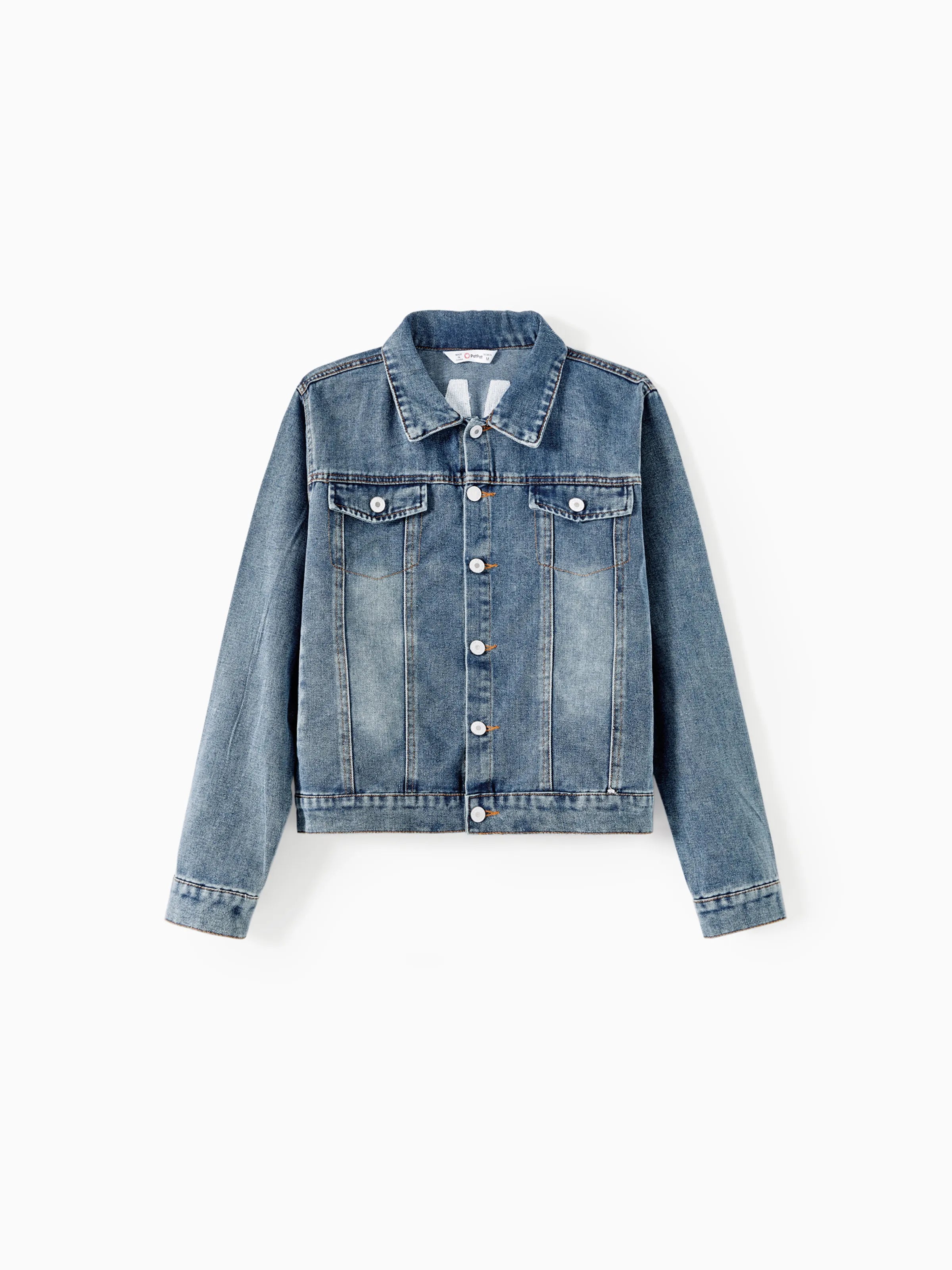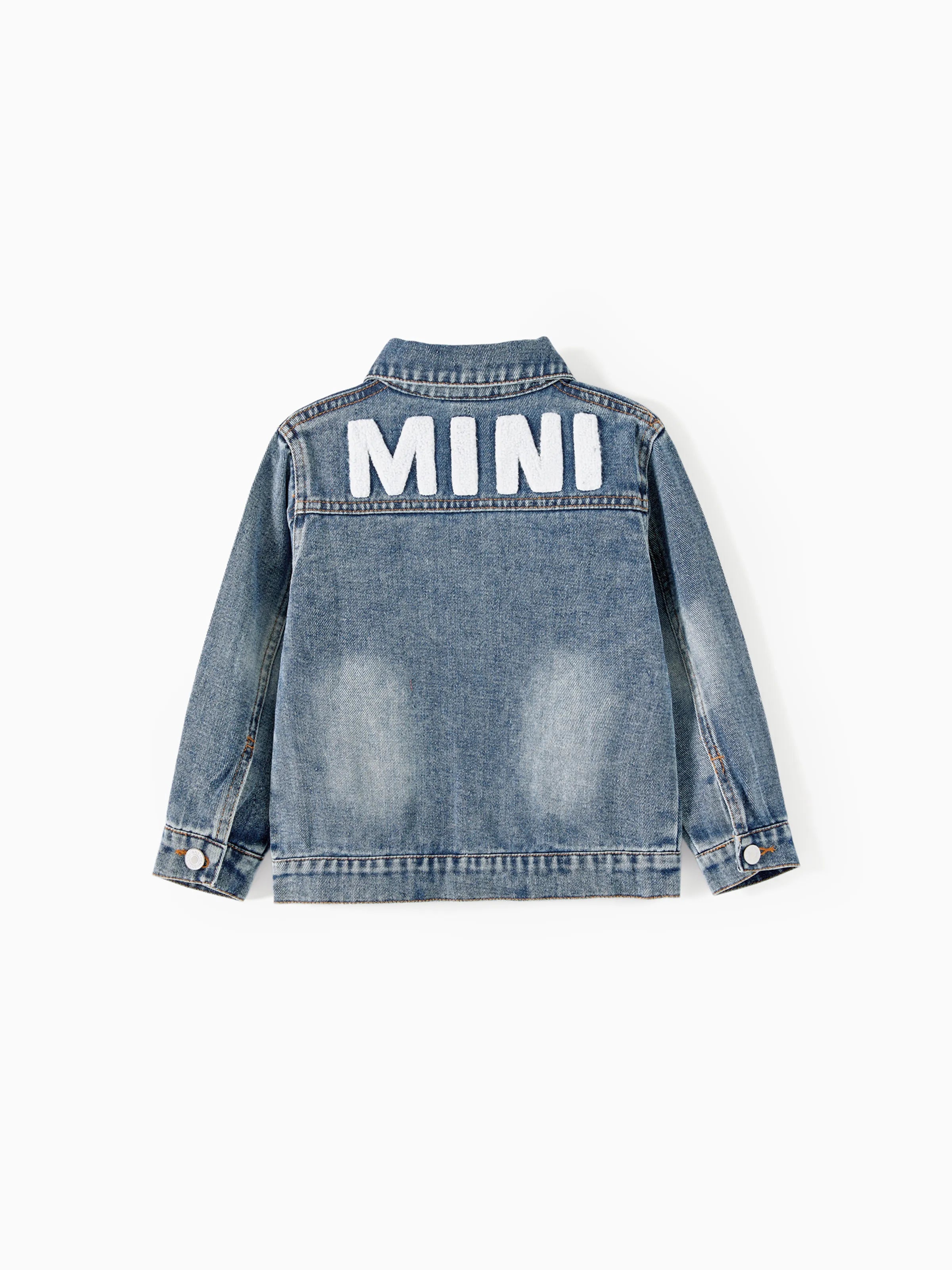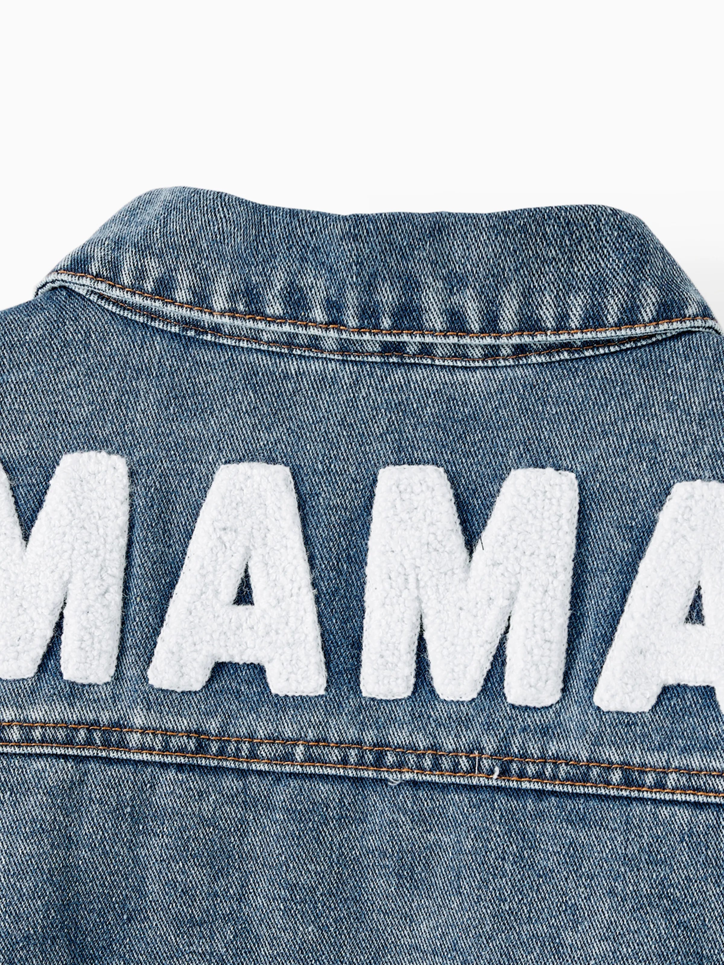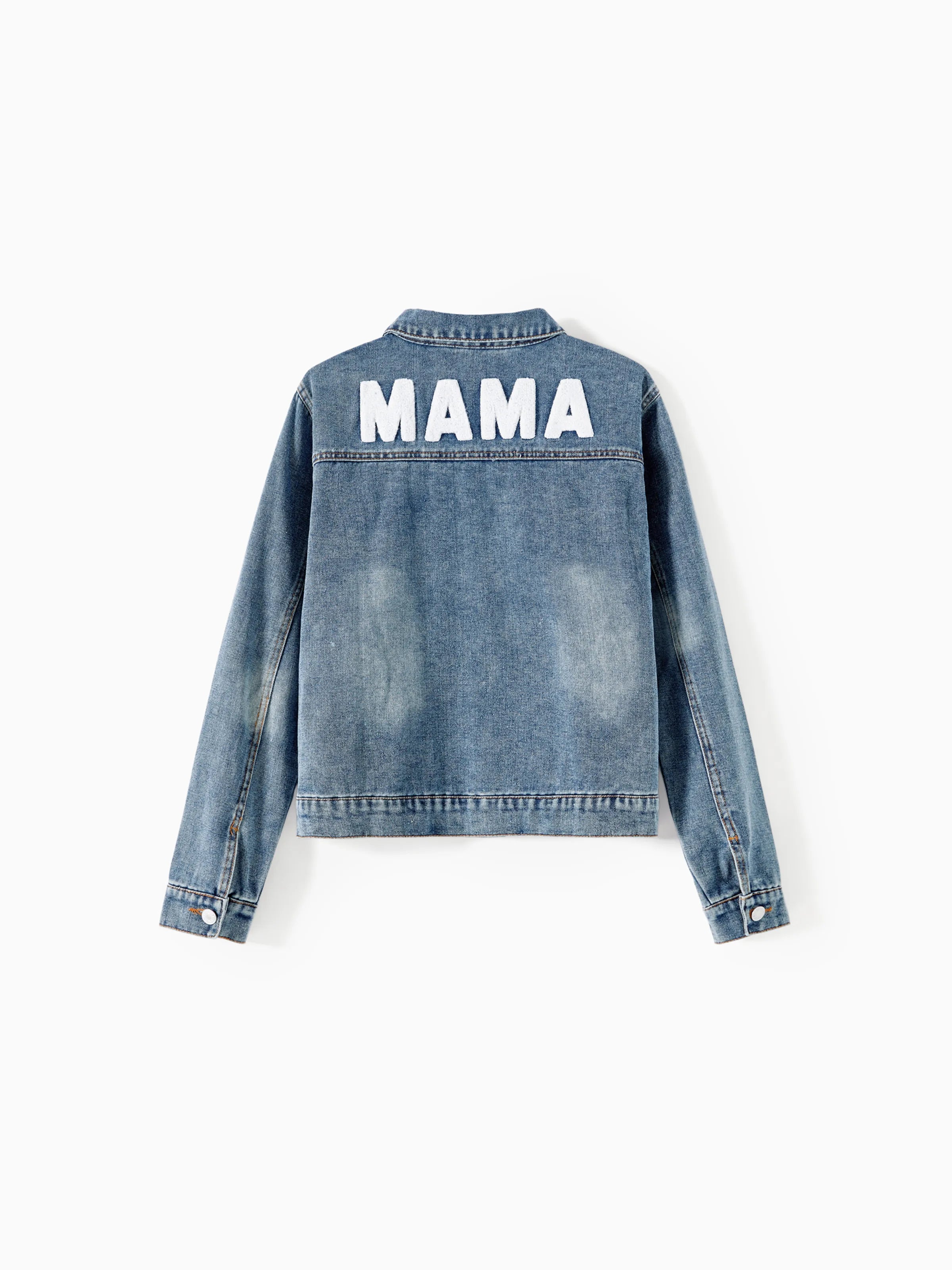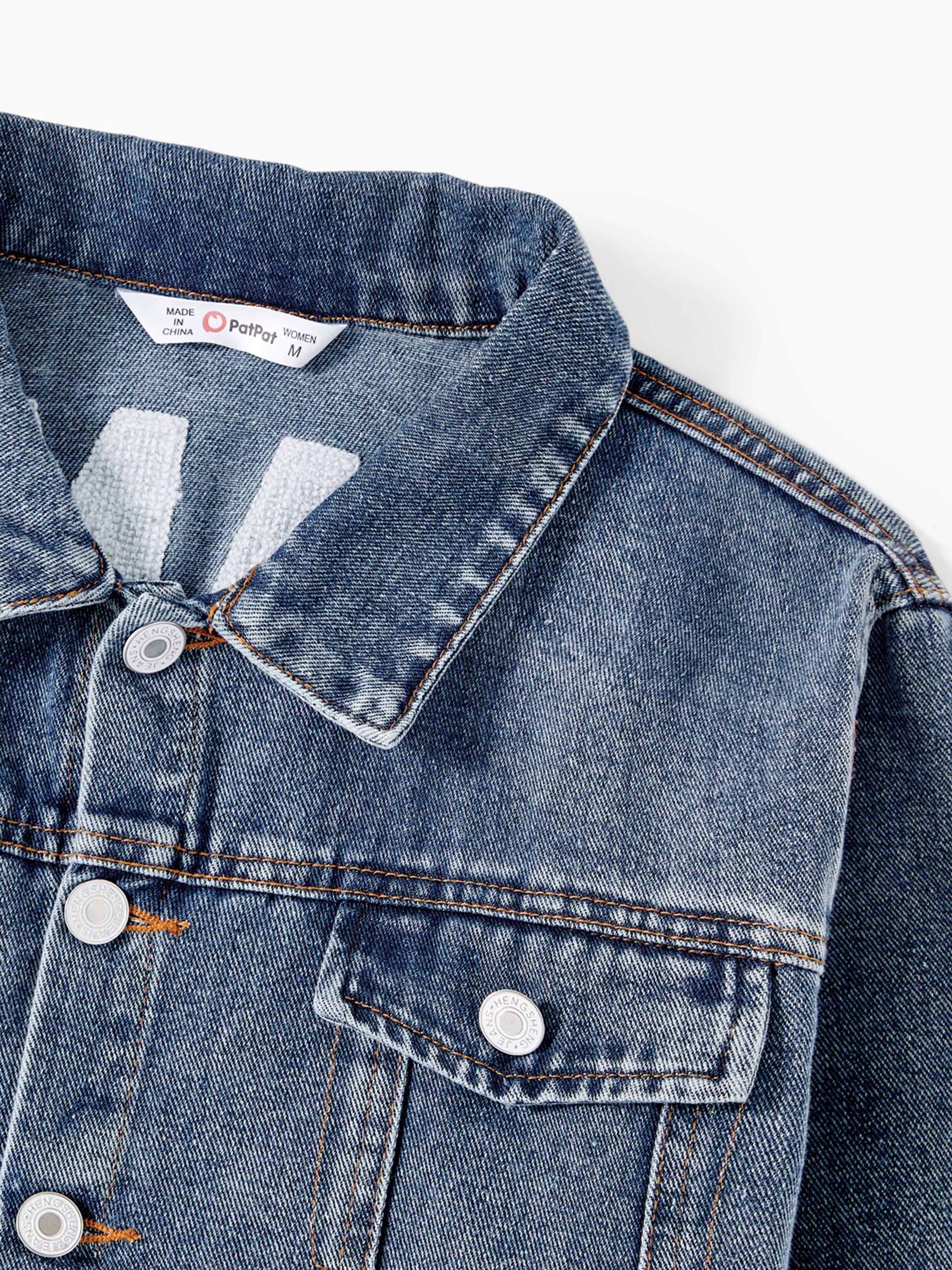 Veste en jean tendance et vieillie, douce et confortable au toucher, avec un col à revers, une fermeture à boutons sur le devant et un imprimé de lettres audacieuses au dos.