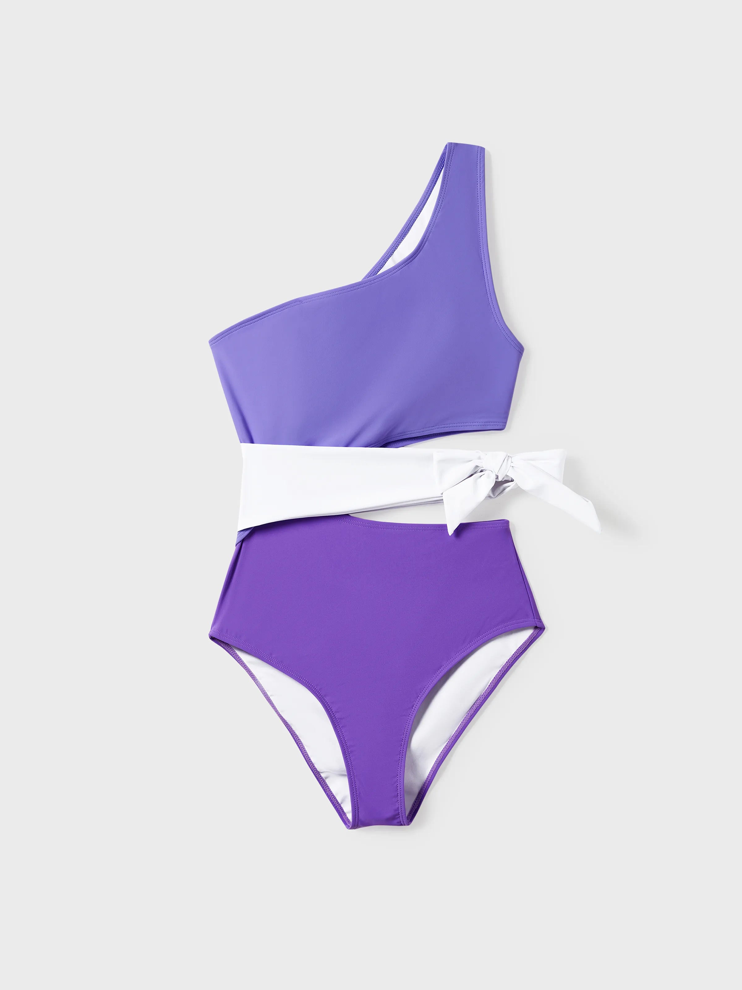 Embrace your casual vacation side with this purple and light lavender family swimsuit set, featuring a bow tie at the waist, one-shoulder design for mom, tank strap design for girl. Perfect for tropical vacations.