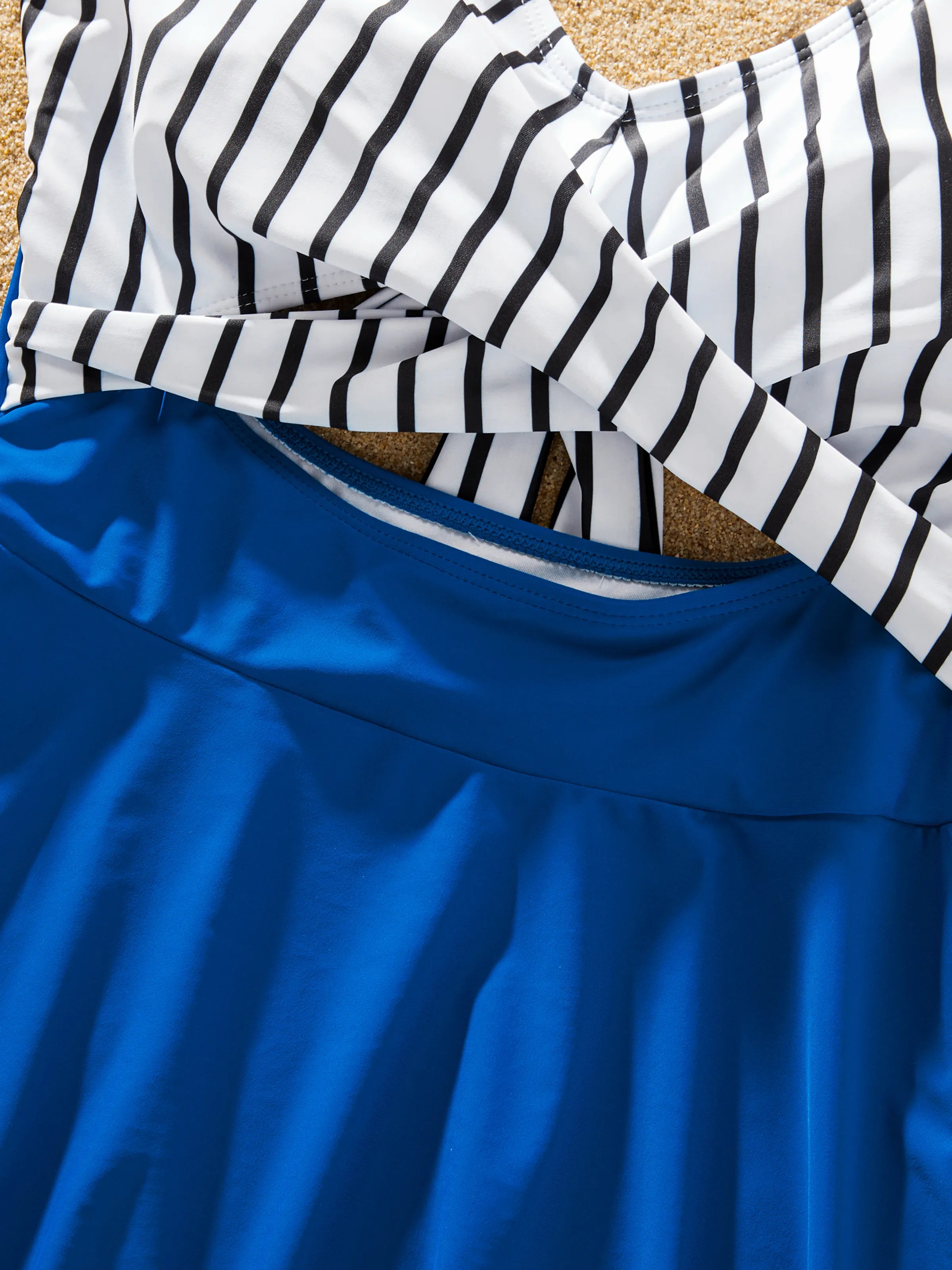 • Style: Matching family swimsuit set with a striped and solid color block design.