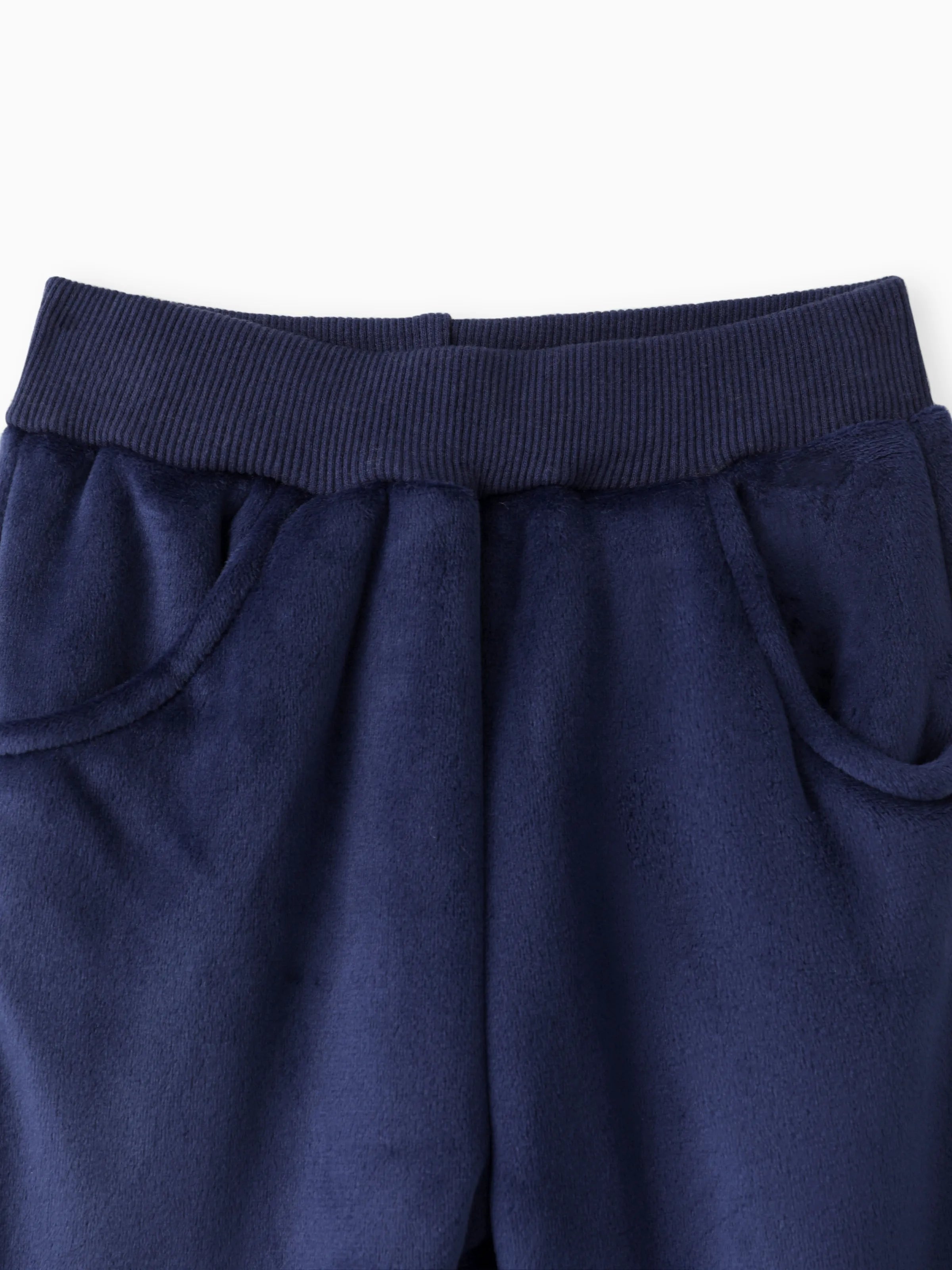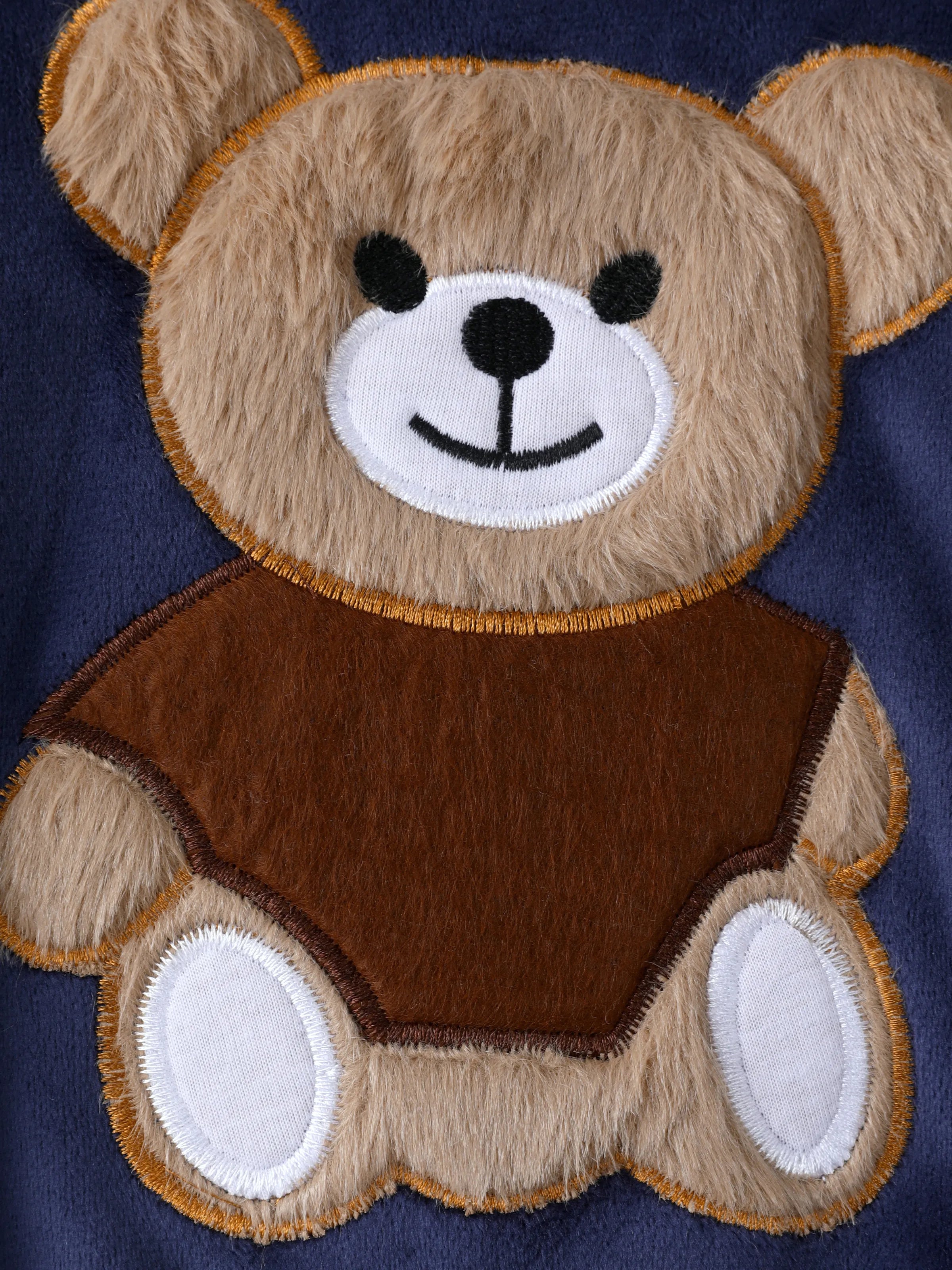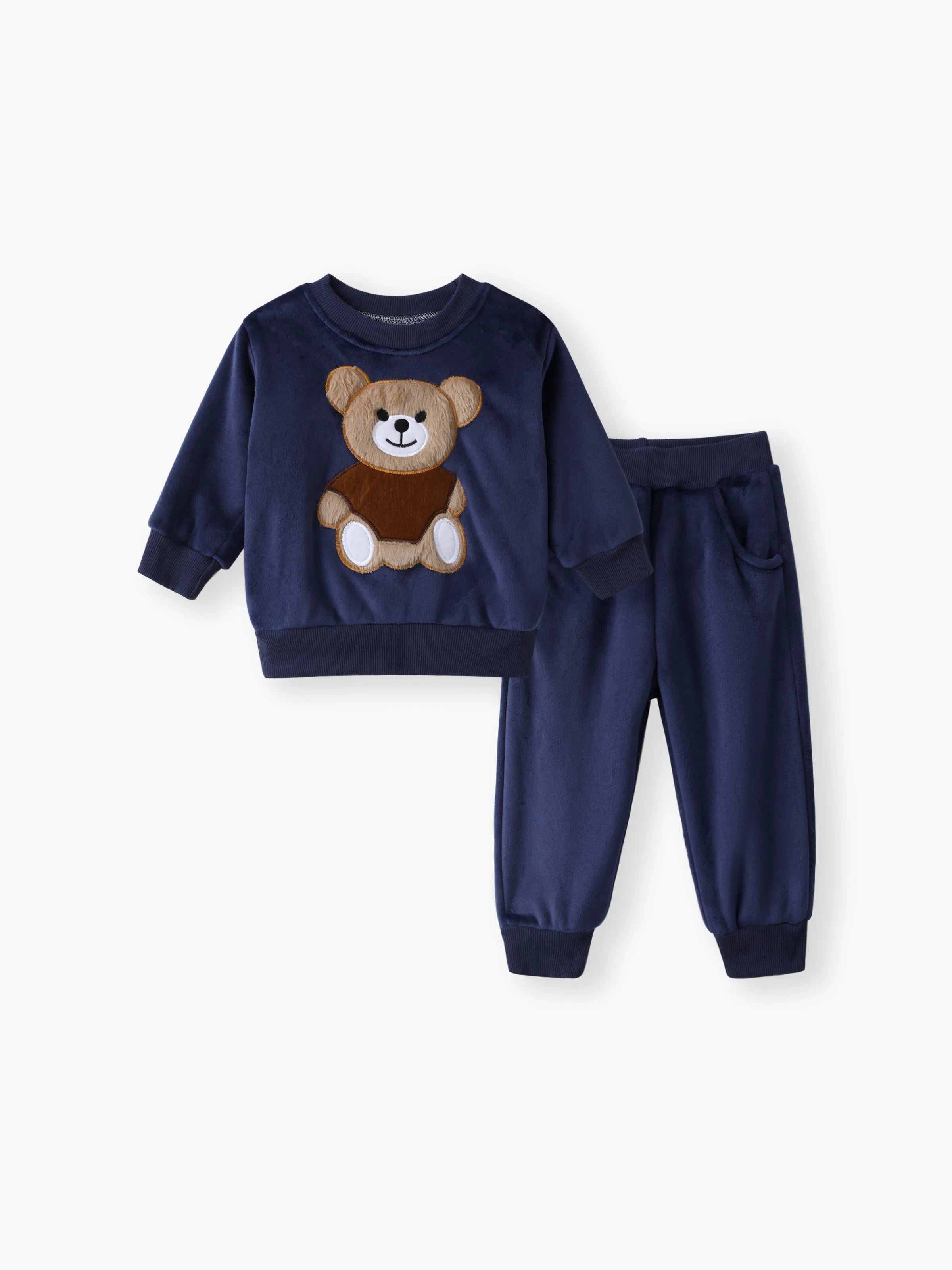 2pcs Baby Boy 95% Cotton Long-sleeve Cartoon Bear Pattern Thickened Fleece Lined Pullover and Trousers Set Dark Blue