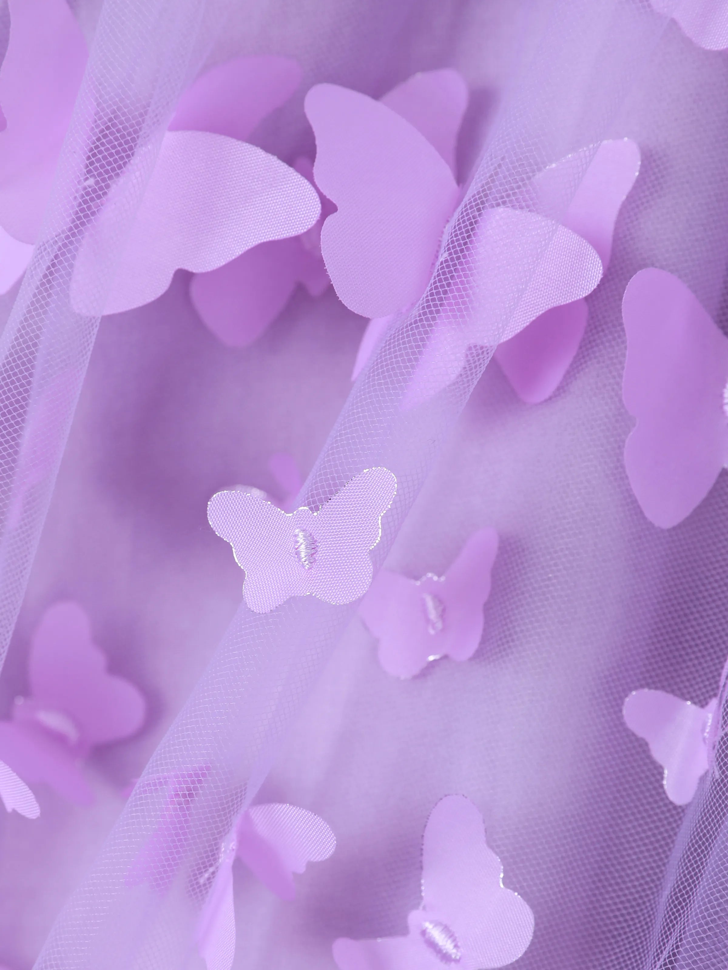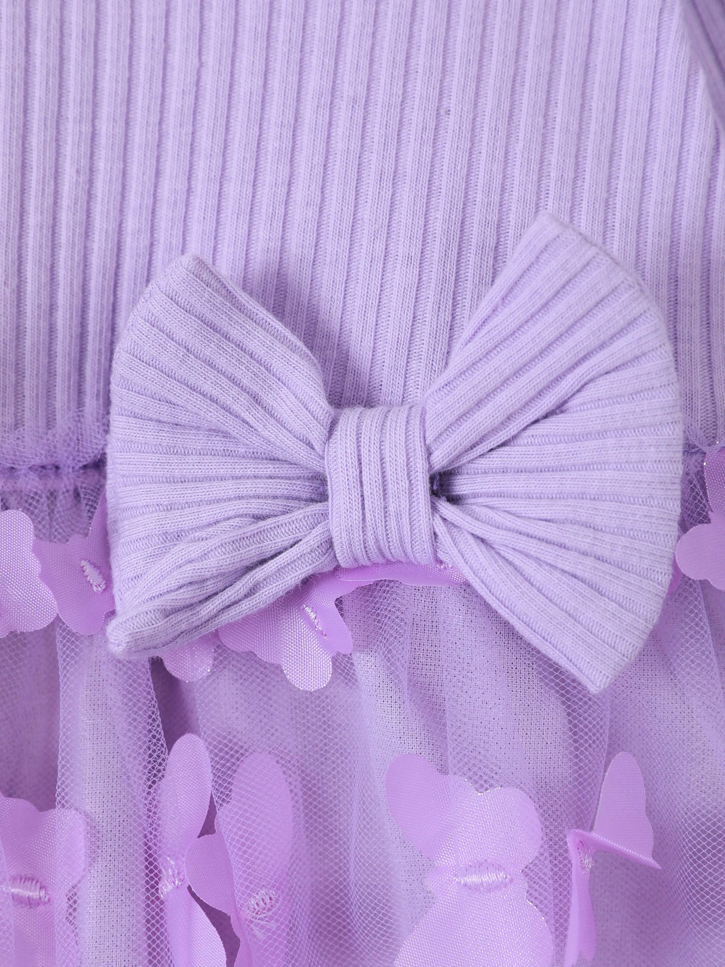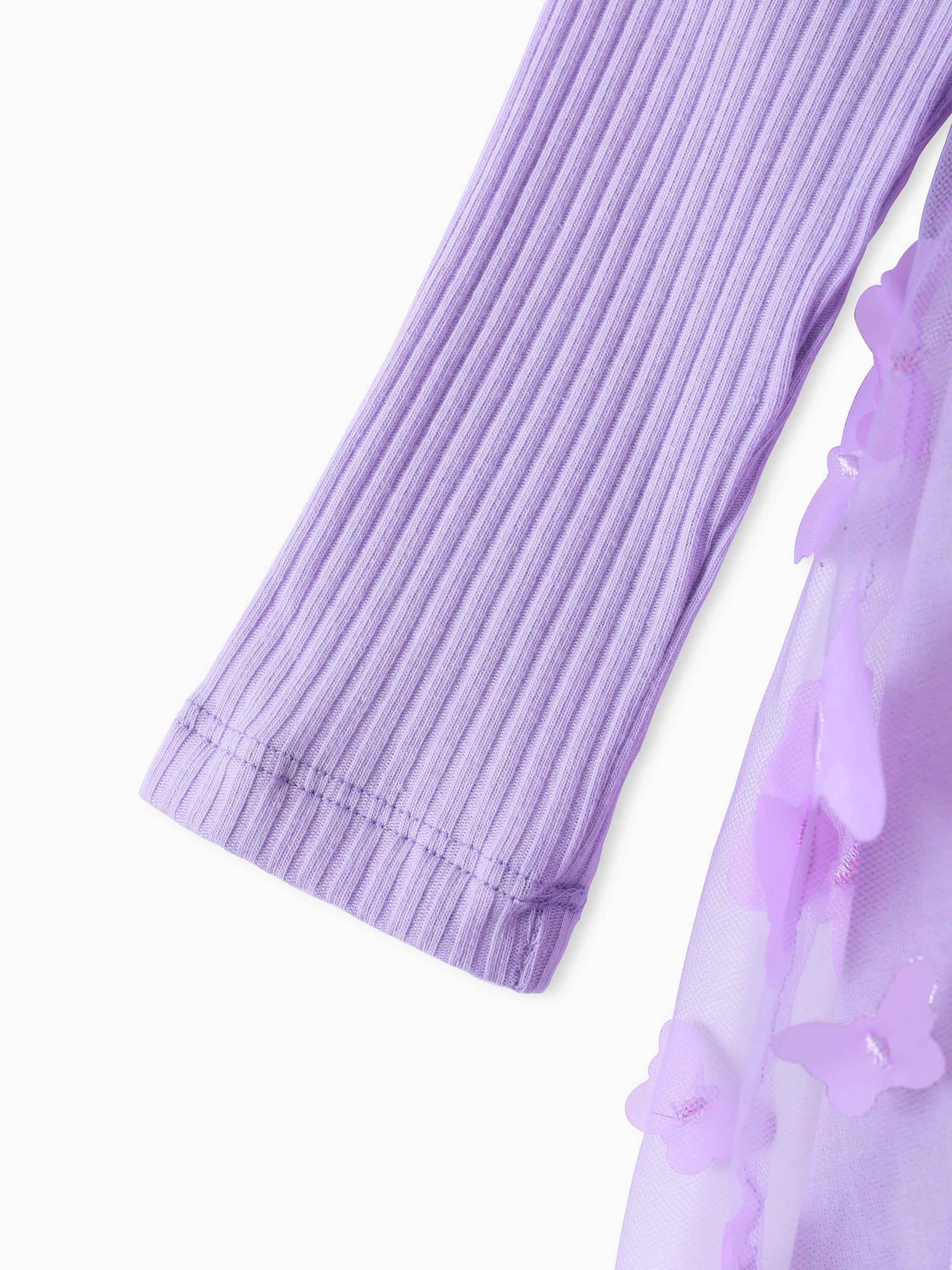 2pcs Baby Girl 95% Cotton Ribbed Long-sleeve Splicing 3D Butterfly Appliques Mesh Fairy Dress with Headband Set Purple
