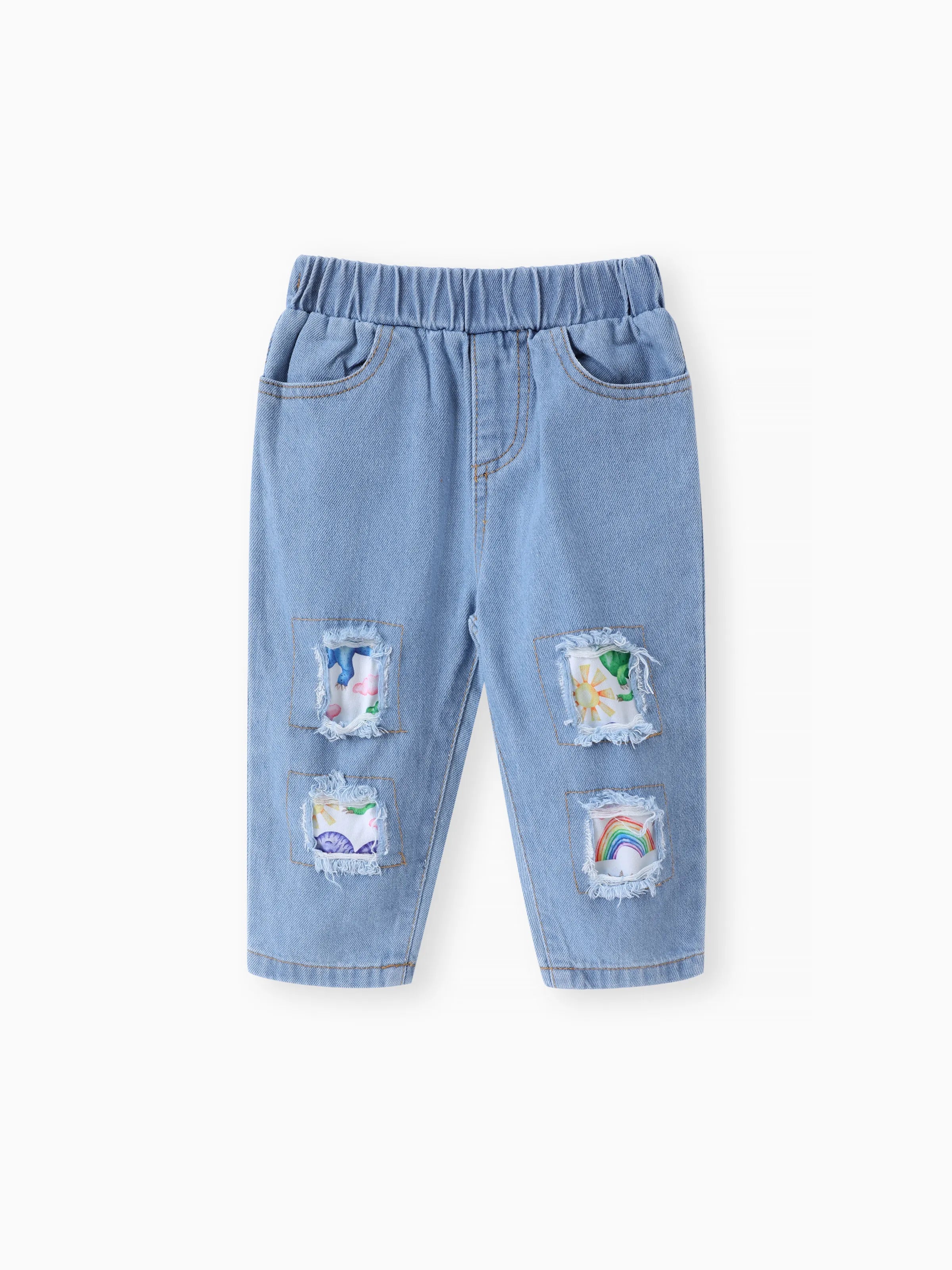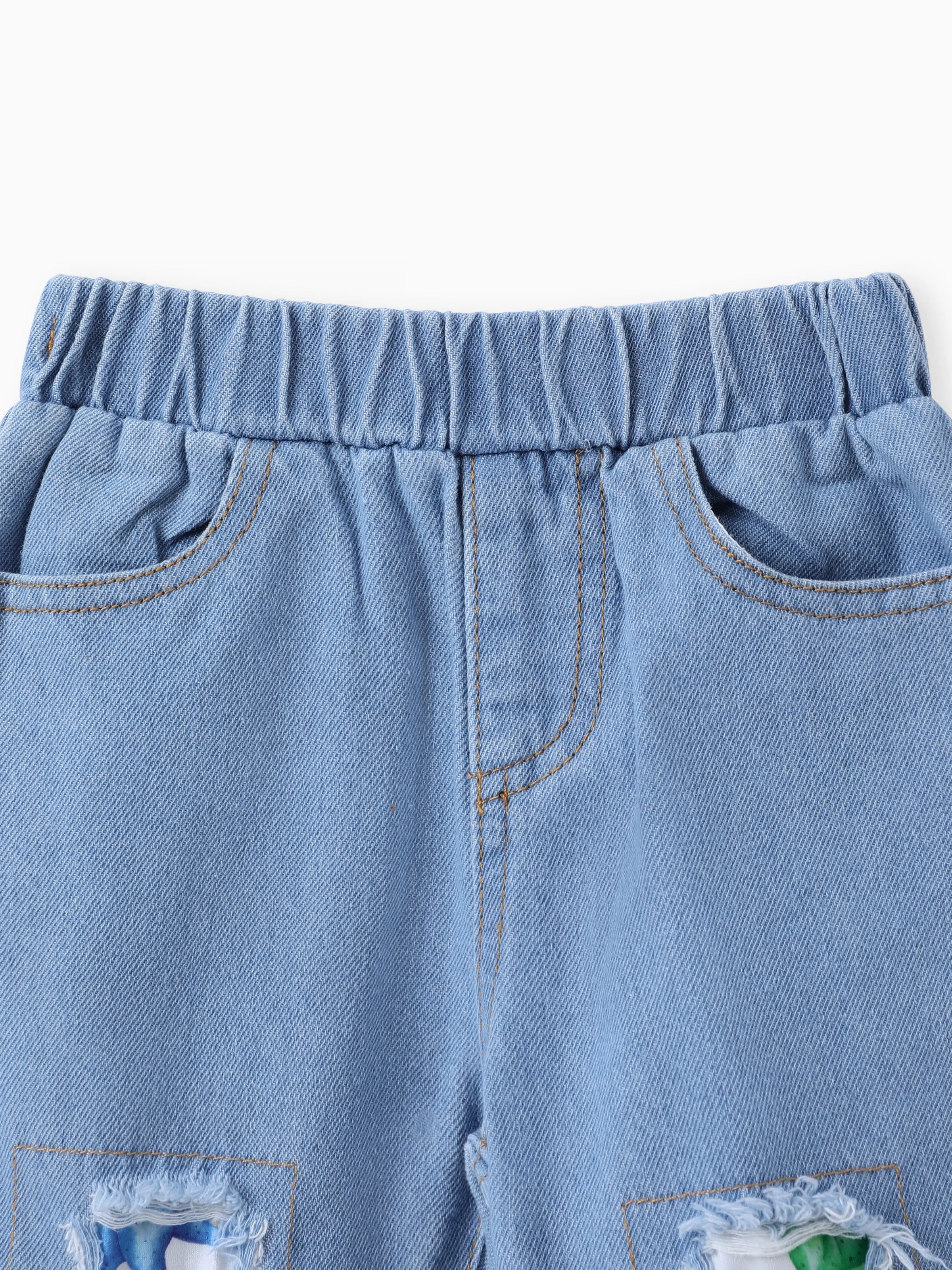 2pcs Baby Girl 95% Cotton Ripped Denim Jeans and Allover Dinosaur Print Ruffle Short-sleeve Top Set Multi-color