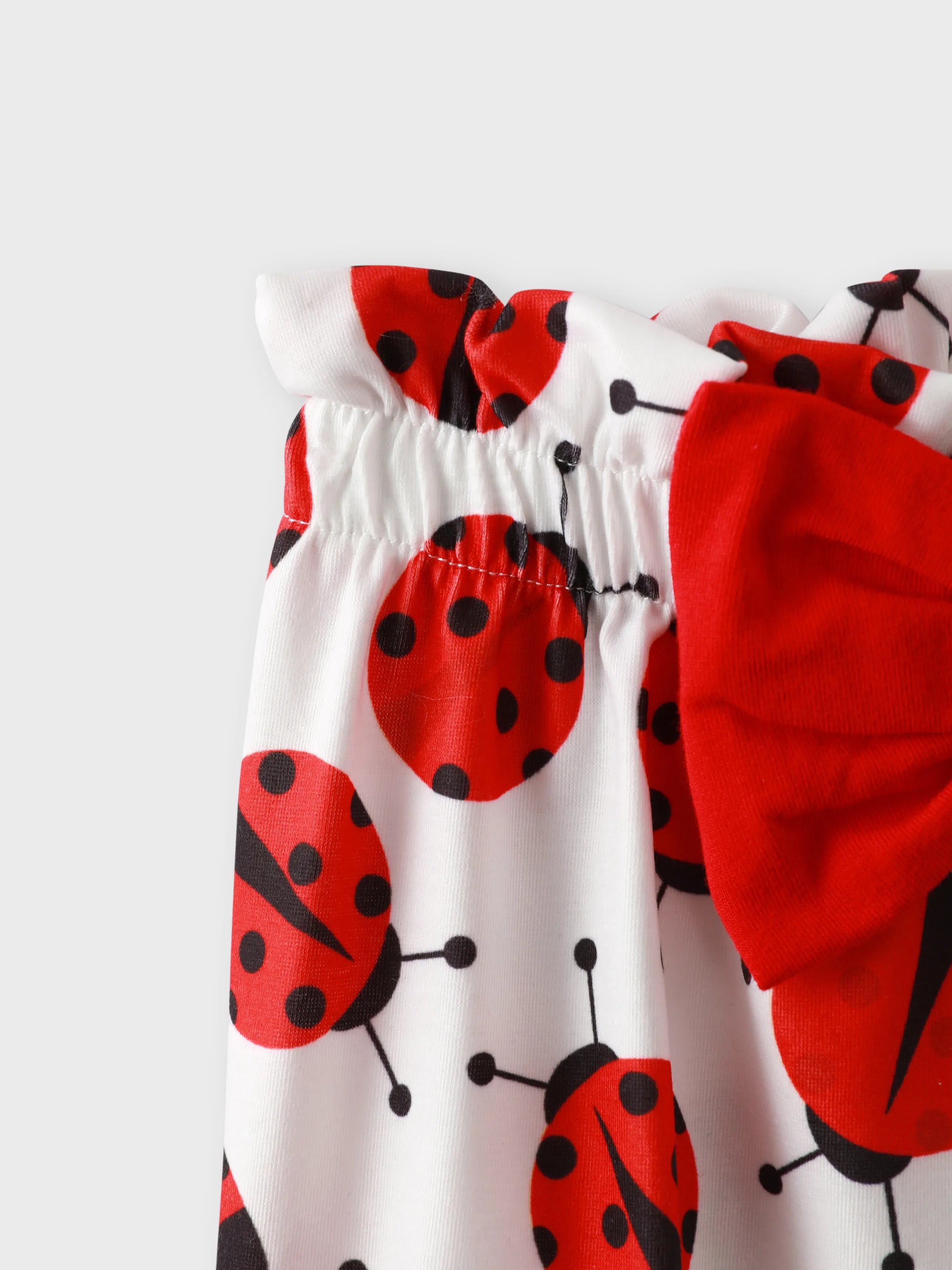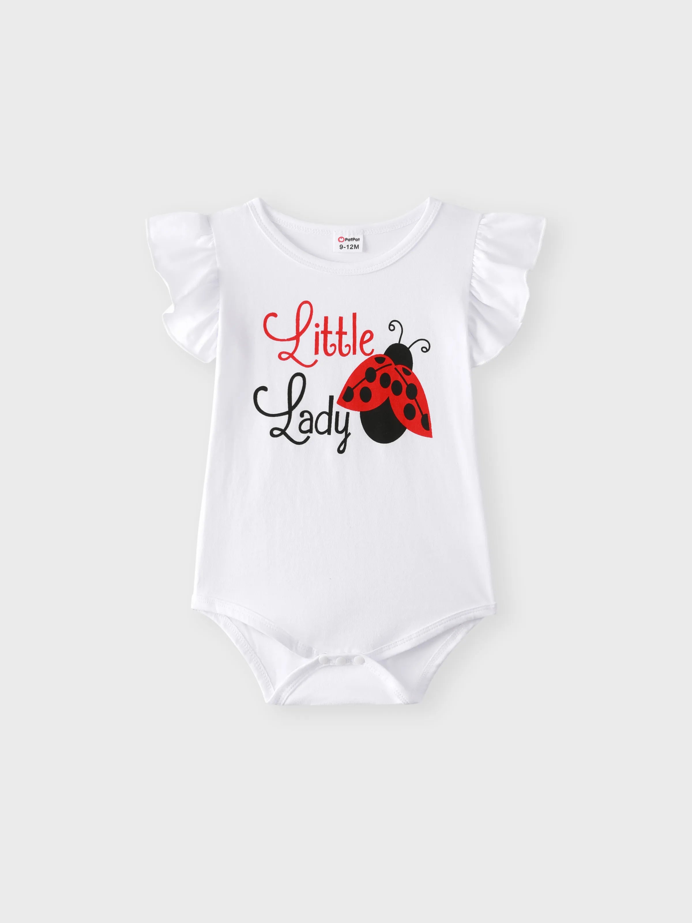 3pcs Baby Girl 95% Cotton Ruffle Sleeve Letter Print Romper and Ladybugs Print Shorts with Headband Set White