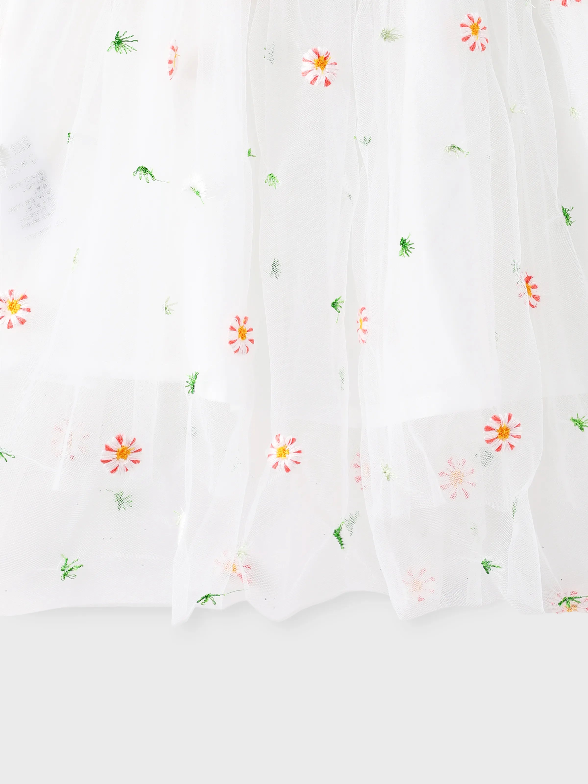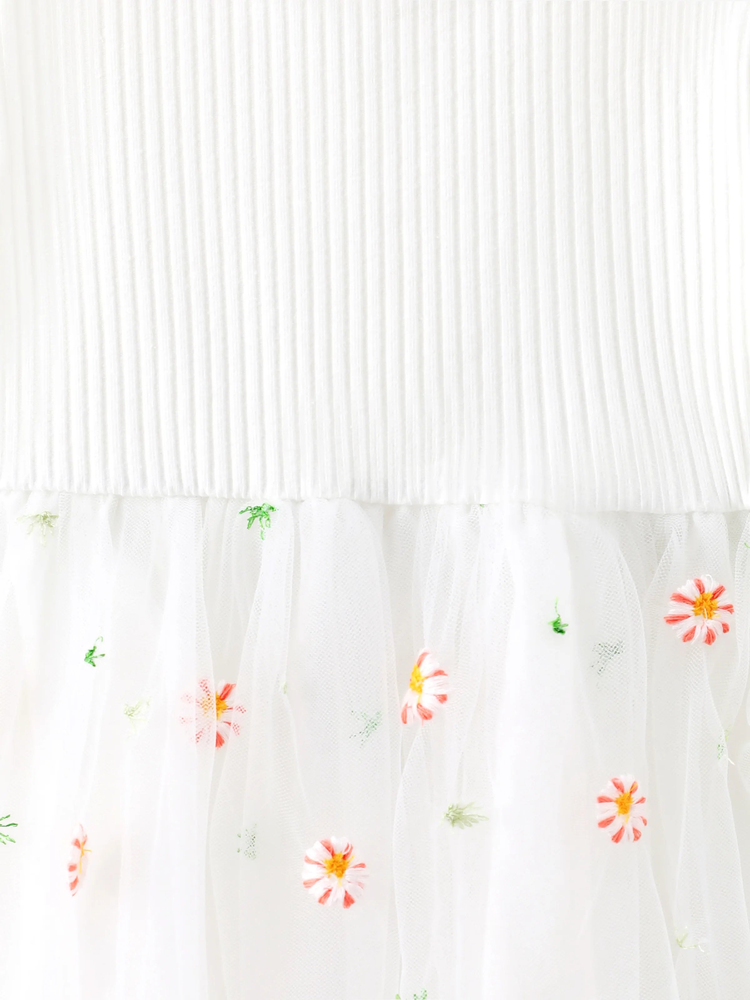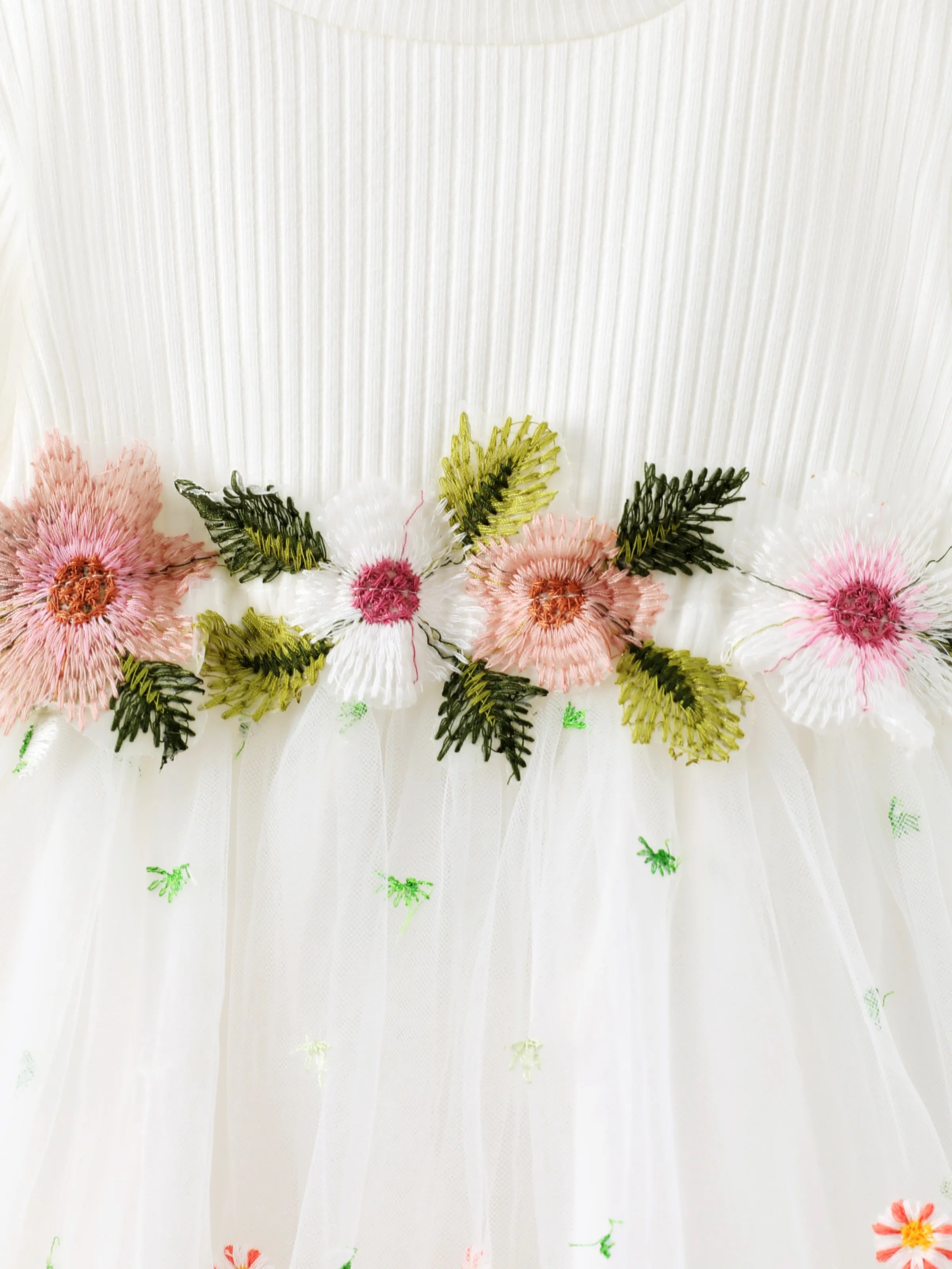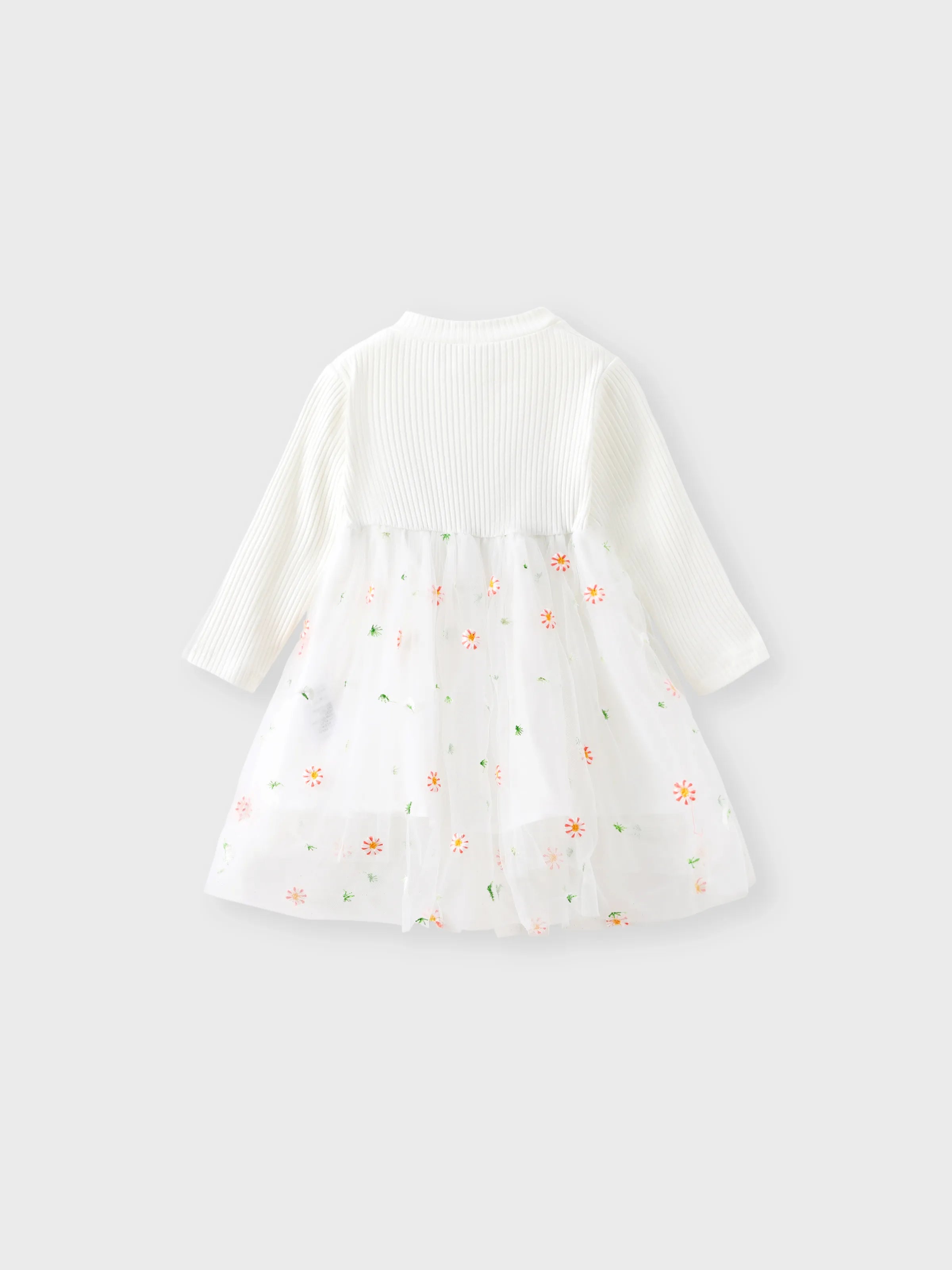 Baby Girl White Ribbed Long-sleeve Splicing Floral Embroidered Mesh Fairy Dress White