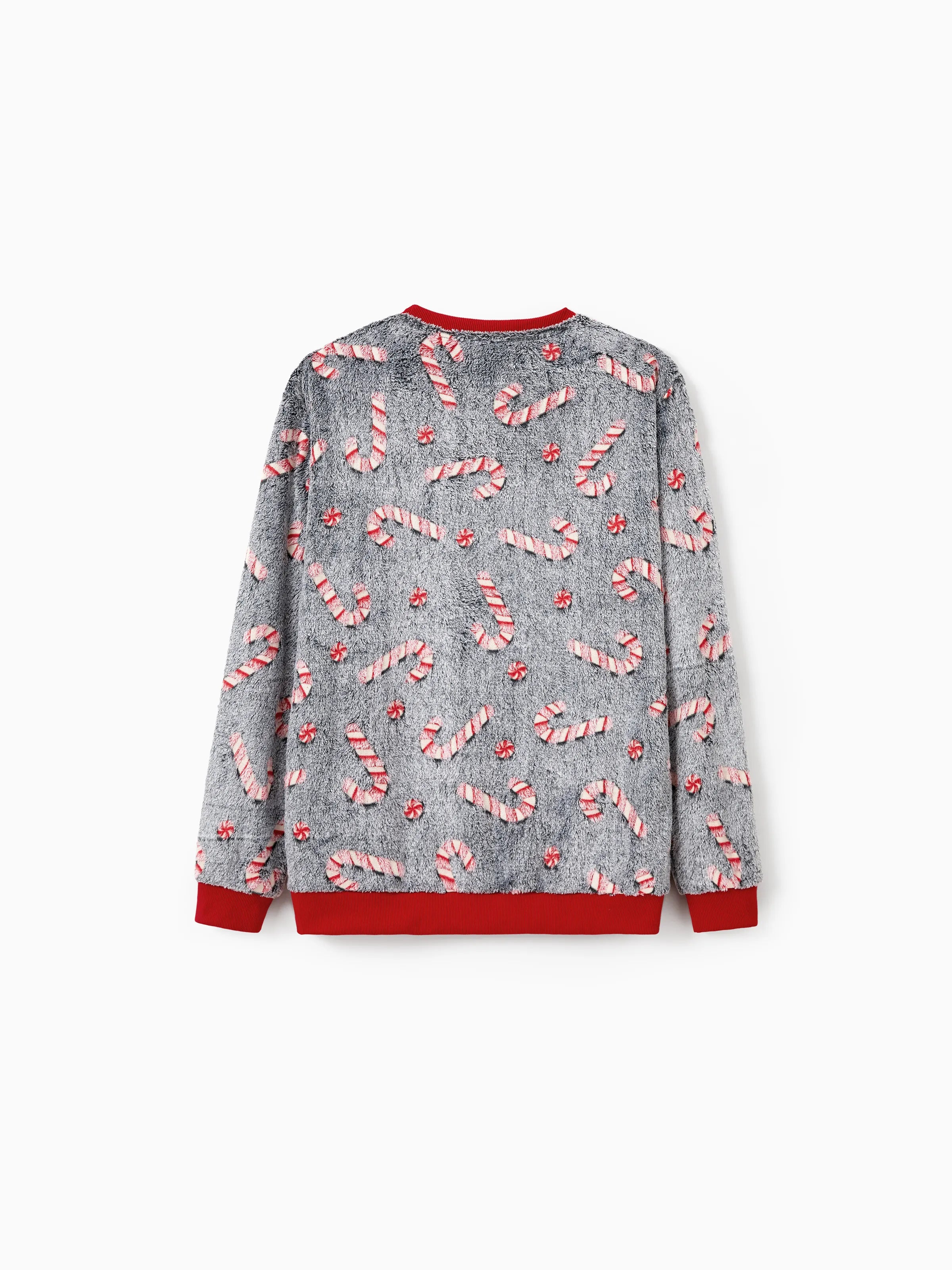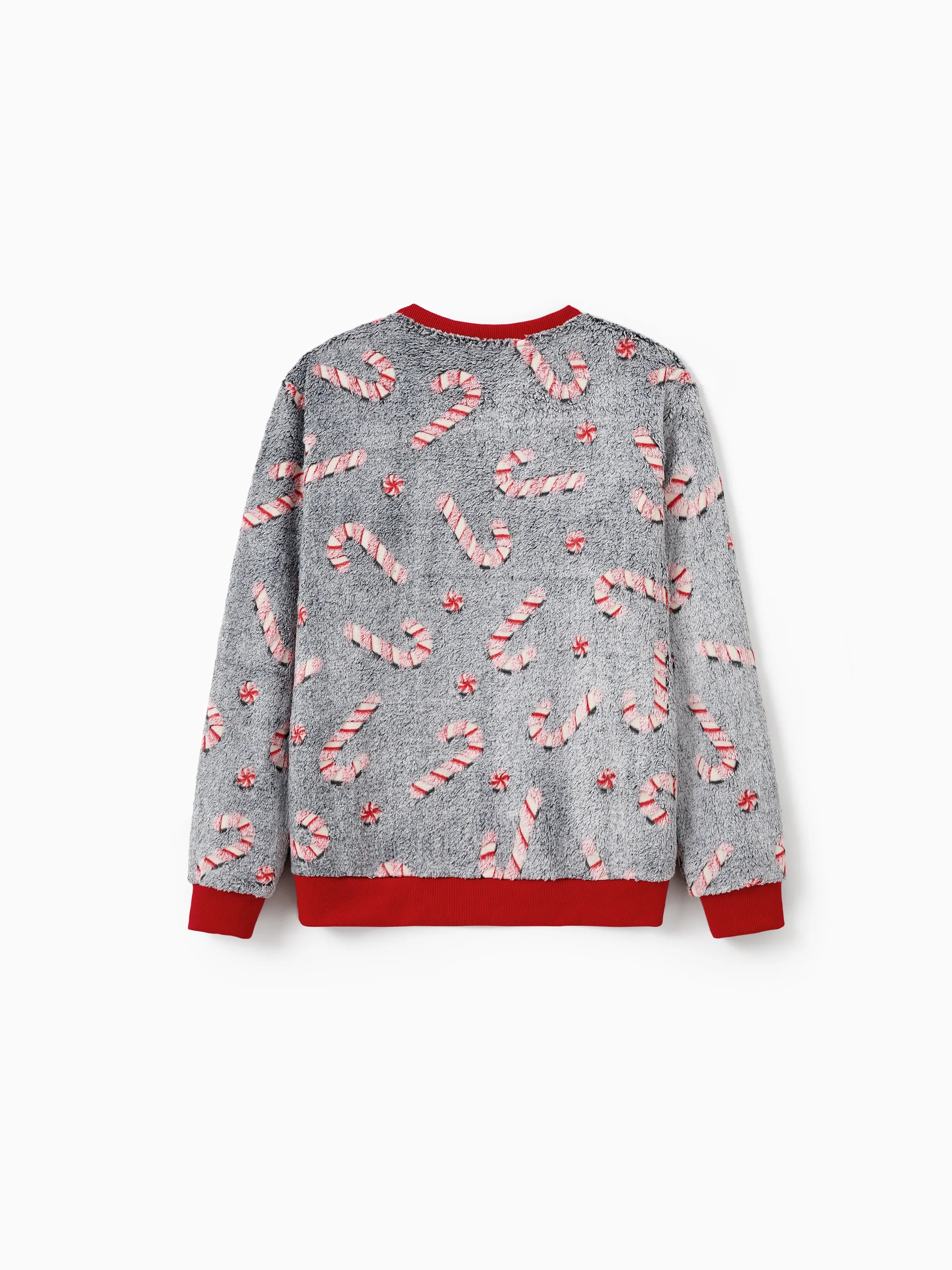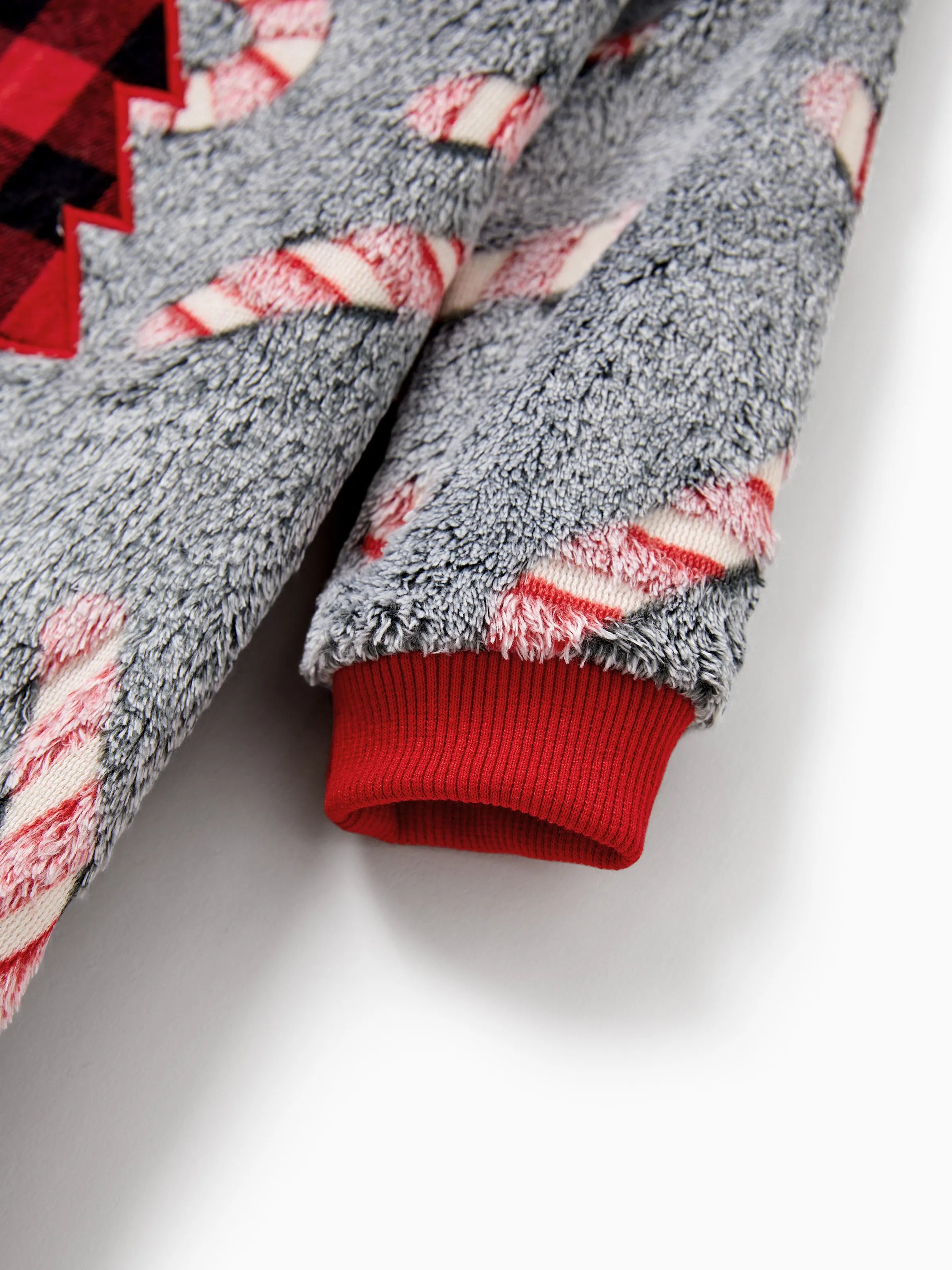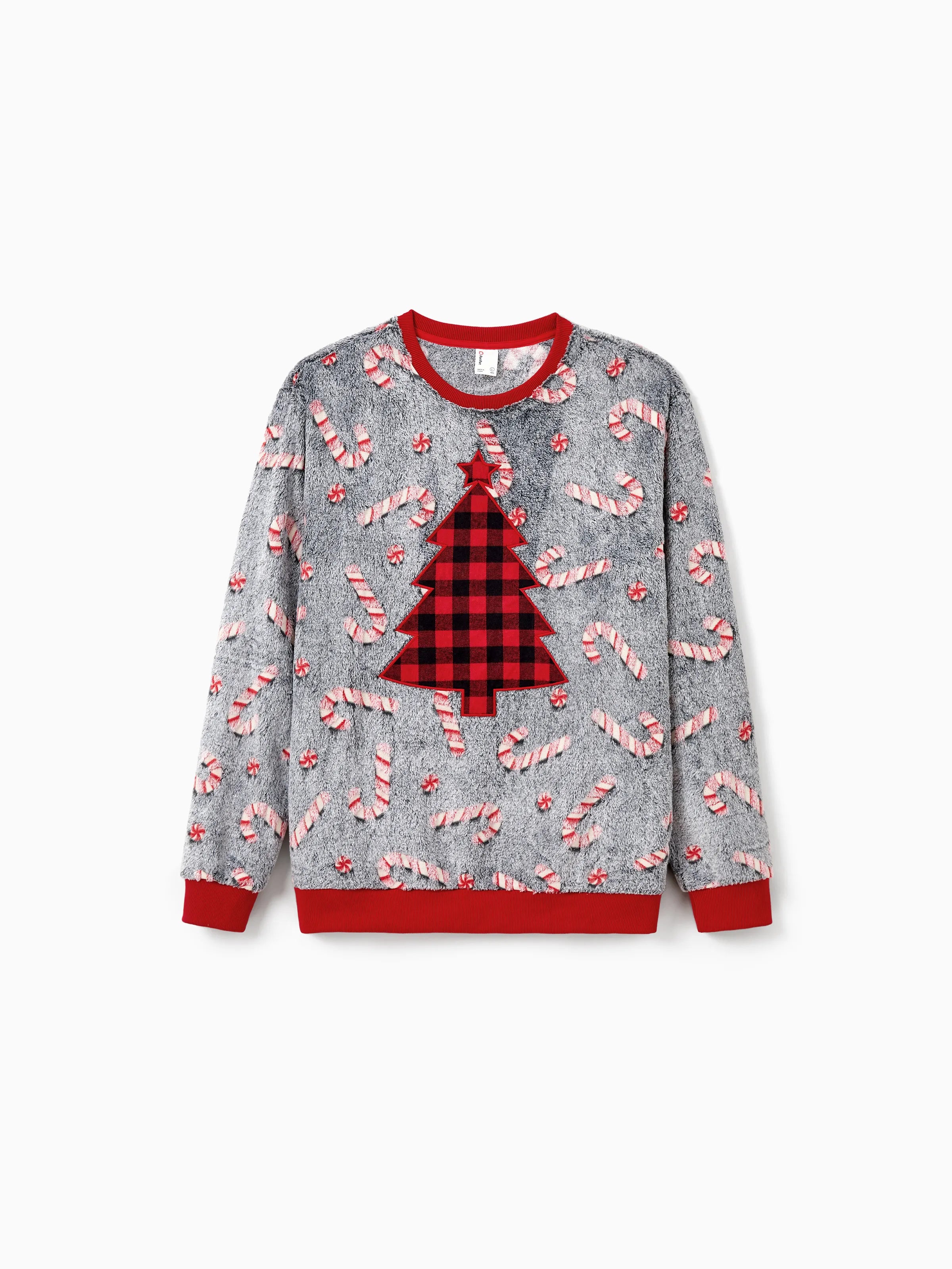 Christmas Family Matching Long Sleeve Fleece Tops Glow In The Dark Candy Canes Print with plaid Christmas tree Pattern Sweatshirt White/Gray