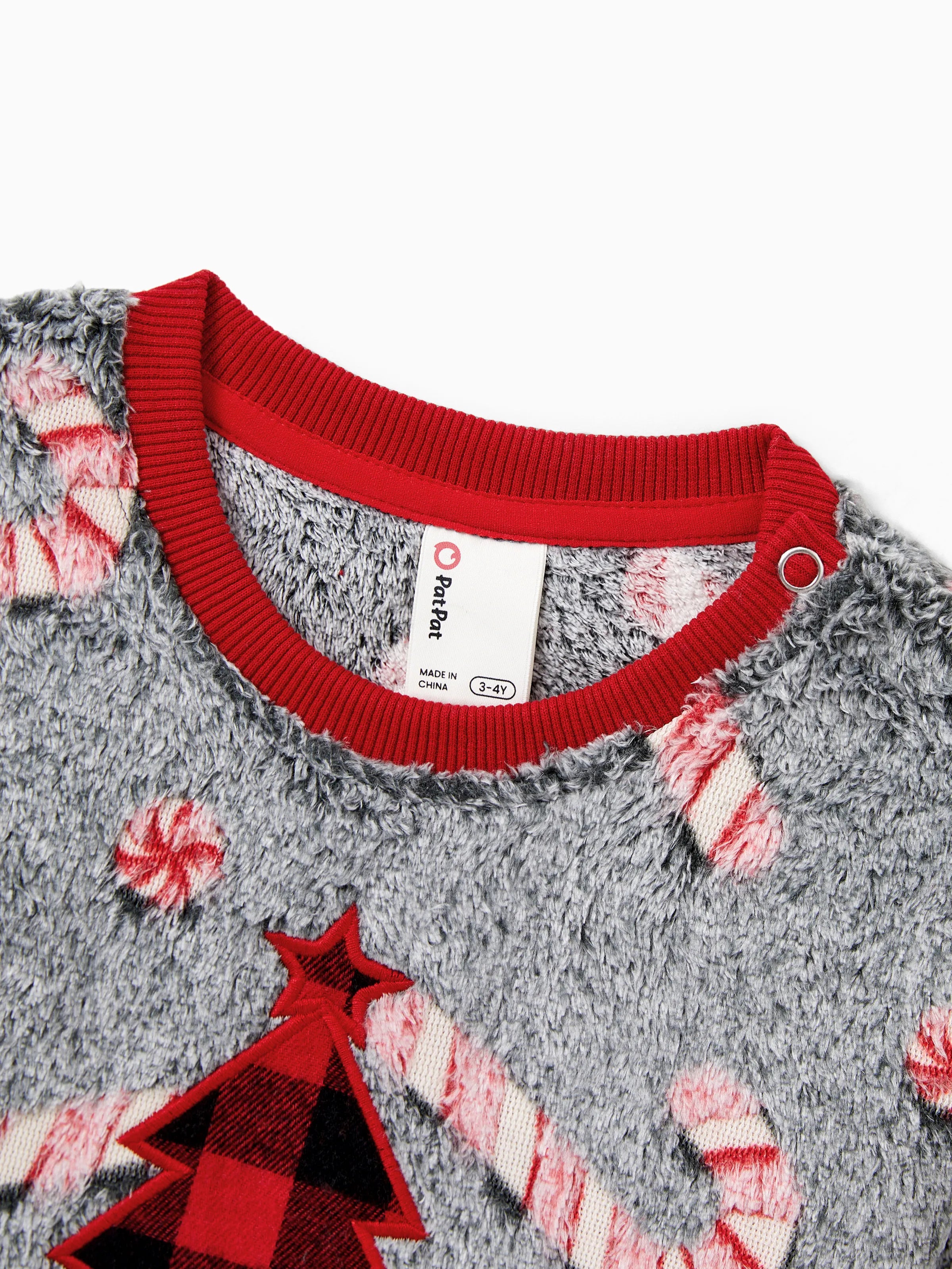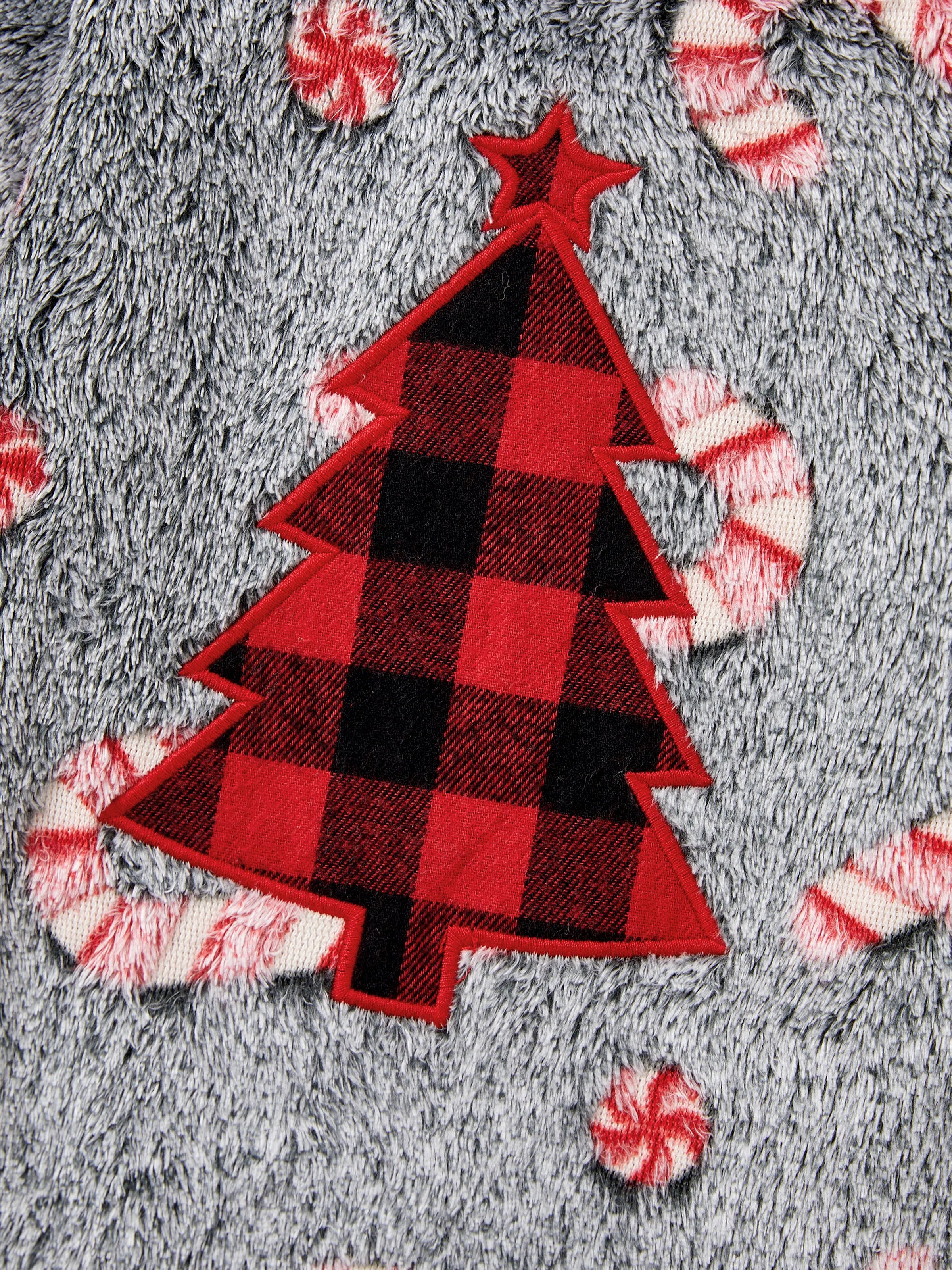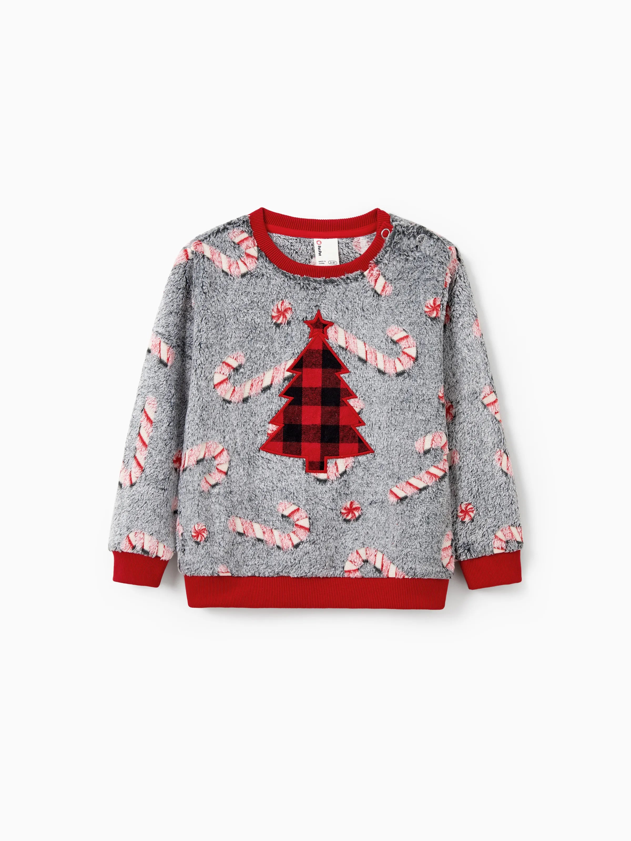 Christmas Family Matching Long Sleeve Fleece Tops Glow In The Dark Candy Canes Print with plaid Christmas tree Pattern Sweatshirt White/Gray