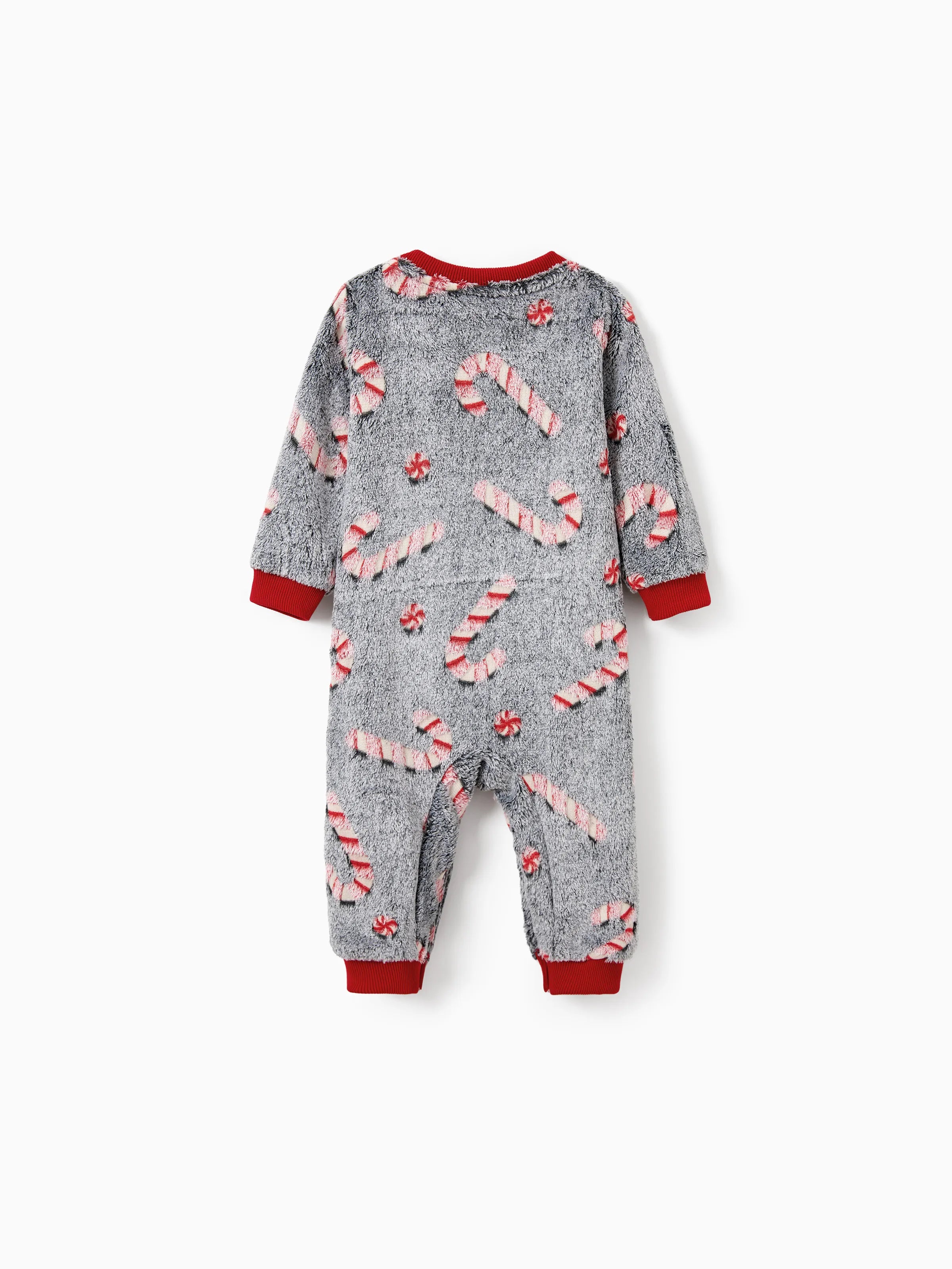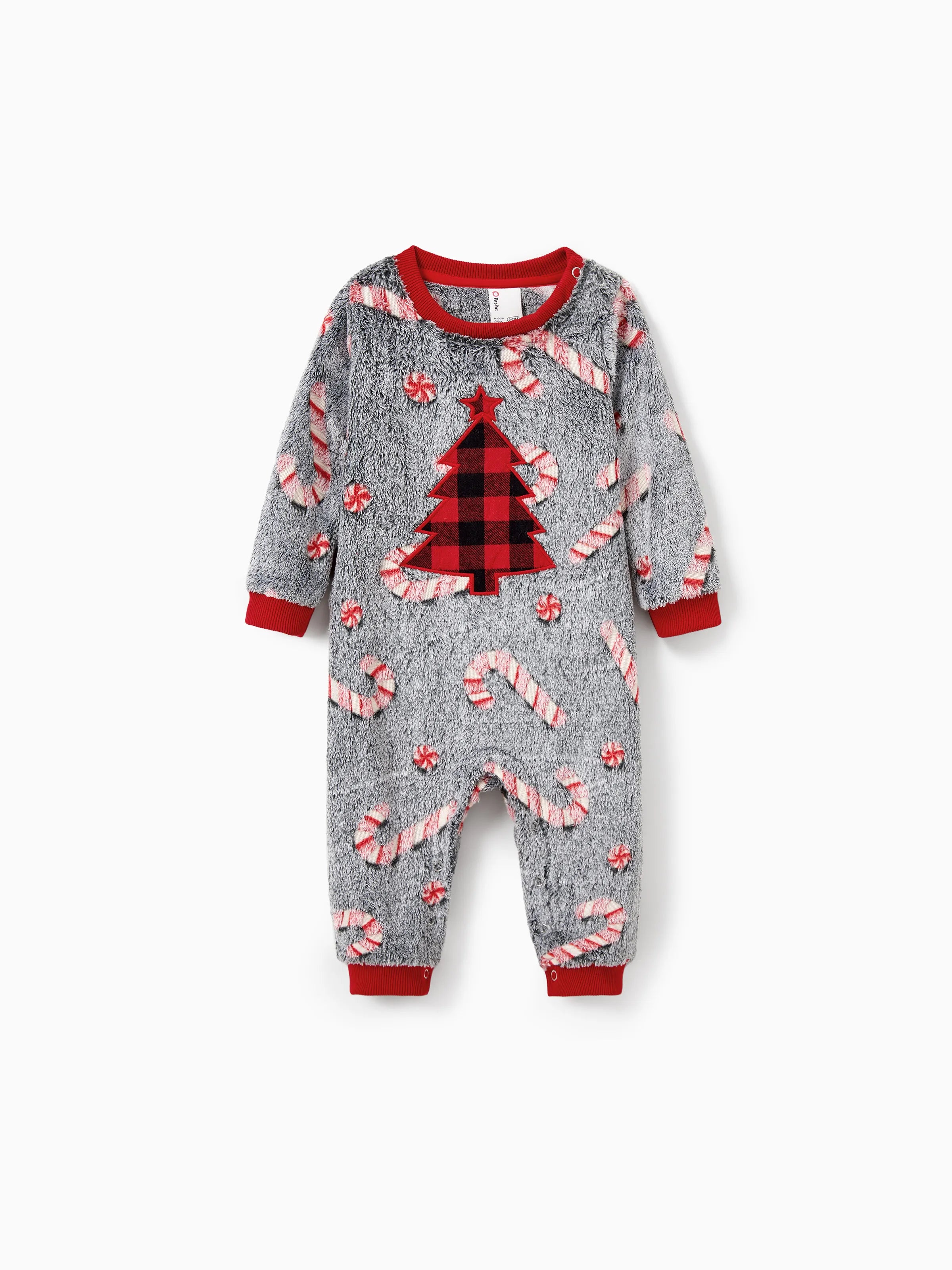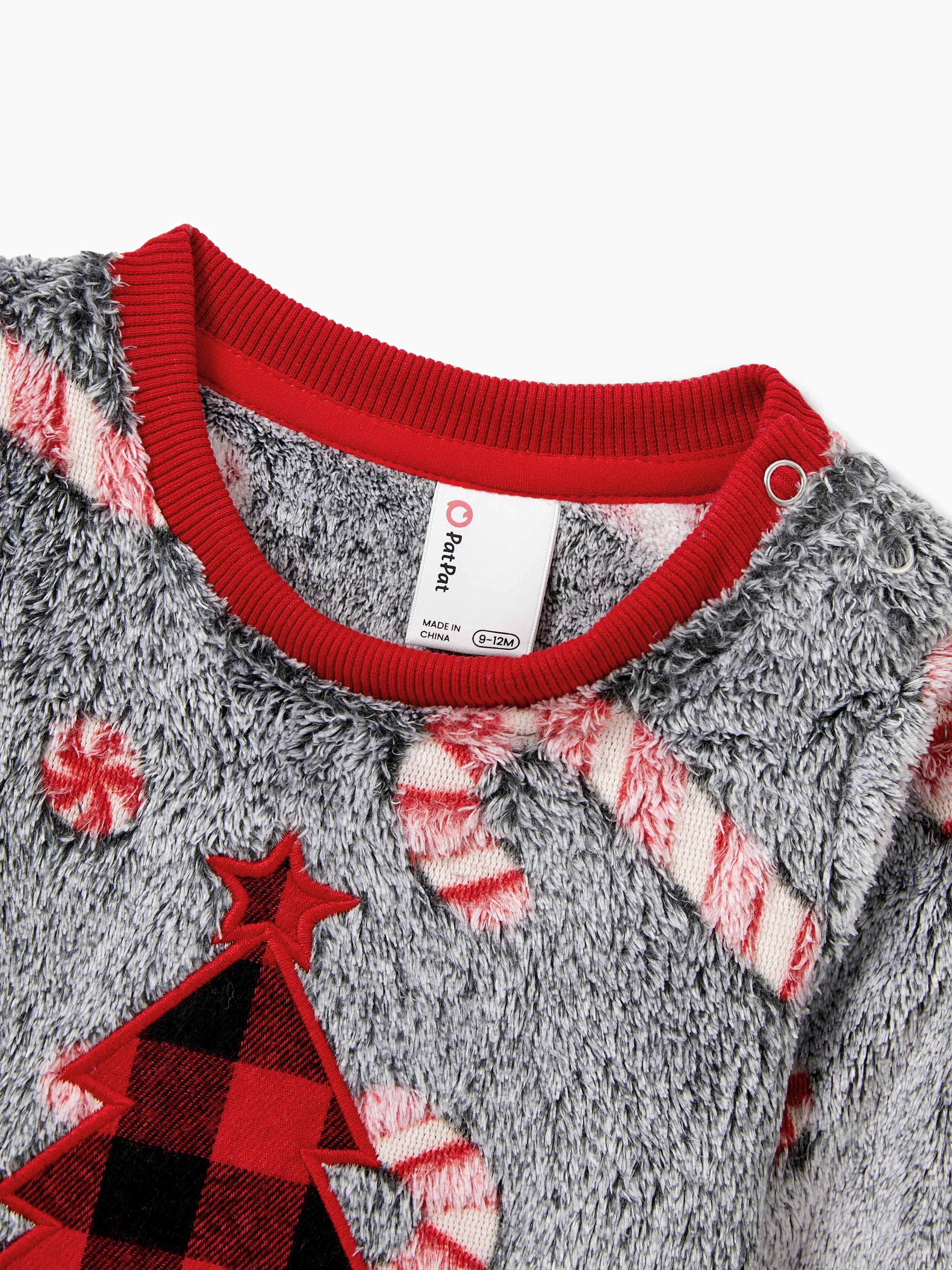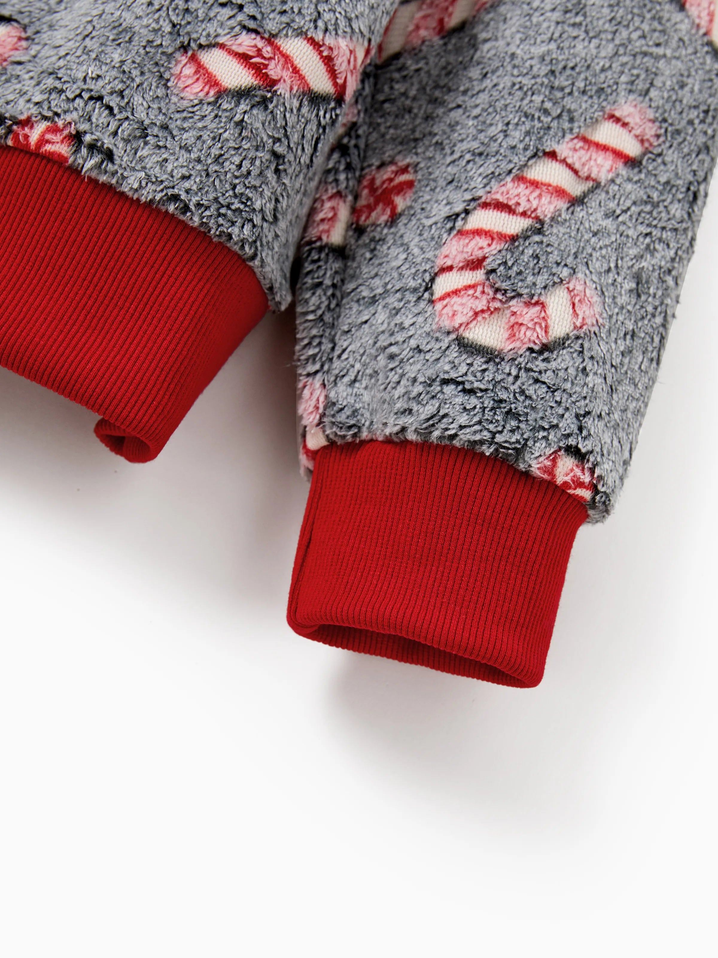 Christmas Family Matching Long Sleeve Fleece Tops Glow In The Dark Candy Canes Print with plaid Christmas tree Pattern Sweatshirt White/Gray