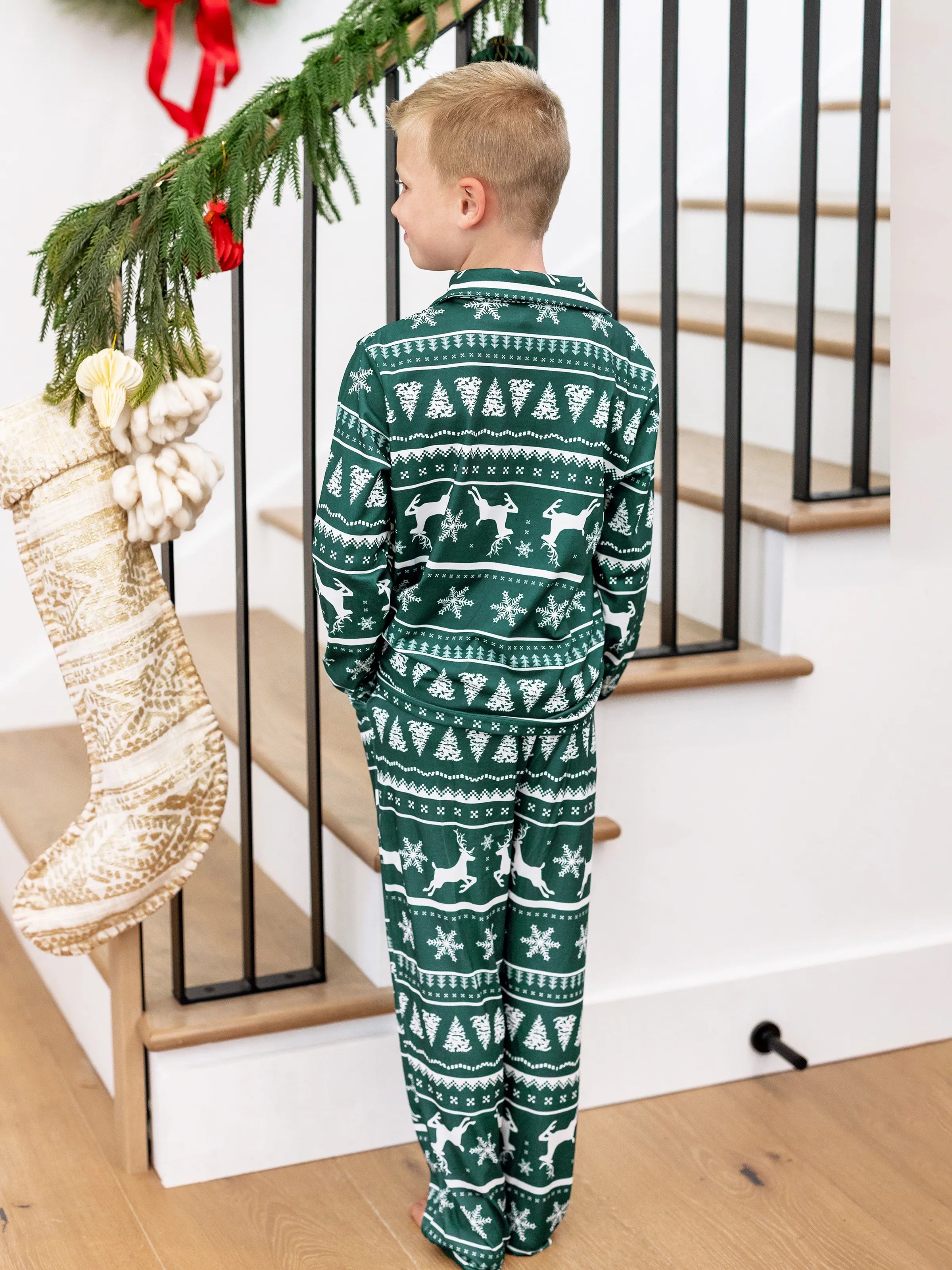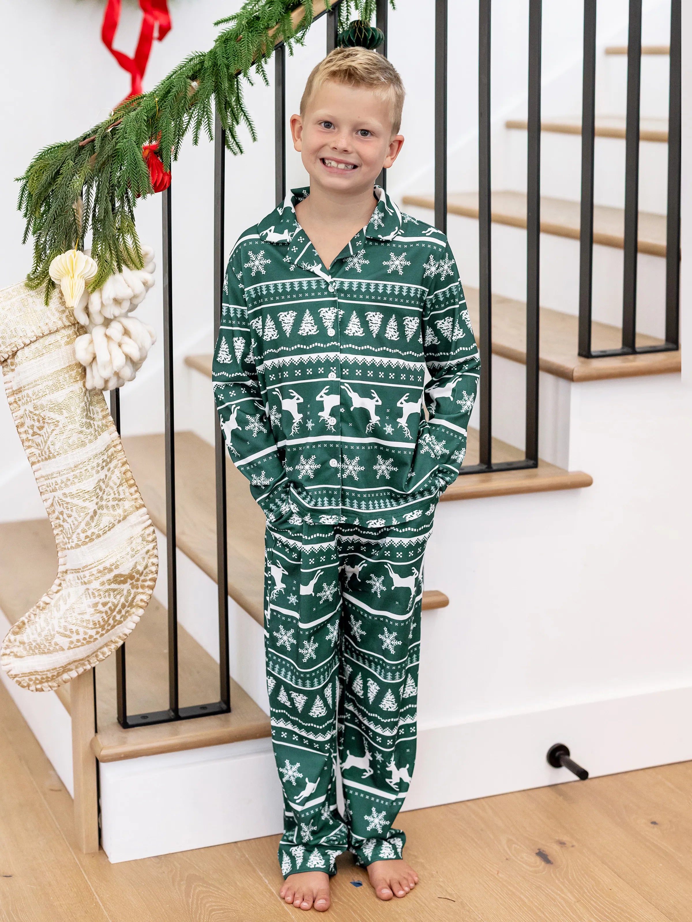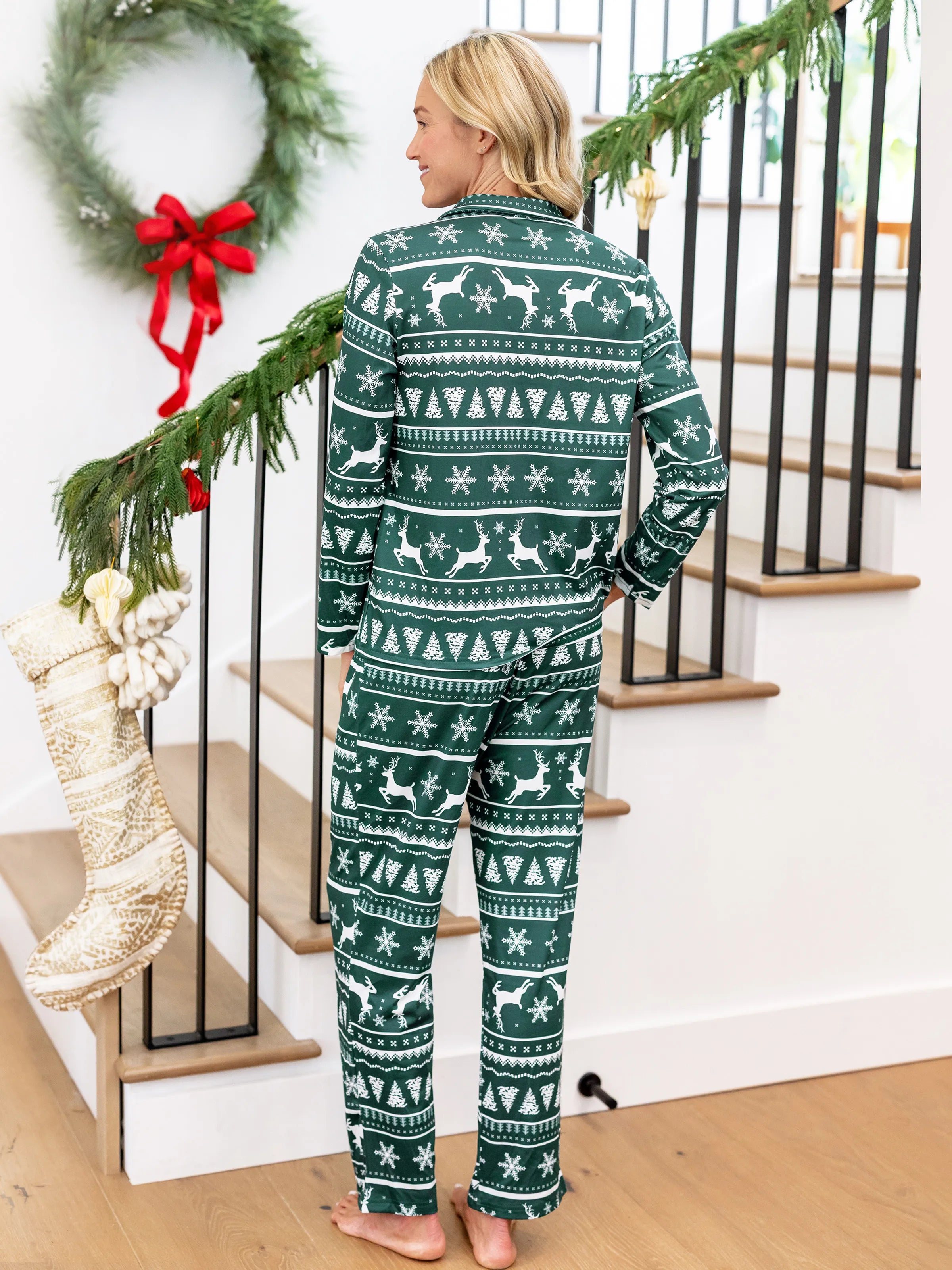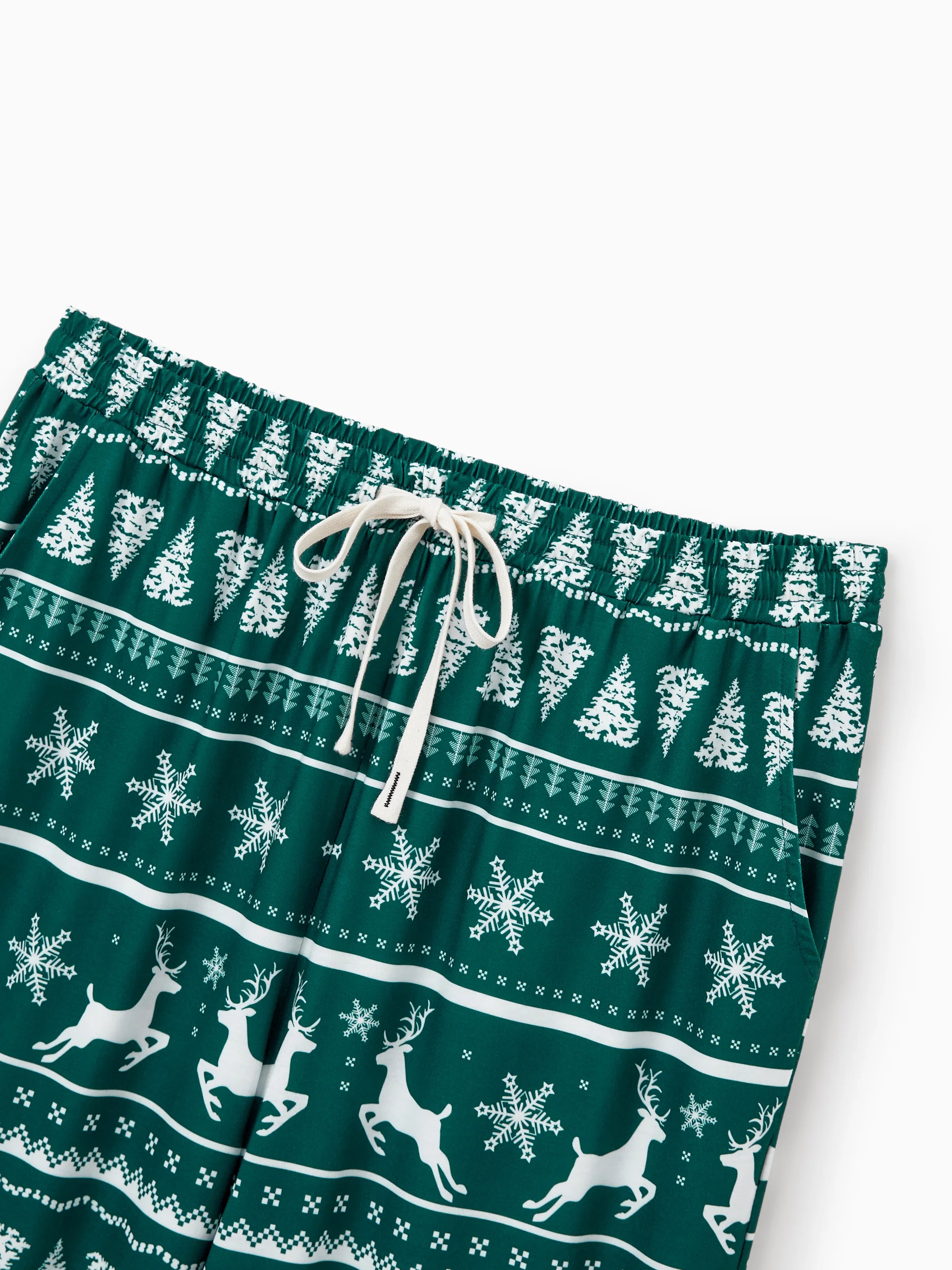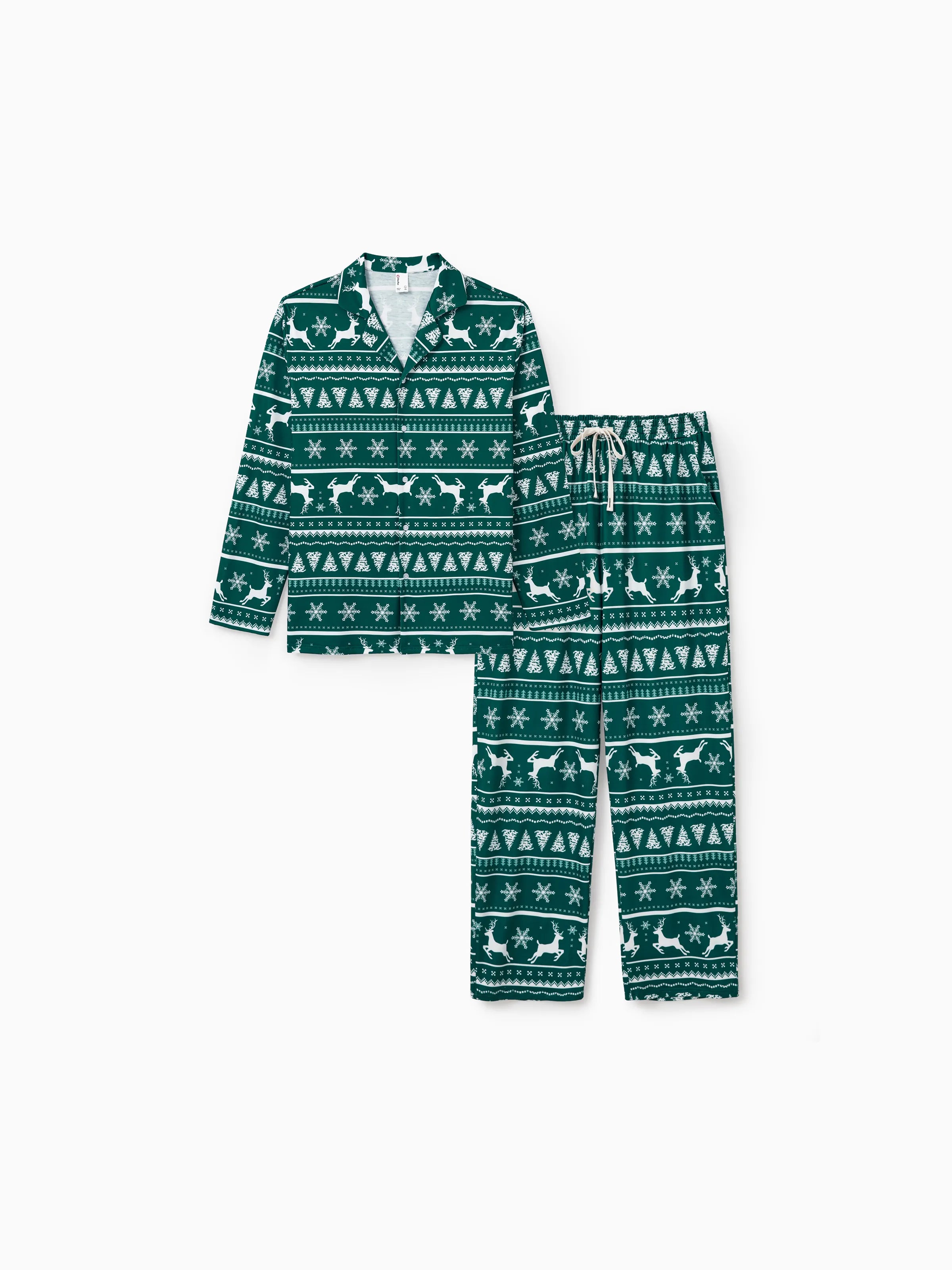 Christmas Matching Family Pajamas Set Allover Reindeer and Snowflake Print Long-sleeve Collared PJS with Christmas Socks Dark Green