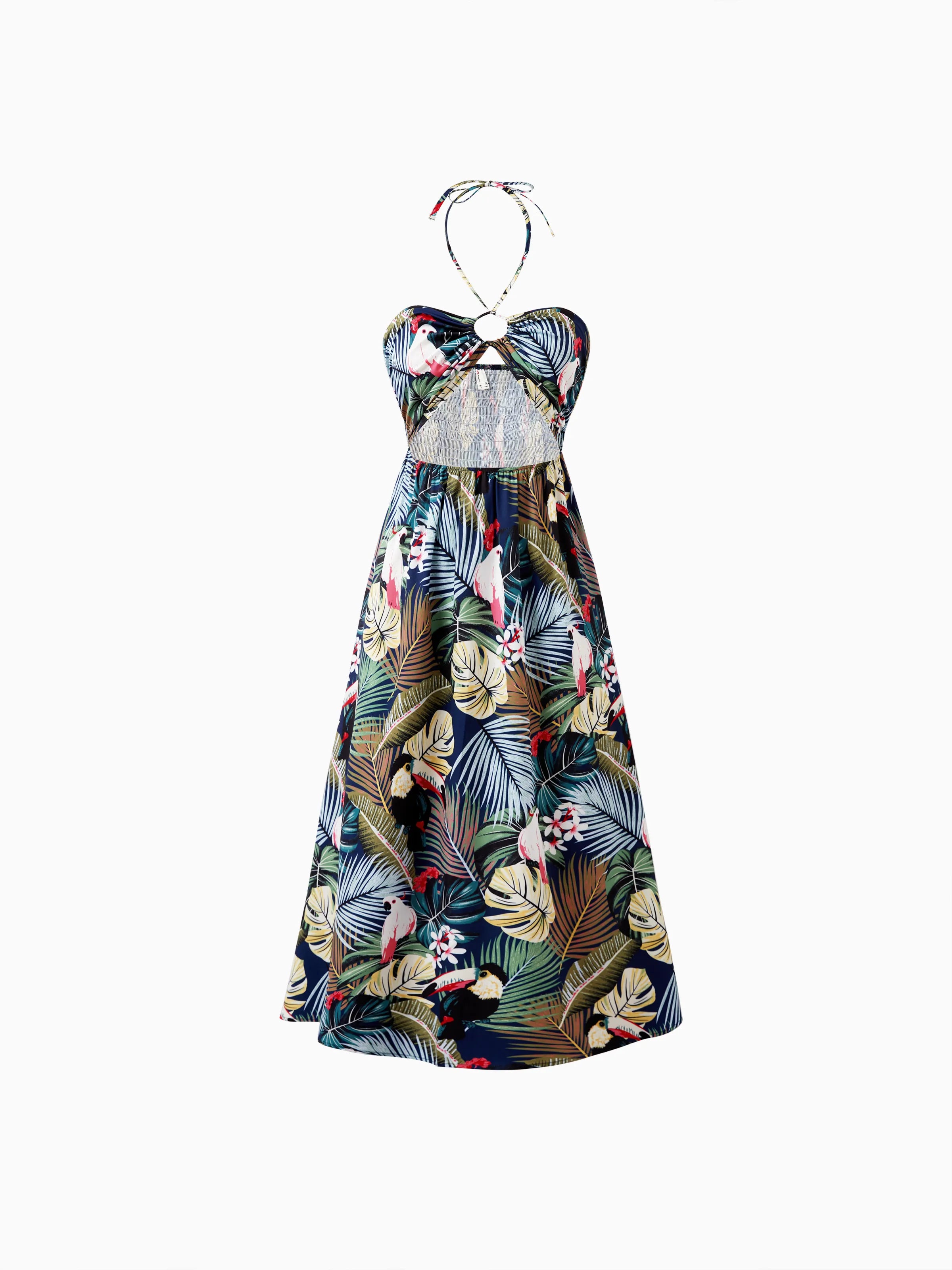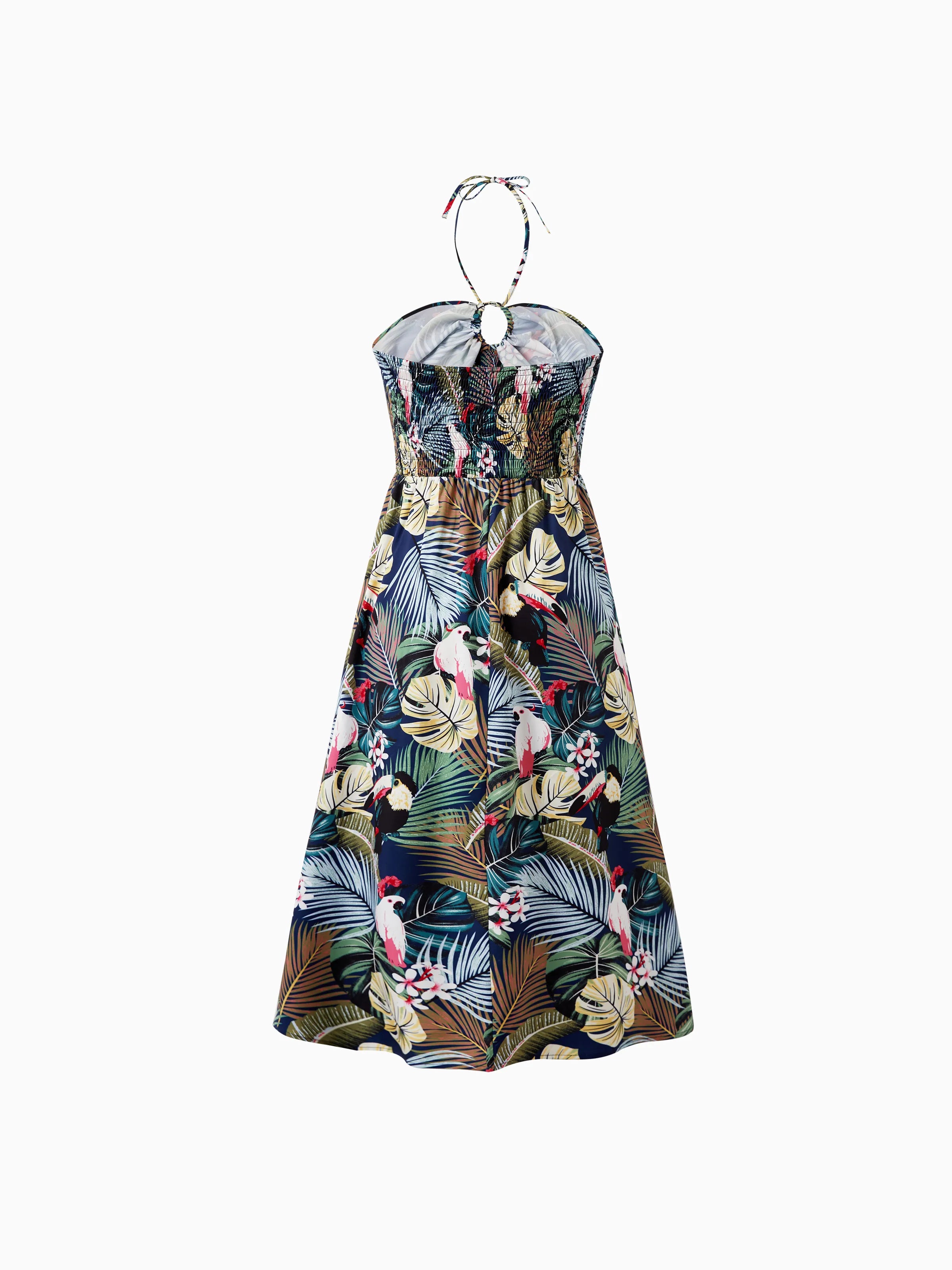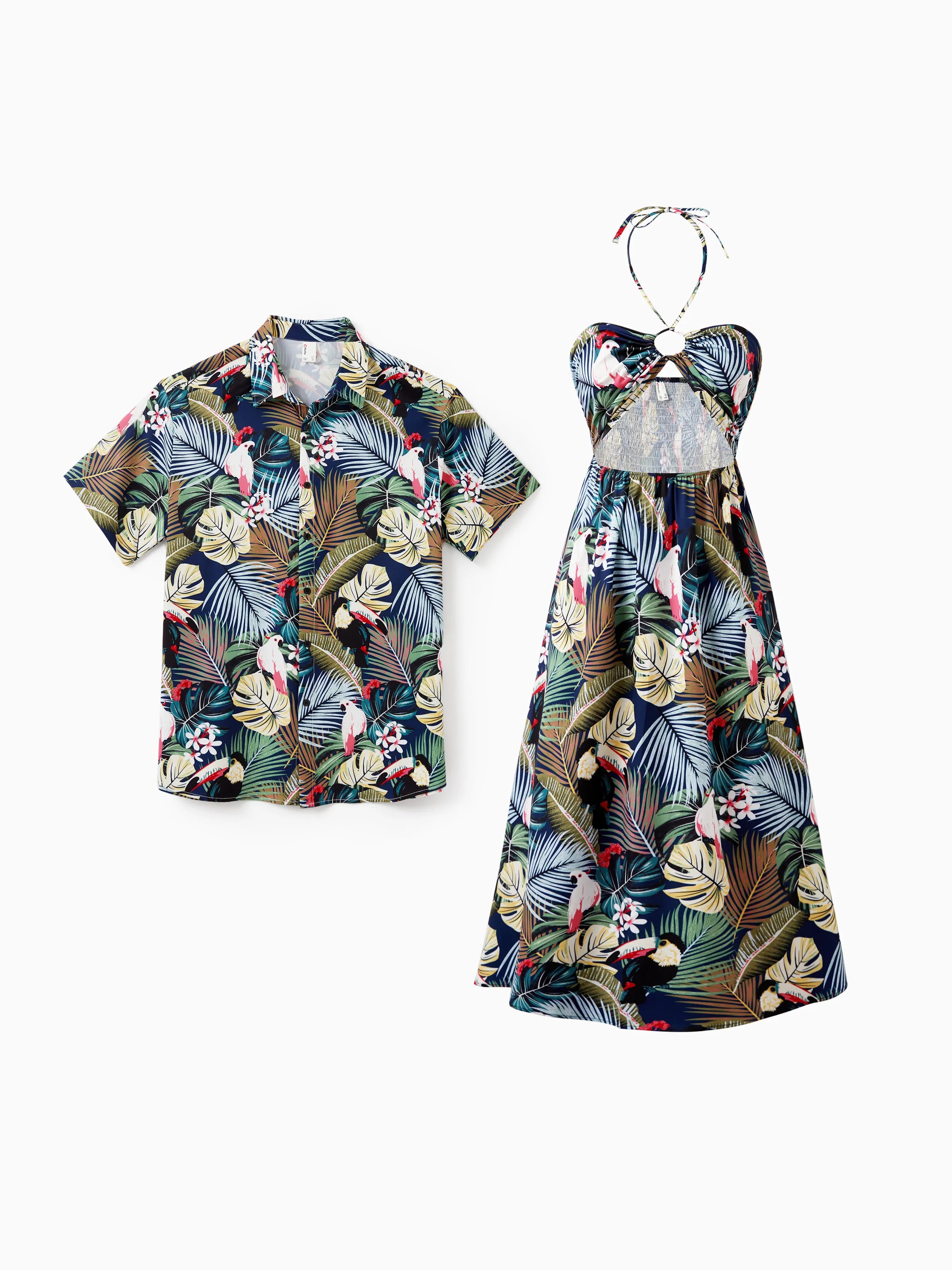 Couples Matching Hawaiian Set Tropical Print Short Sleeve Button-Down Shirt & Halter Cut Out Smocked Back Dress Set for Vacation Beachwear Deep Blue