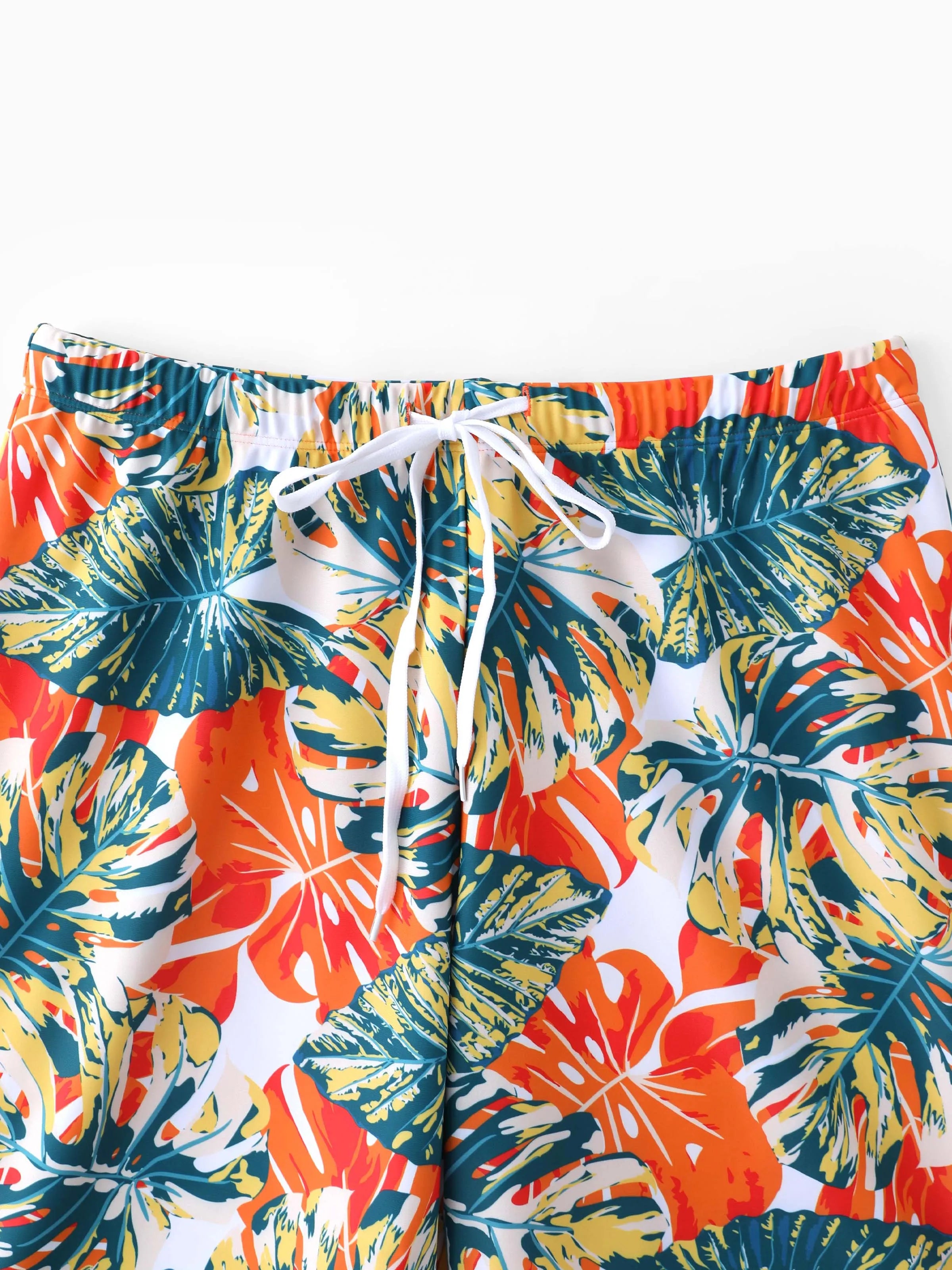 Daddy & Son Orange and All Over Tropical Plant Print Splicing Ruffle Swim Trunks Shorts Orange color