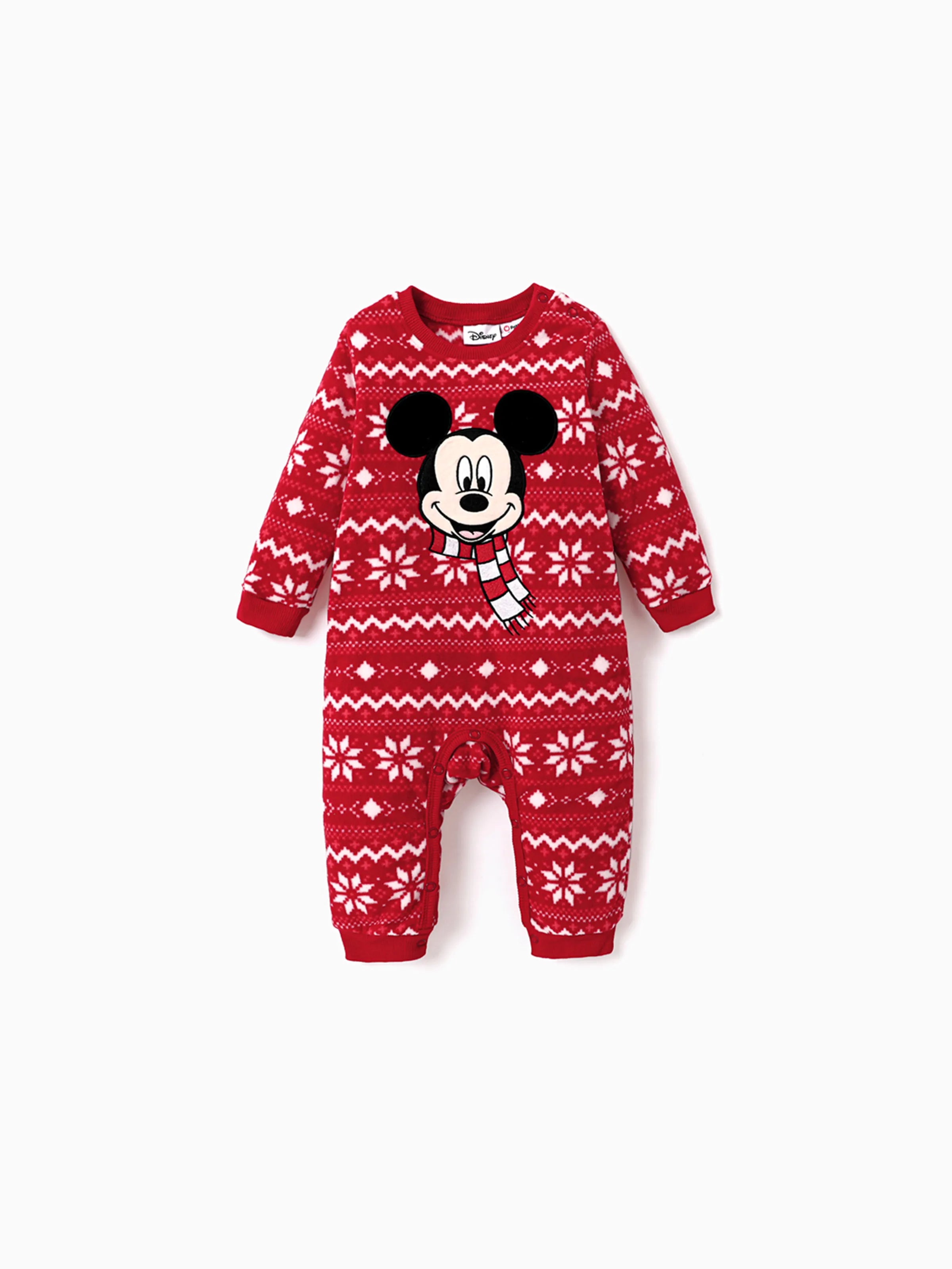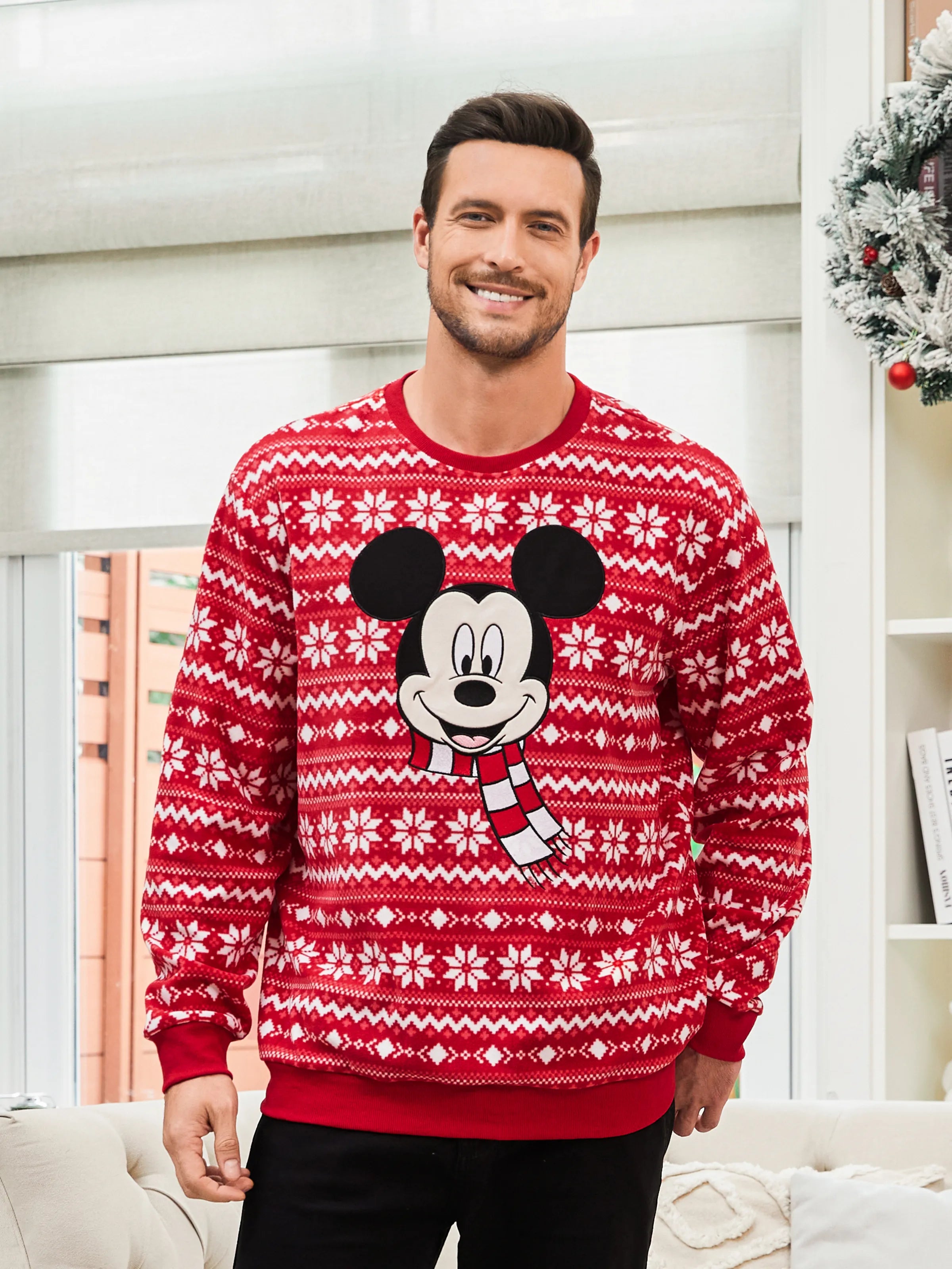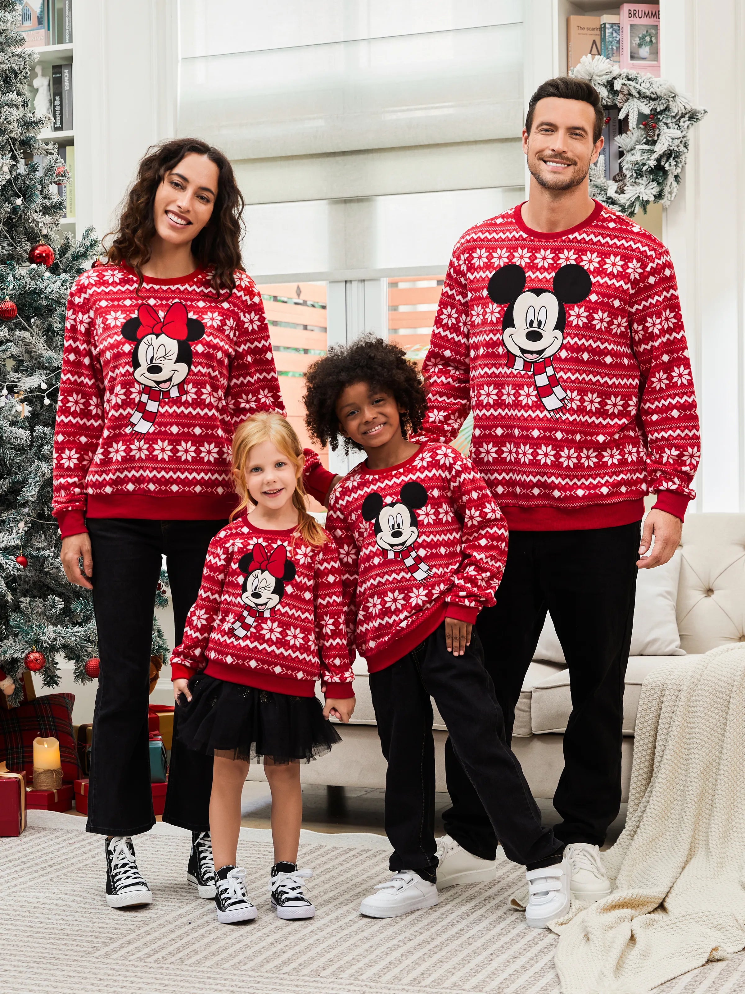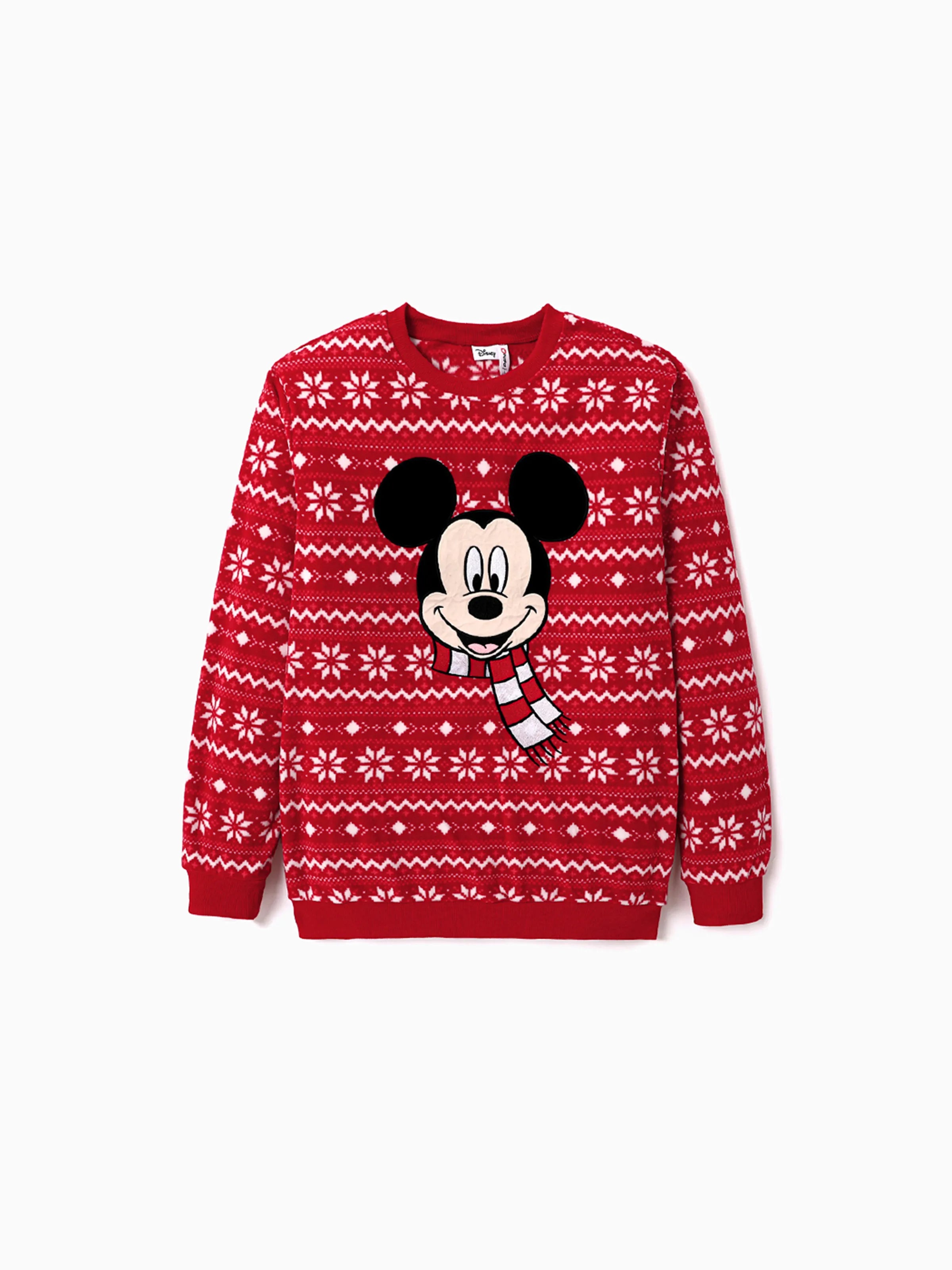 Disney Mickey and Friends Christmas Family Matching Snowflake Character Print Plush Crew Neck Sweatshirt Red