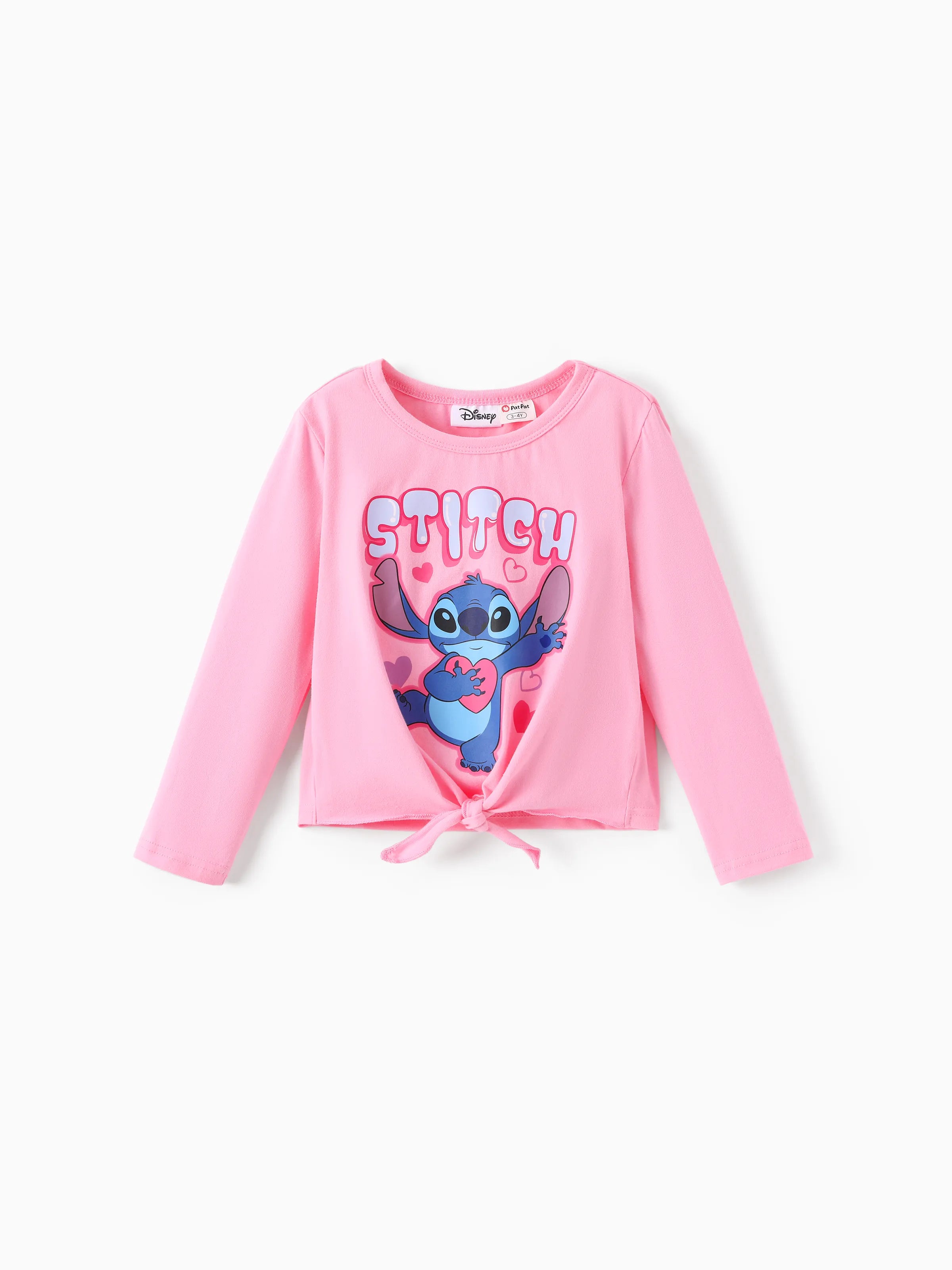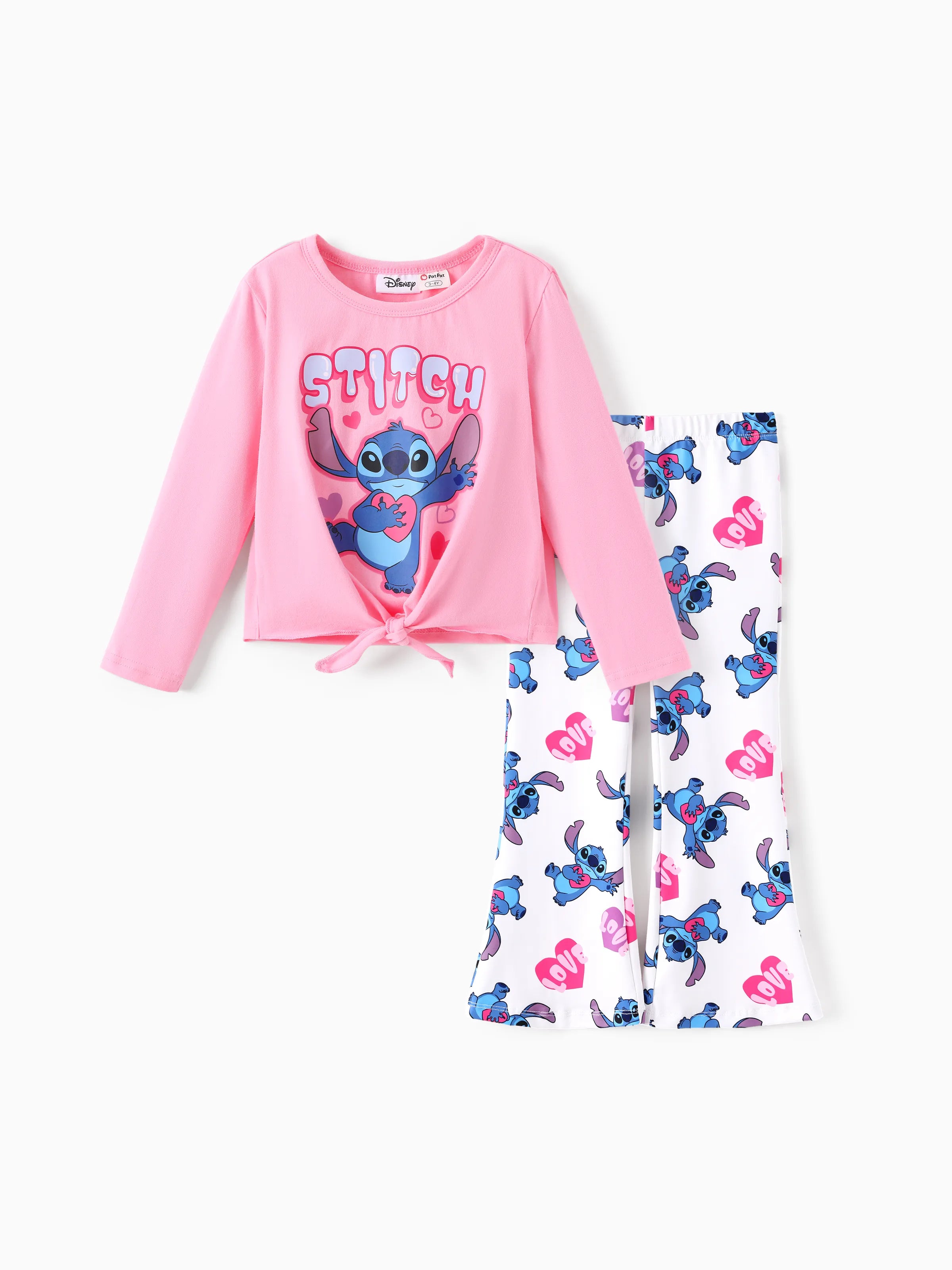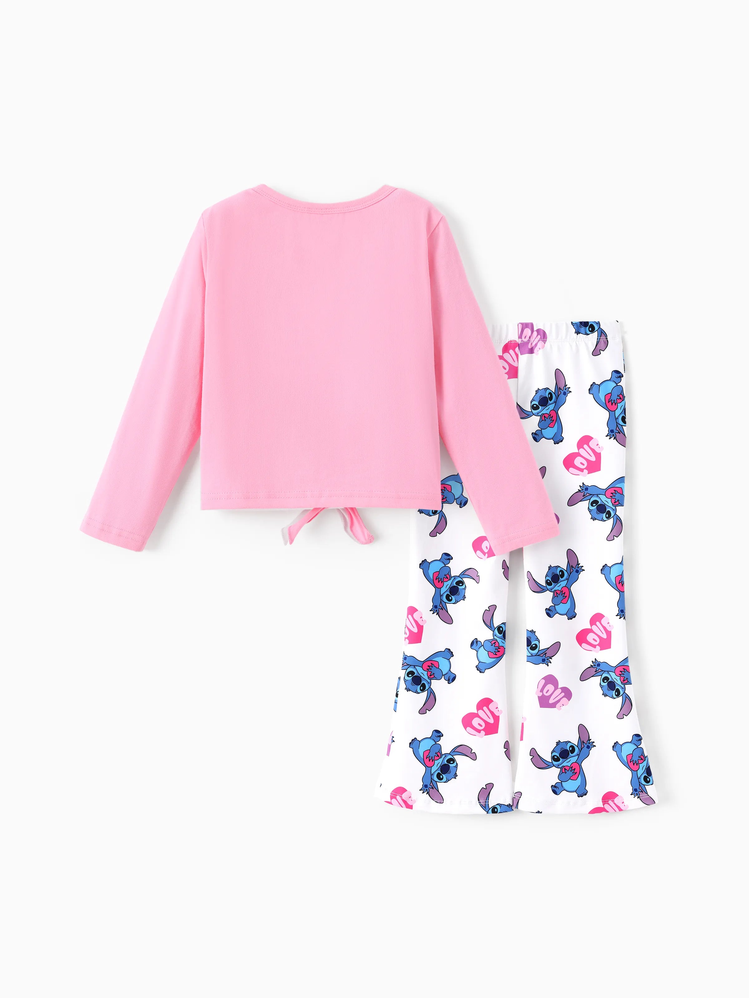 Disney Stitch Toddler/Kids Girl Stitch 2pcs Tie Front Longsleeves Top and Pattern Flared Pant Set Pink