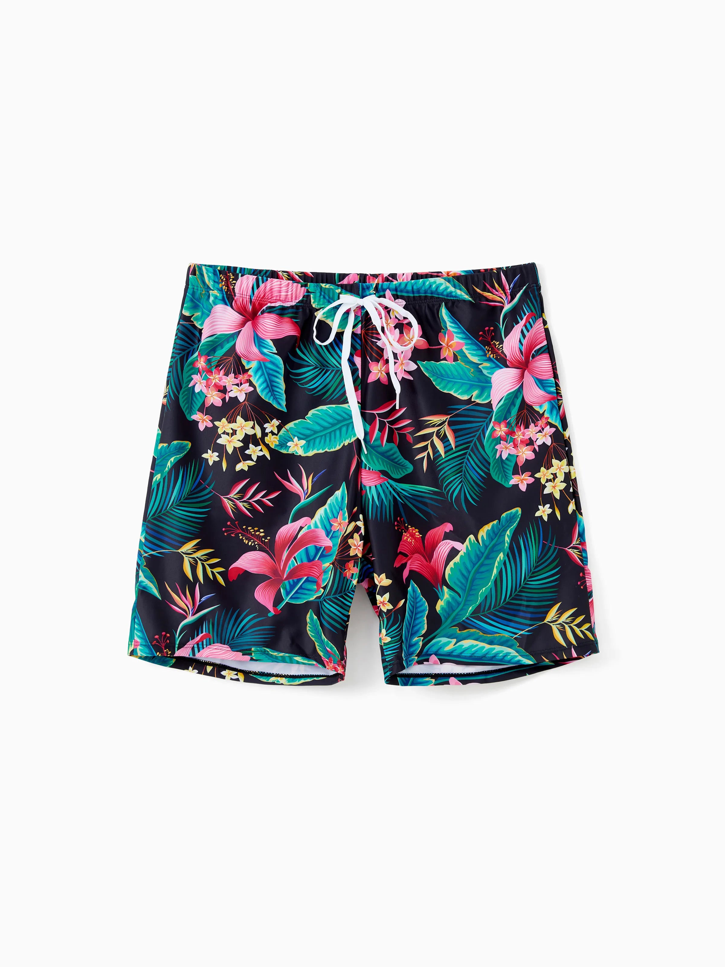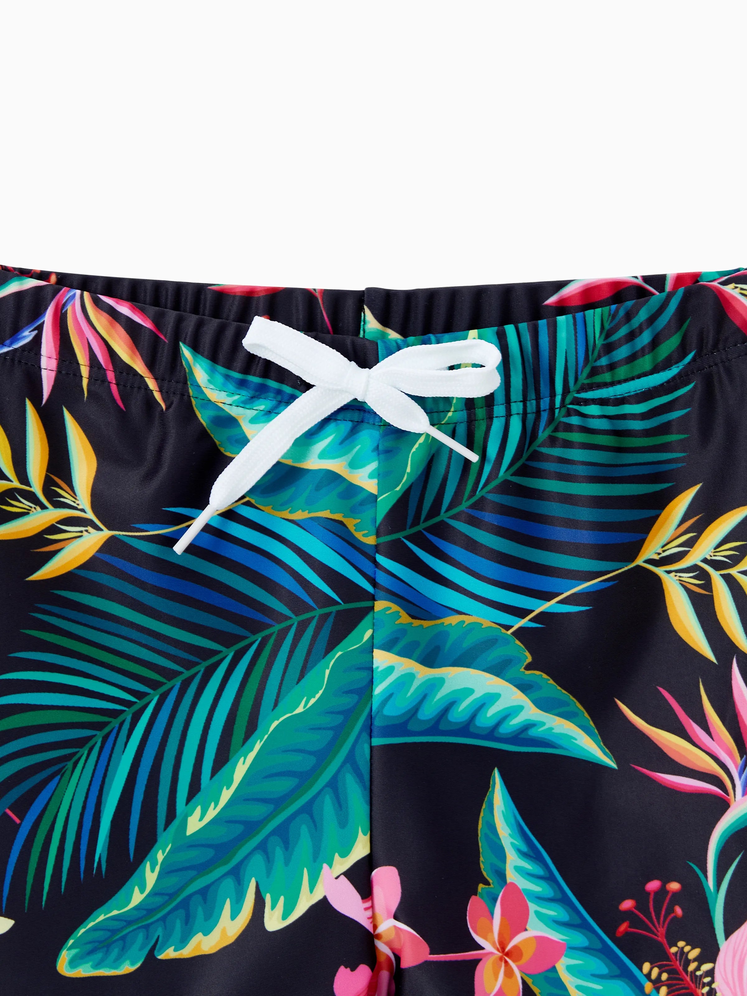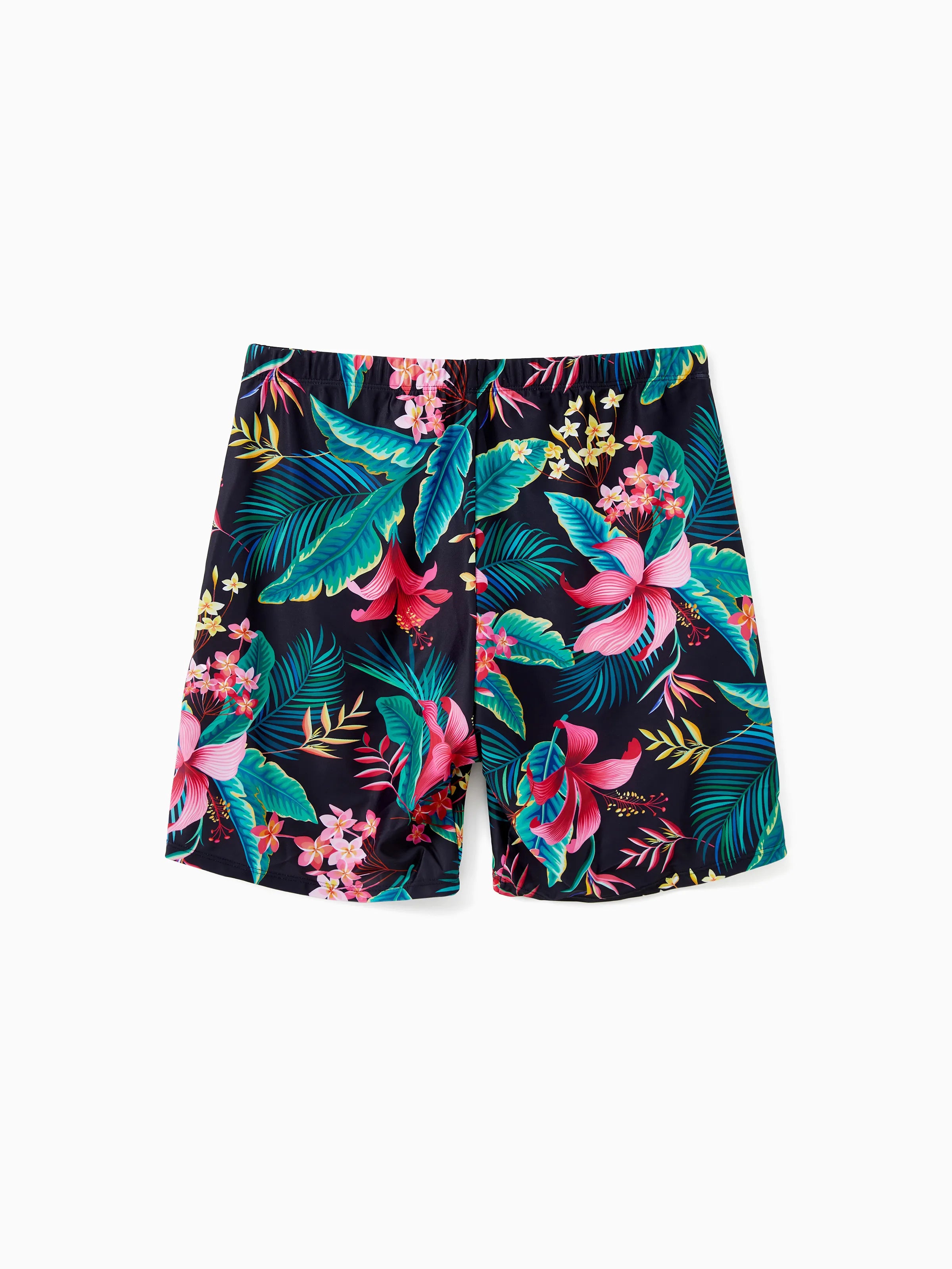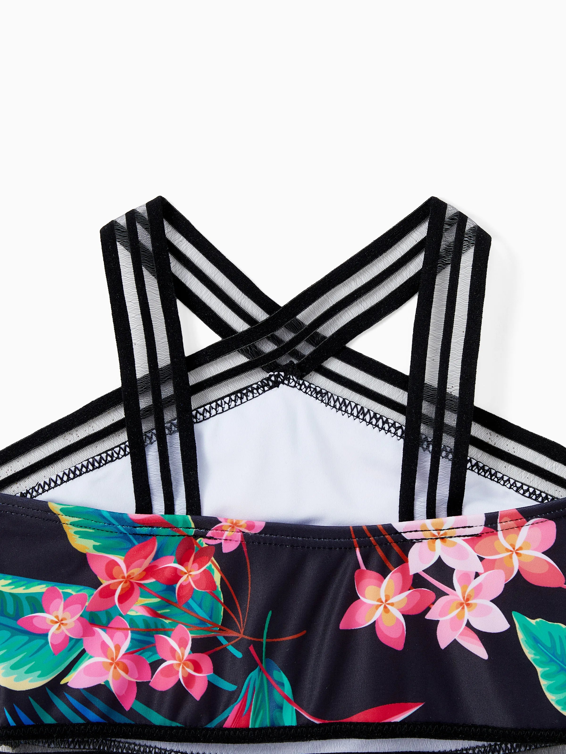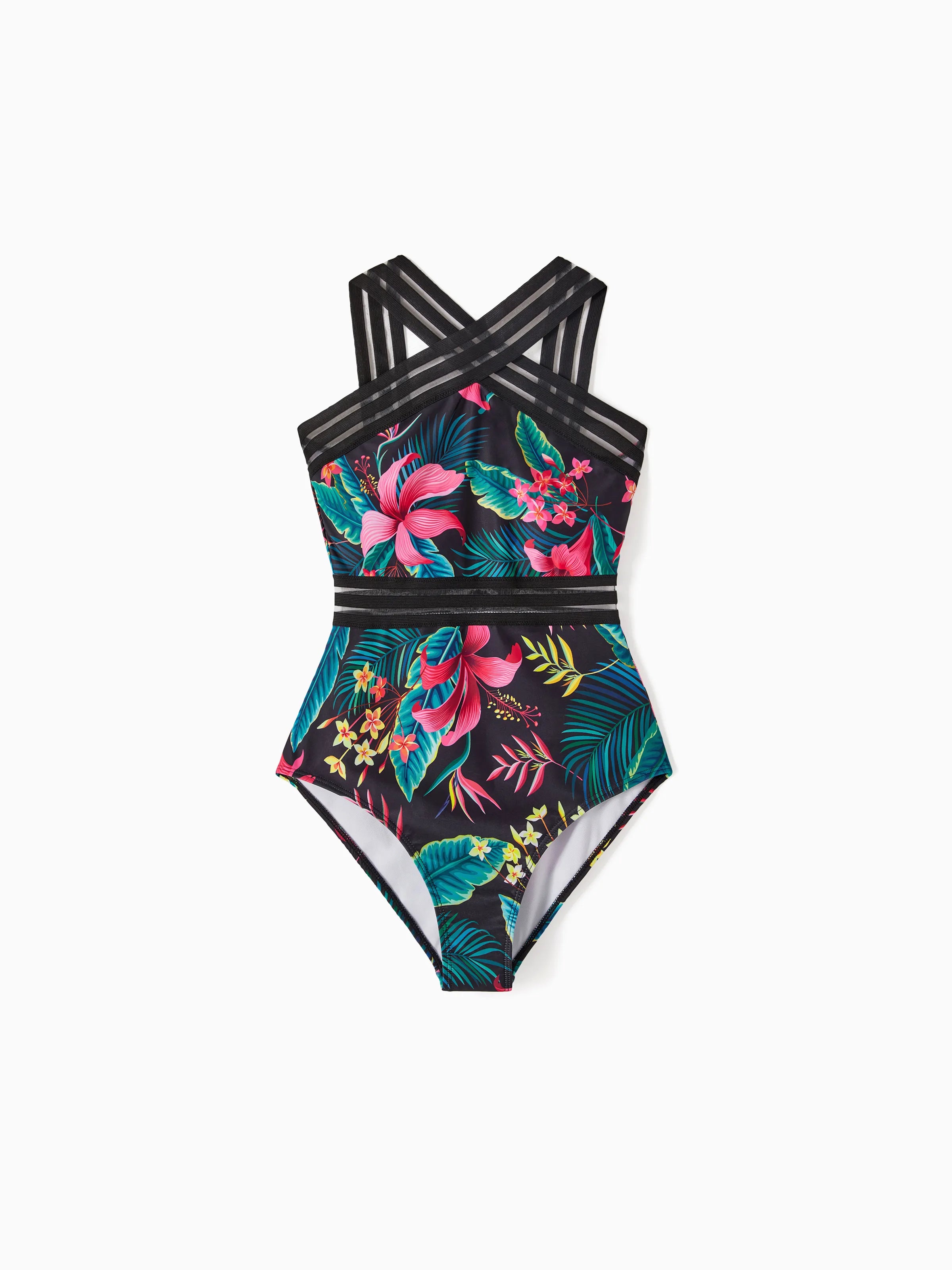 Family Matching Allover Plant Print Crisscross One-Piece Swimsuit and Swim Trunks Black