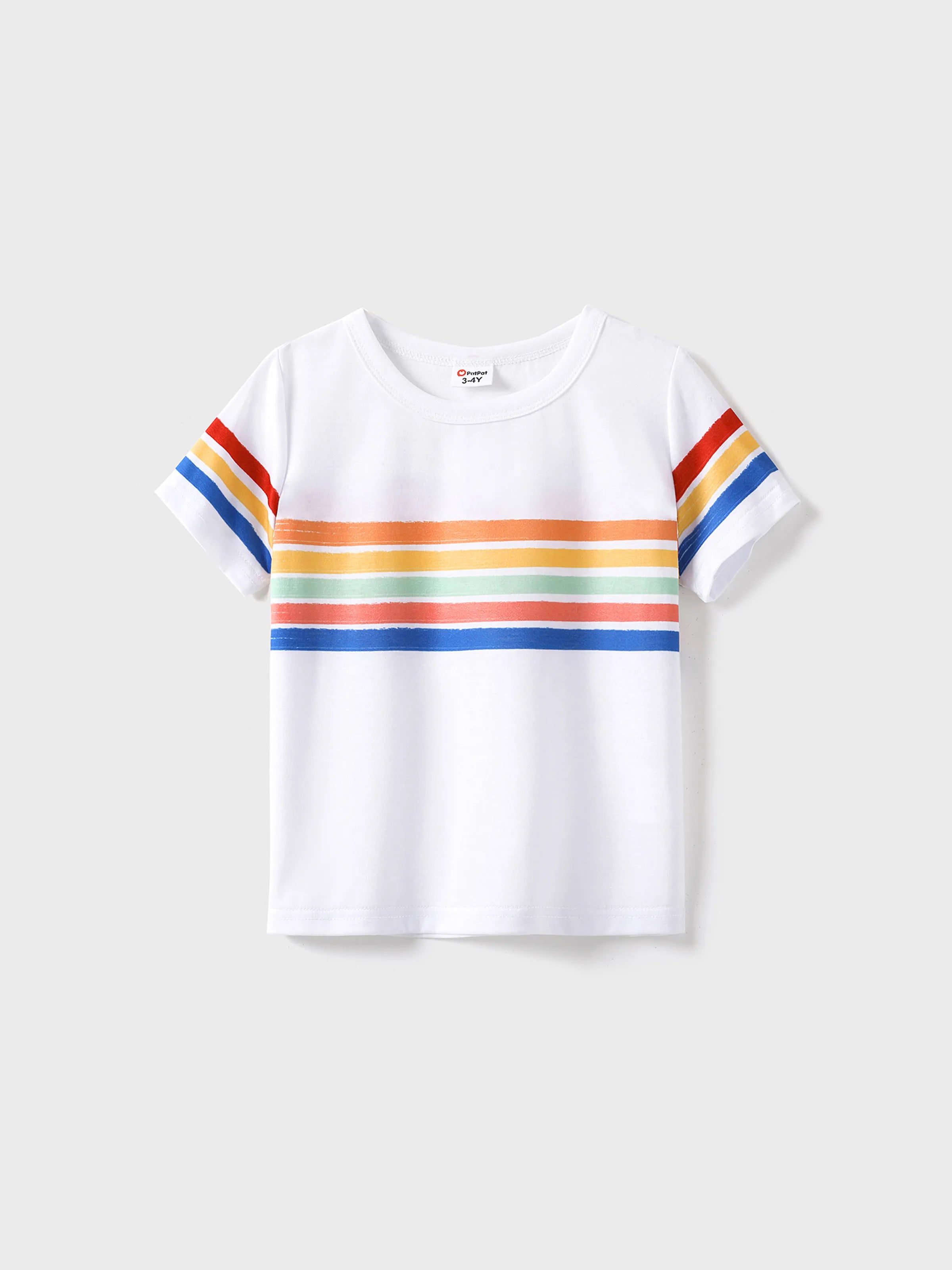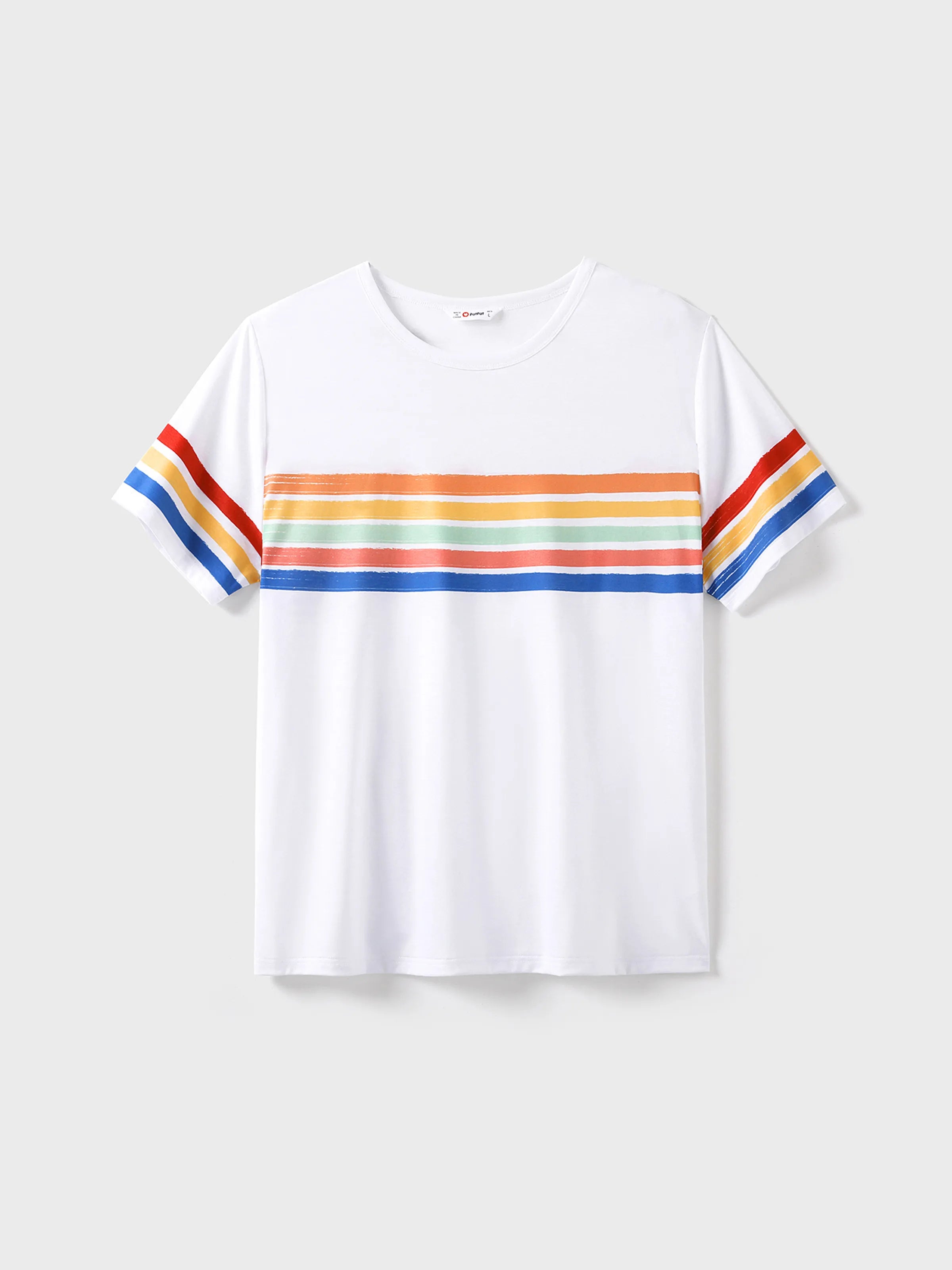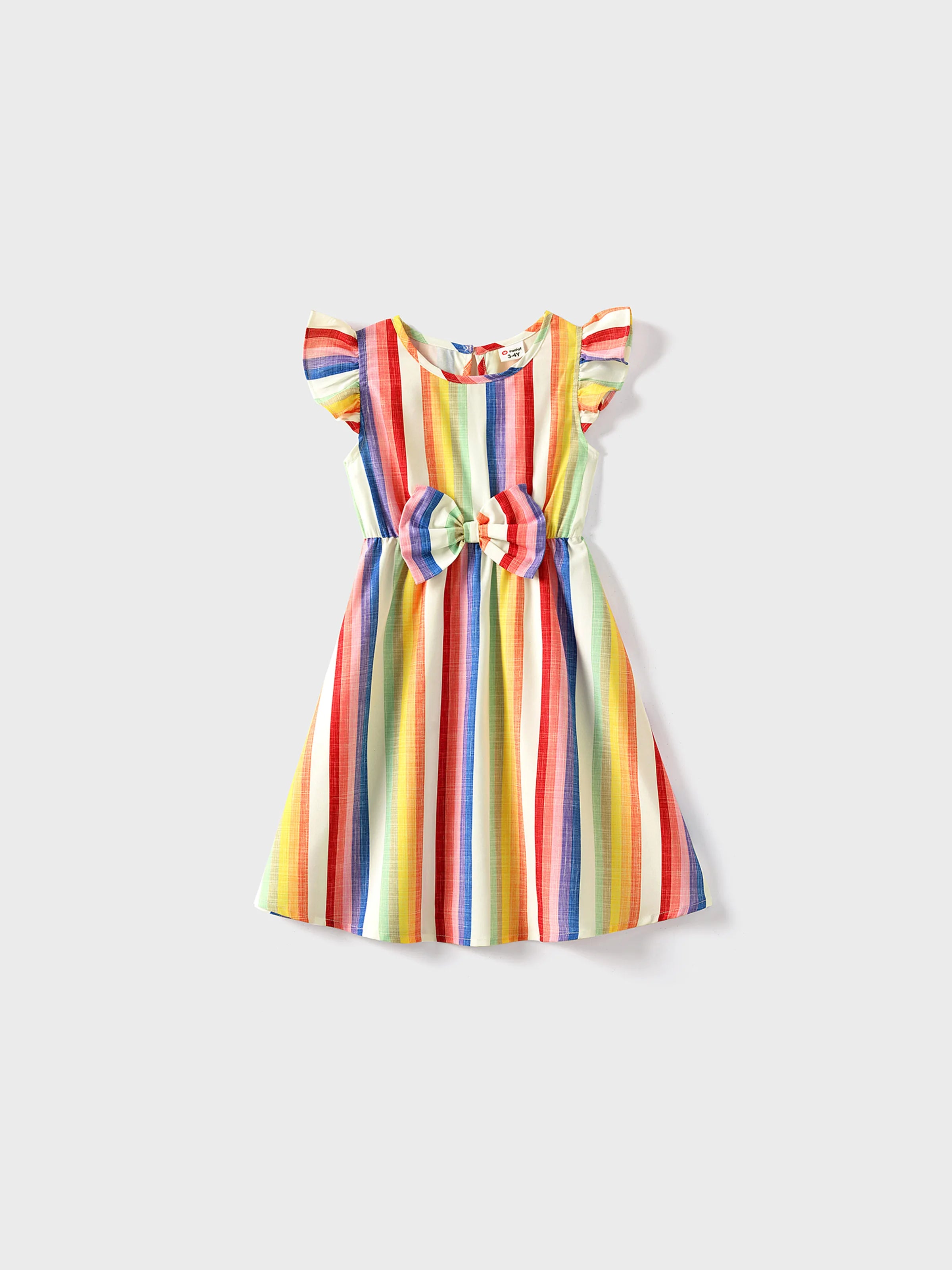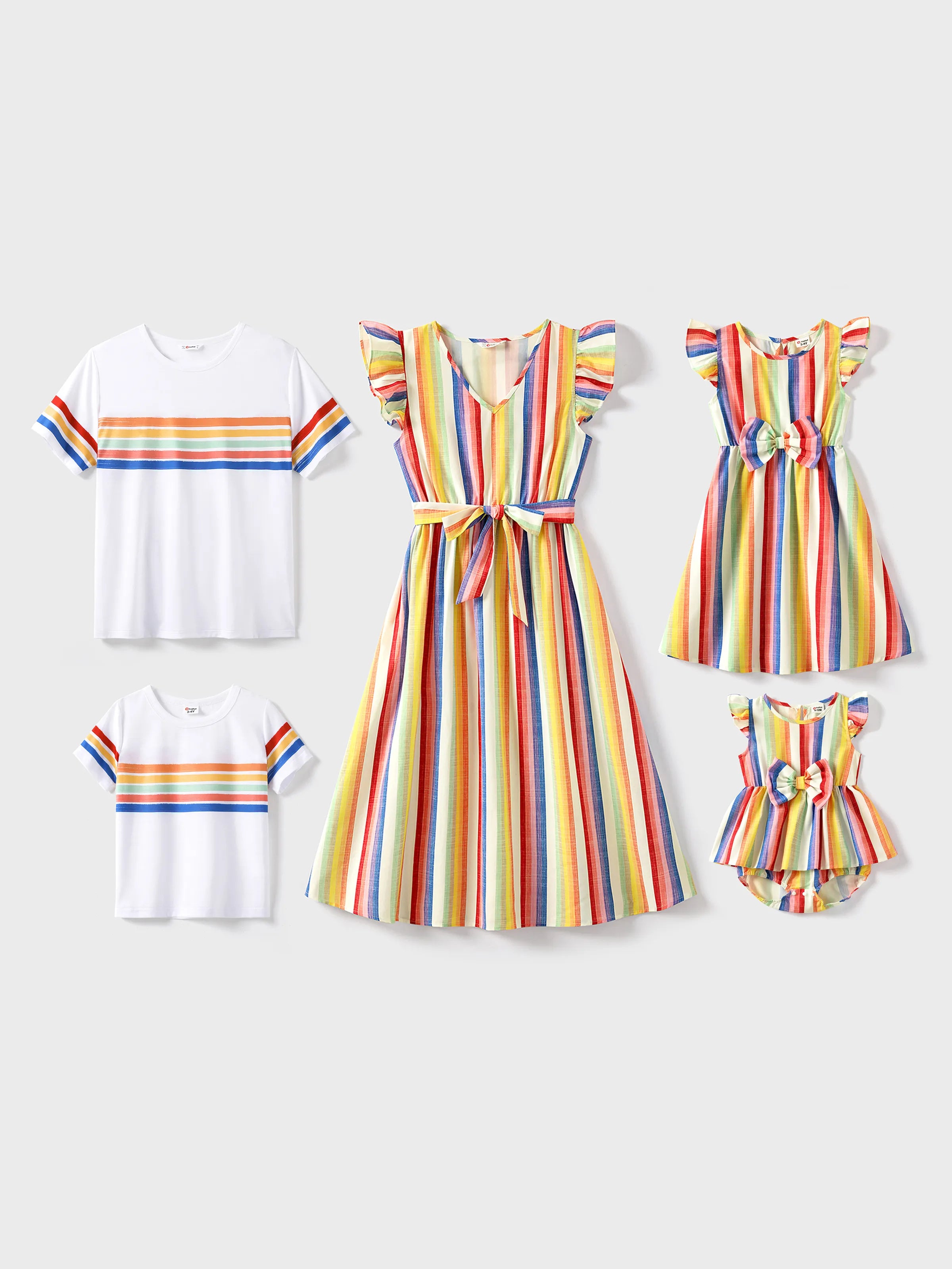Family Matching Colorful Striped V Neck Flutter-sleeve Dresses and Short-sleeve T-shirts Sets COLOREDSTRIPES