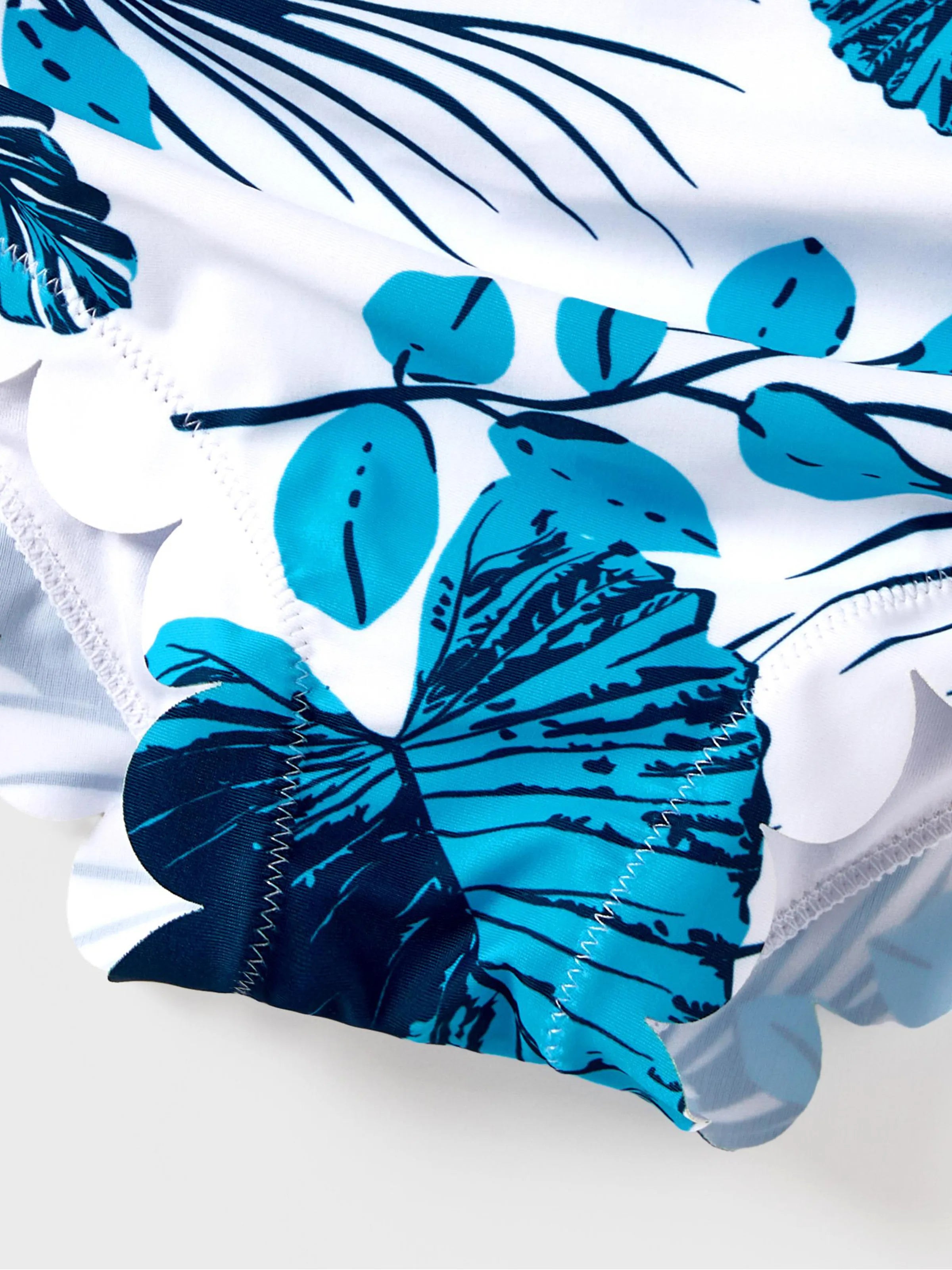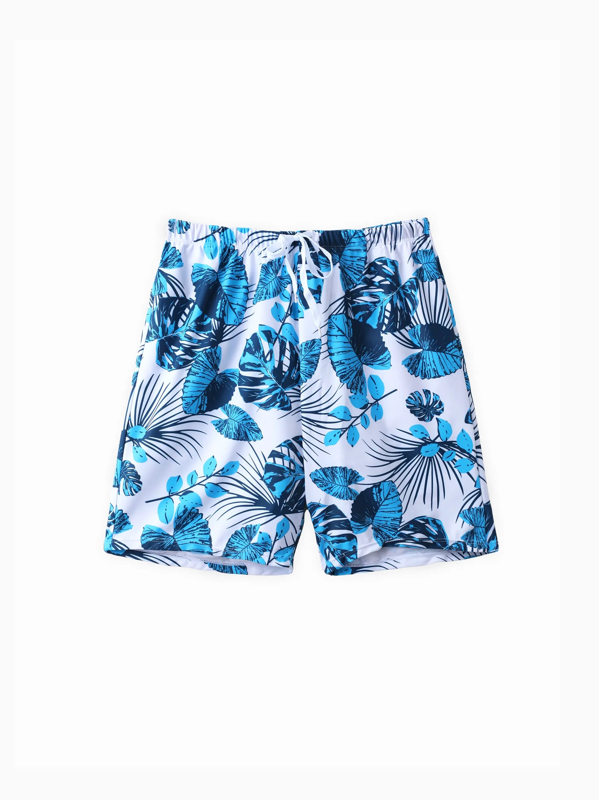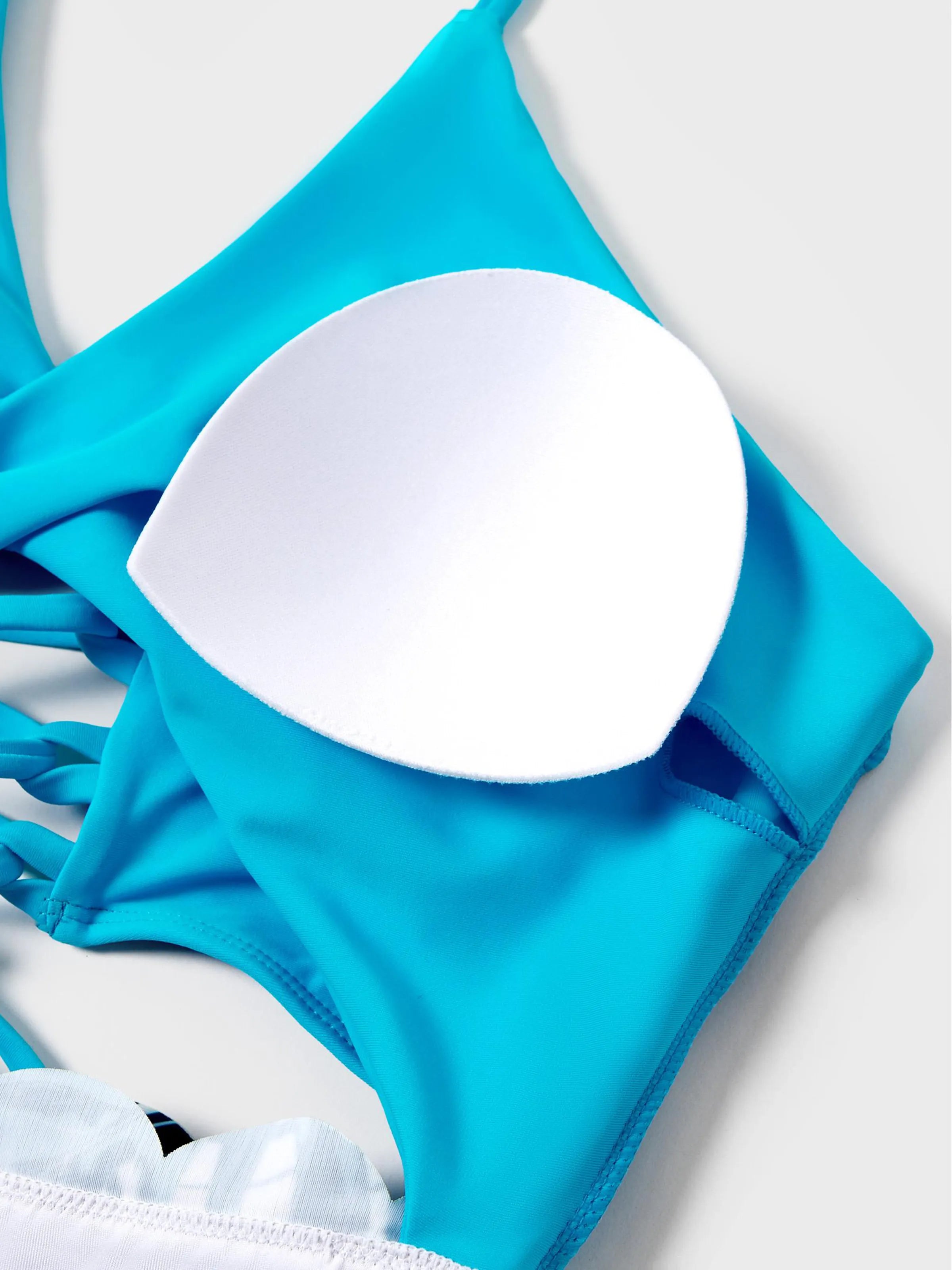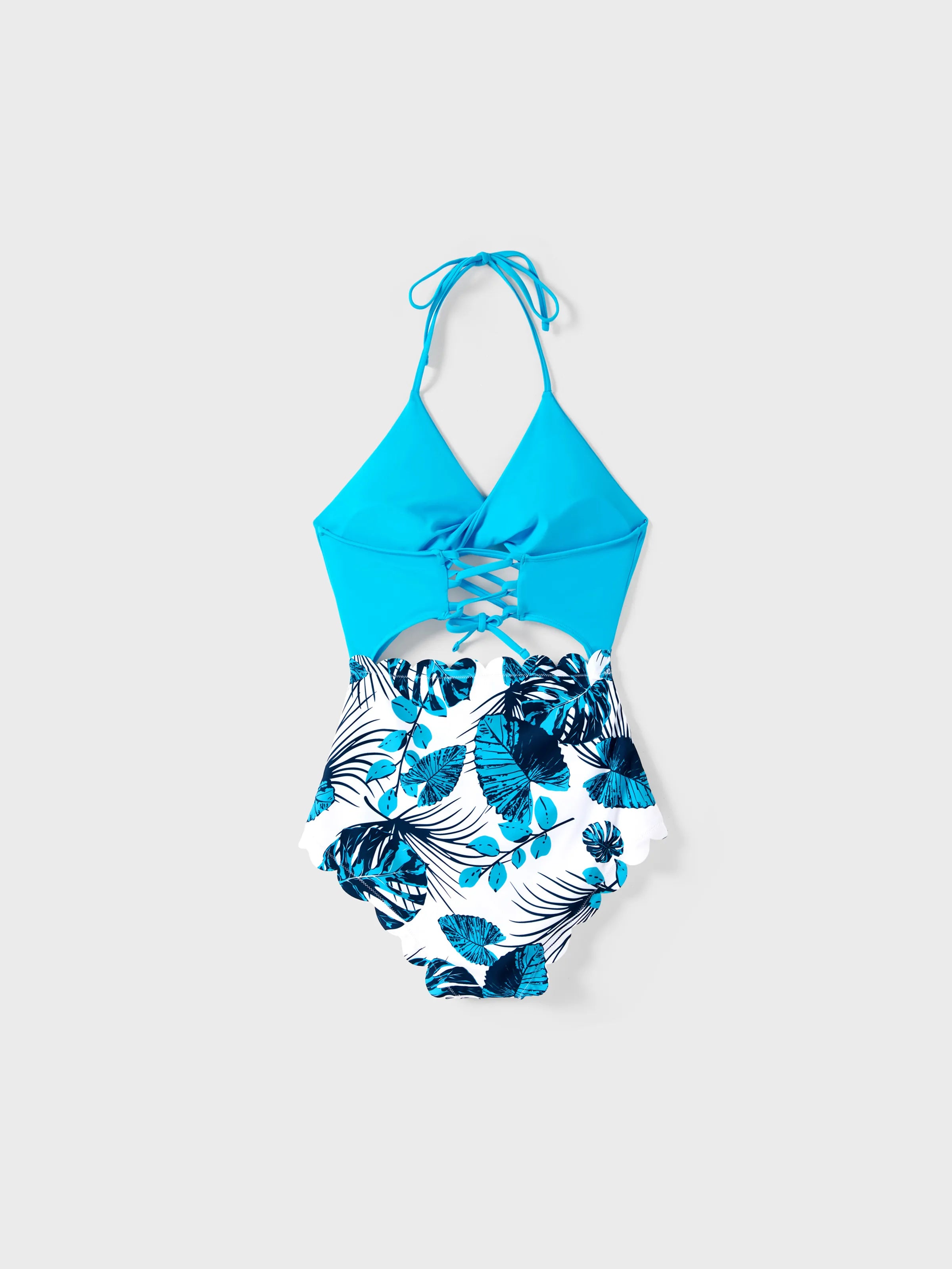 Family Matching Drawstring Swim Trunks or Cut Out Lace UP Back One-Piece Swimsuit BLUEWHITE