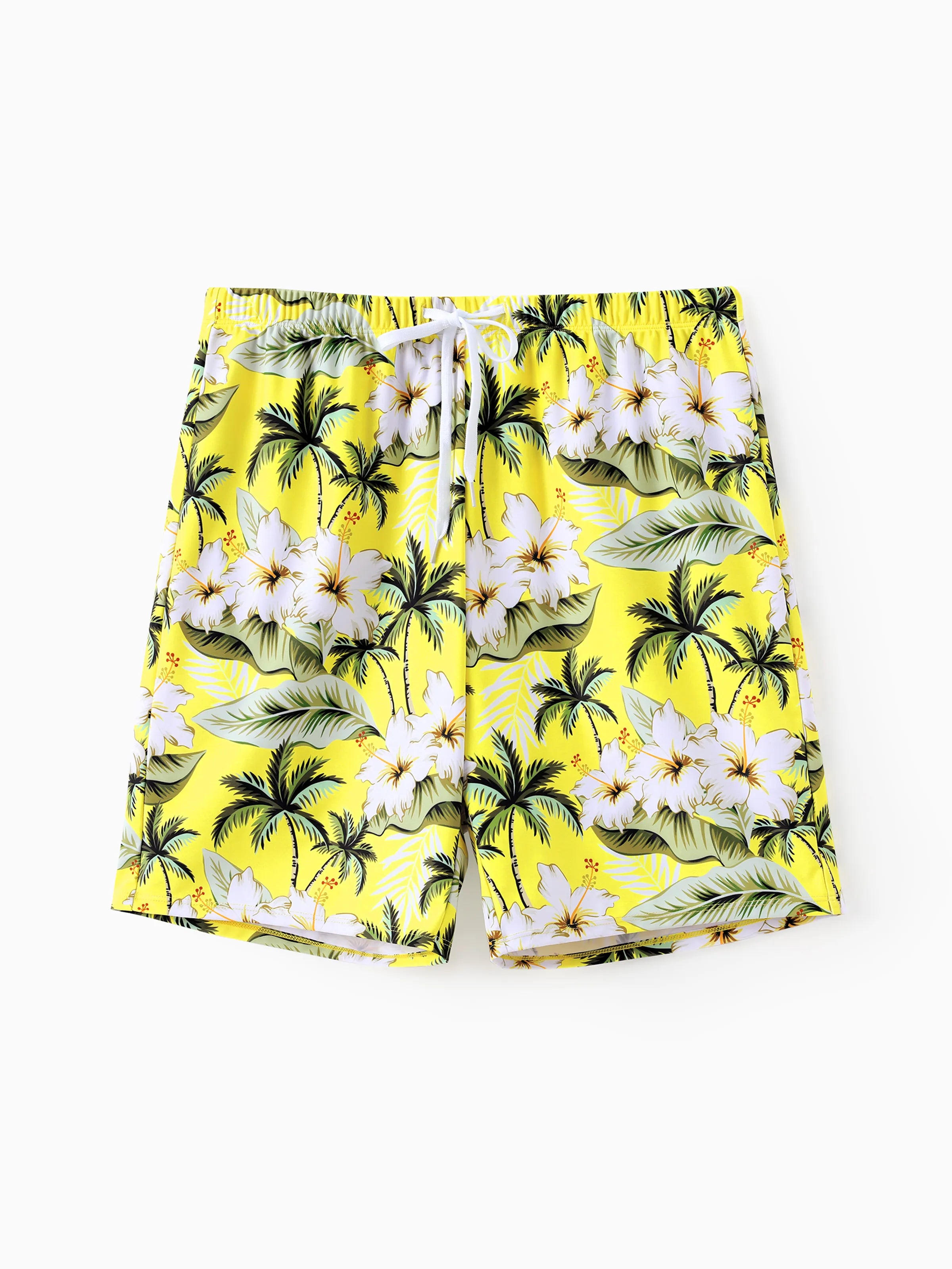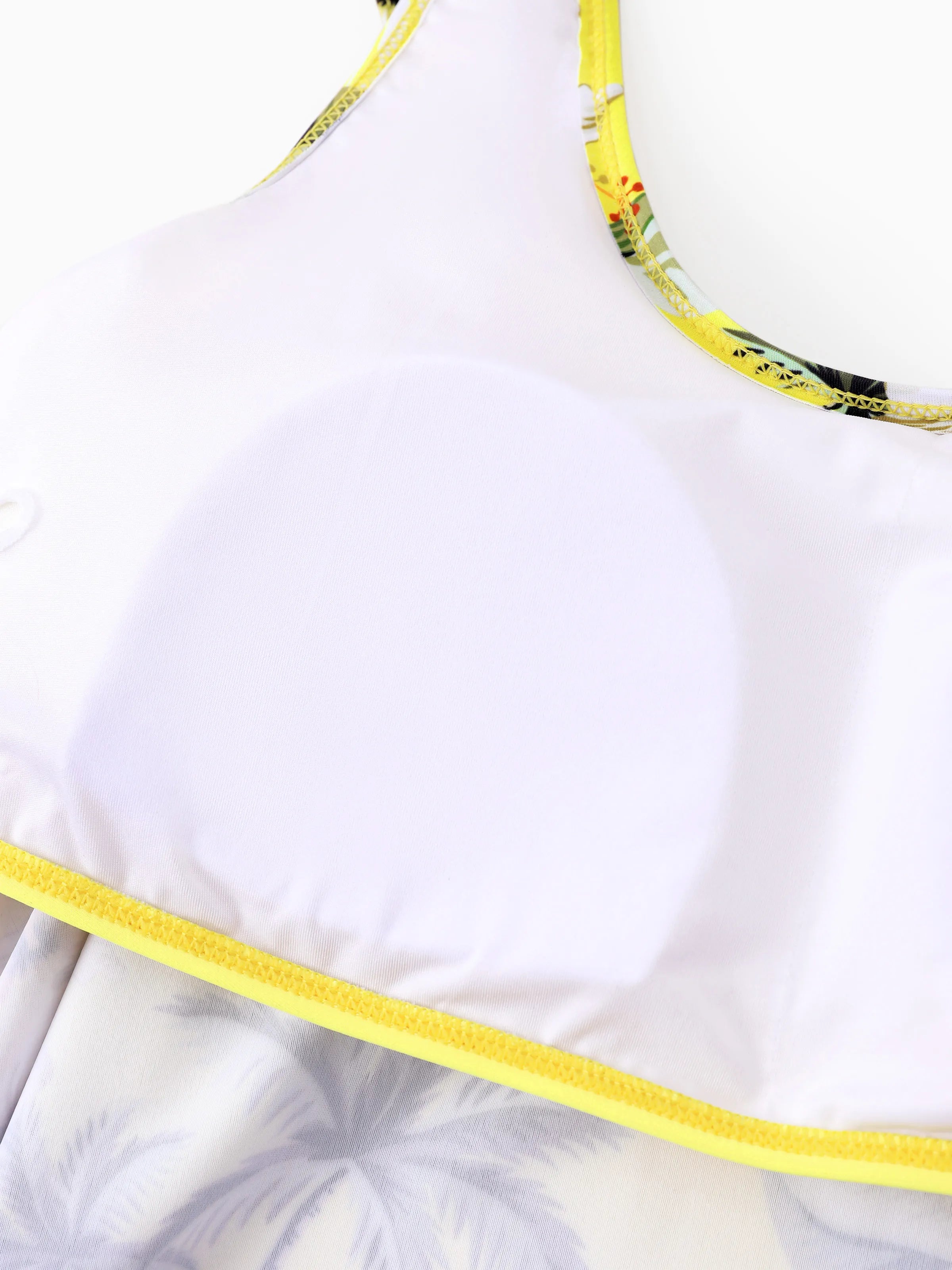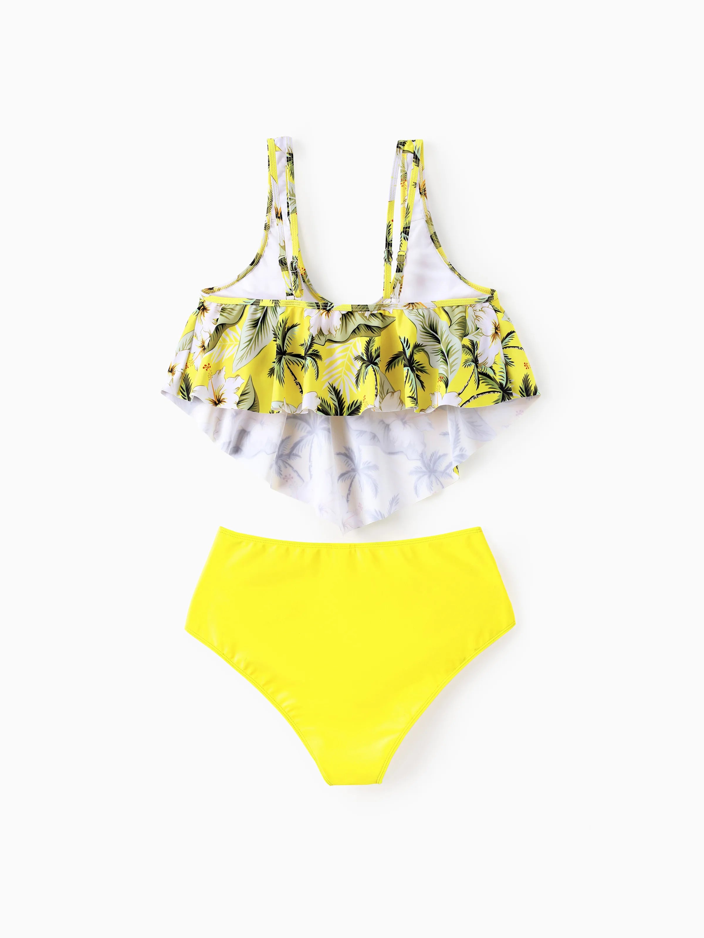 Family Matching Hawaiian Swimsuits Tropical Palm & Plumeria Print Yellow Swim Trunks or Ruffle Flounce Bikini Swimwear Set Yellow