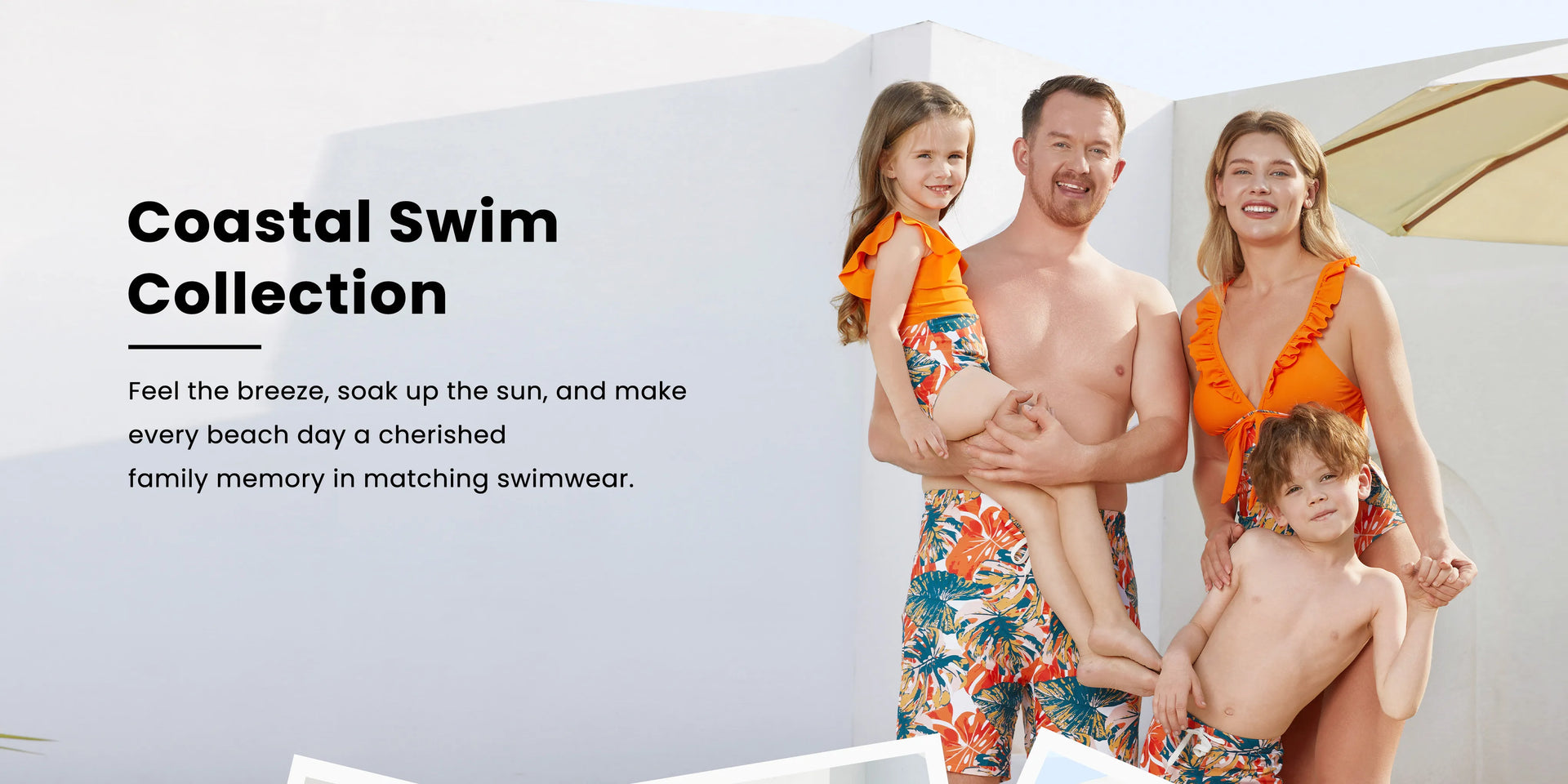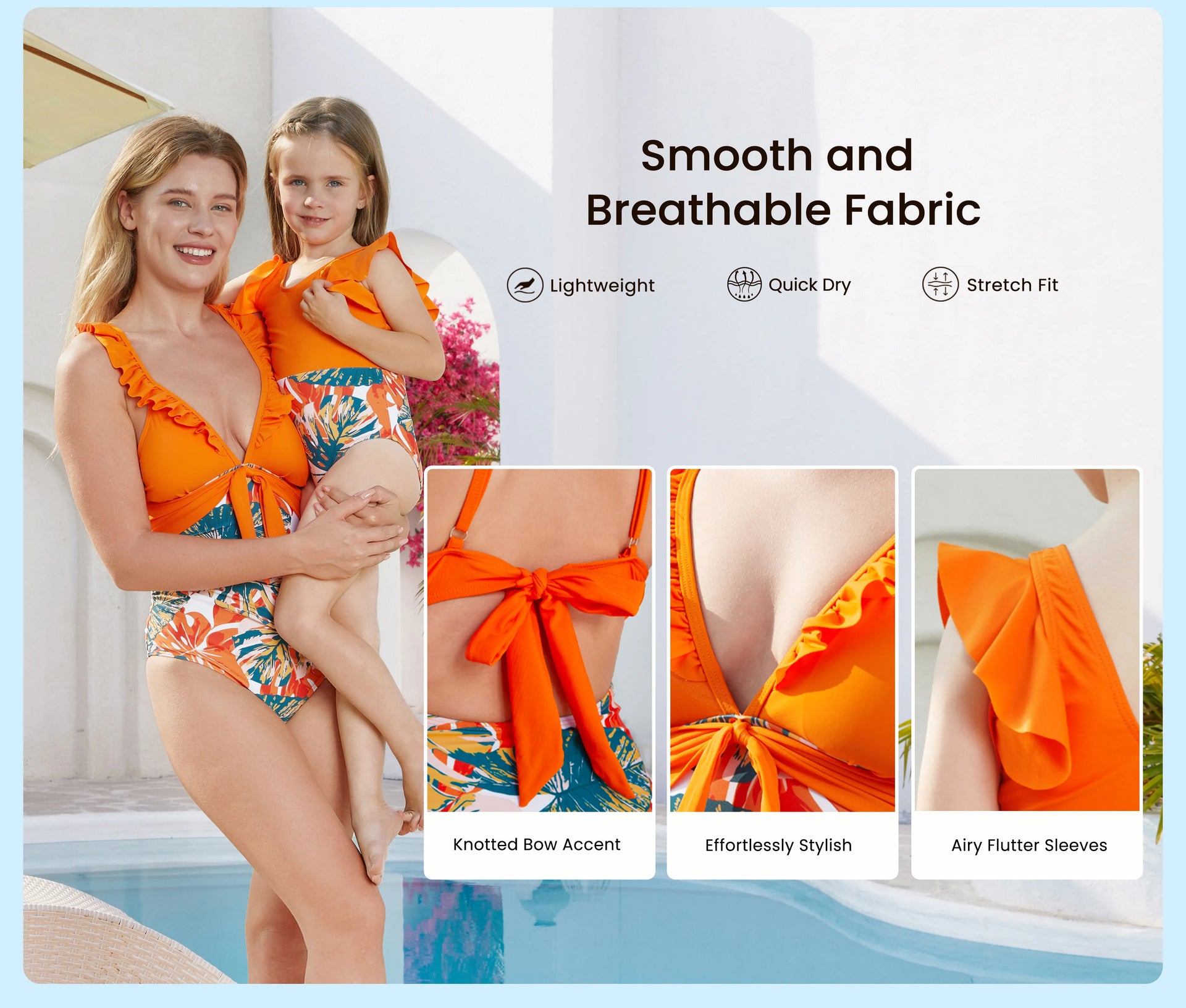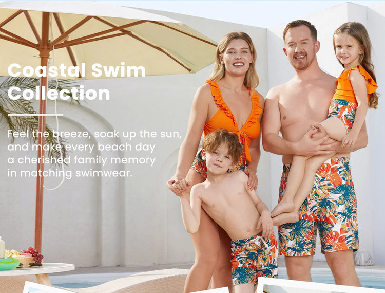 Family Matching Orange and All Over Tropical Plant Print Splicing Ruffle One-Piece Swimsuit and Swim Trunks Shorts Orange color