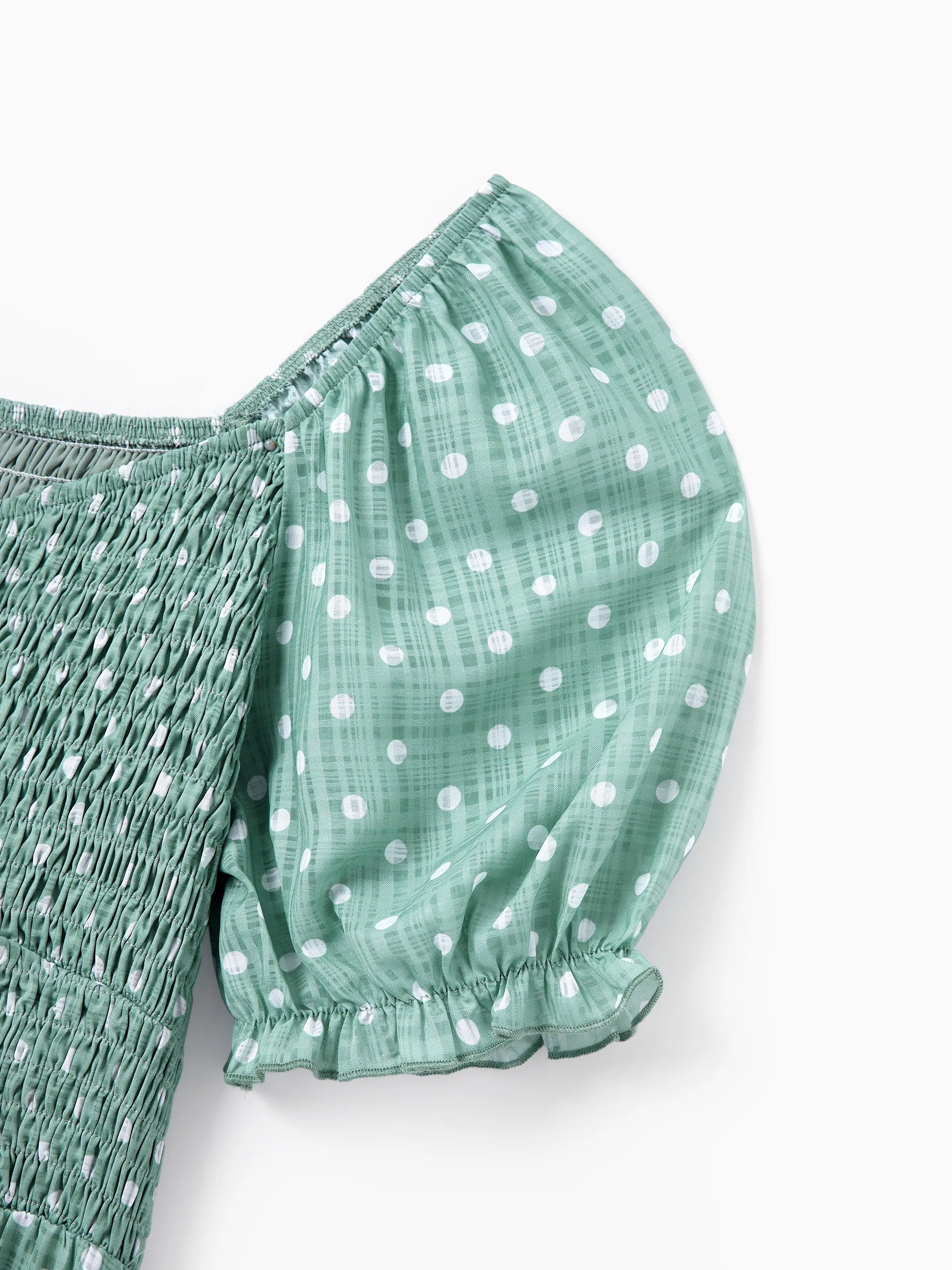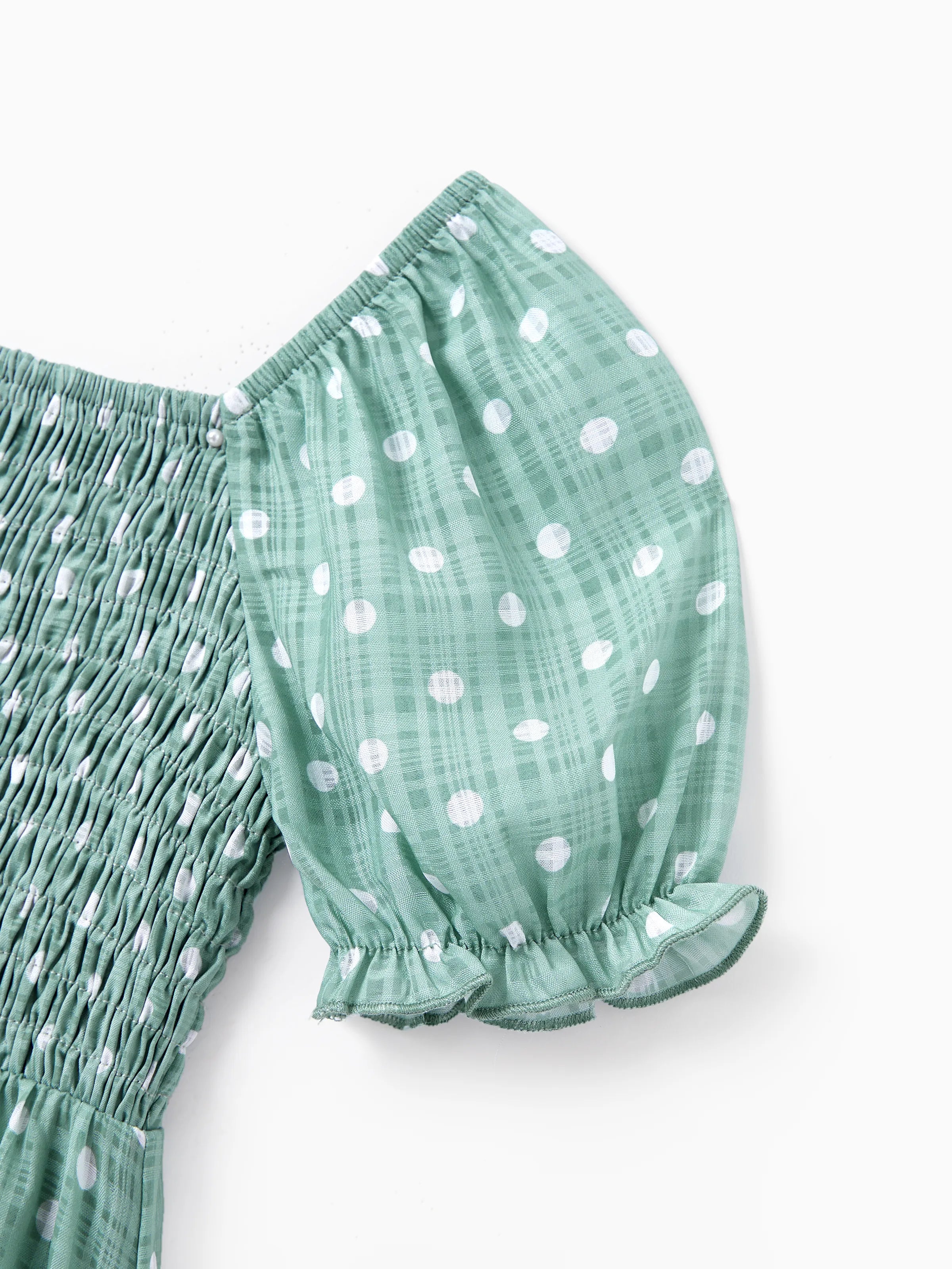 The mom and daughter dresses feature a playful polka dot pattern, complete with puff sleeves and a flattering smocked bodice. The feminine design, paired with the soft green hue, creates a fresh, spring-ready look for both casual and special occasions.