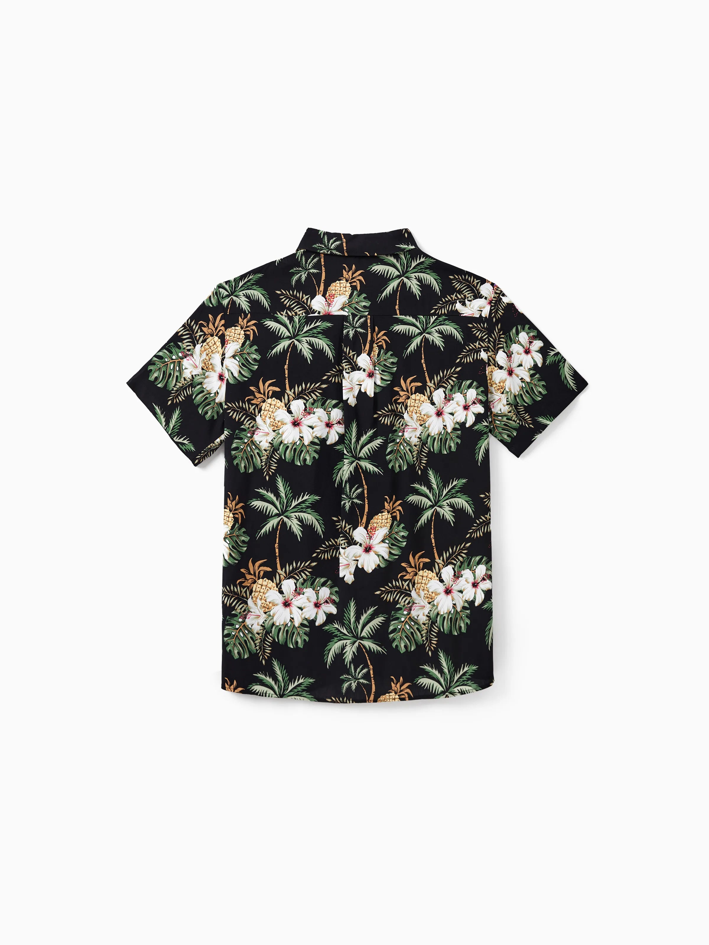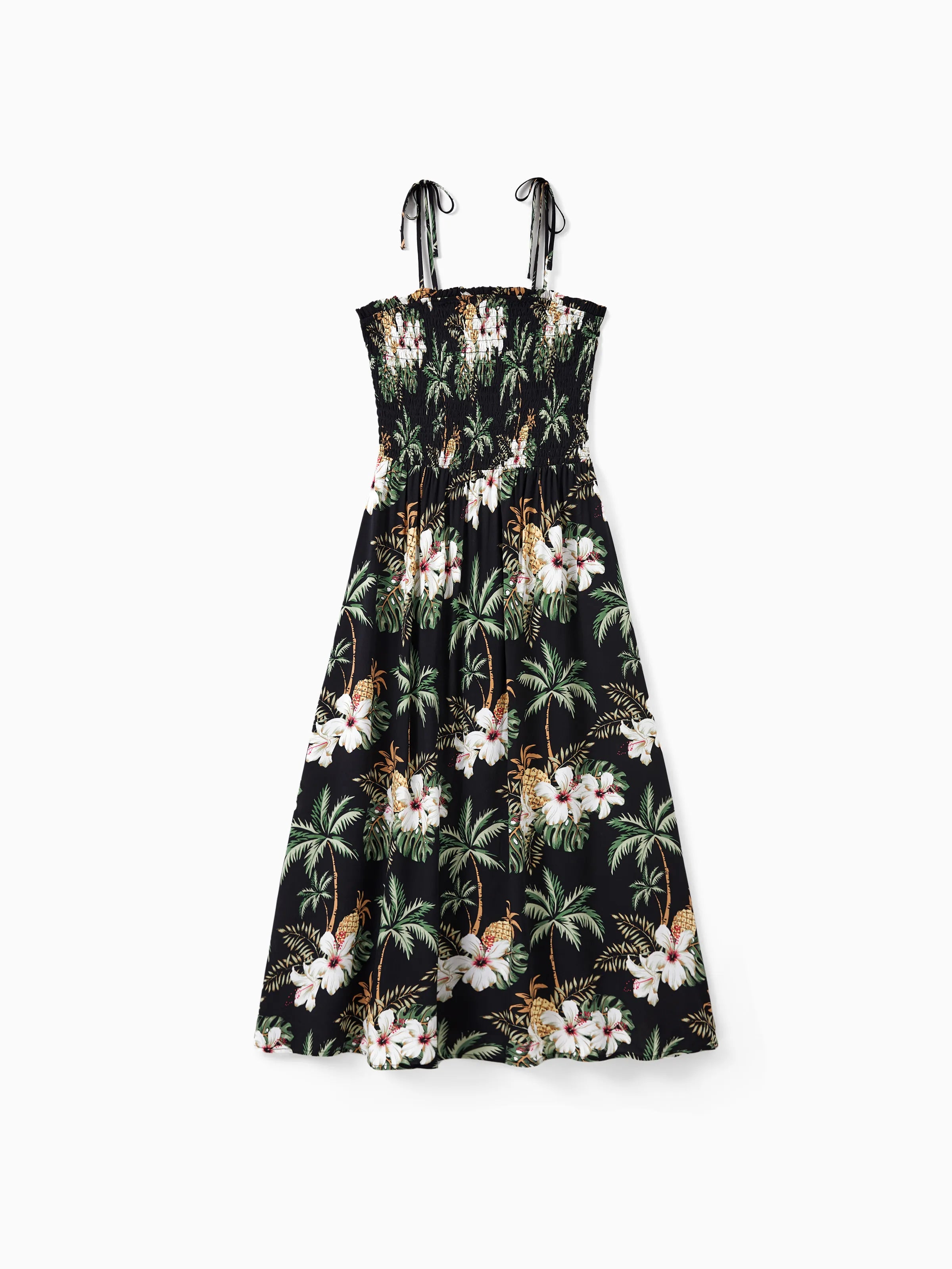 Family Matching Tropical Flora Print Short-sleeve Shirt or Smocking Strap Dress Set Black