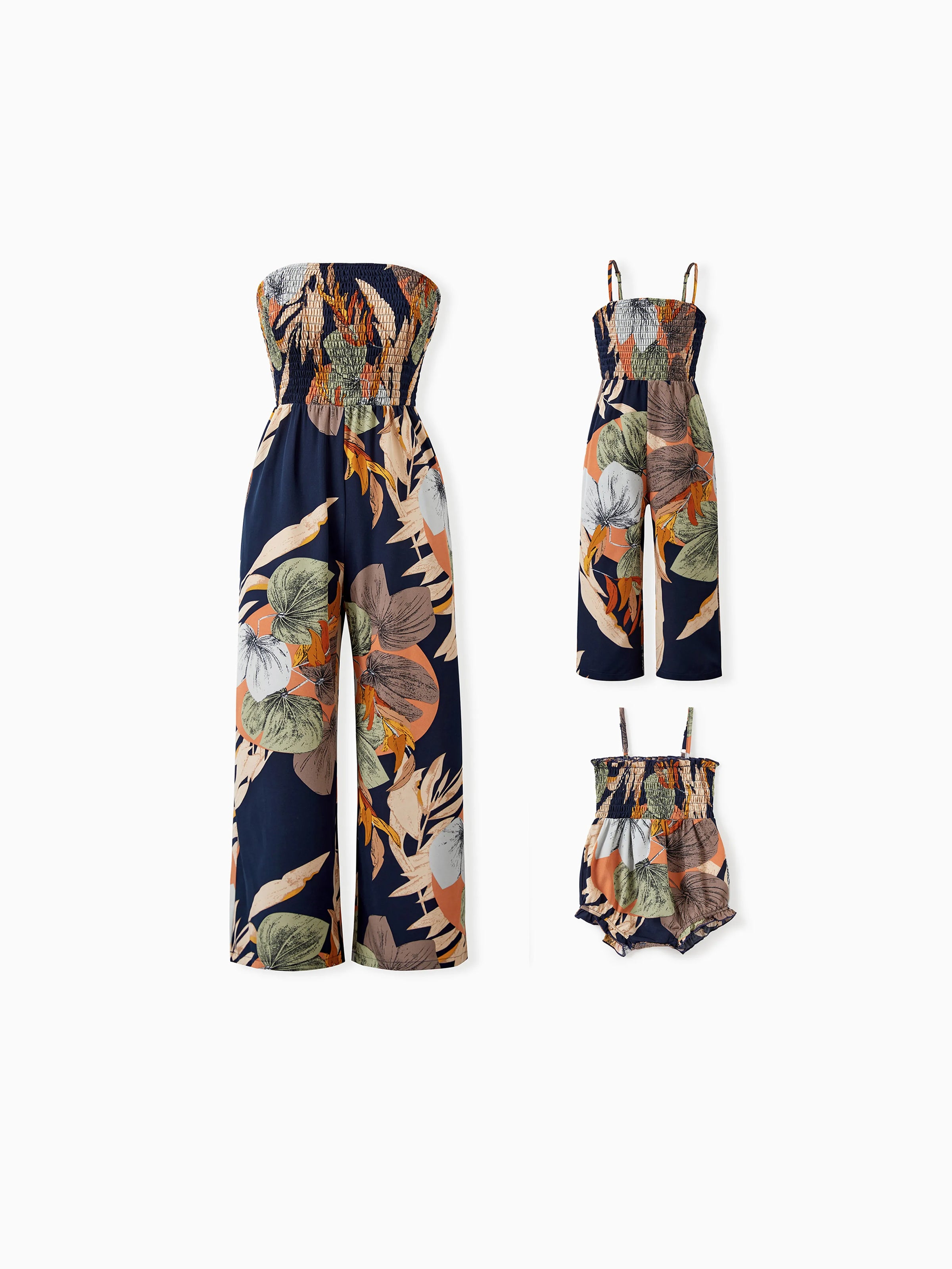 Family Matching Tropical Floral Print Smocked Top Strap Wide-Leg Jumpsuits for Mommy and Me Deep Blue