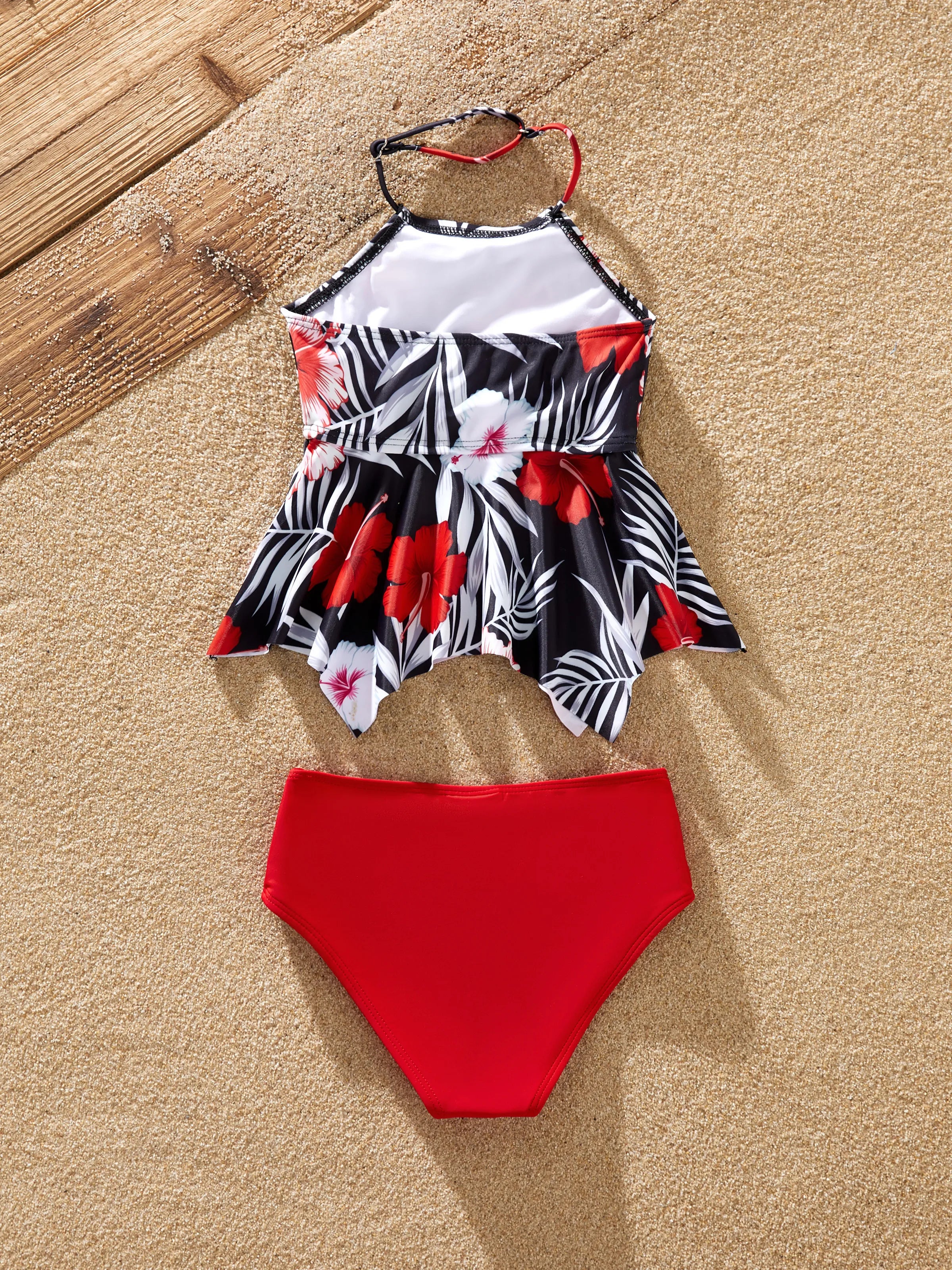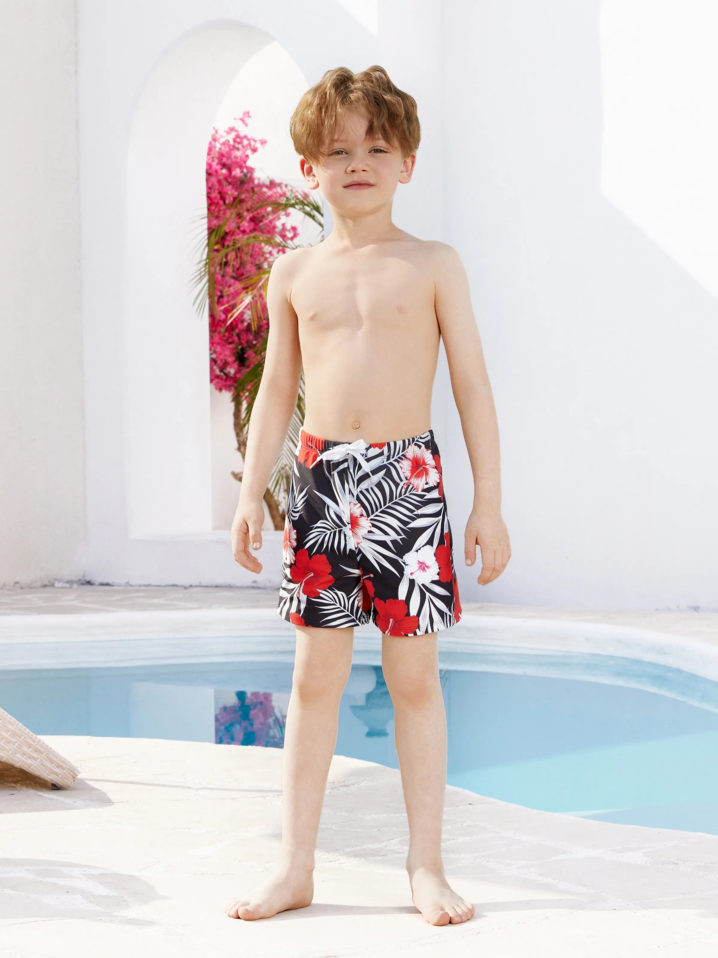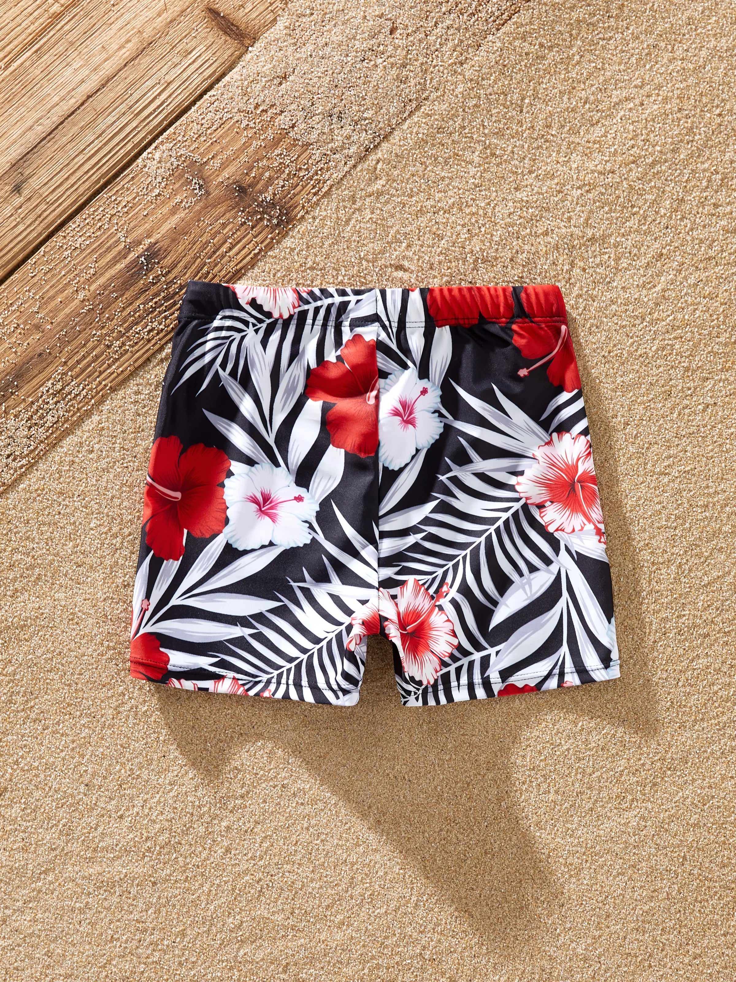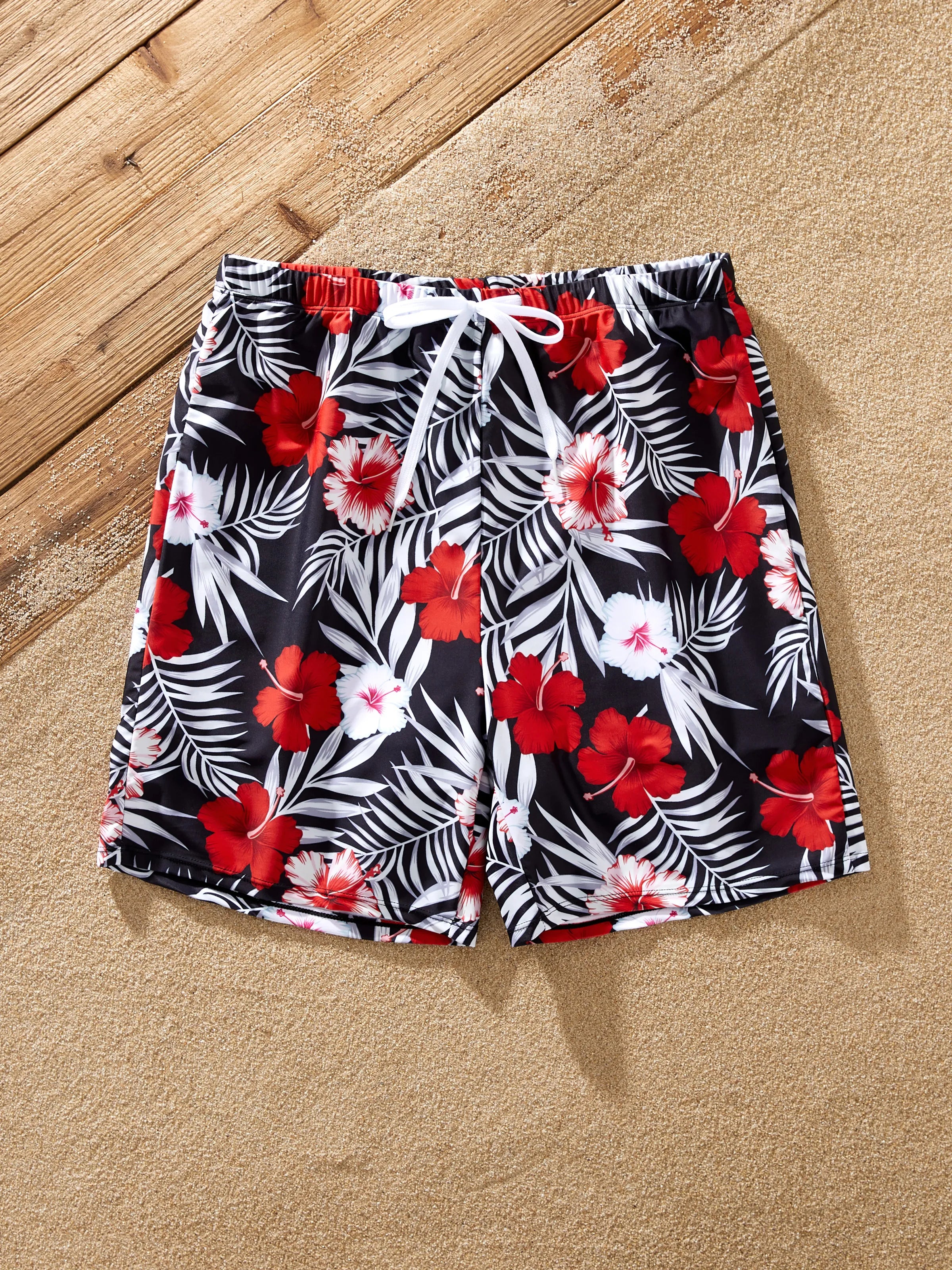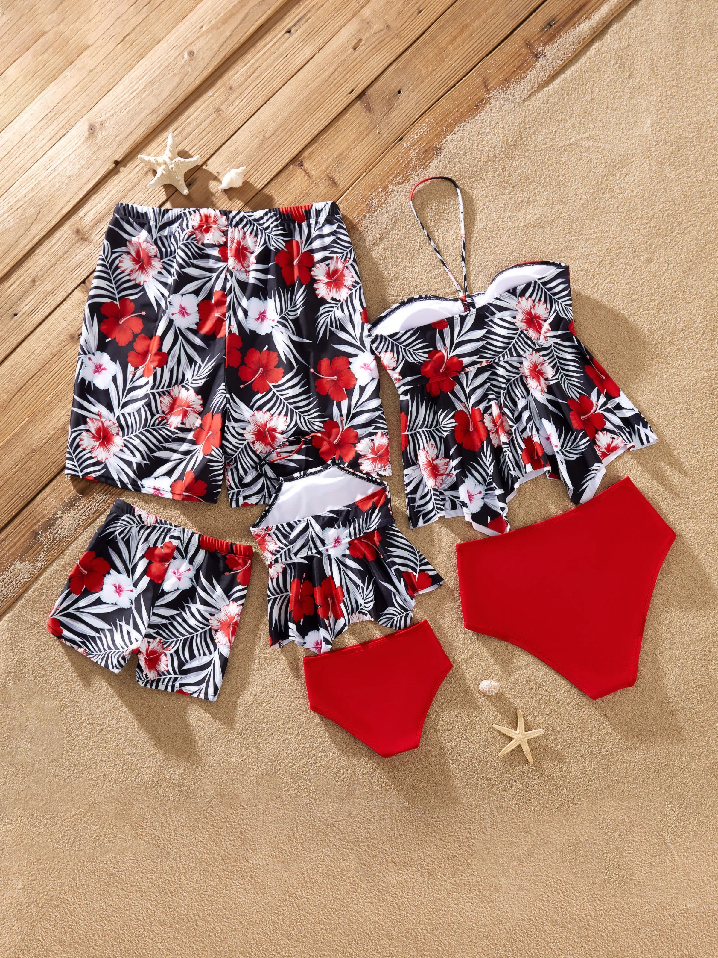 Family Matching Tropical Floral Swim Trunk or 2 Pieces Halter Swimsuit Black