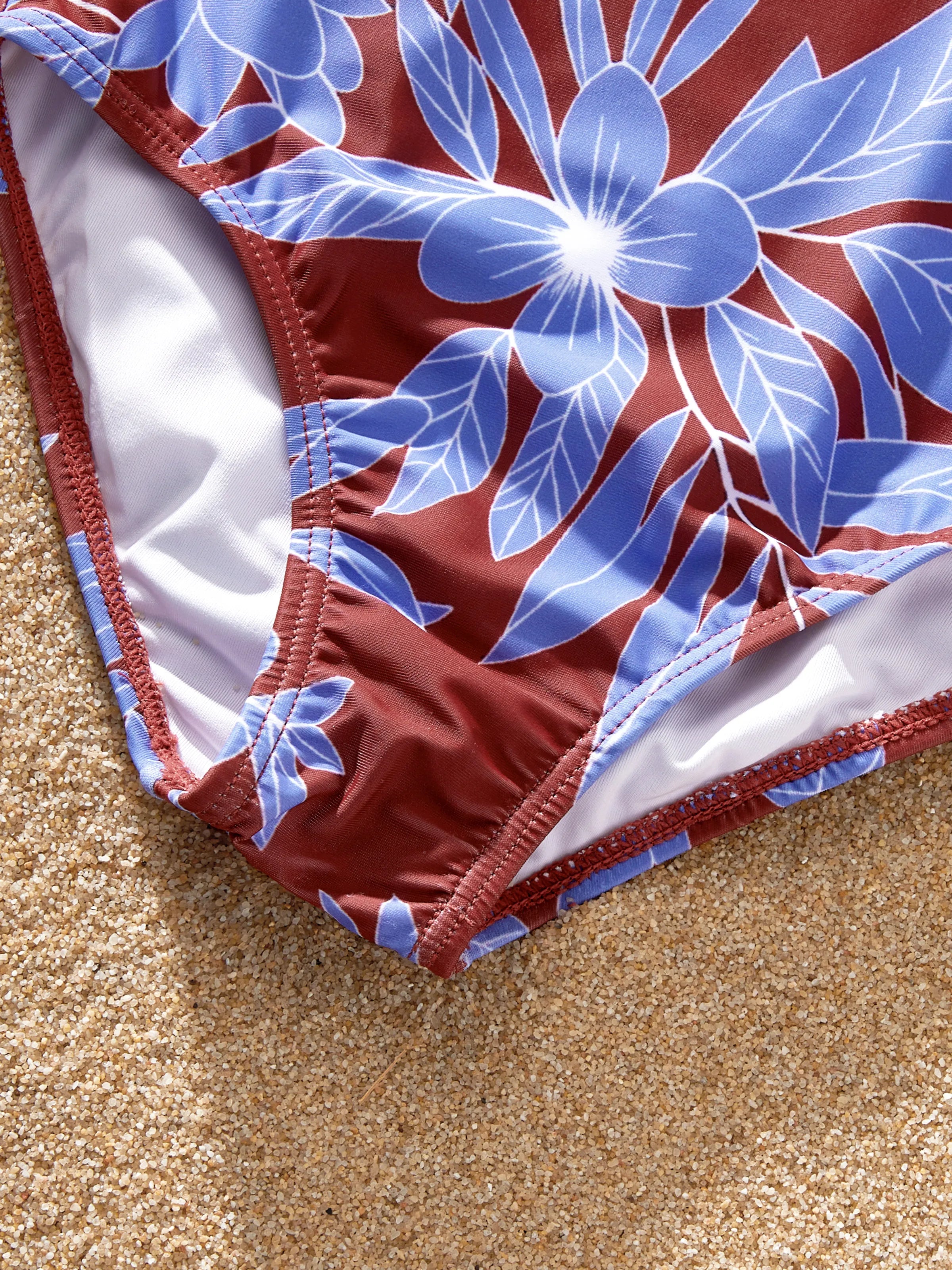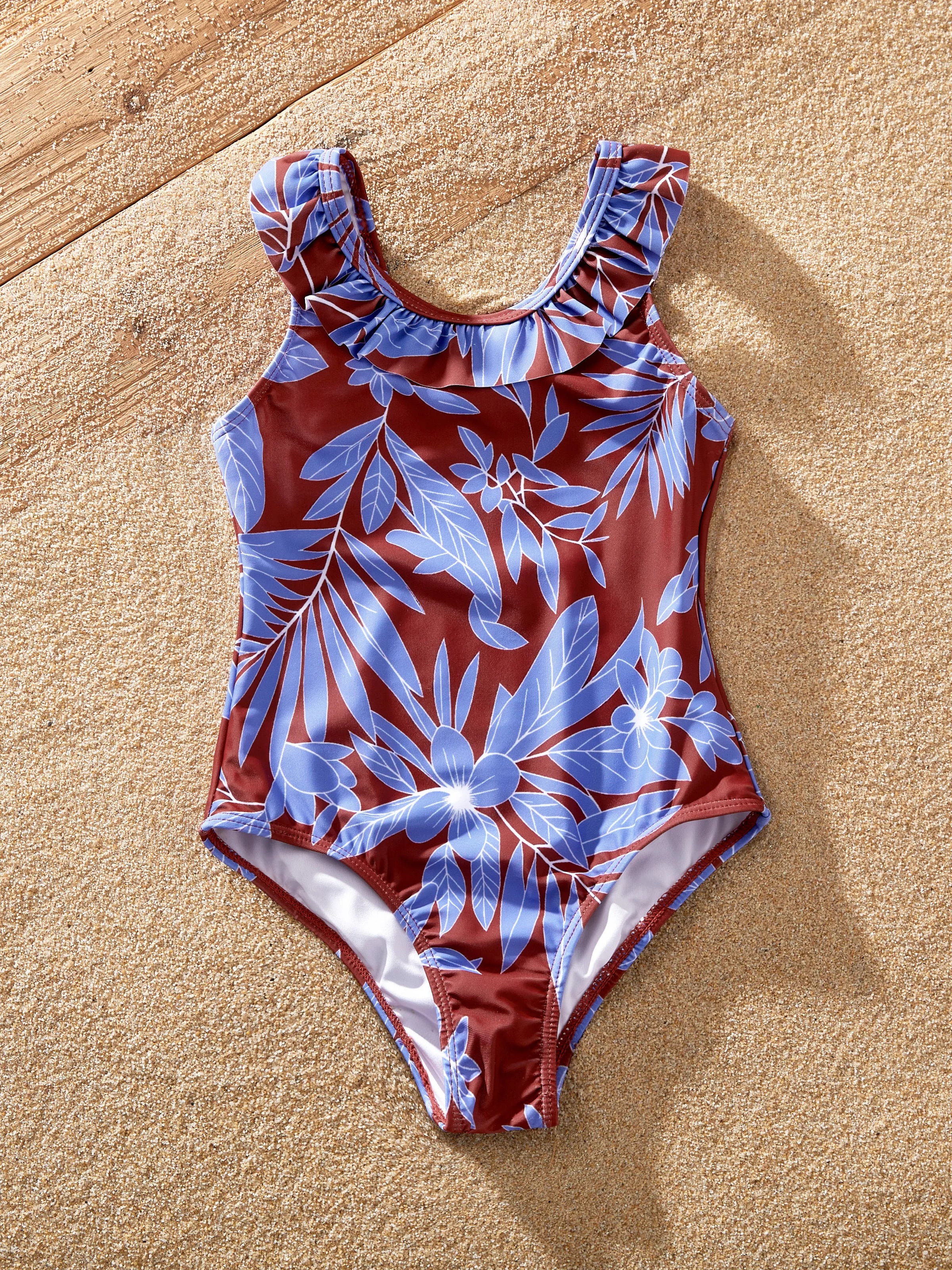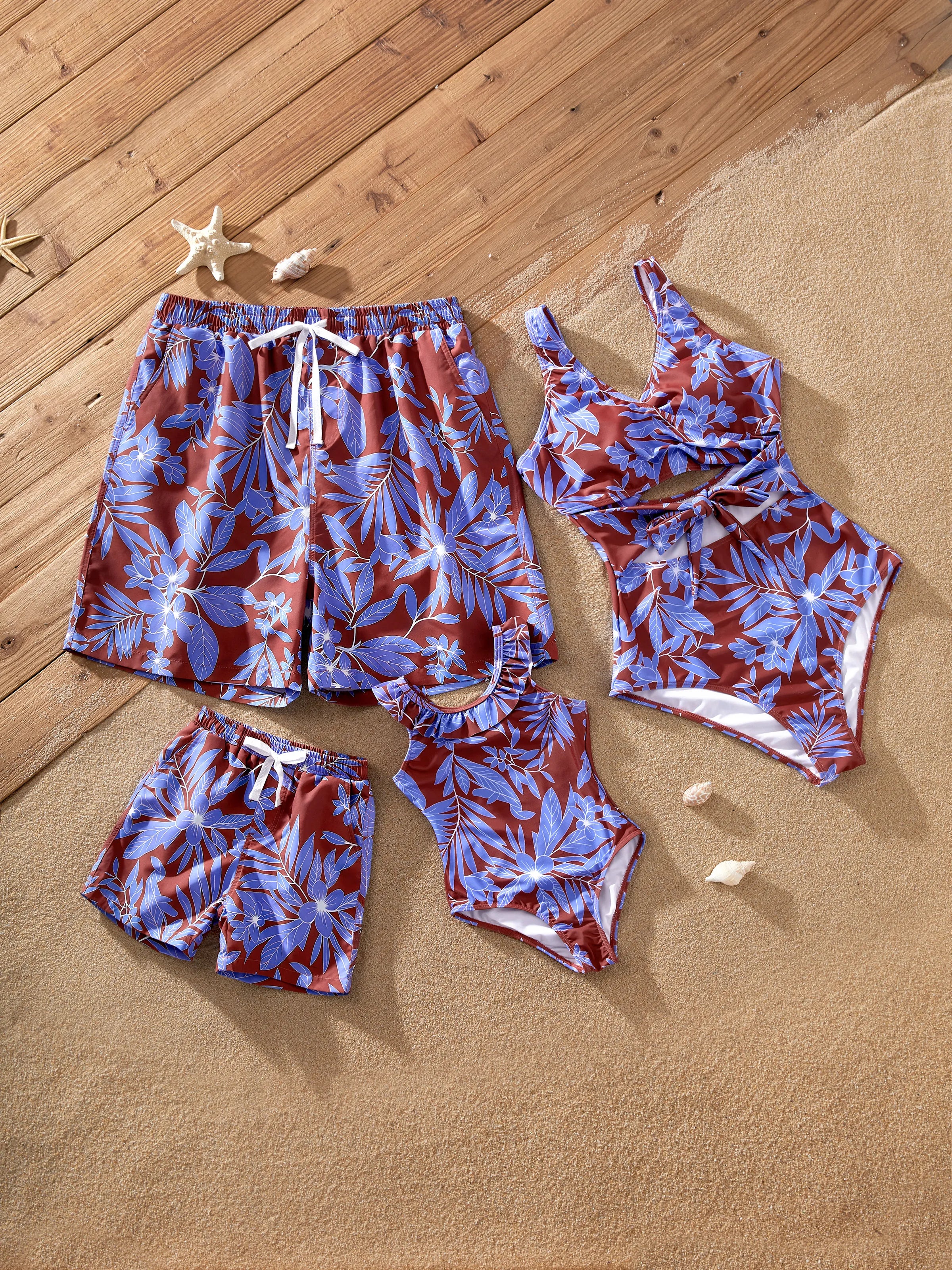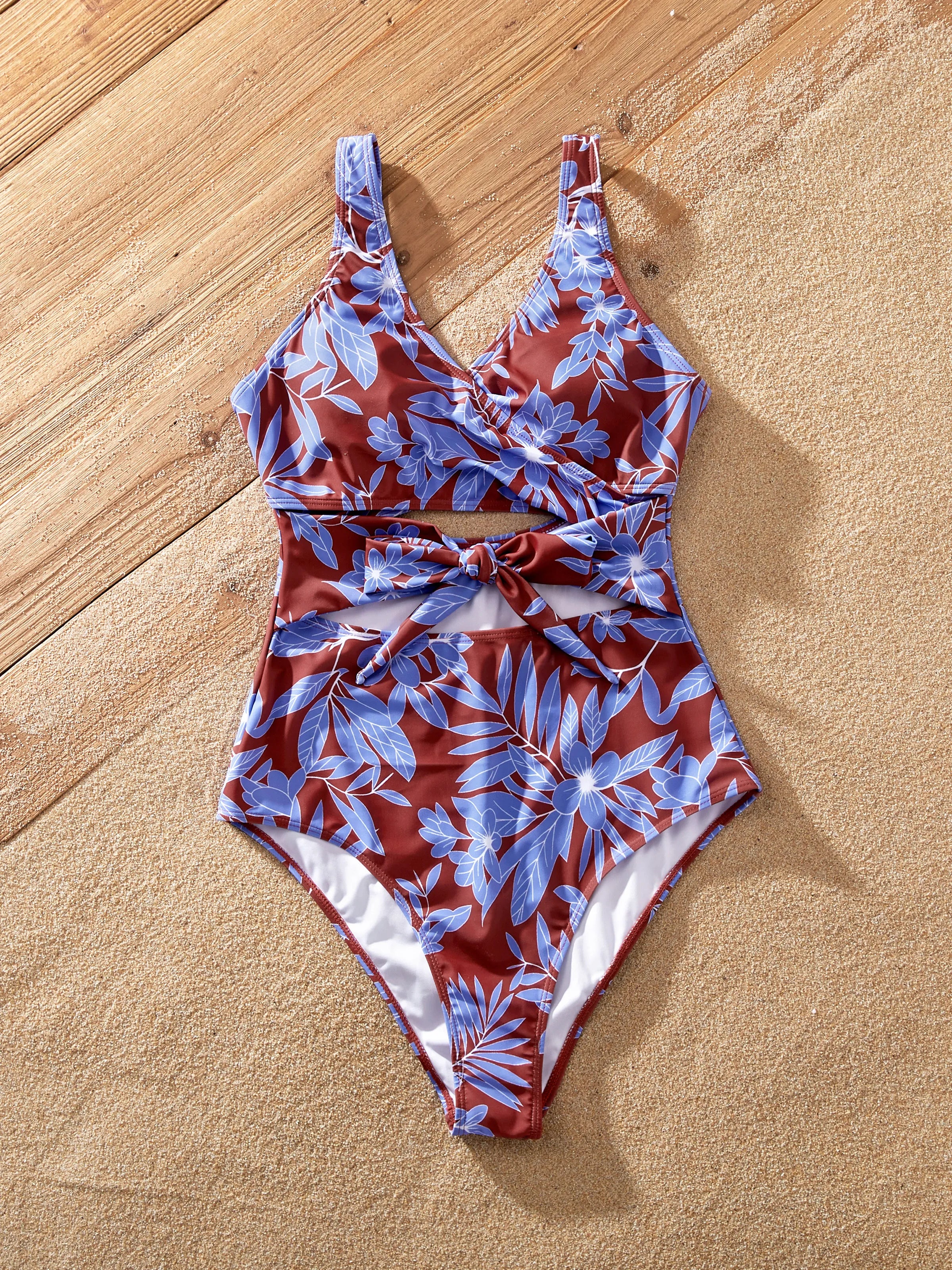 Family Matching Tropical Leaf Print Swimsuits Cutout One-Piece & Swim Trunks Set Blue