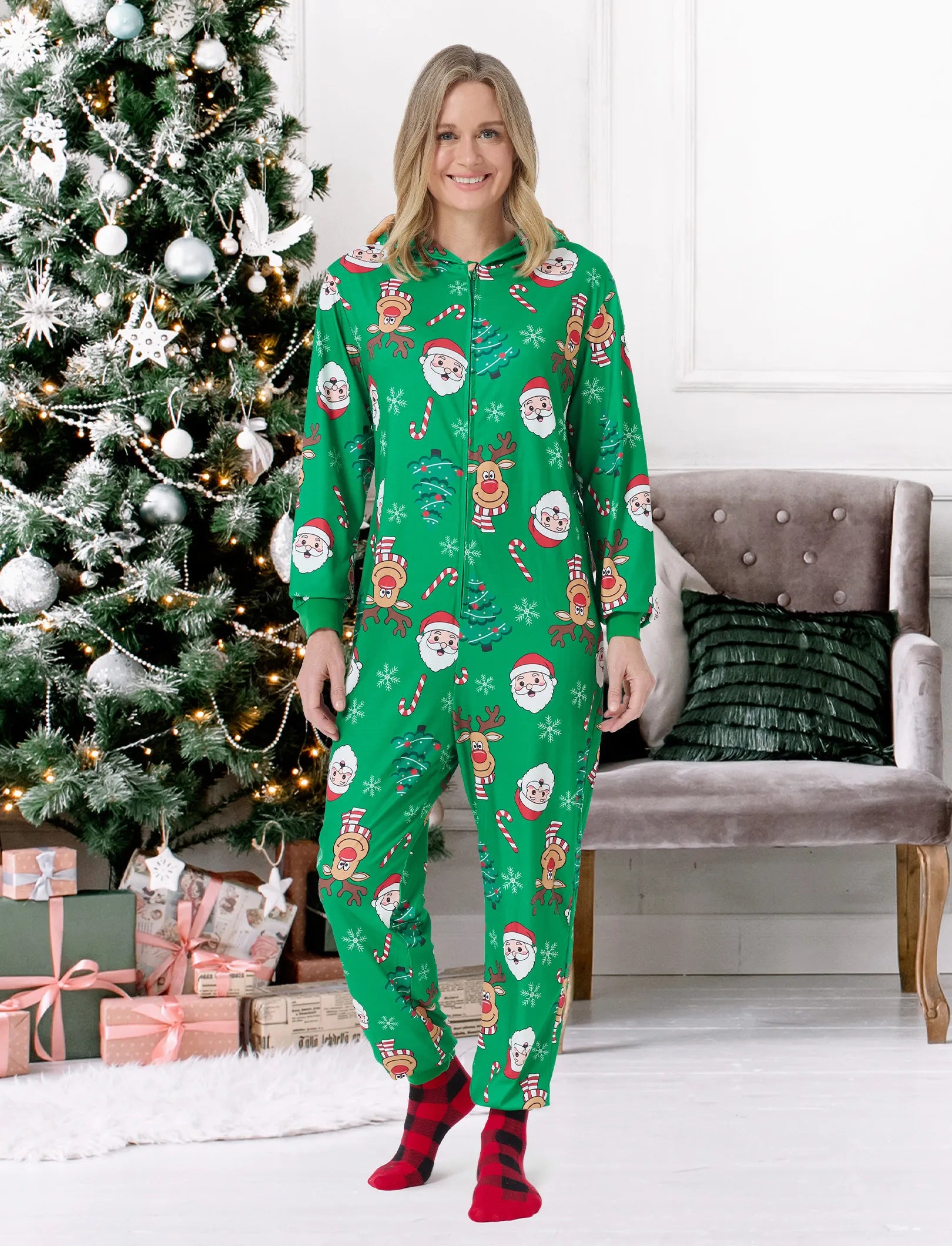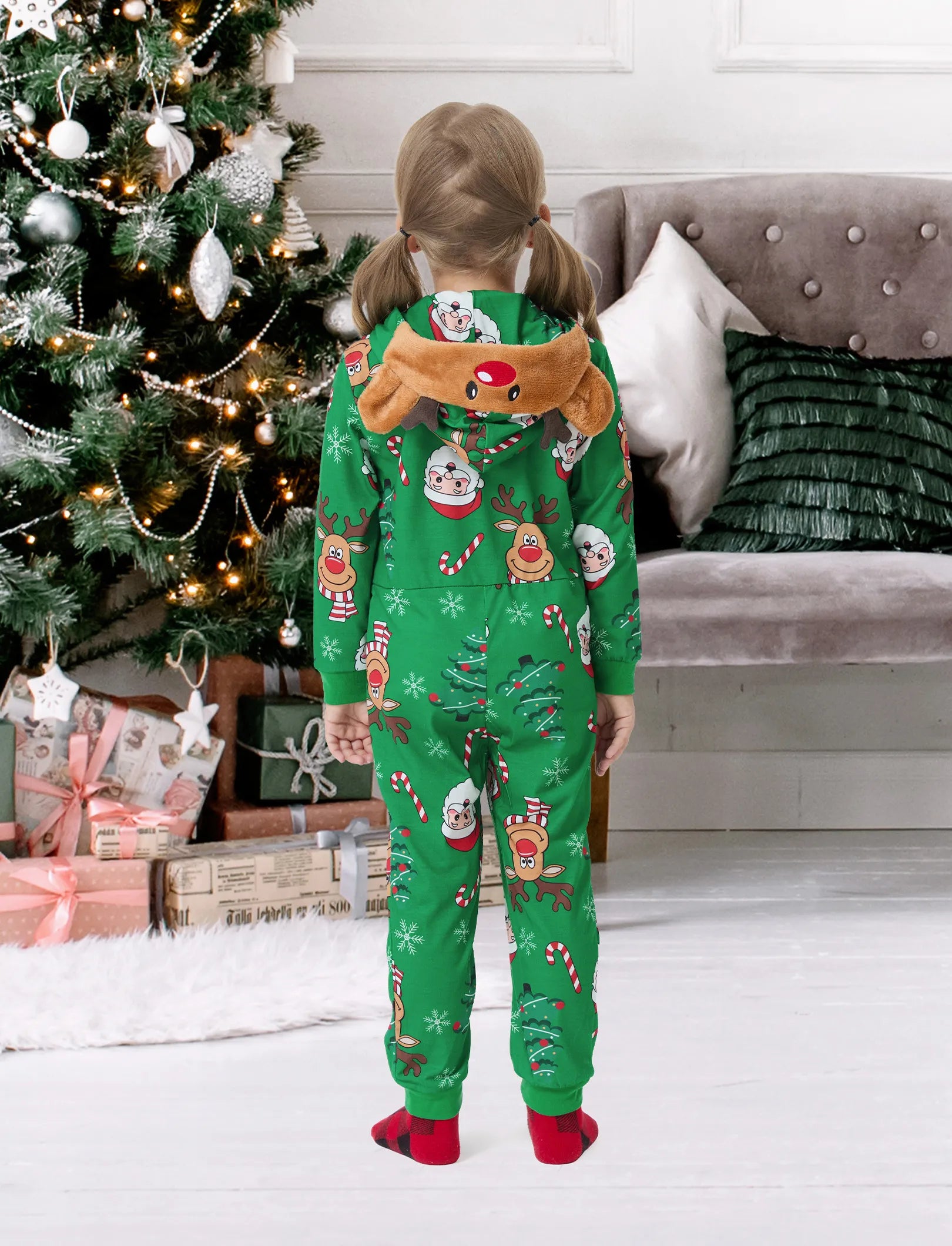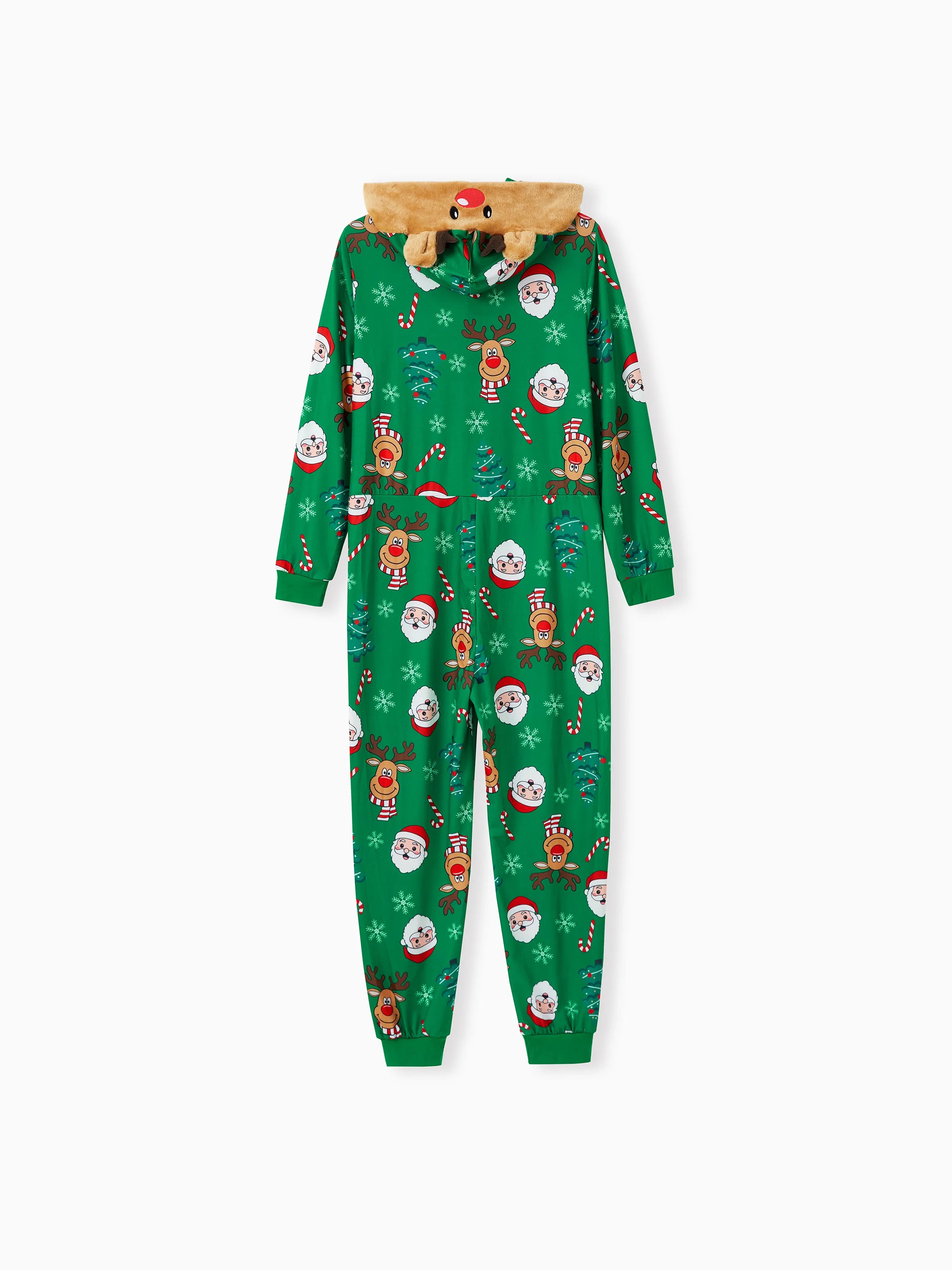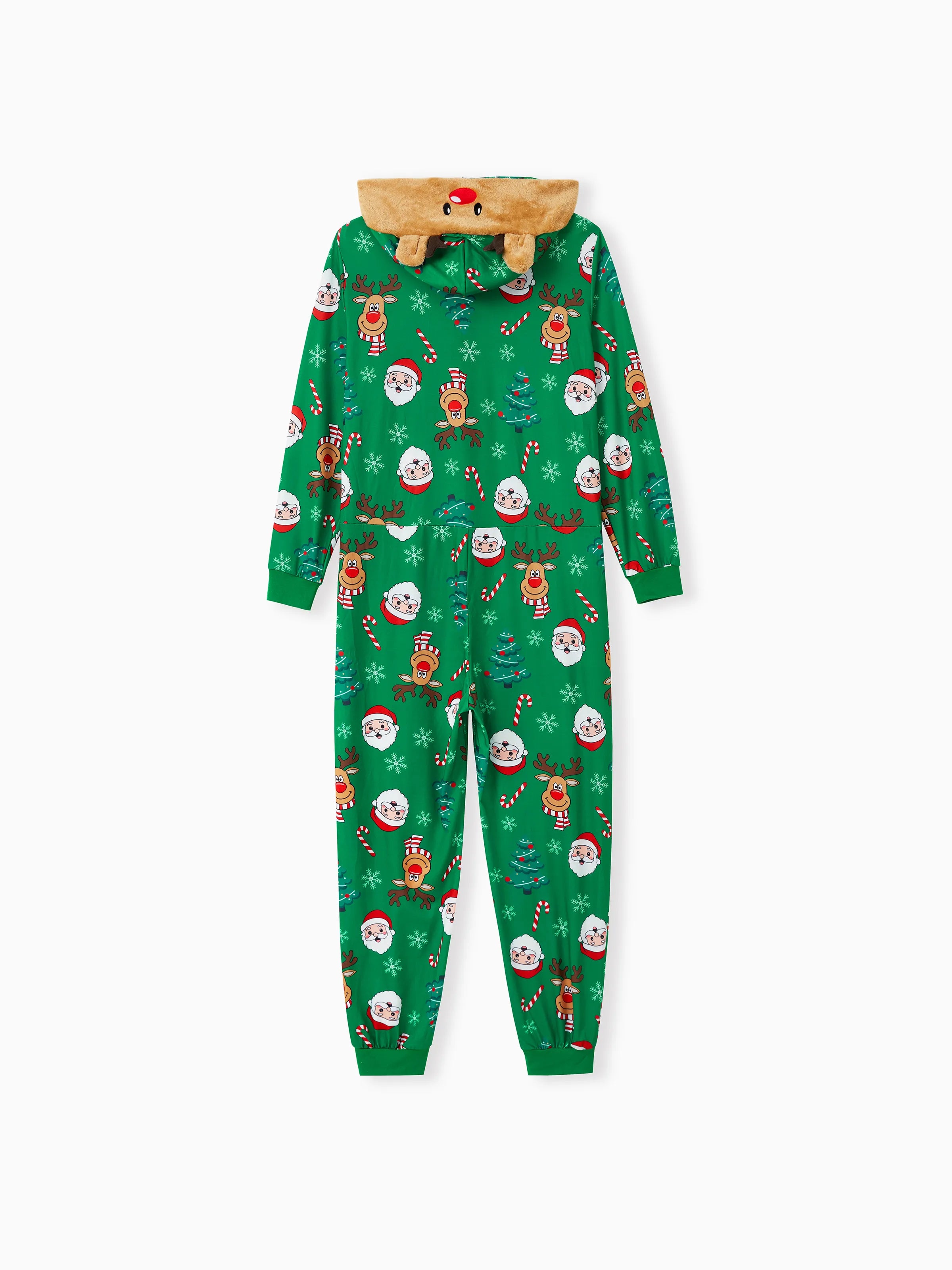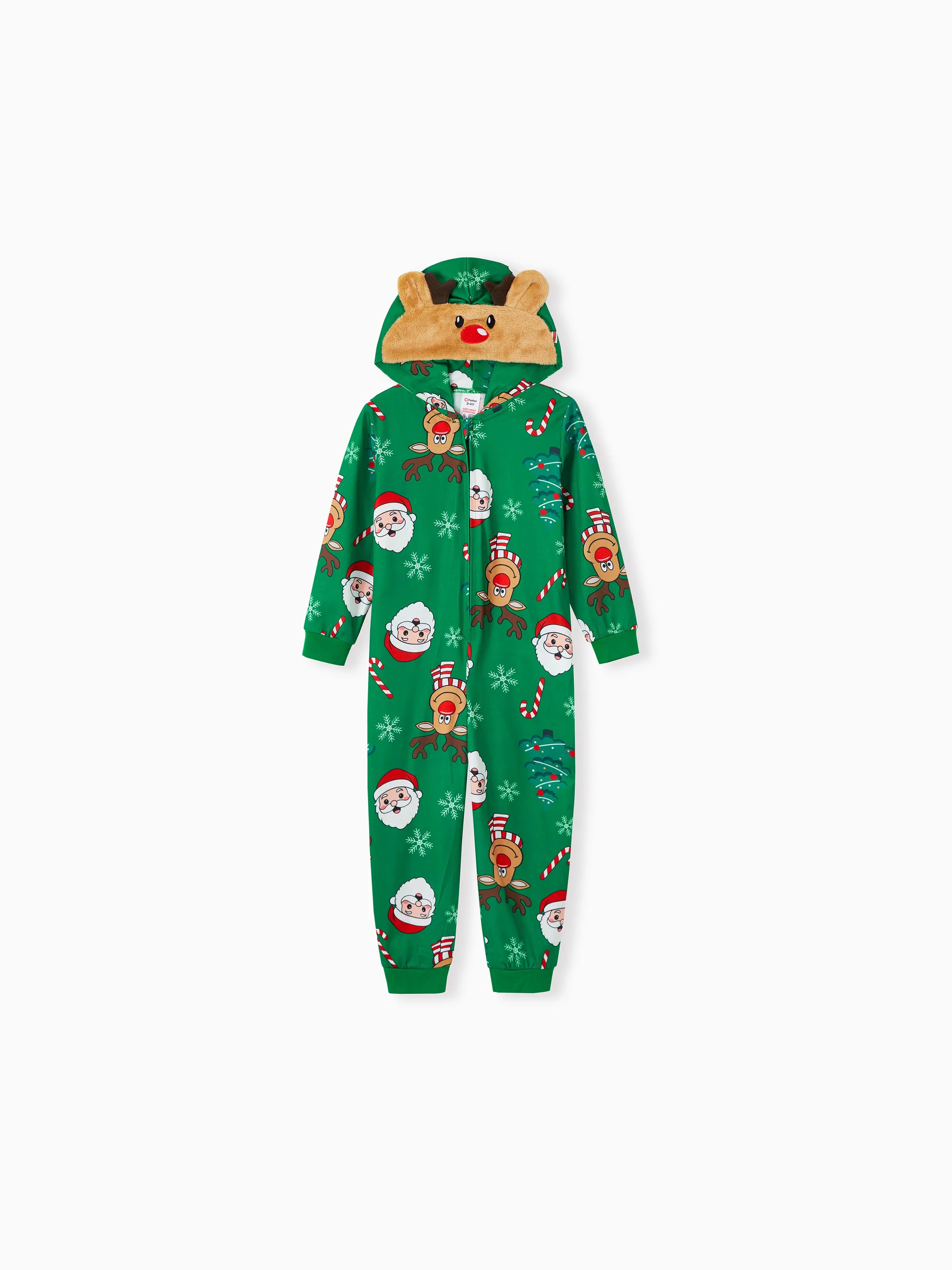 Create precious memories with matching family pajamas, featuring 3D reindeer hooded onesies, illustrations of Santa Claus.