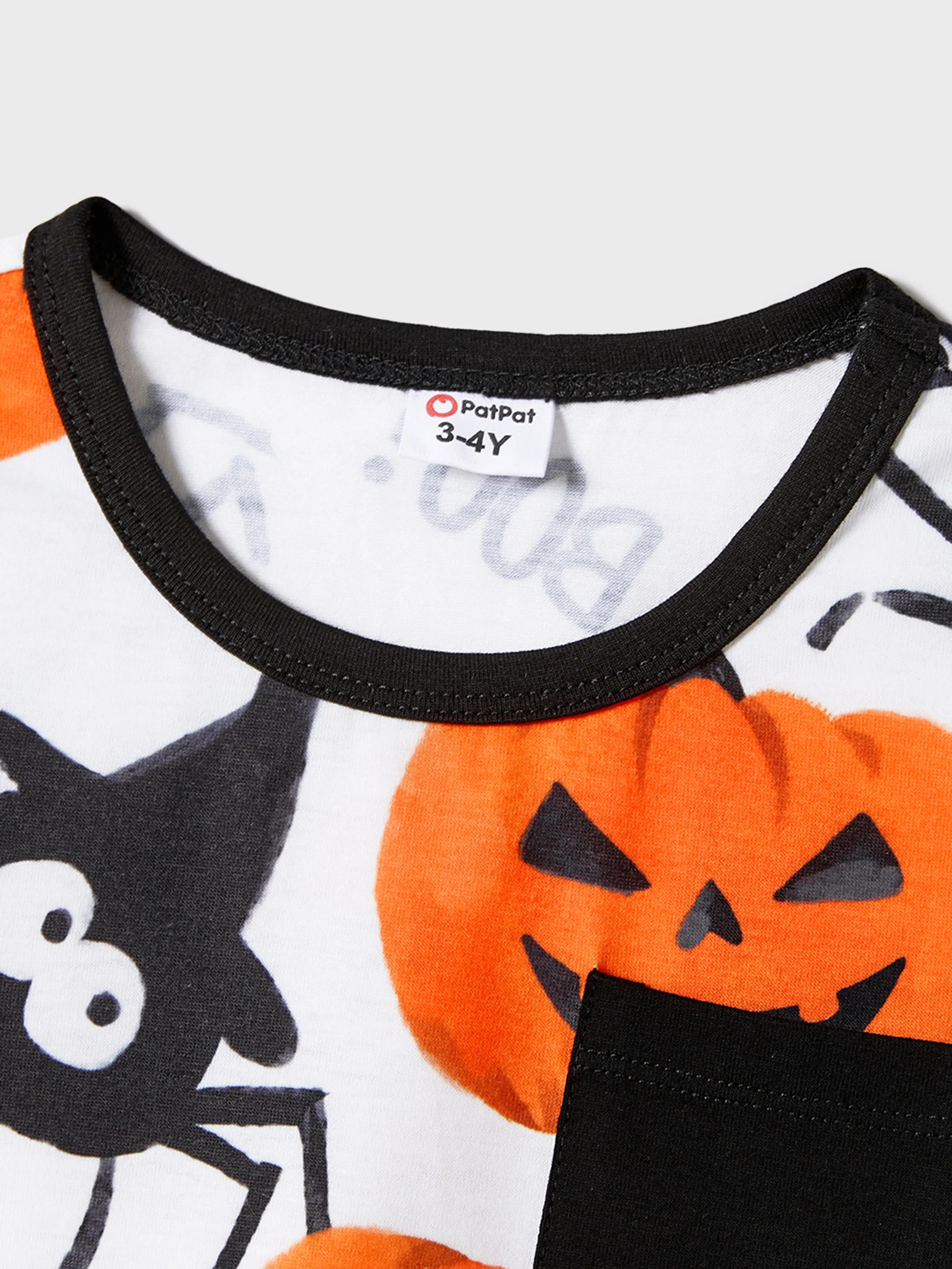 Halloween Family Matching Pumpkin Print Dresses and Short Sleeve Colorblock Tops Sets ColorBlock