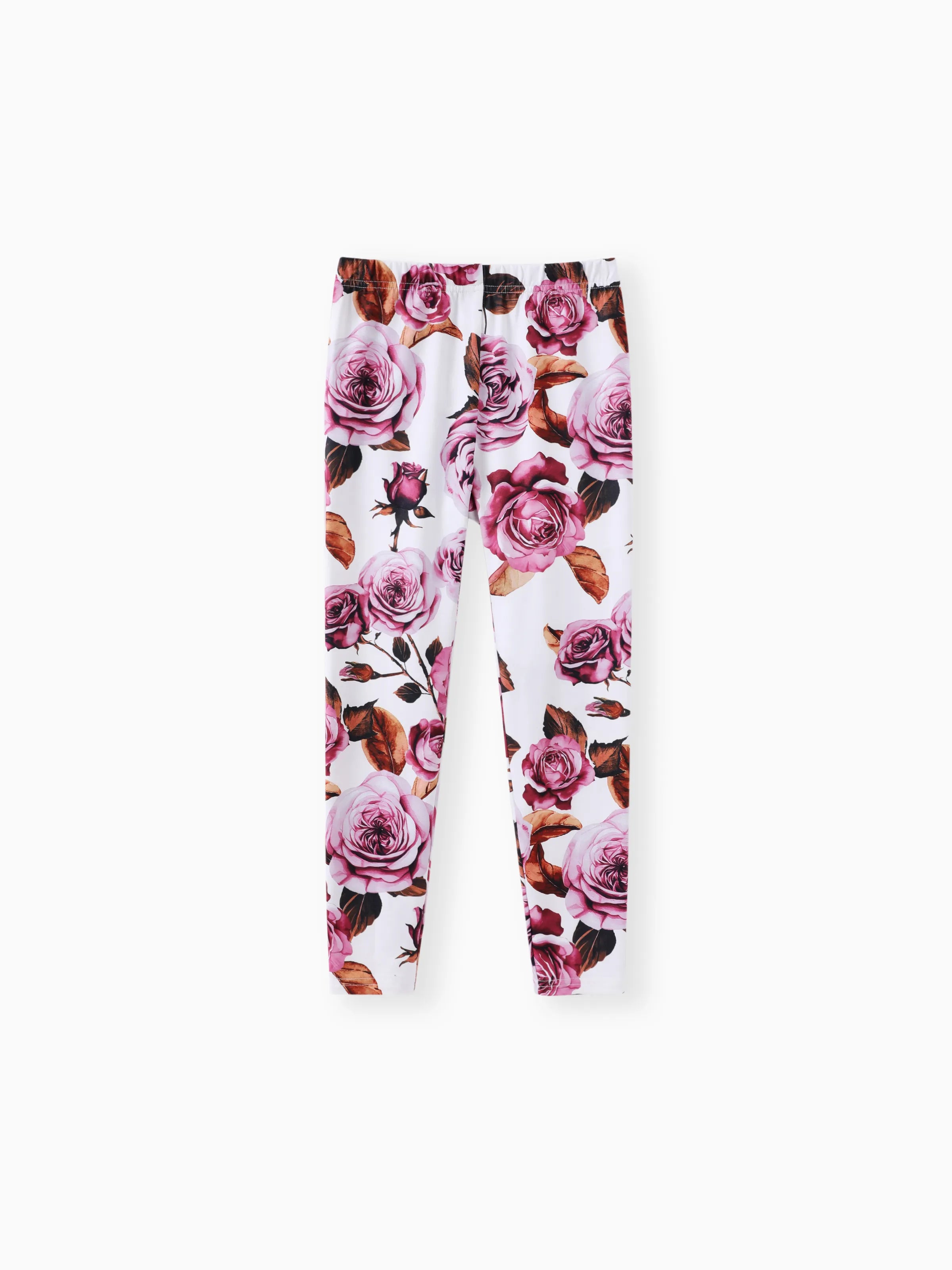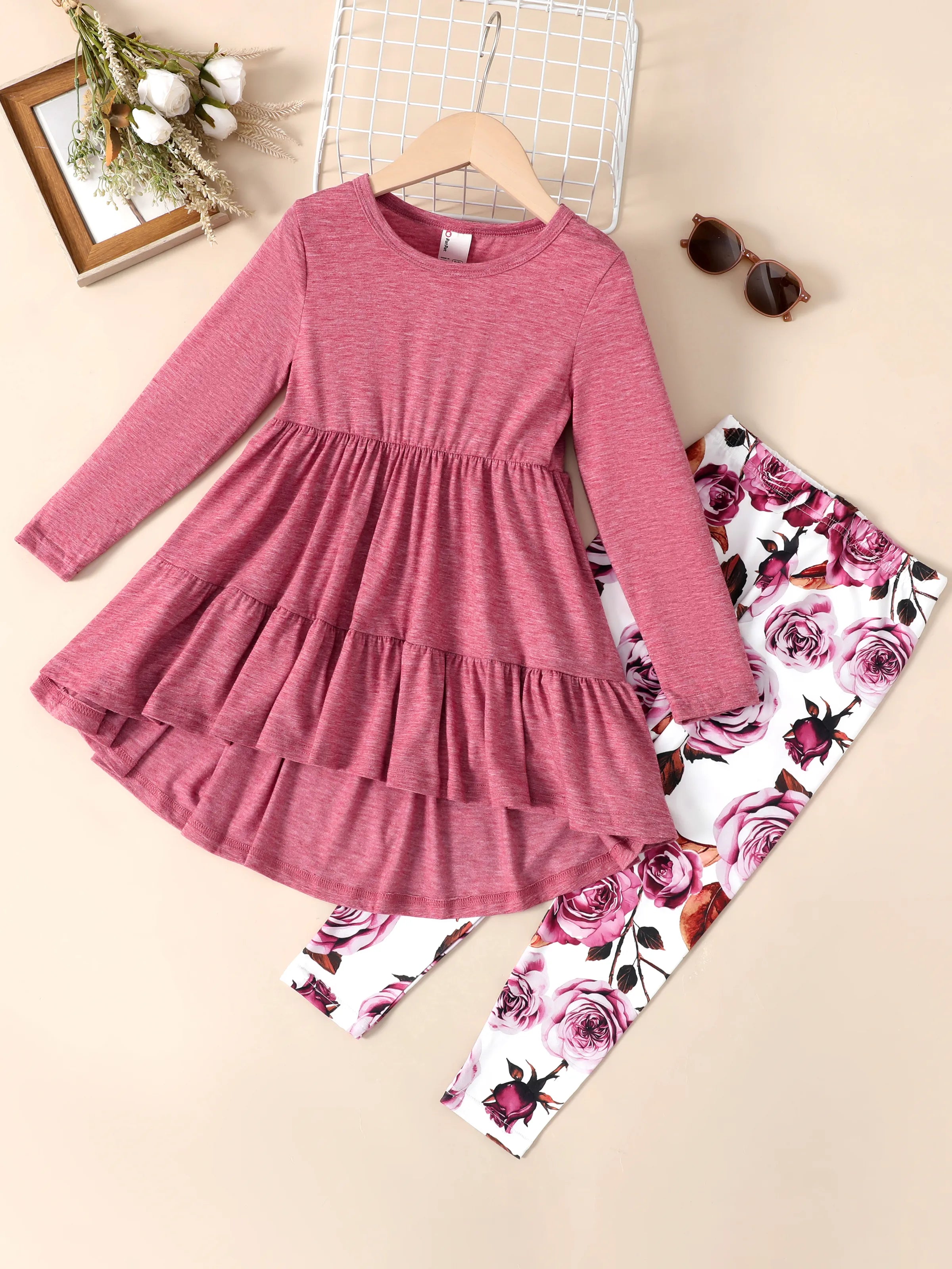 Kid Girl 2pcs Ruffled Irregular Top and Floral Print Leggings Set Roseo