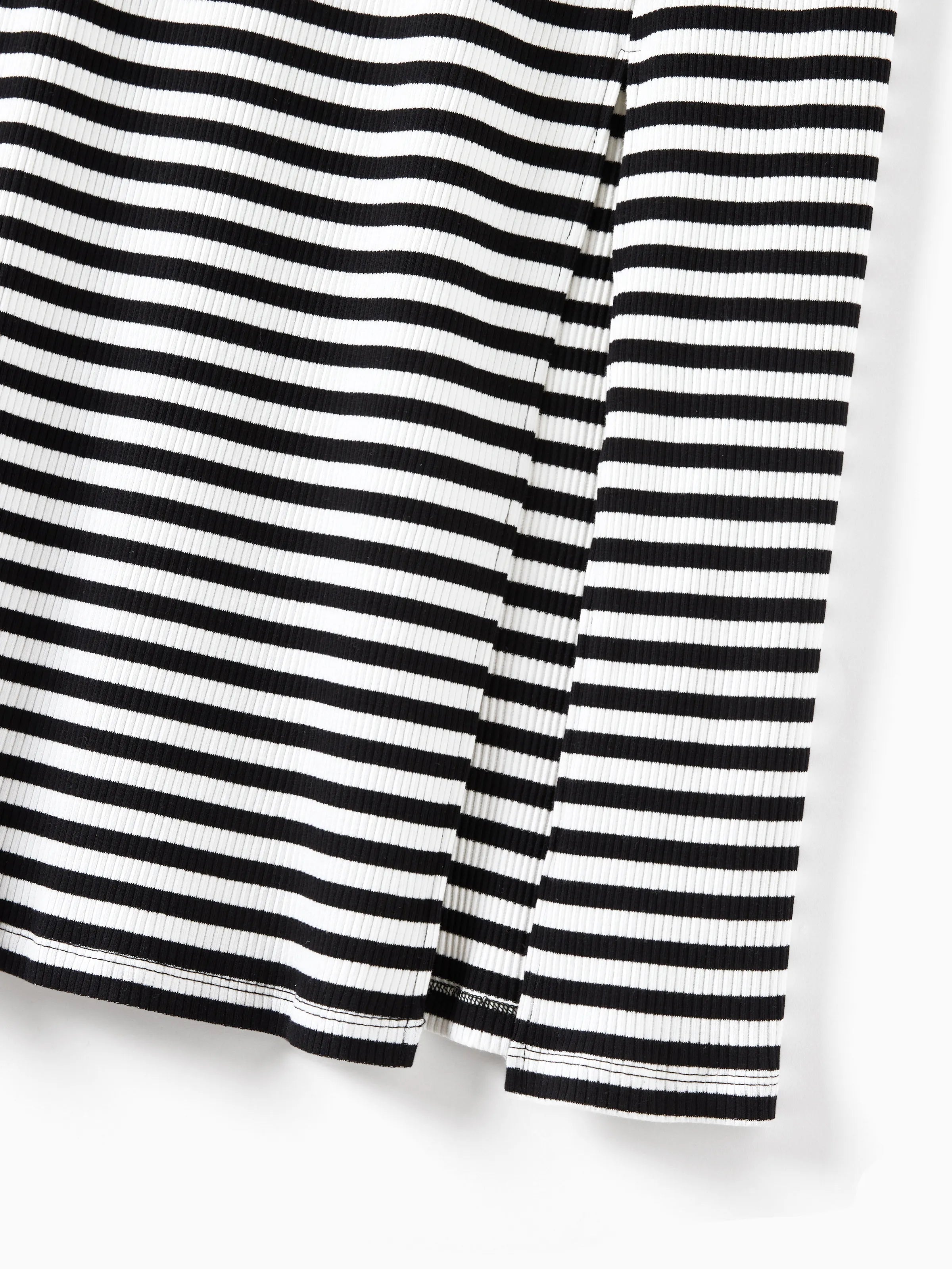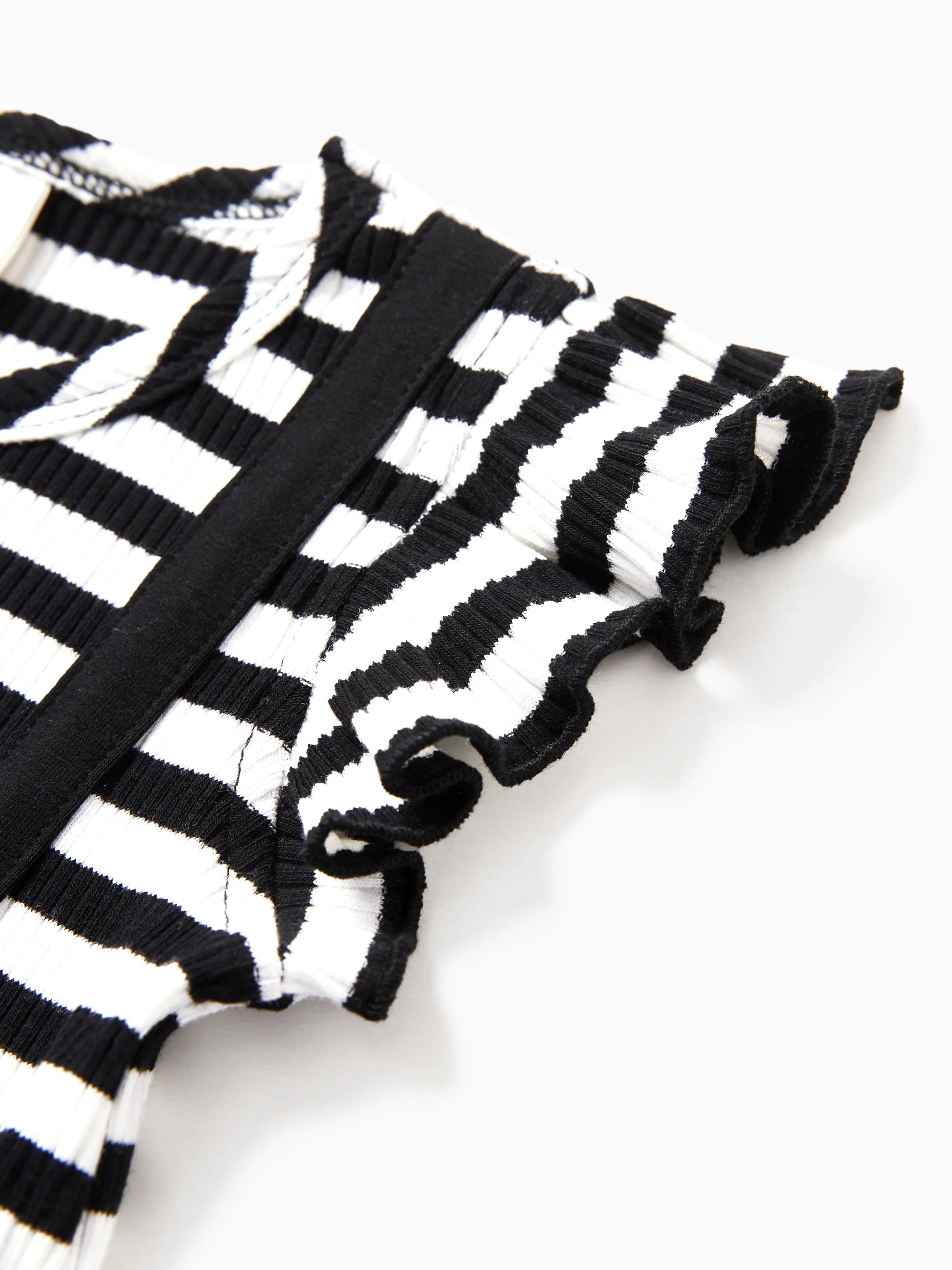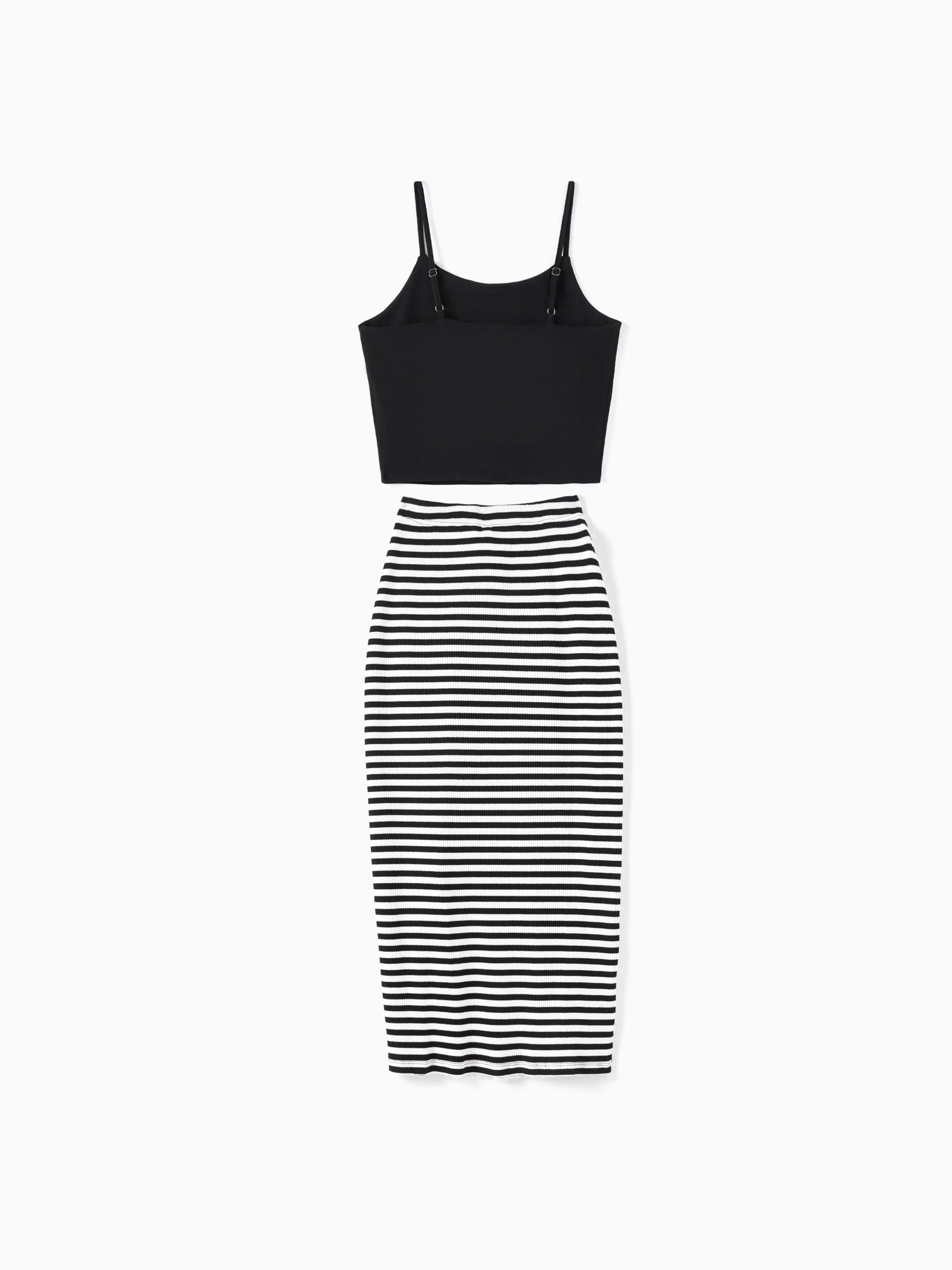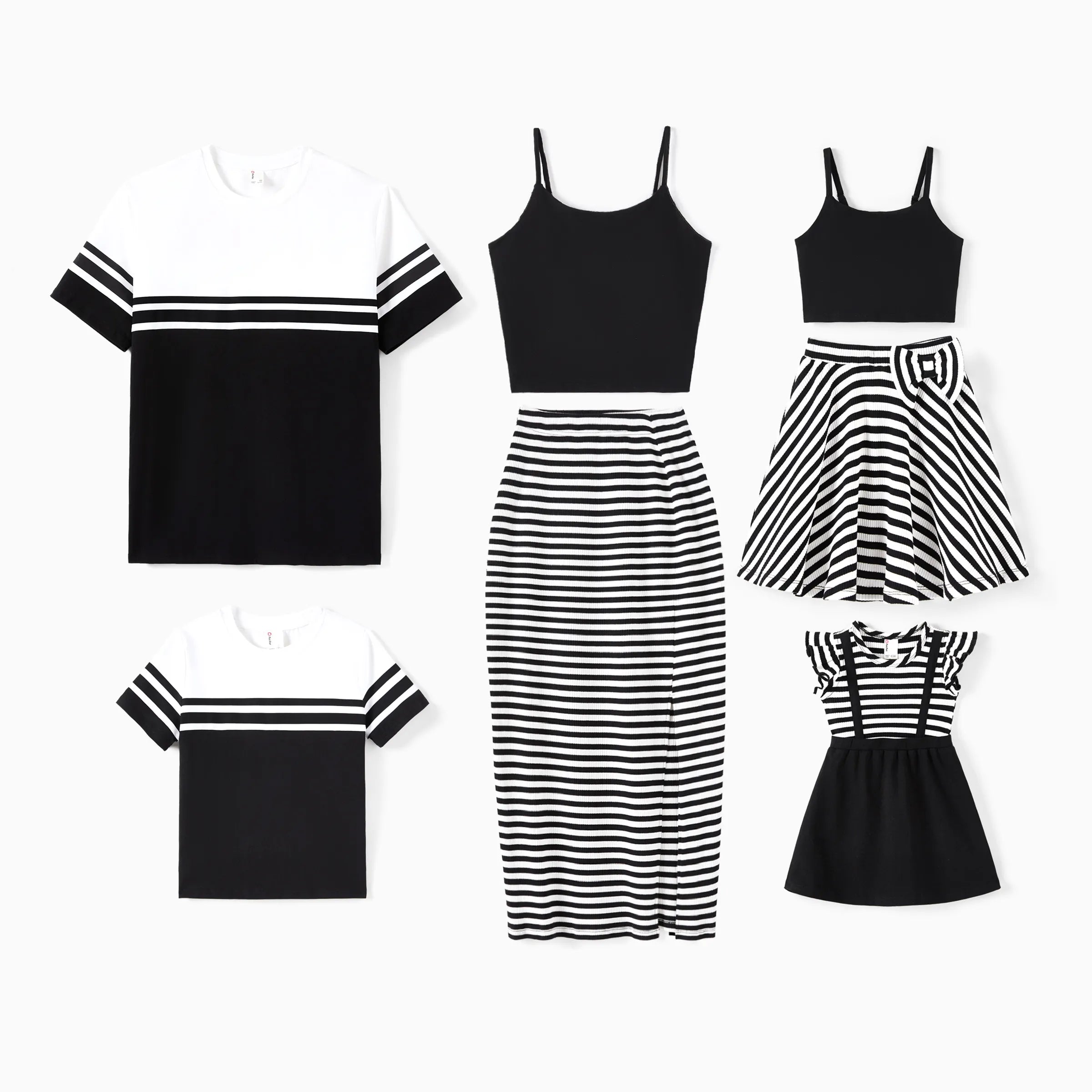 Matching Family Outfits ¨C Black & White Striped Casual Short Sleeve T-Shirt for Men & Boy, Crop Top & Midi Skirt Co-ord Set for women & Girl, Flared Dresses for Baby Girl ¨C Stylish Summer Family Coordinated Cotton Set Black+White