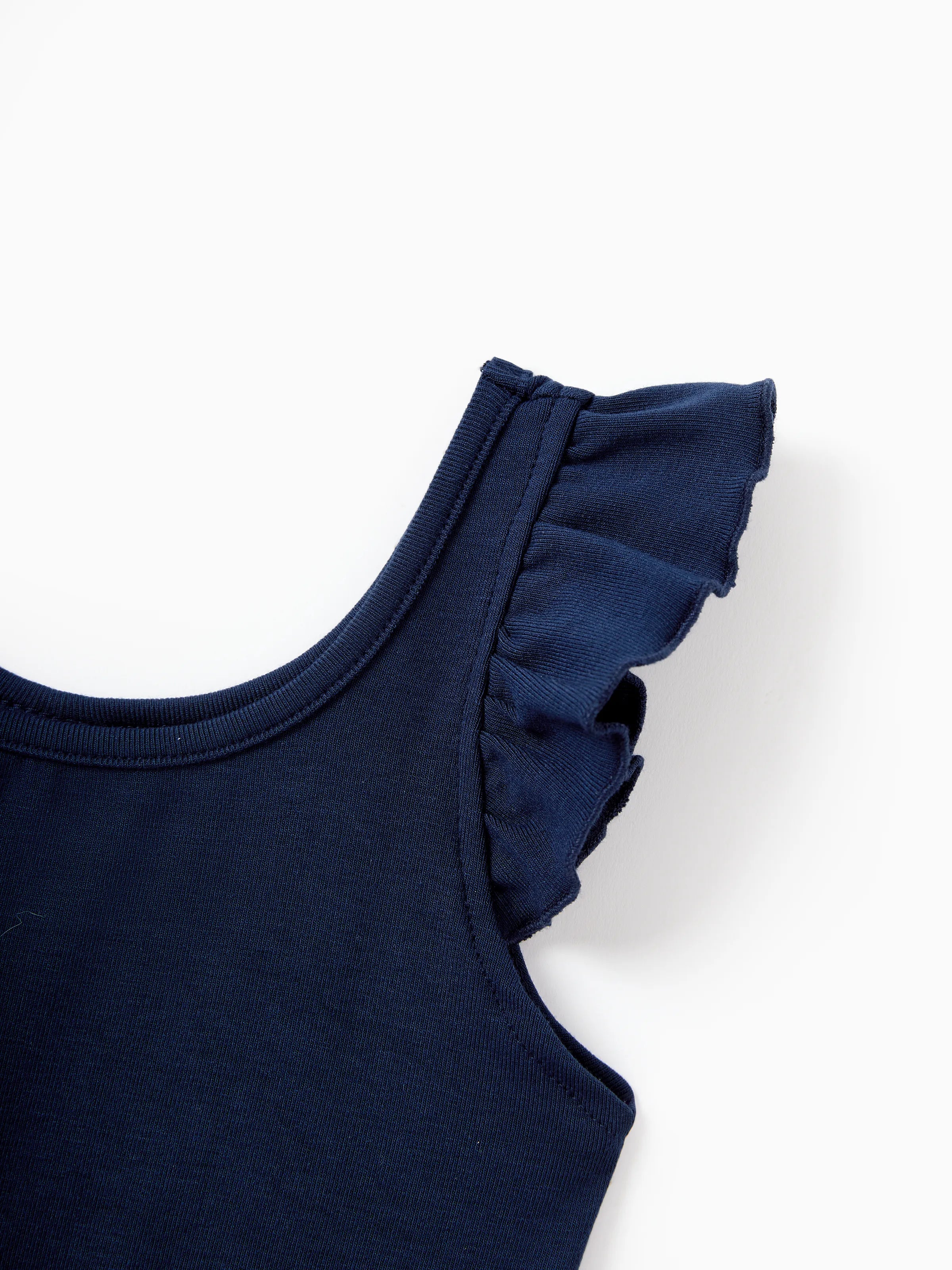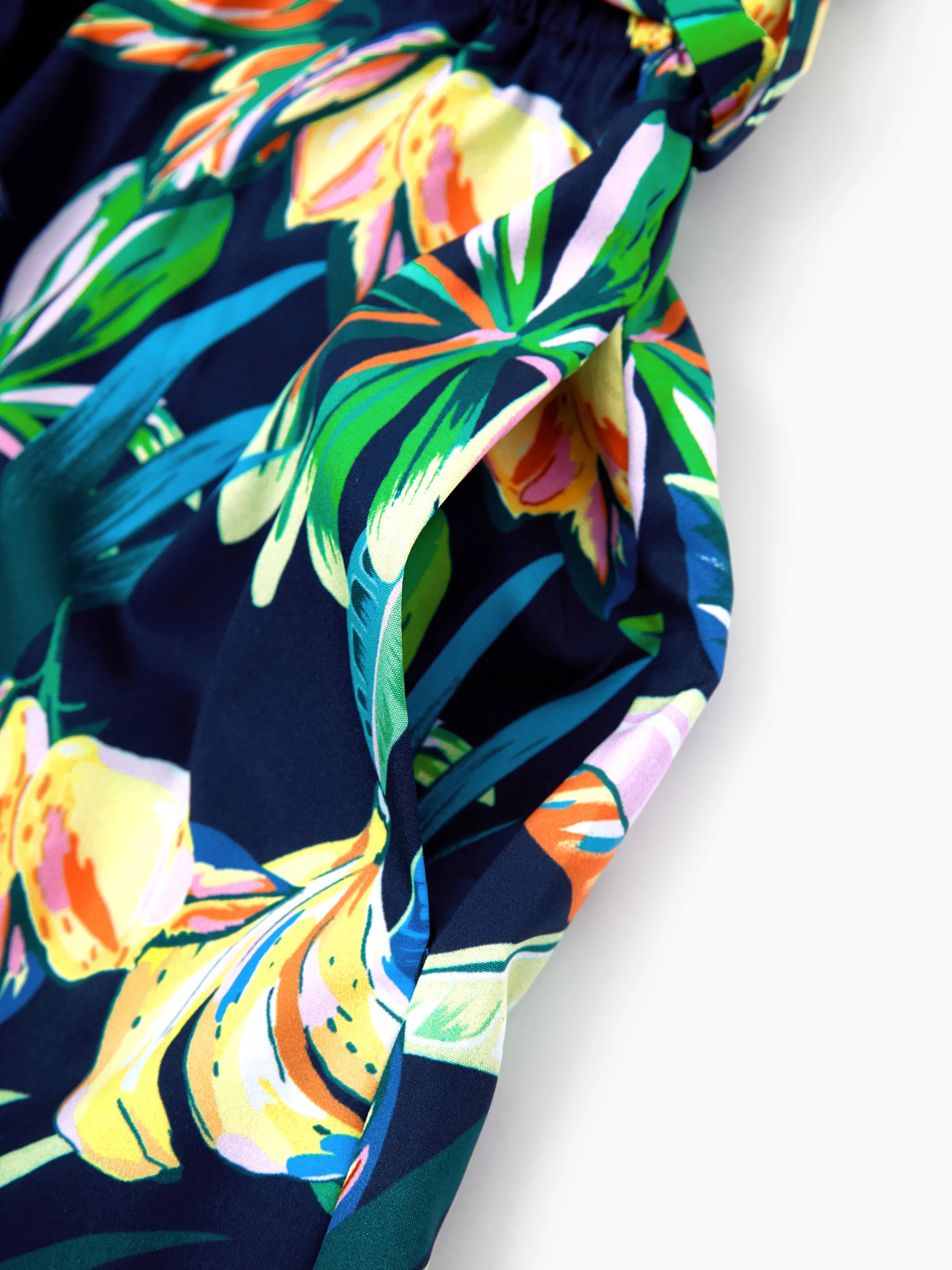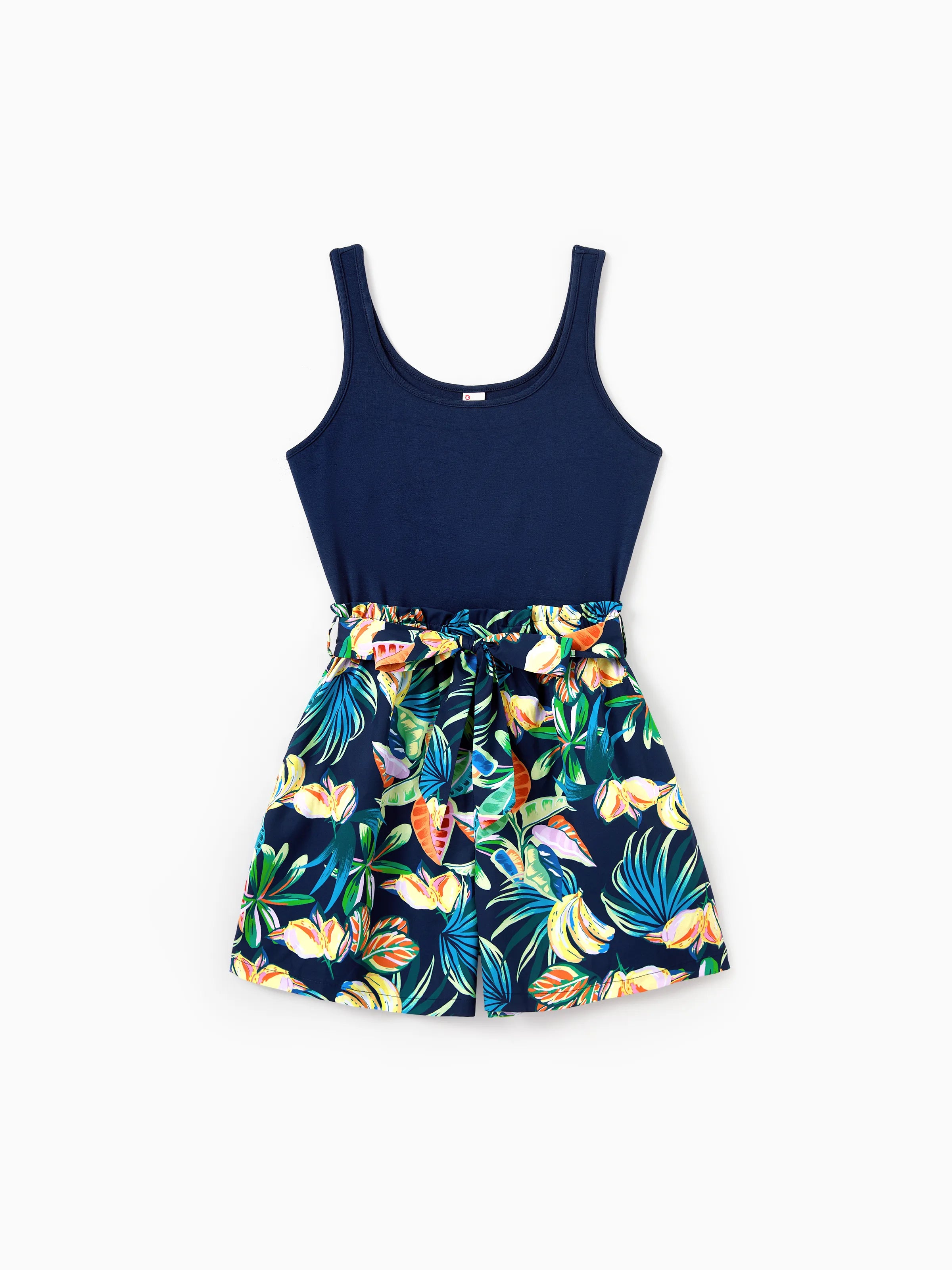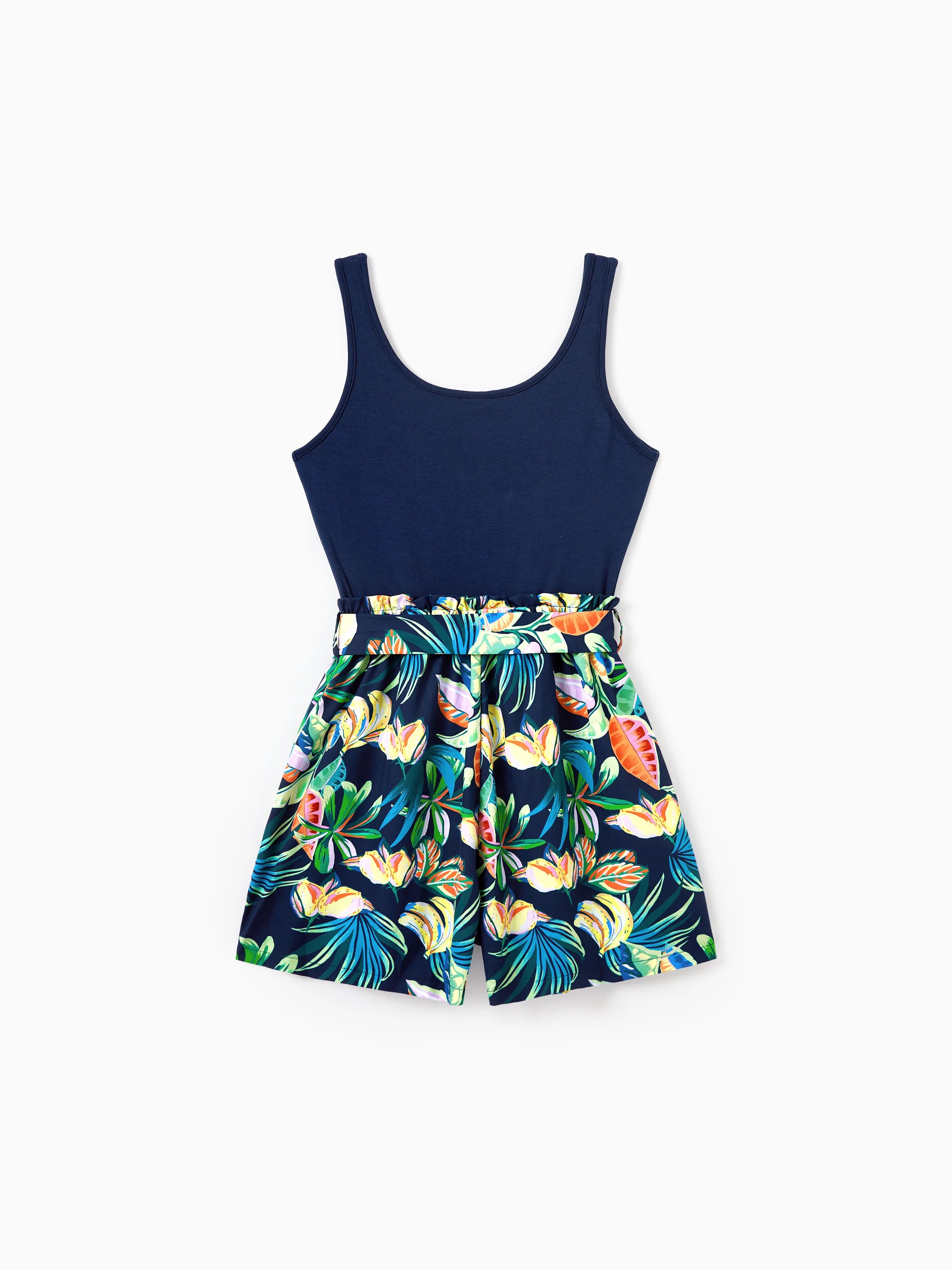 Mommy and Me Tropical Leaves Print Sleeveless Rompers with Belted Shorts Matching Set Deep Blue