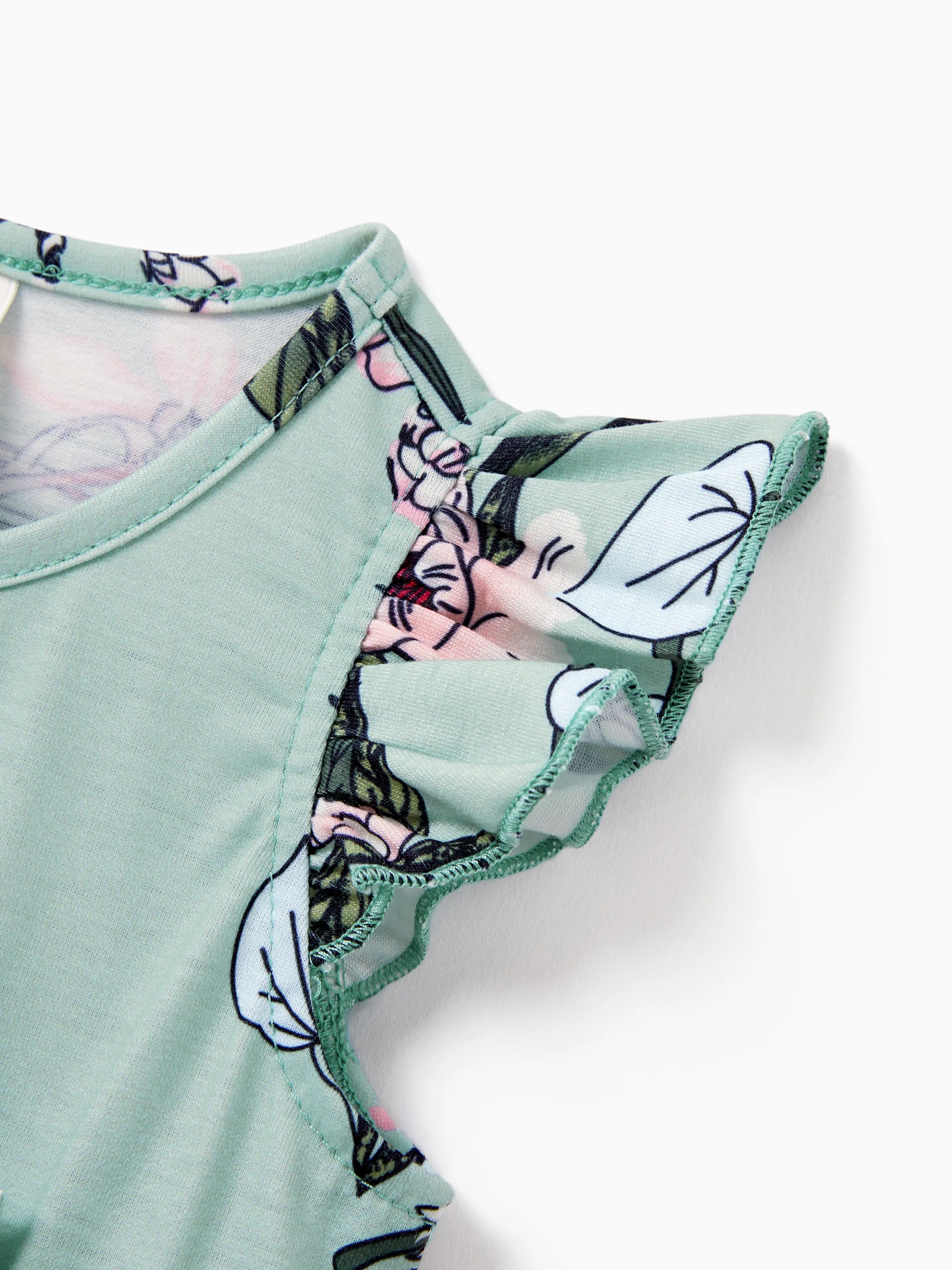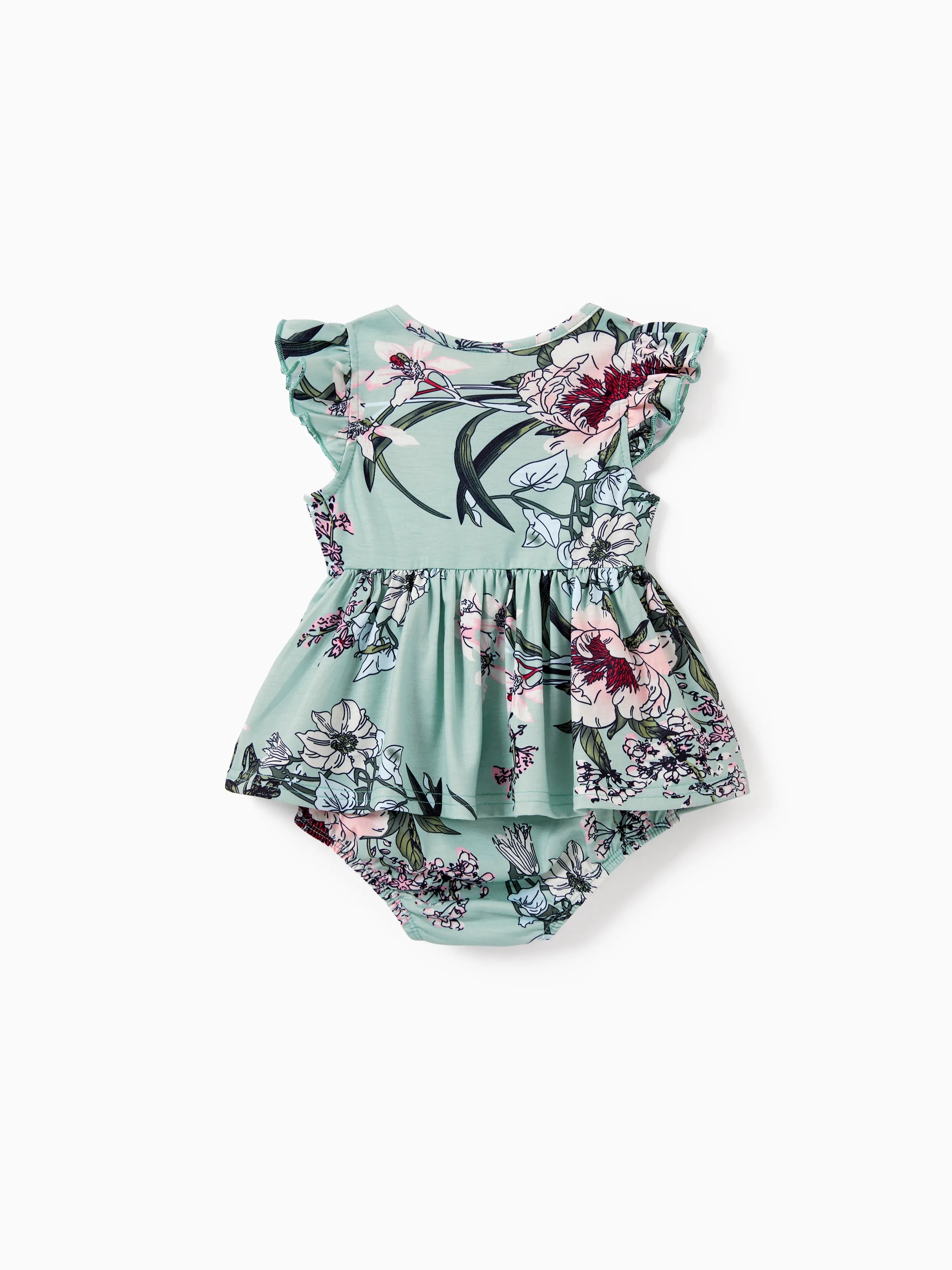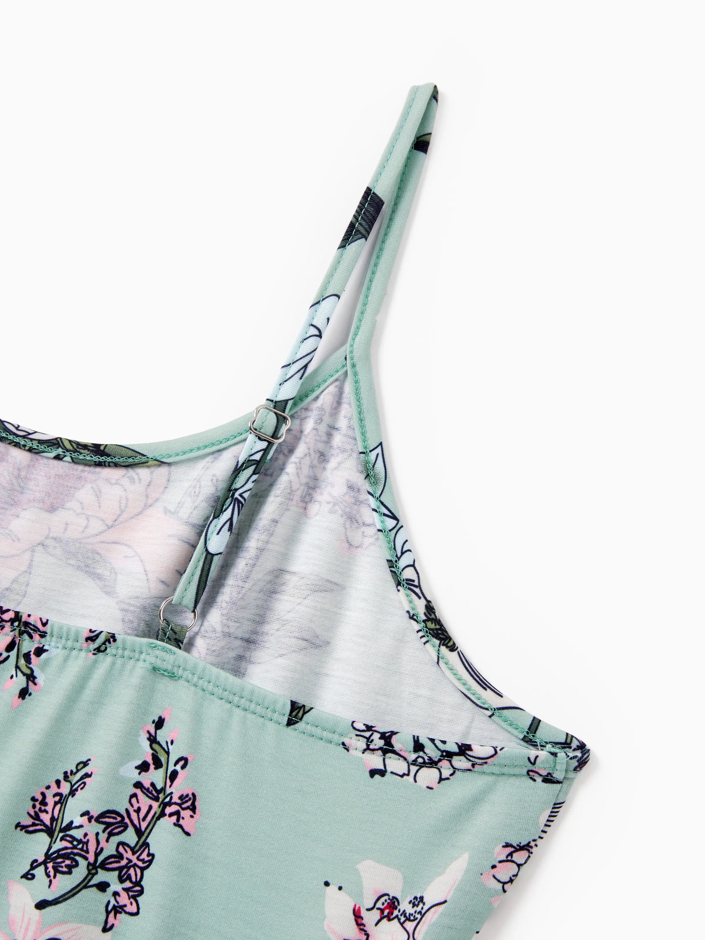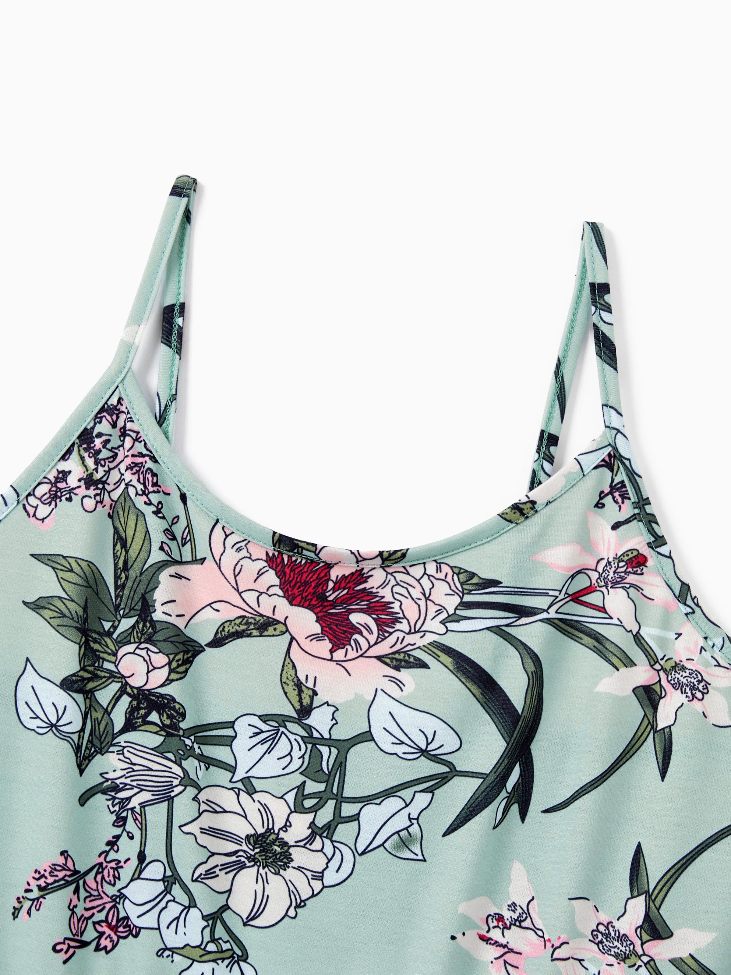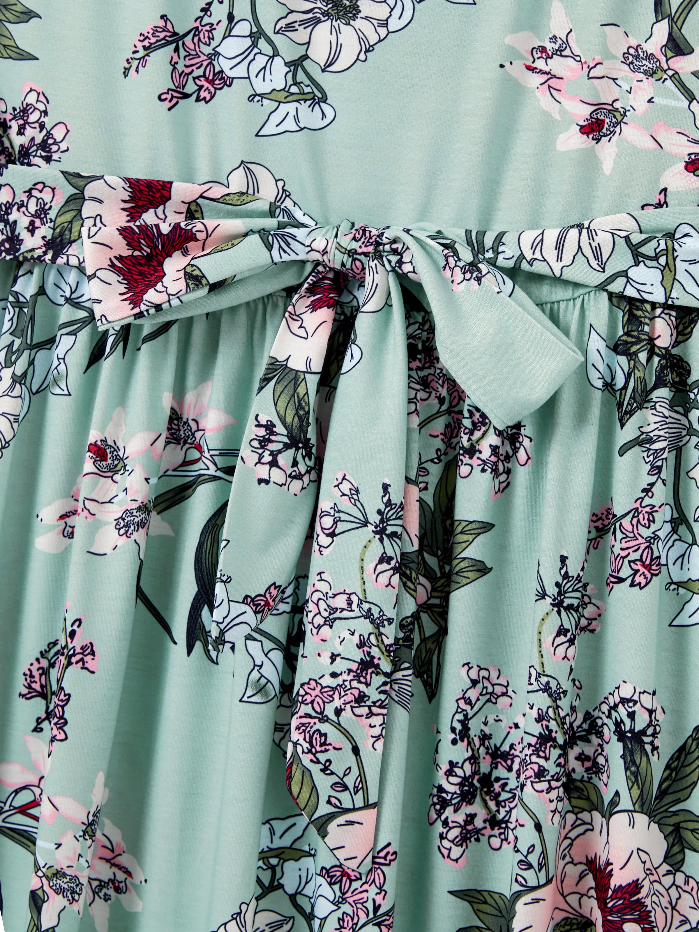 Mommy & me Sets Green Striped Polo Shirt or Flora Print Strap Belted Dress Light Green