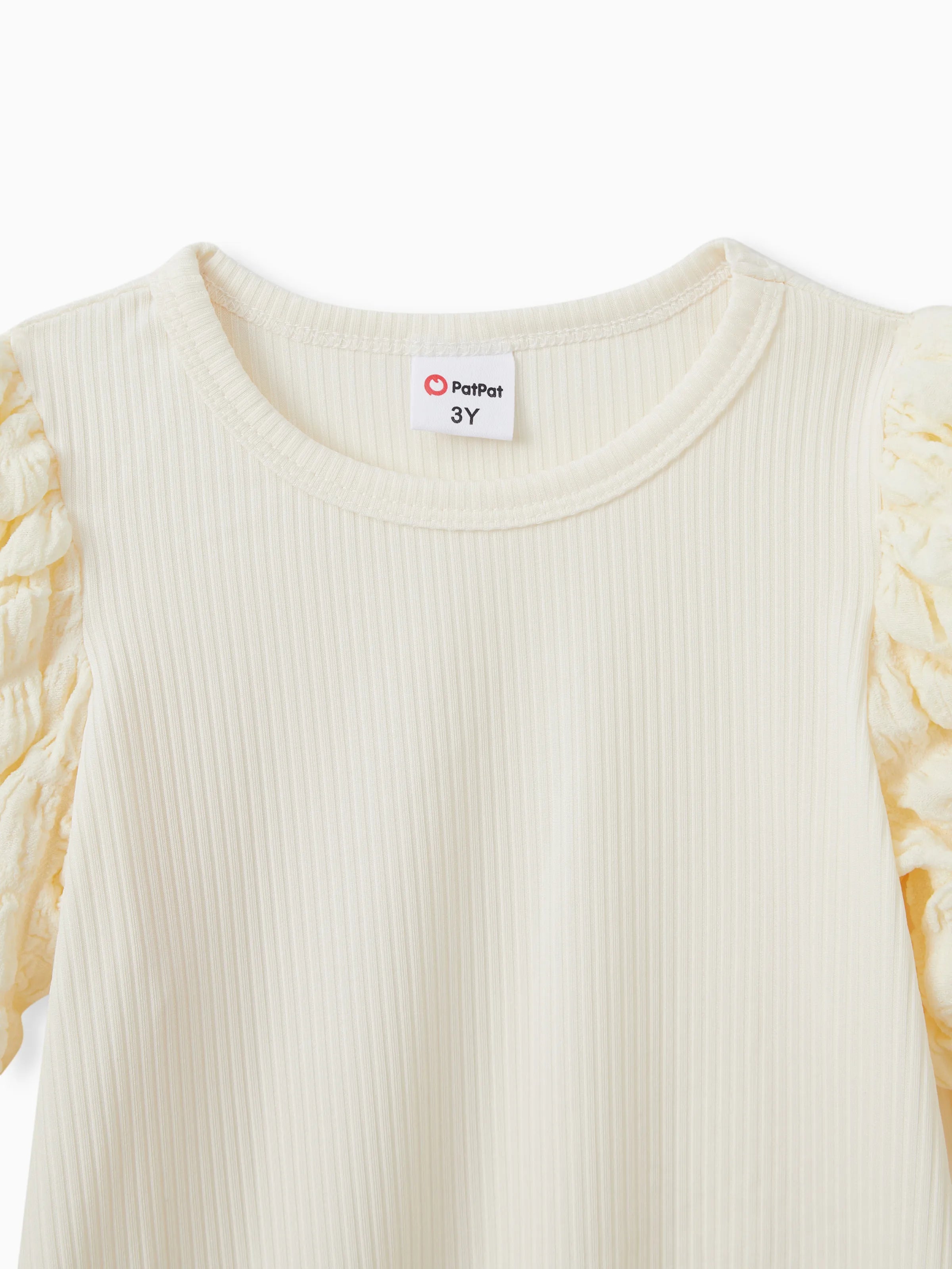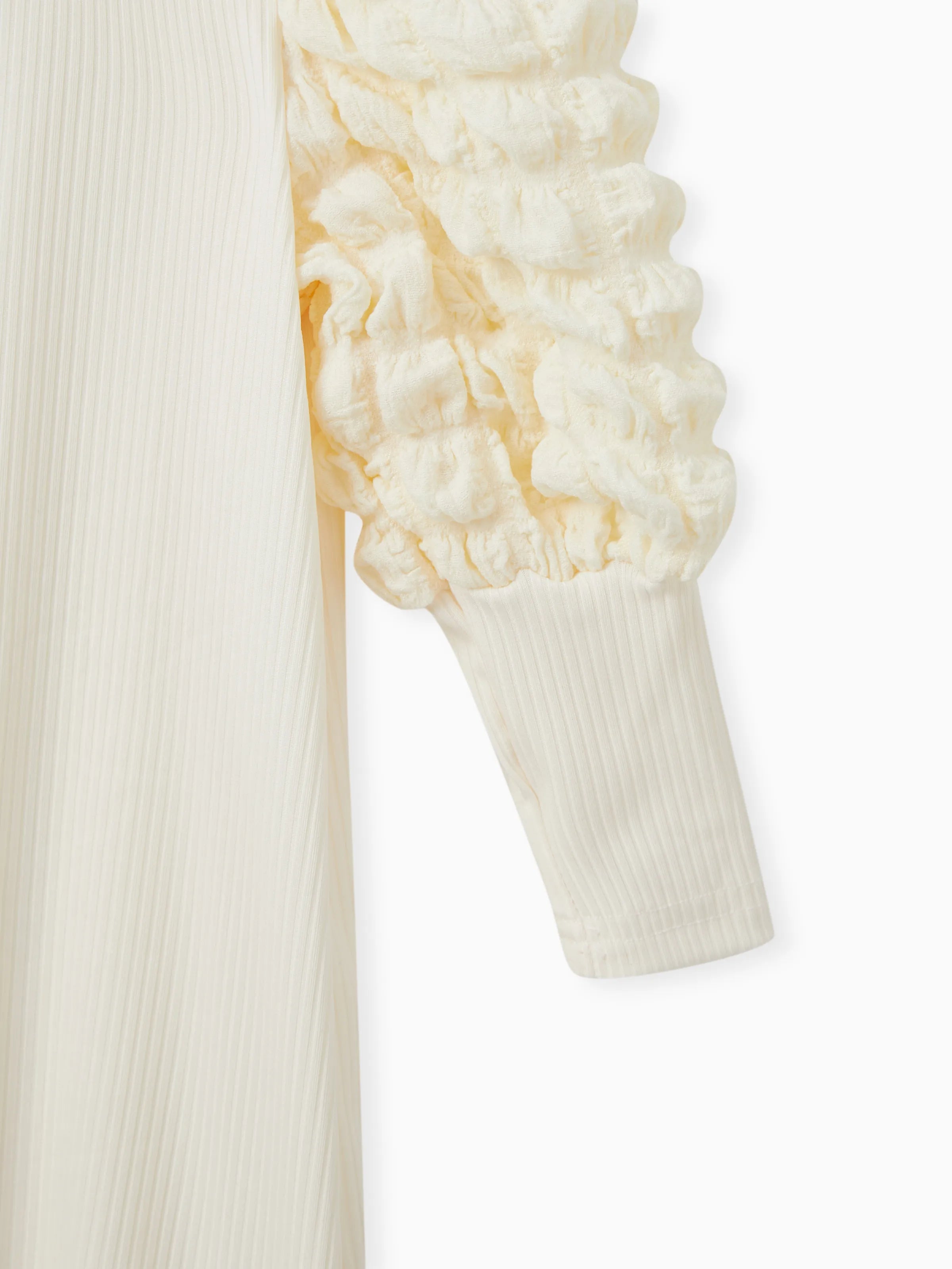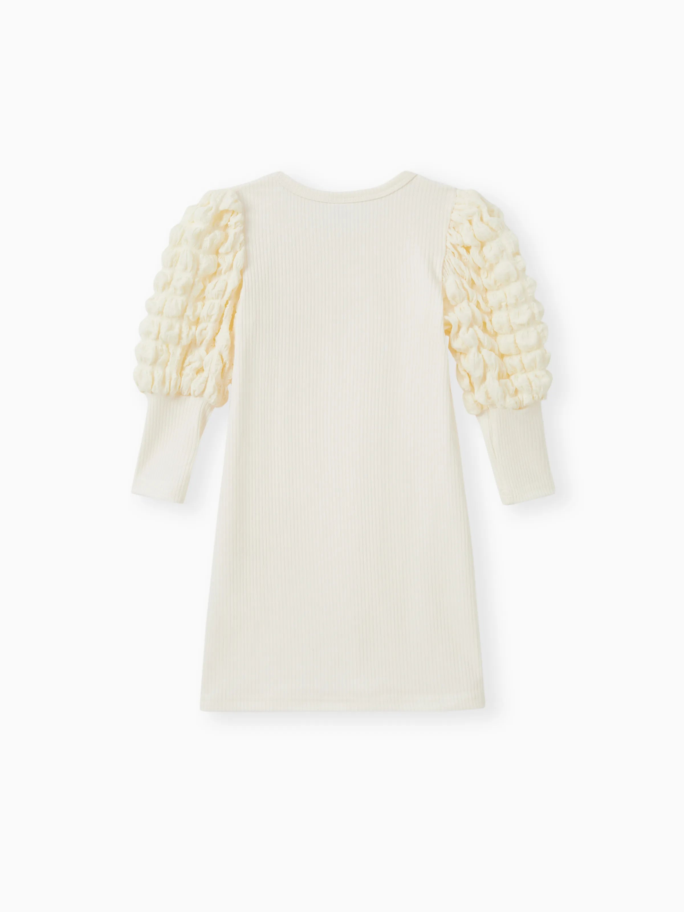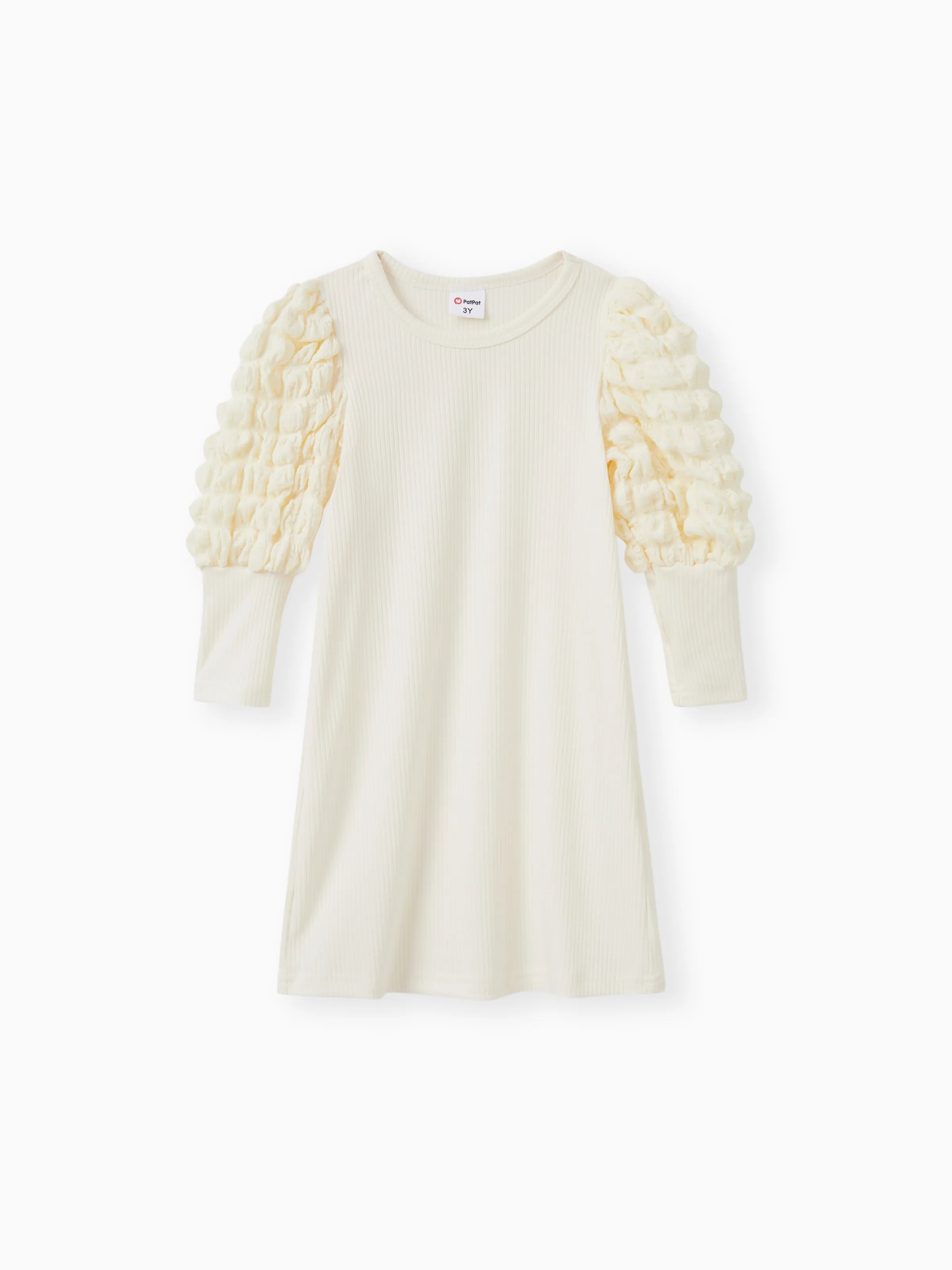 Toddler Girl Textured Ribbed Long Puff-sleeve Dress (Belt is not included) Apricot